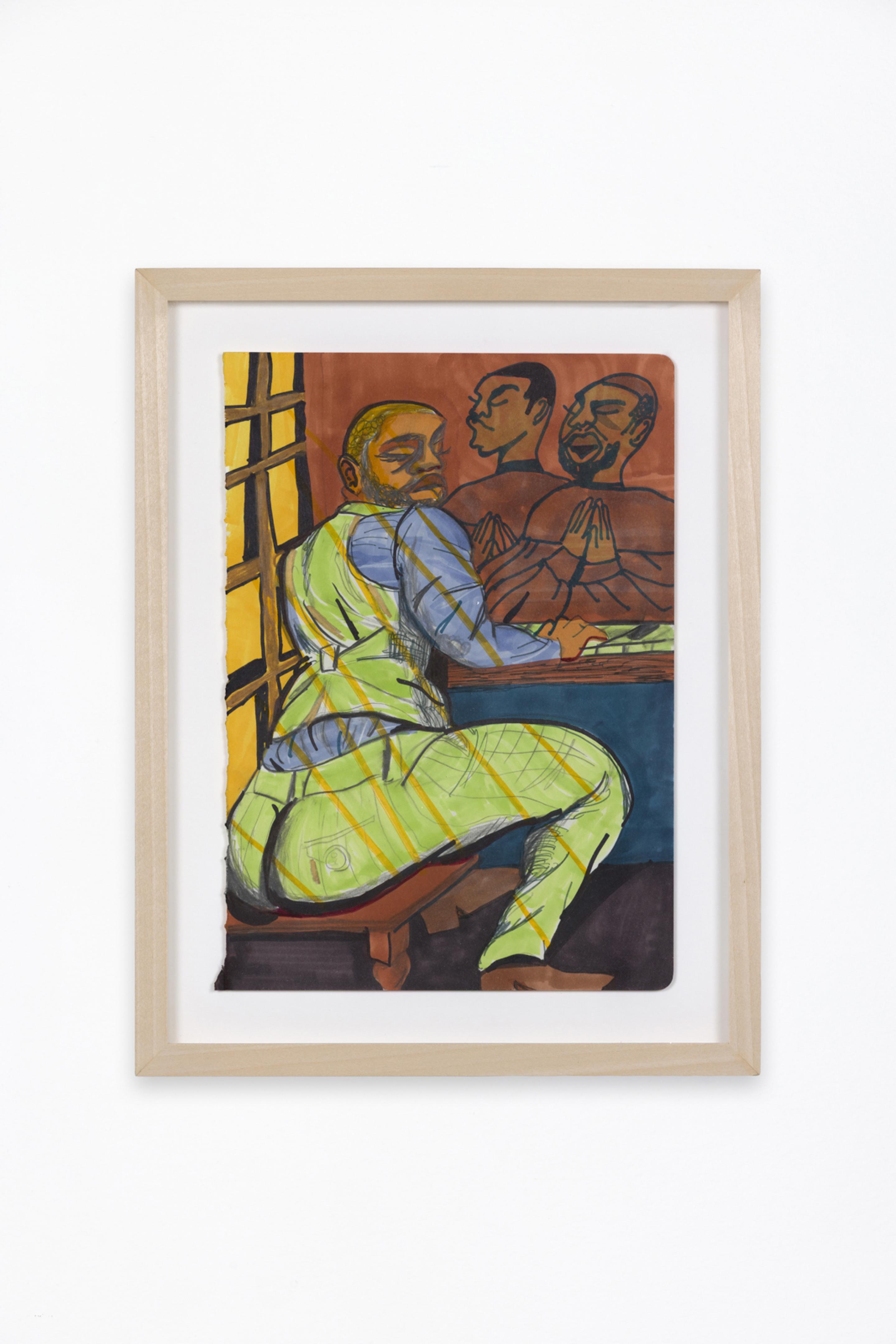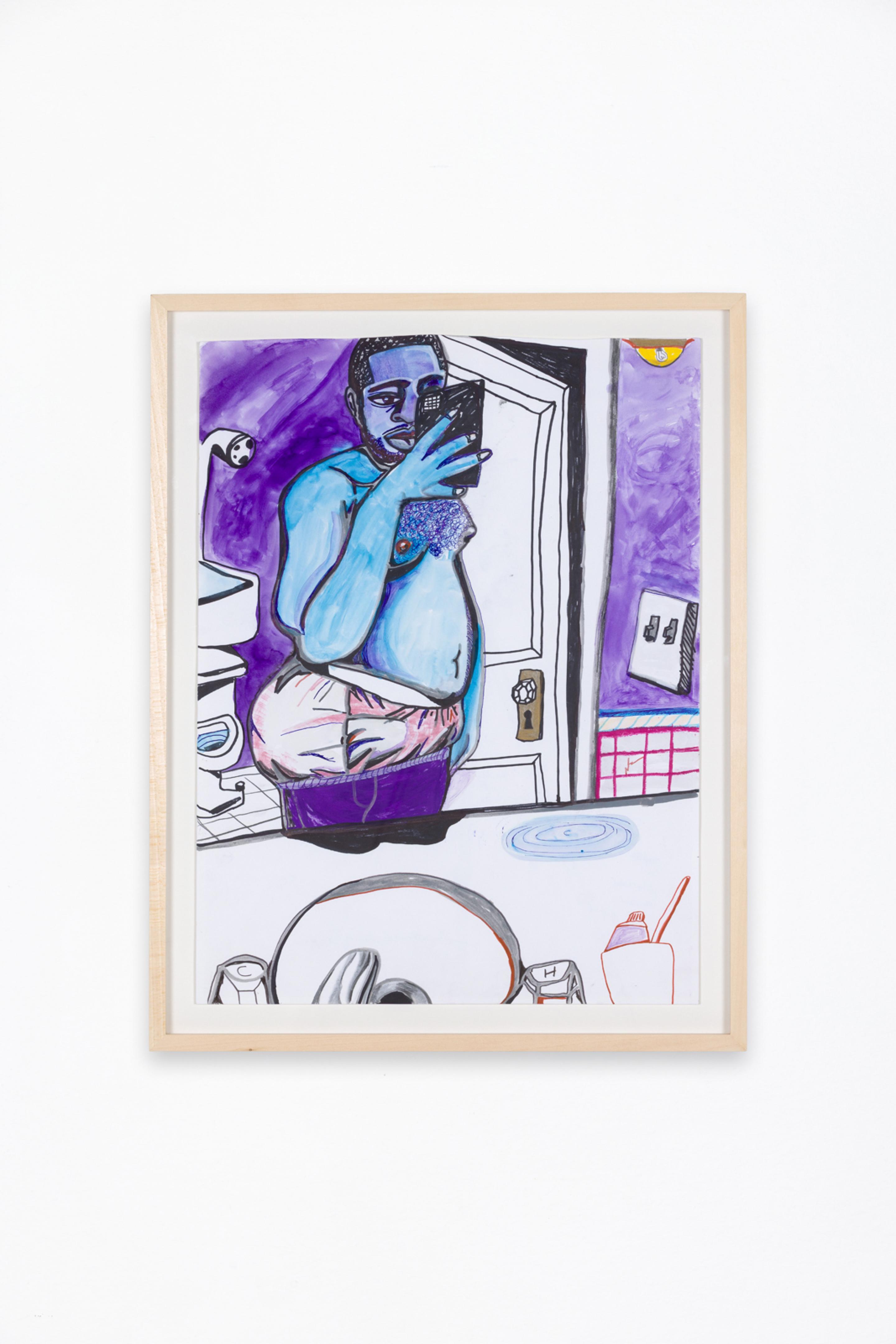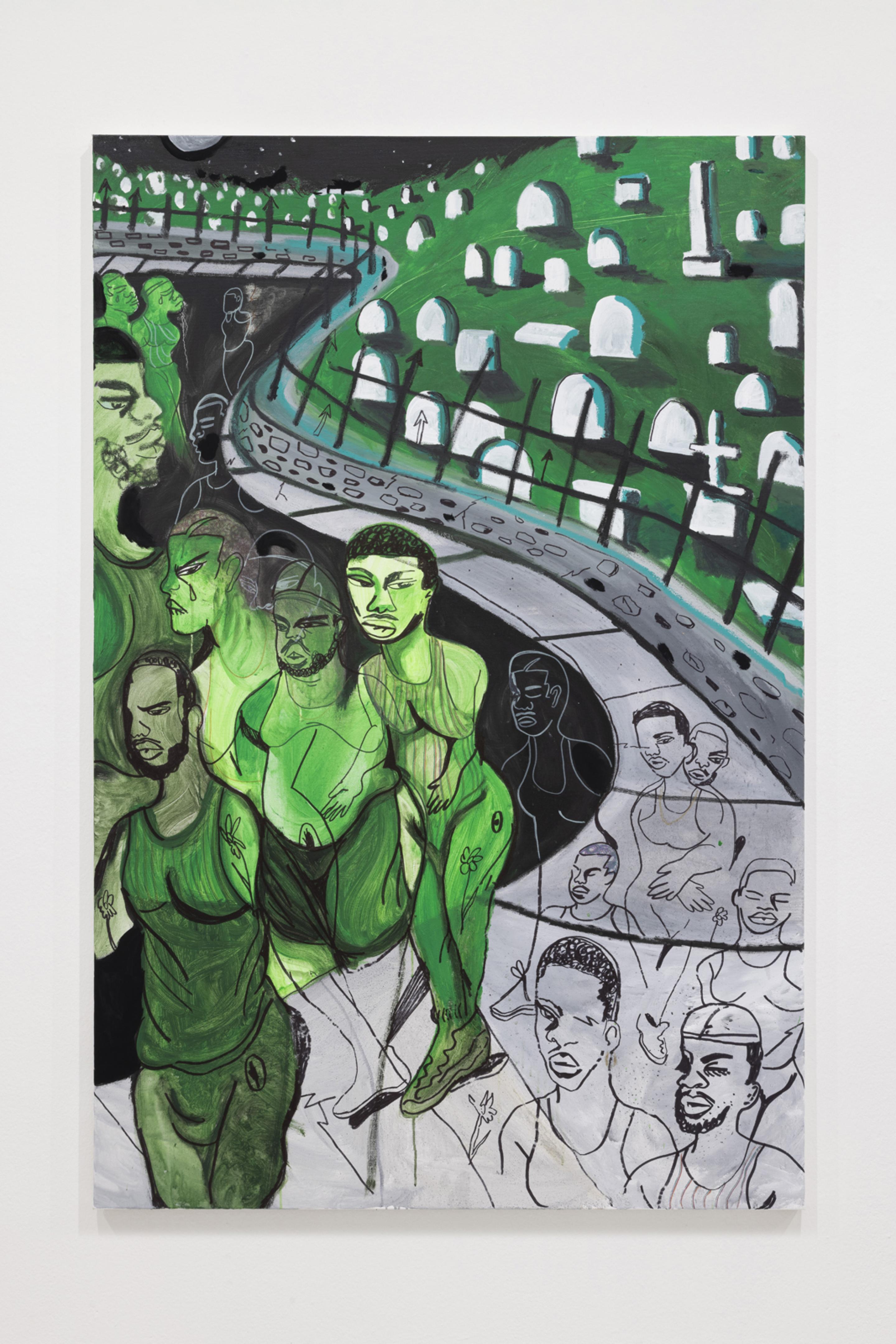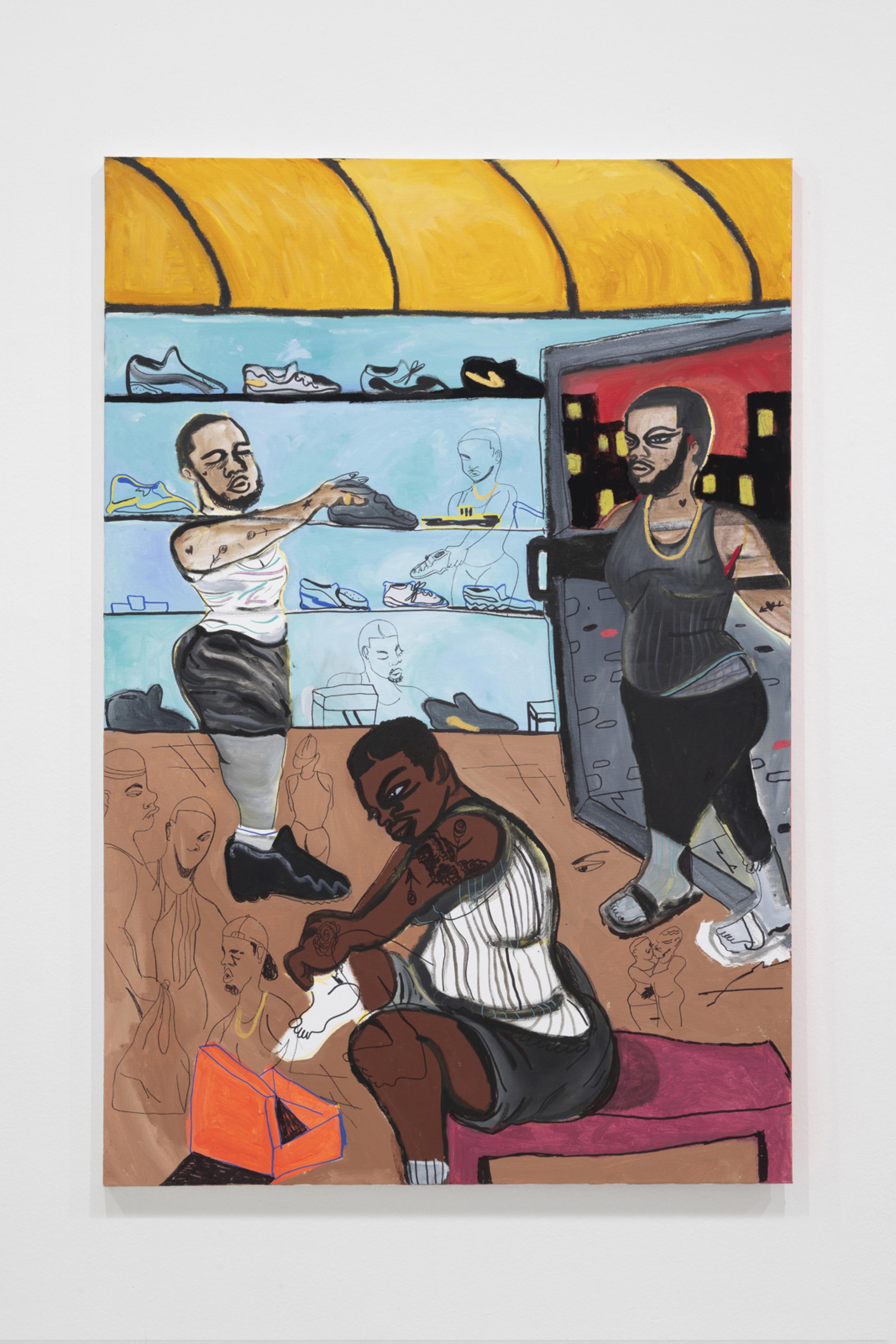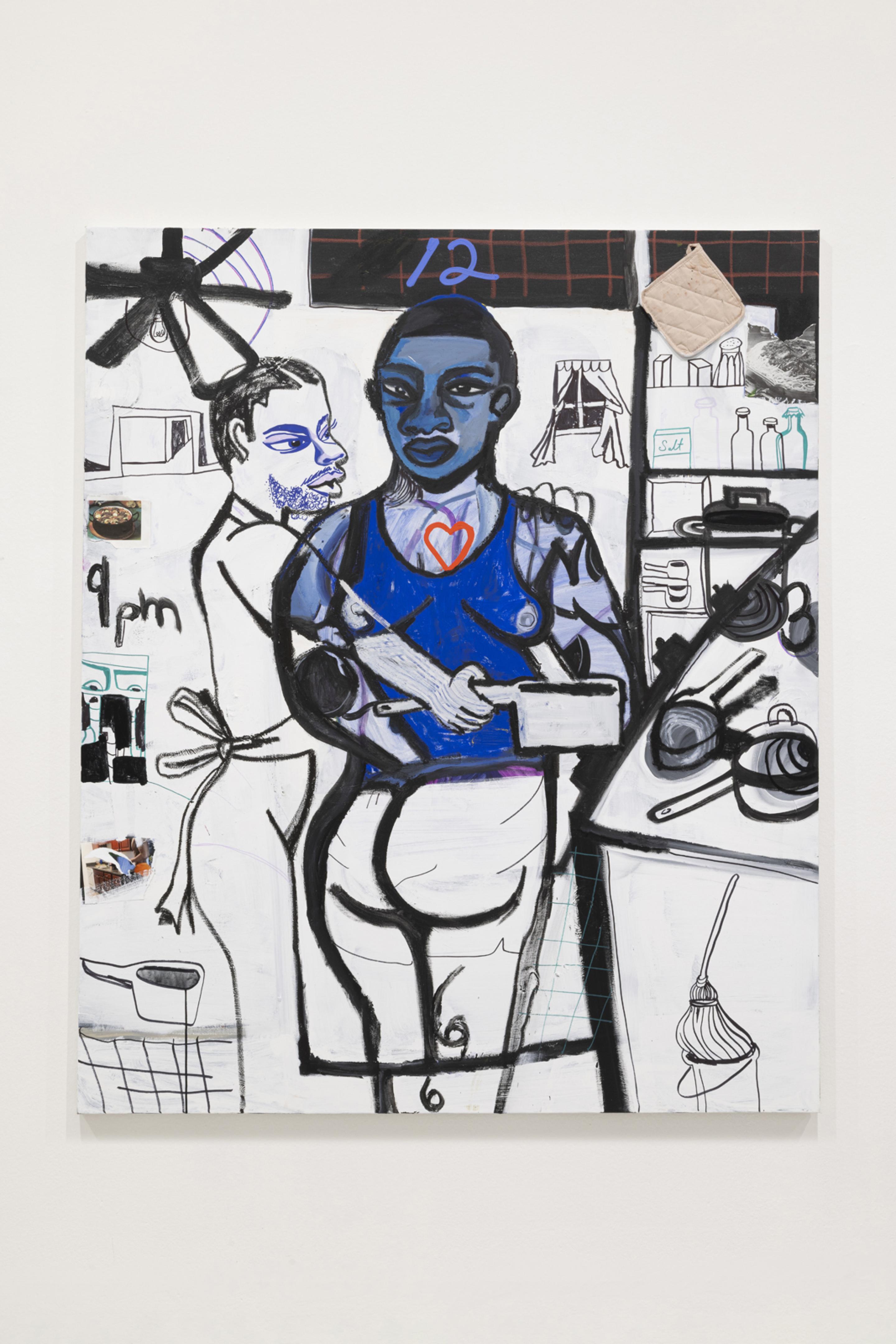 Pen, marker, oil stick, acrylic paint, and photo collage on canvas