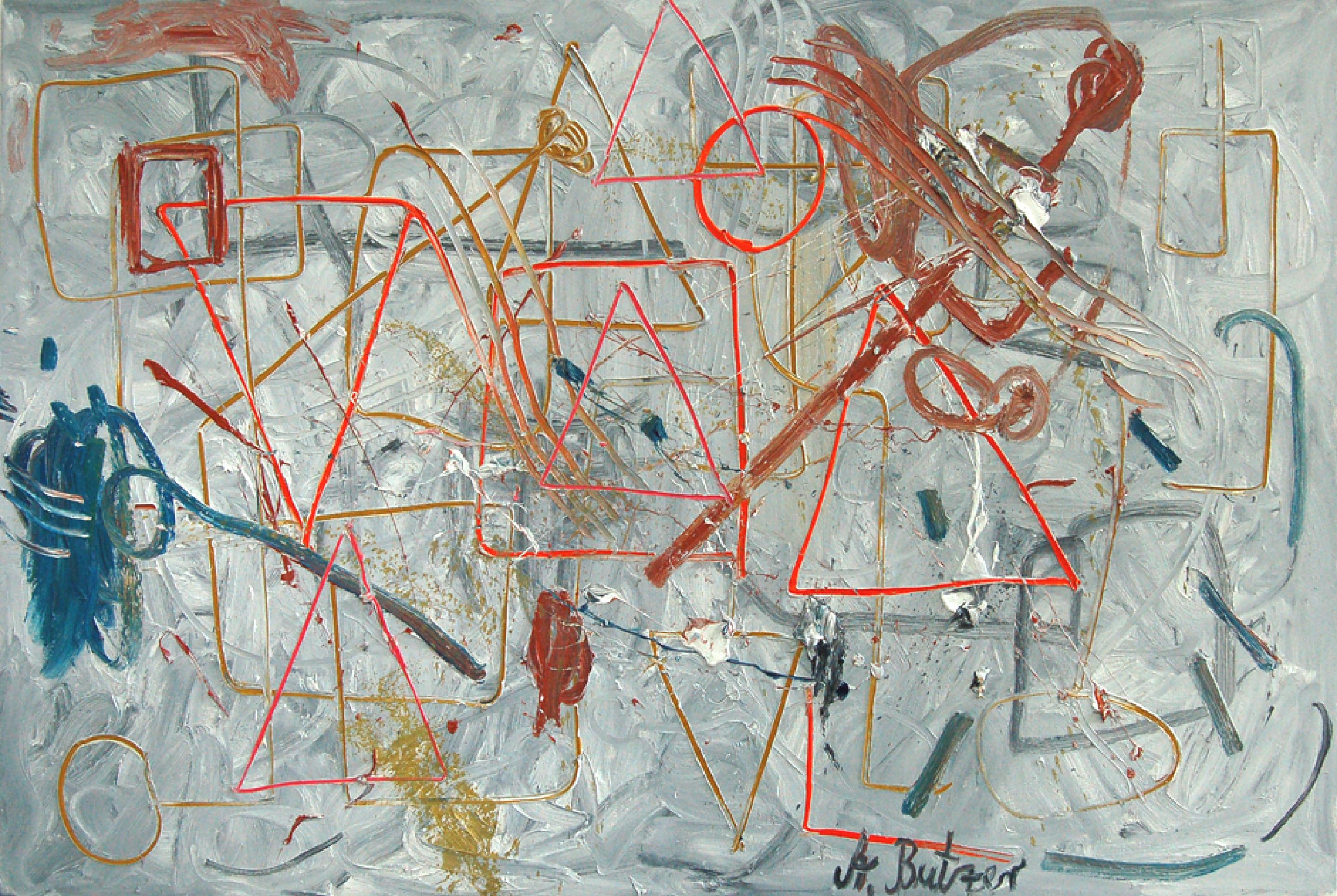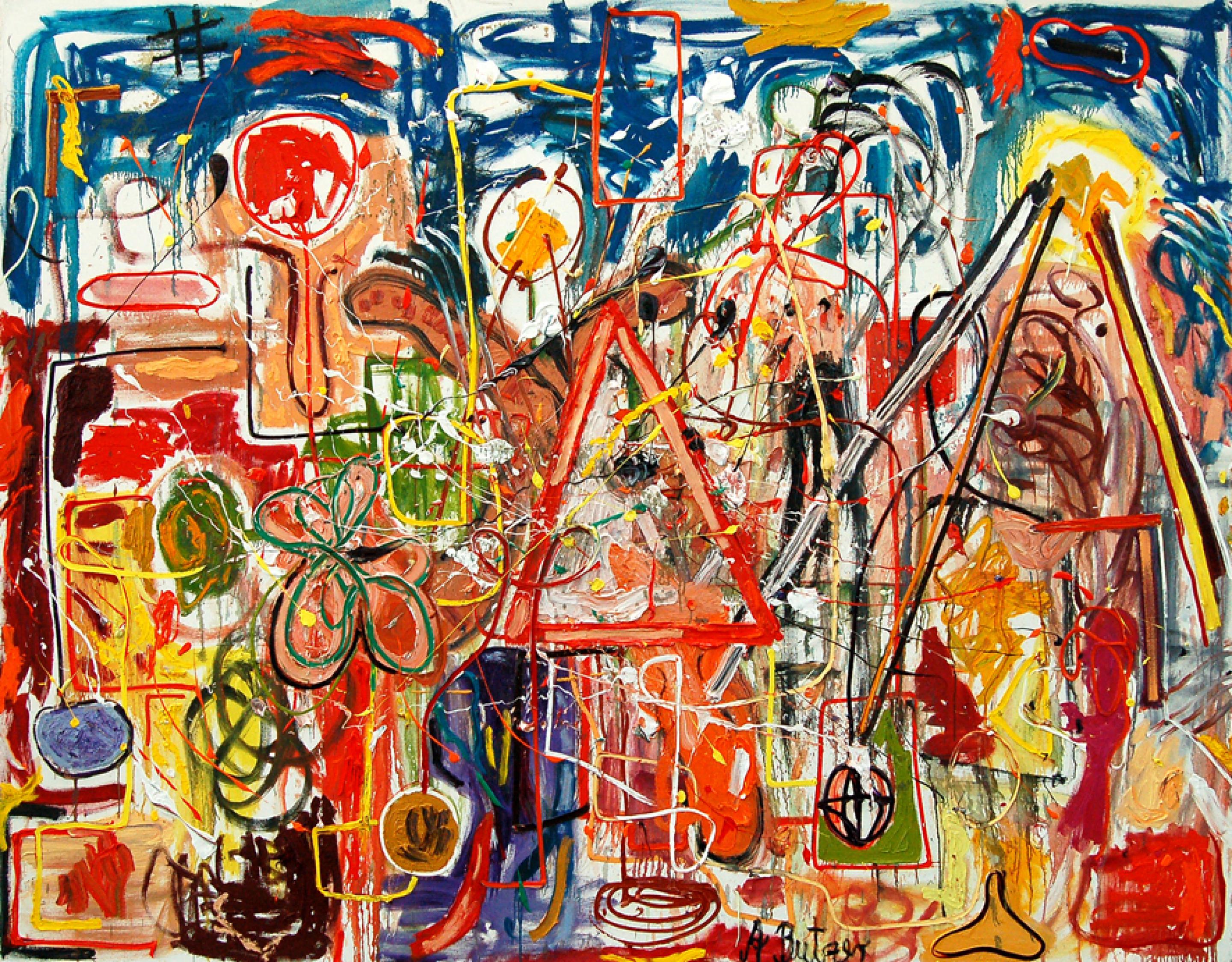 which cross signs and geometrical forms with strong and sprightly colours can be found. Whereas, in other canvases, intense colours mix themselves giving birth to just hinted characters, hidden geometries blended in a brush works chaos.