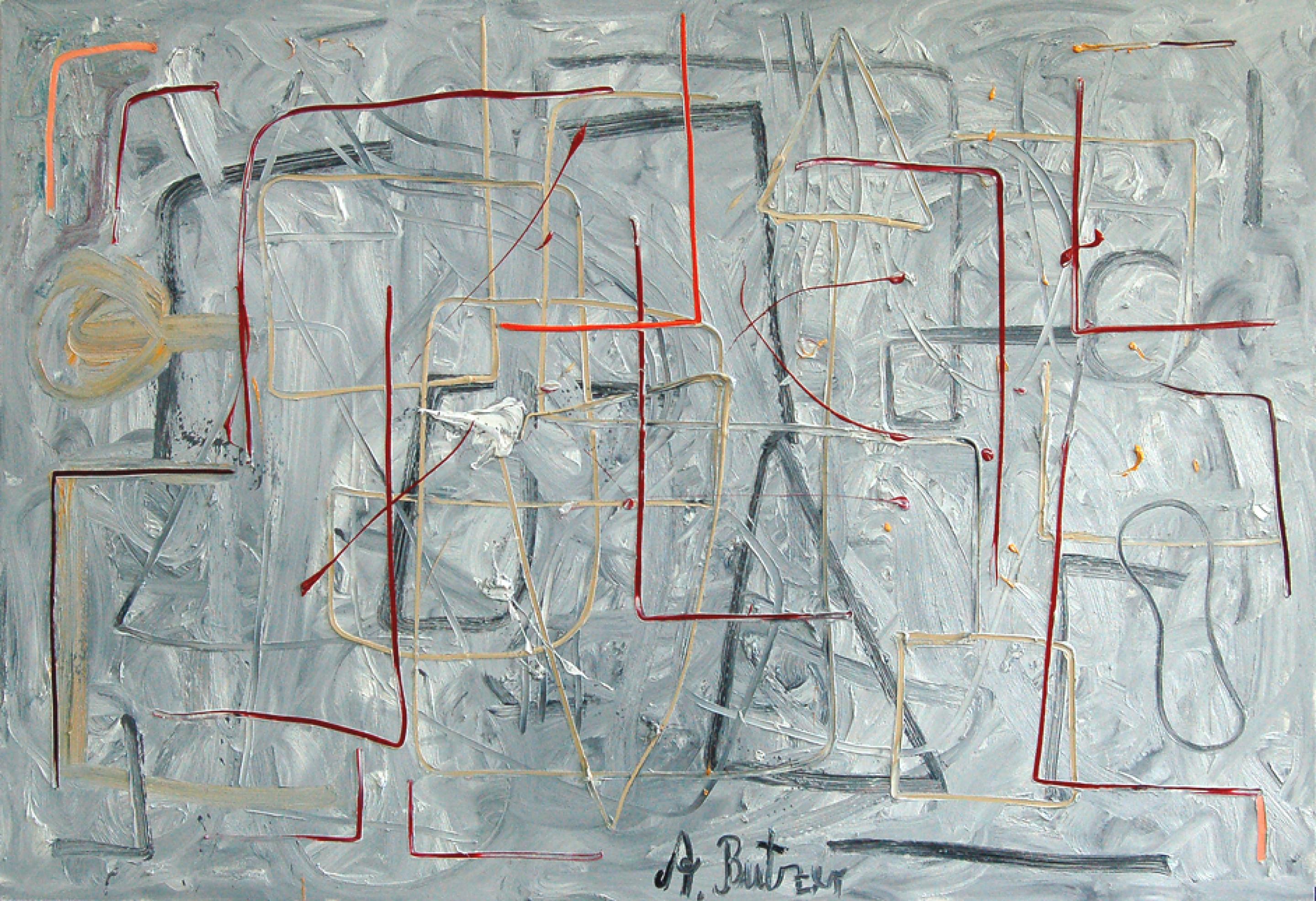 Alcune di queste opere presentano un fondo monocromo, per lo più fatto da diverse tonalità di grigio, sul quale si incrociano segni e forme geometriche dai colori vivi e forti. In altre tele, invece, i colori intensi si mescolano per dare vita a figure appena accennate, geometrie nascoste, che si confondono in un caos di pennellate.