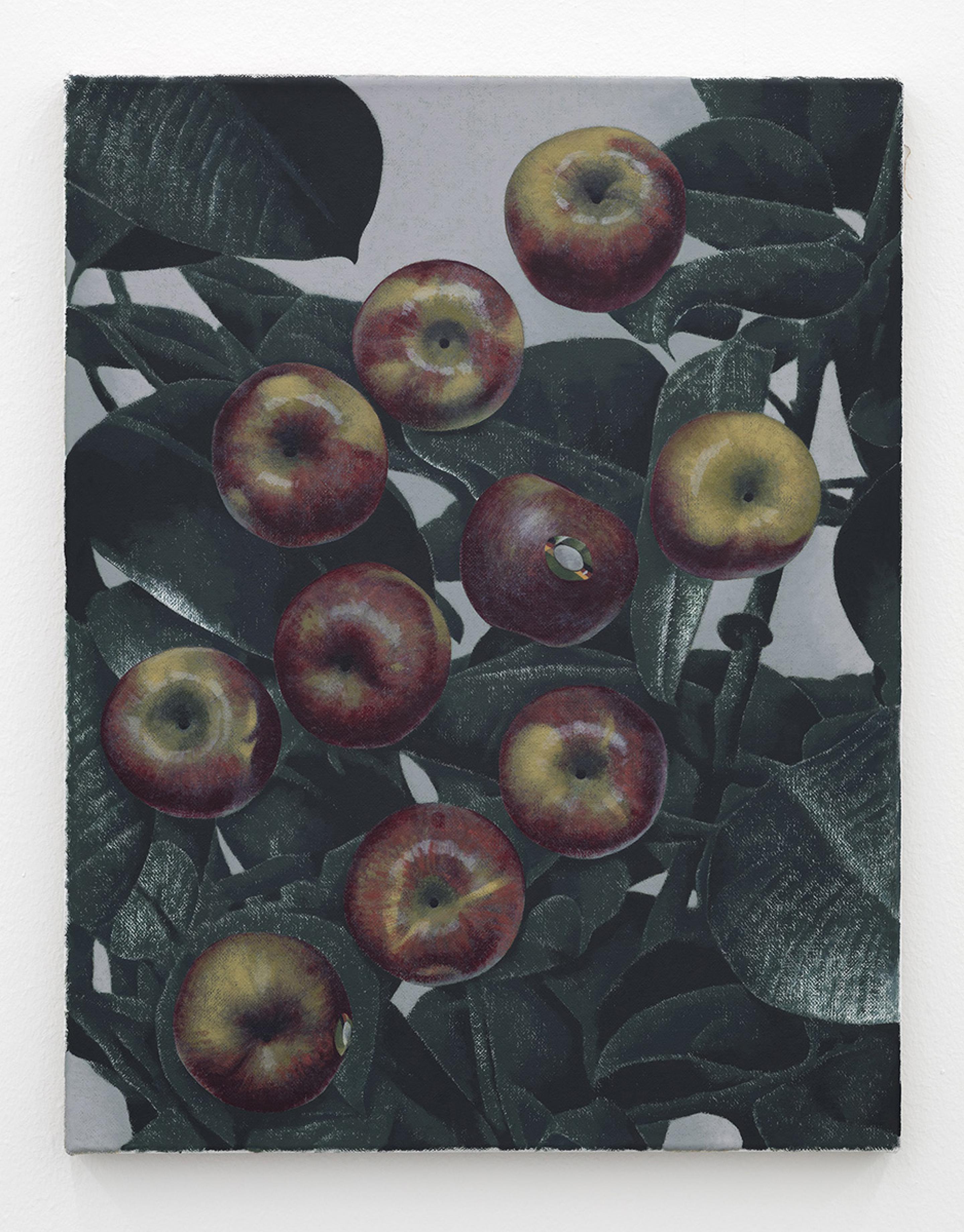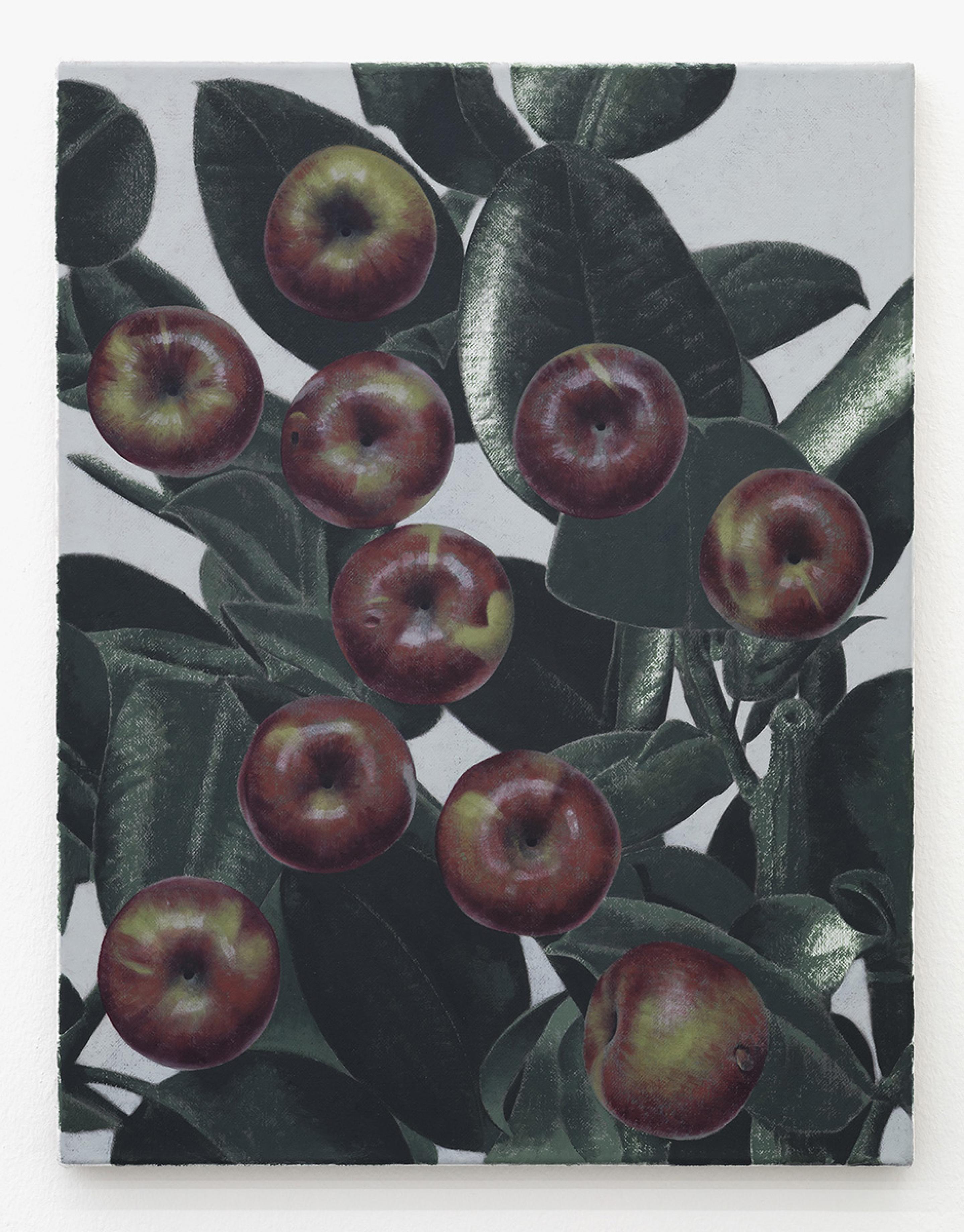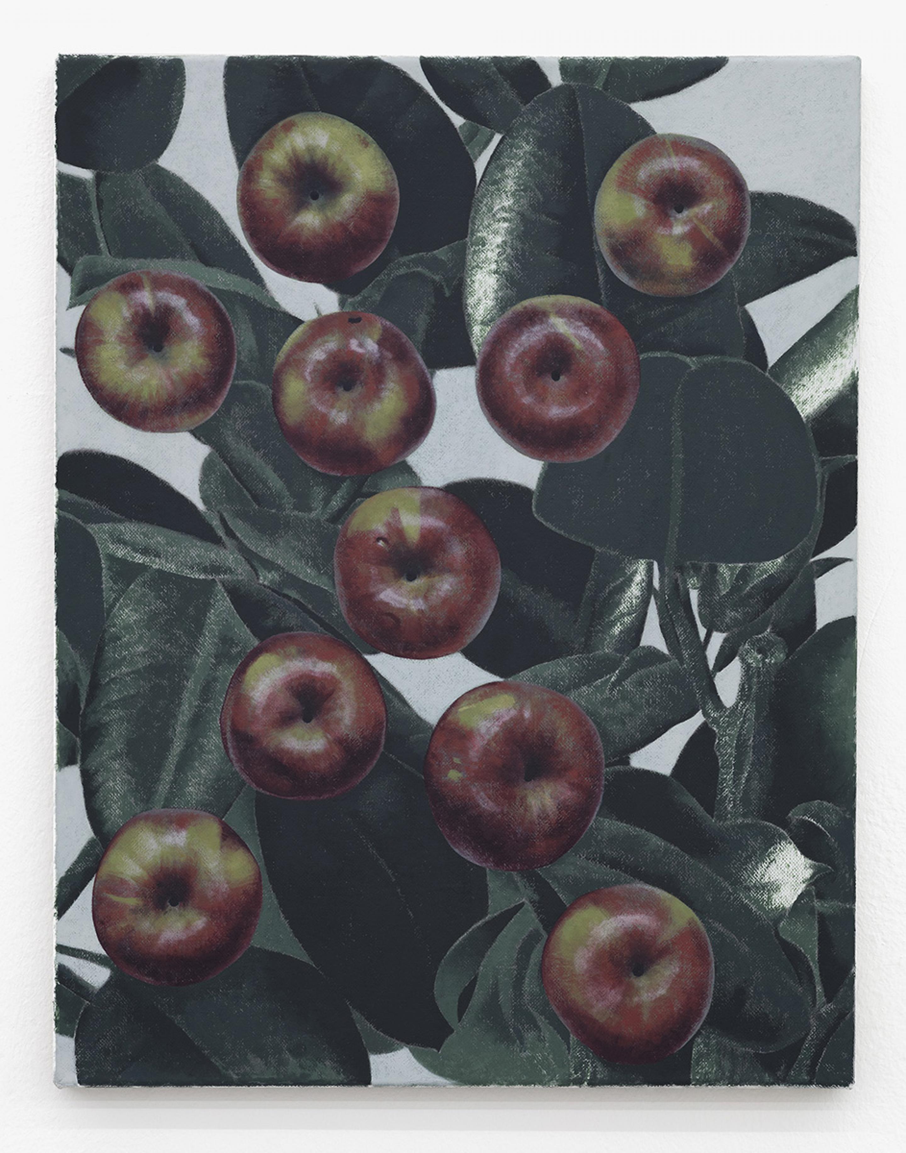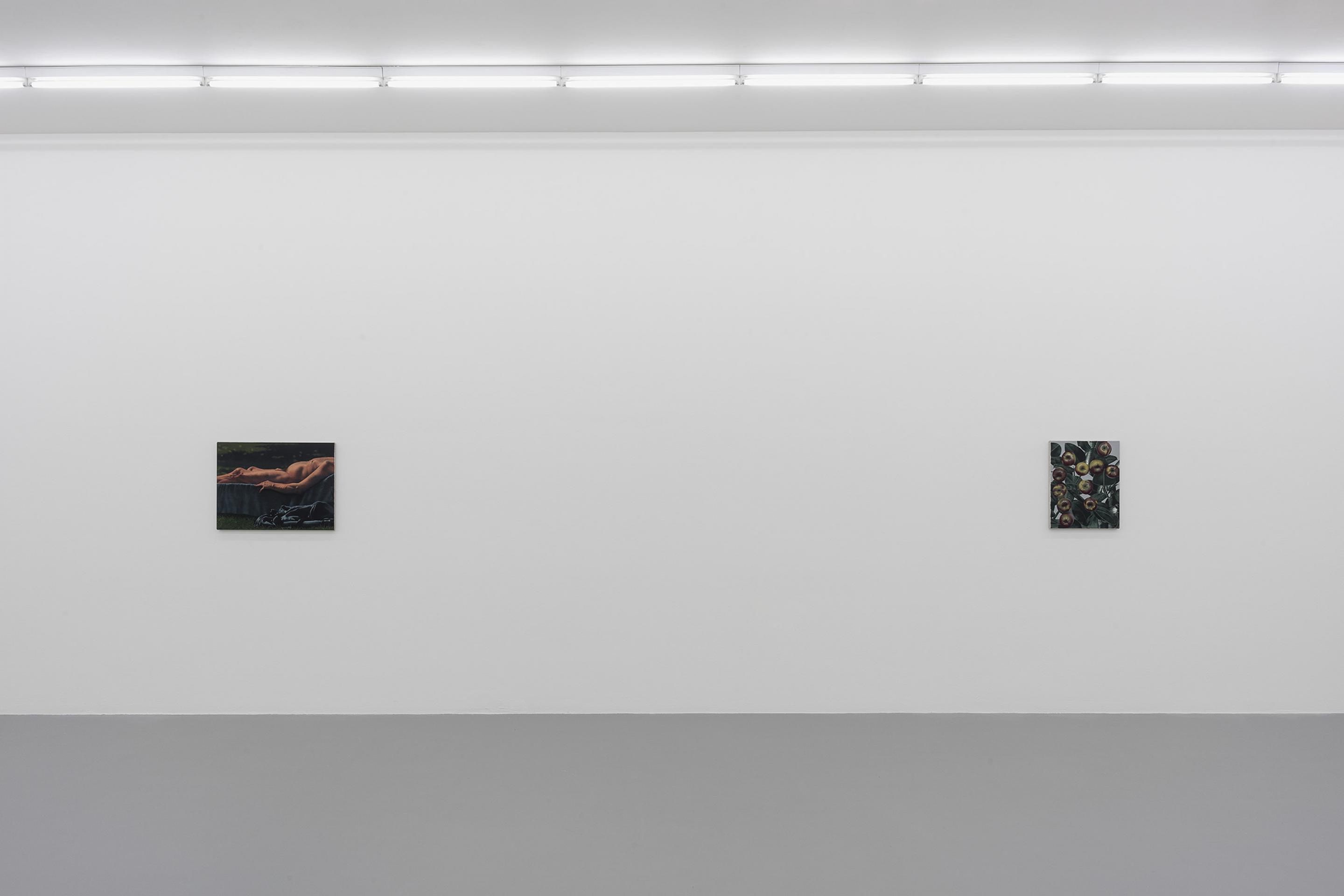 Like the dead metaphors that litter ordinary language (the body of an essay, the face of the clock), painting has metabolised many corpses over time. Plants, bread, nudes and apples in these paintings connote a generalised sense of art history and the language of painting as much as they refer to the objects themselves. A painting of an apple, laden with allegory, is so well-worn a trope that it seems an unrealizable ideal that it could transcend its status as an ur-signifier and be assigned this or that particular meaning. Instead, it is recognisable to us as a metaphor of metaphoric meaning, something that signifies its own power of signification. These tautologies suggest overlaps, imbricated layers of meaning obscuring the one beneath - or they could be circuits that keep returning us to point A.