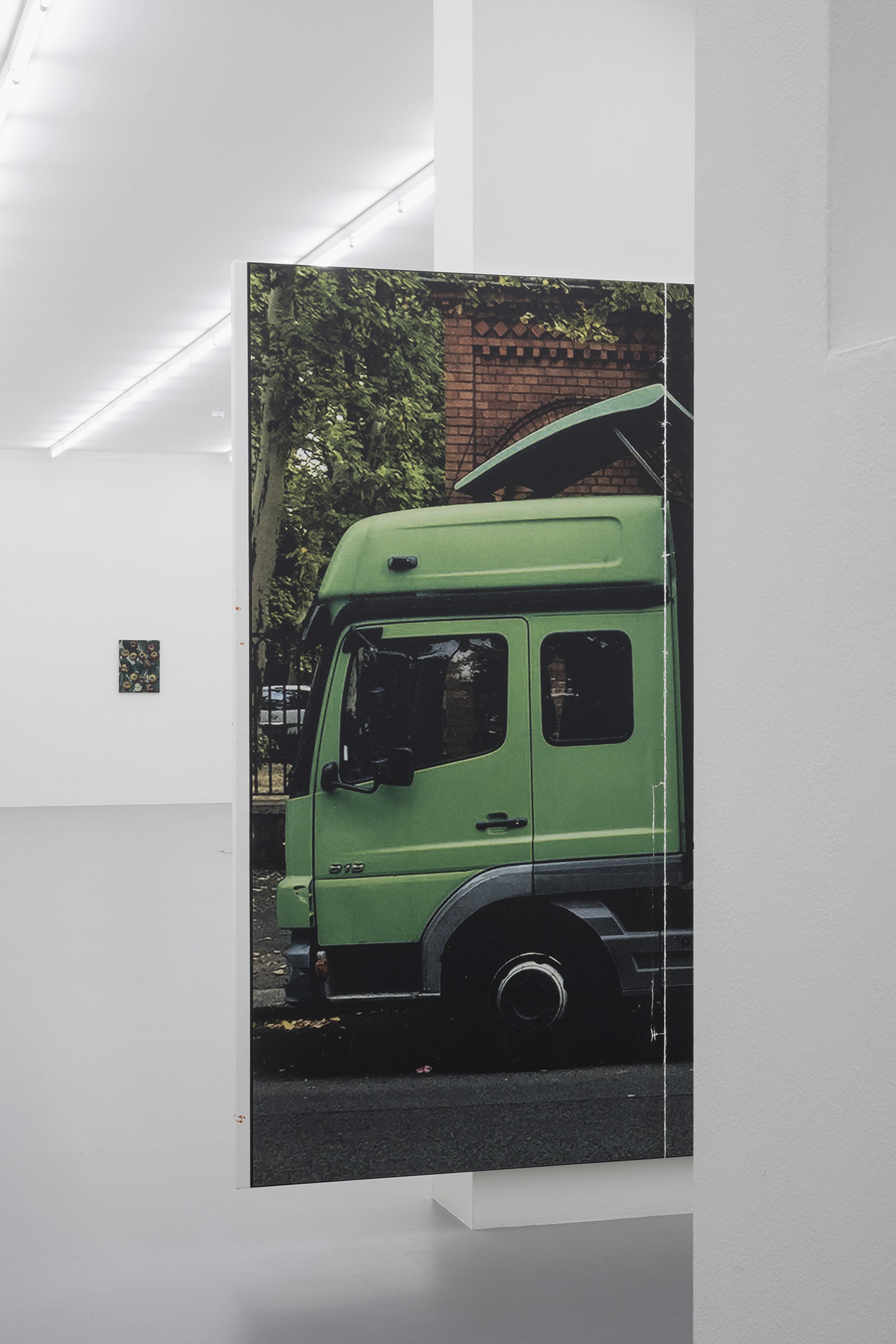 .A vowel is swallowed to measure out the lines ‘FCK SEX ISM’. Sprayed over an image of a glamorous woman begging a pair of indifferent trousered legs, it’s an act of earnest detournement that bears a strong family resemblance to early aughts Adbusters as much as much as its enjambmed typography recalls Christopher Wool. Redeployed as a large pigment print on canvas it manifests another layer of codes that we recognise from recent process painting. Despite a modicum of distancing effect, its flat statement of certainty is hard to tear away from. This all-too-easy legibility draws an ever tighter circle of relations, a more insistent and immediate set of meanings that moves the painting closer to something like every day language.