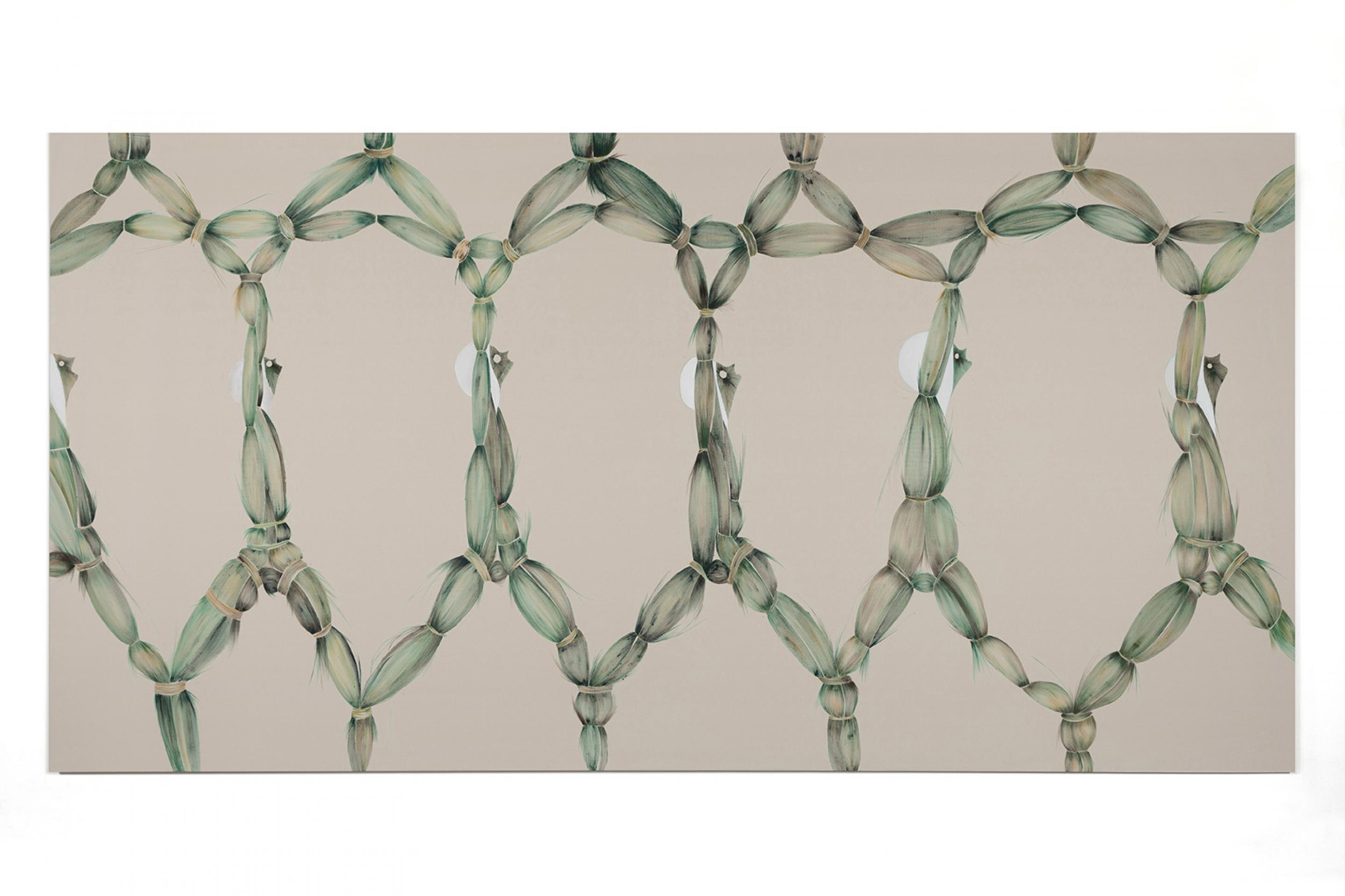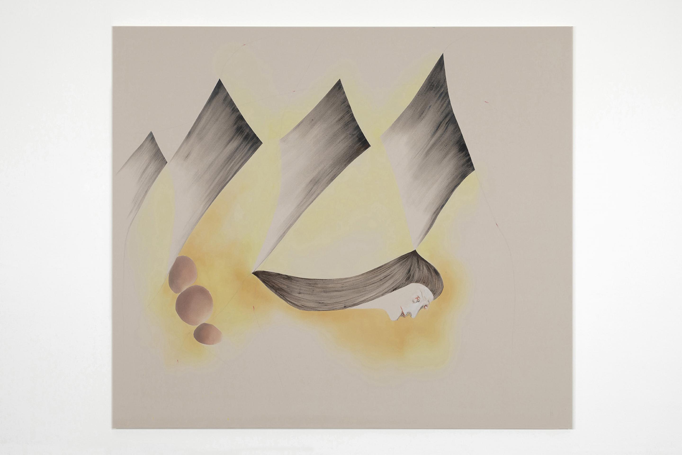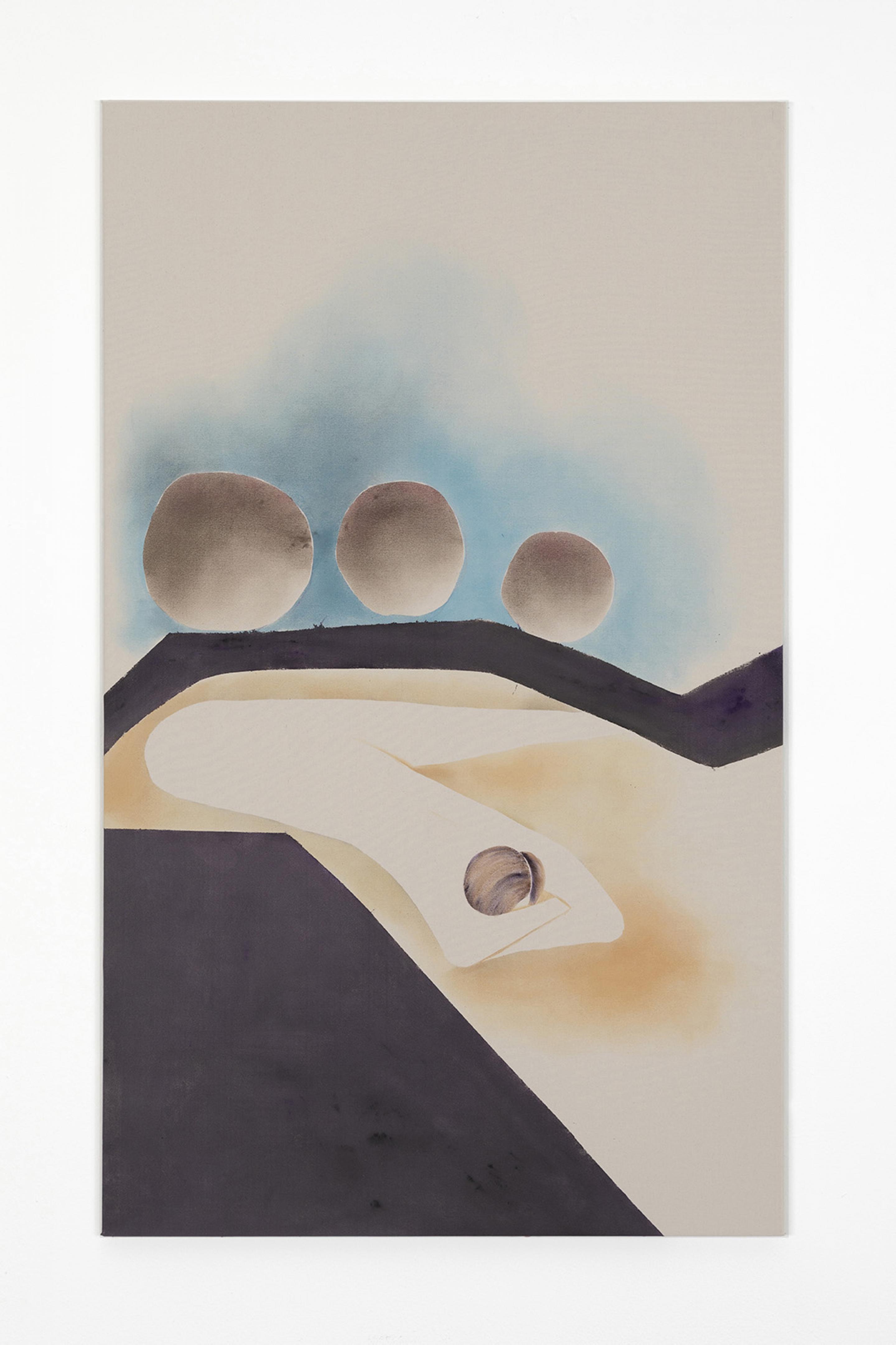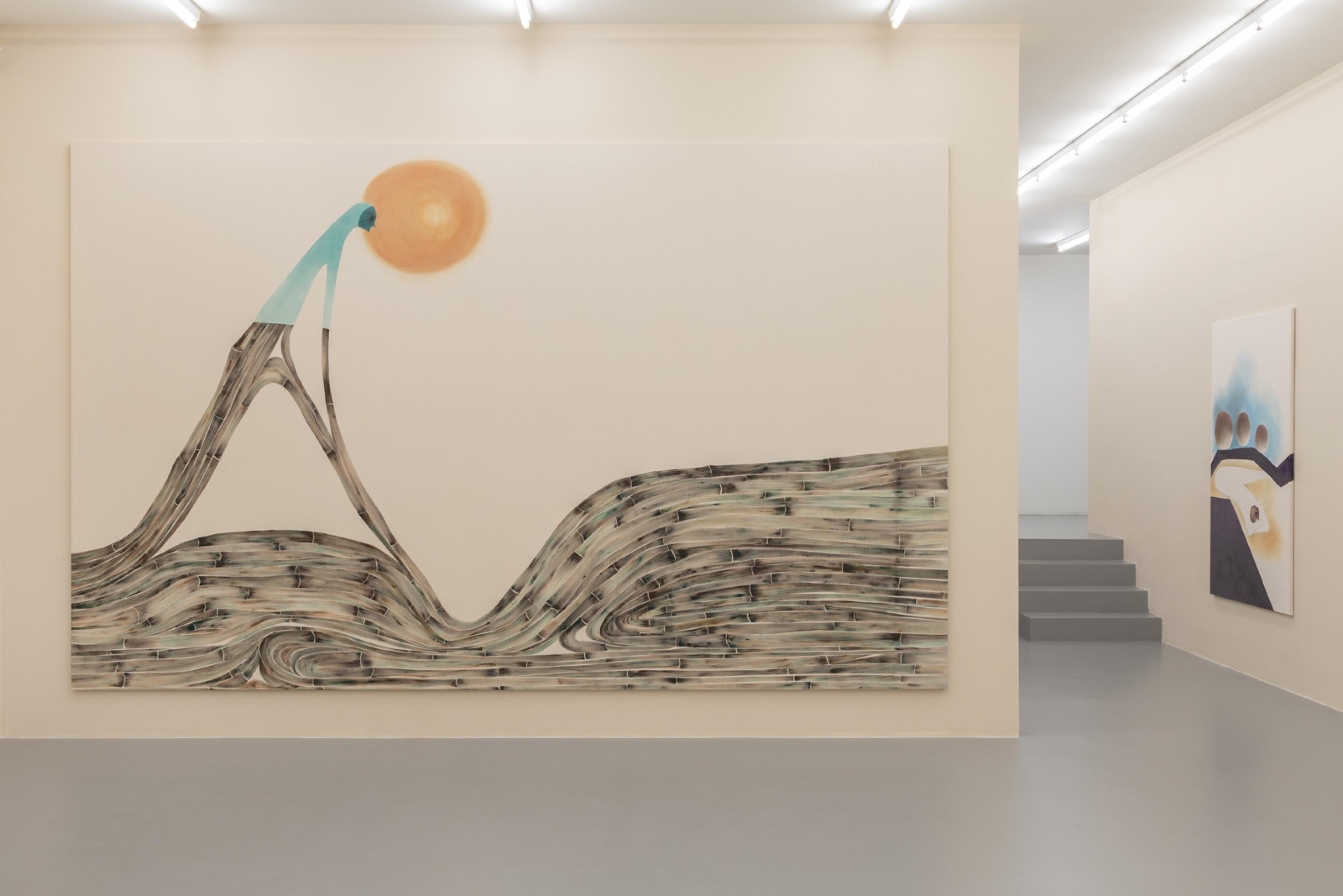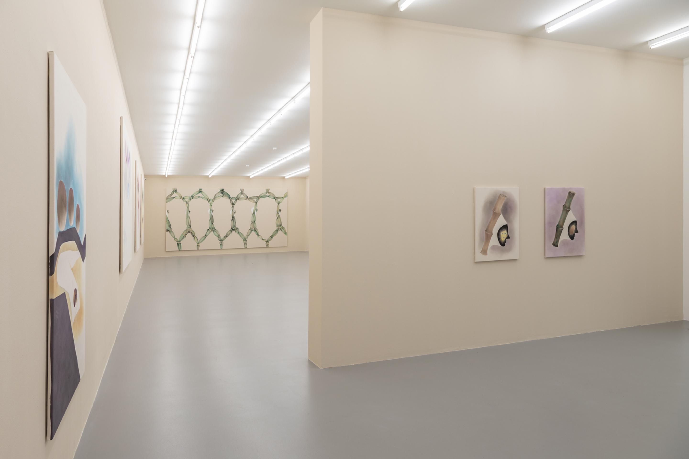 Bassa marea al molo, Fossa madre, Cielo trema o niente, Punti di fiamma, Salvezza trovata in cielo, together with the exhibition’s title piece Cielo di giugno (all works 2020) reveal the unfolding of the images at a faster pace, with the excited gesture of something happening or about to happen: instants that spin around before falling back on themselves, sowing signs of sentiment. The work evokes a sculptural feel that refers to natural elements such as grass, bamboo canes, mud, materials frequently found in Enrico David’s work. The gallery walls are painted in the same natural tone as the canvases in order to enhance the materiality – or its absence – of the pictorial surface.
