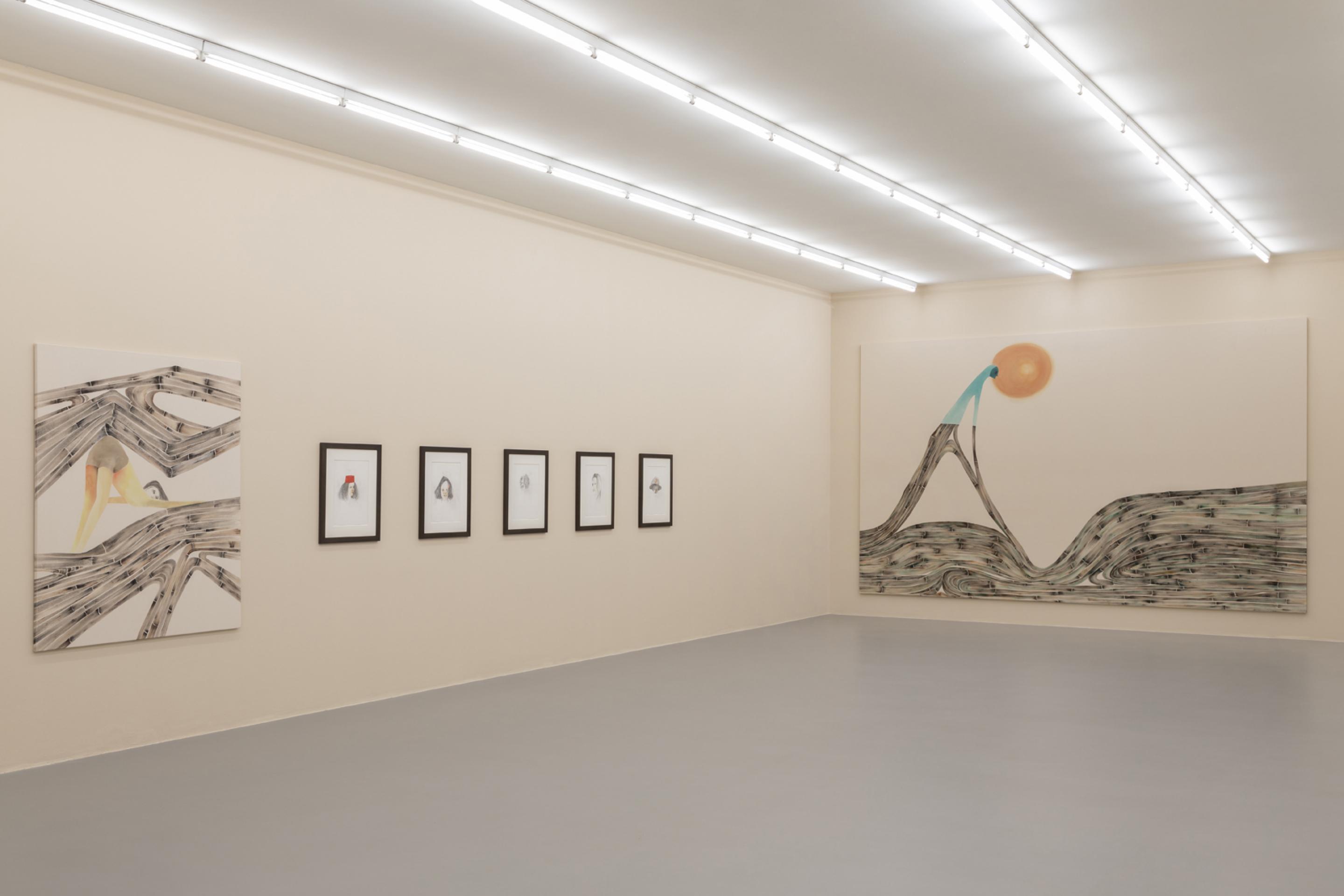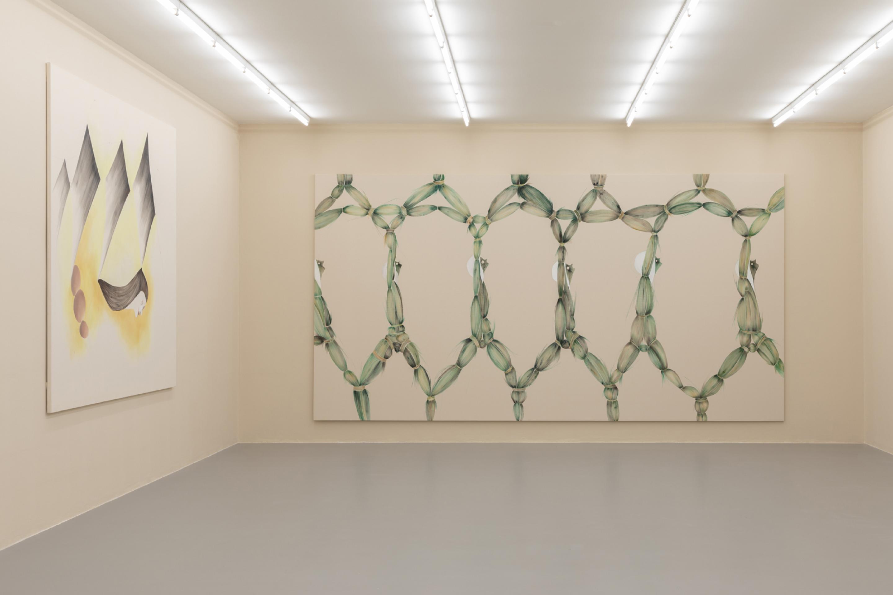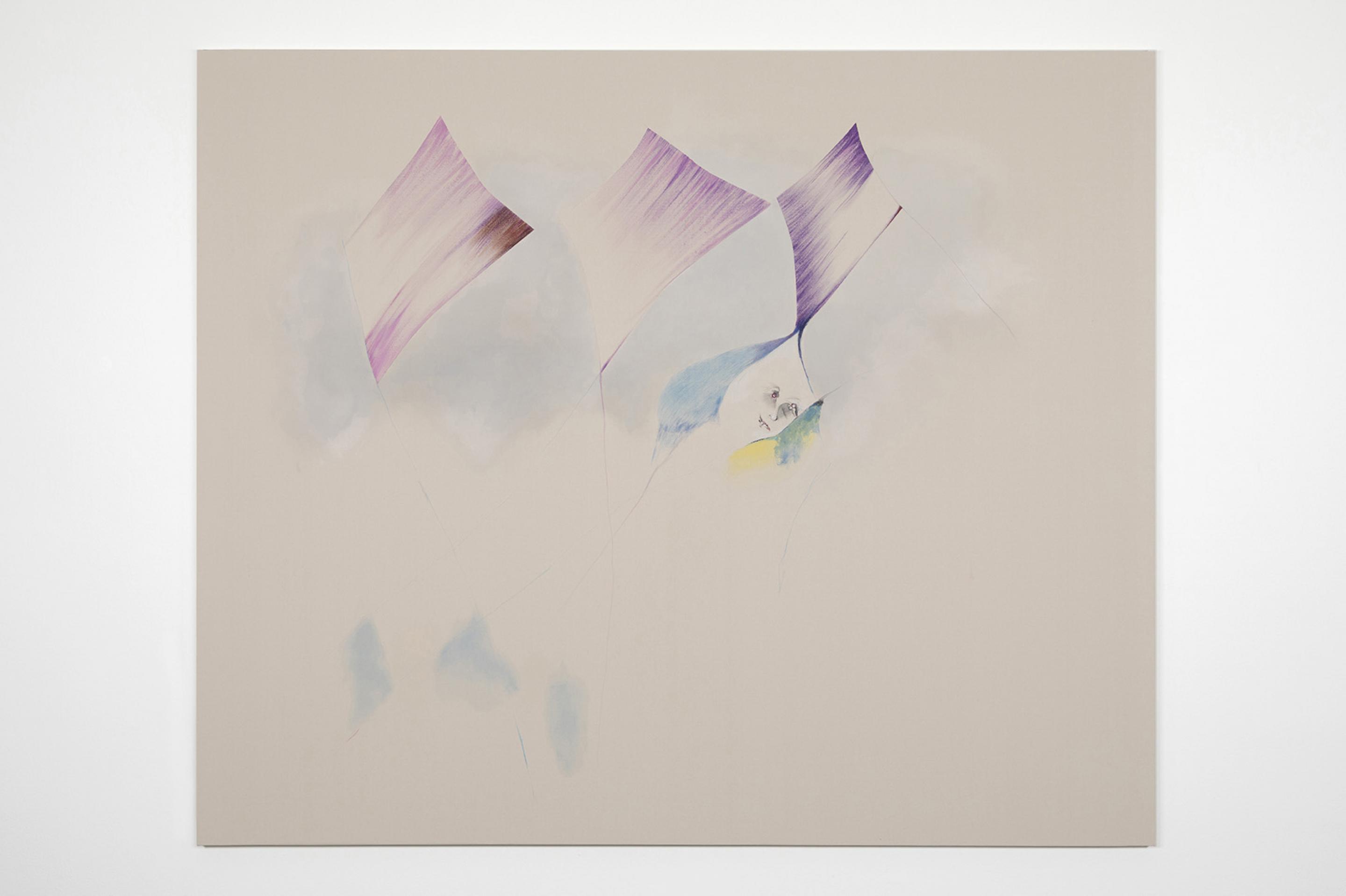 The exhibition comprises three groups of paintings. On the shorter walls of the space two works are being displayed which function as an imaginary parenthesis, facing each other and enclosing their content. Il fraterno silenzio del fango (2020) and Zattera viva (2020) are two large canvases which, like an architecture, form a supporting structure for the other works and represent the trellis onto which all the rest is fixed, entangled: kites, hovering in a light that no longer conveys matter, and with their eternal melancholic dream they yield to their fall. Or rafts, whose color blends and dissolves, and whose customary harmony – both reflective and meditative - holds earth and sky together, the material and the incorporeal, on the verge of dissolving. In contrast, the small canvases are virtually studies, compositions which, like riddles, explore the possibility of painting, or how to paint in the least pictorially possible way.
