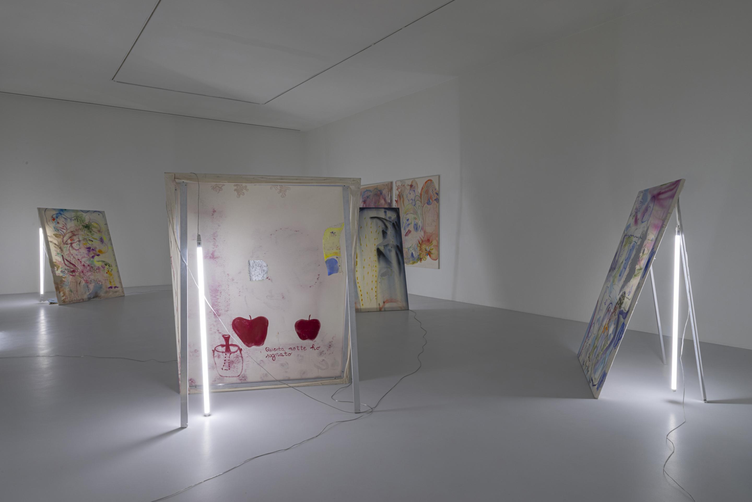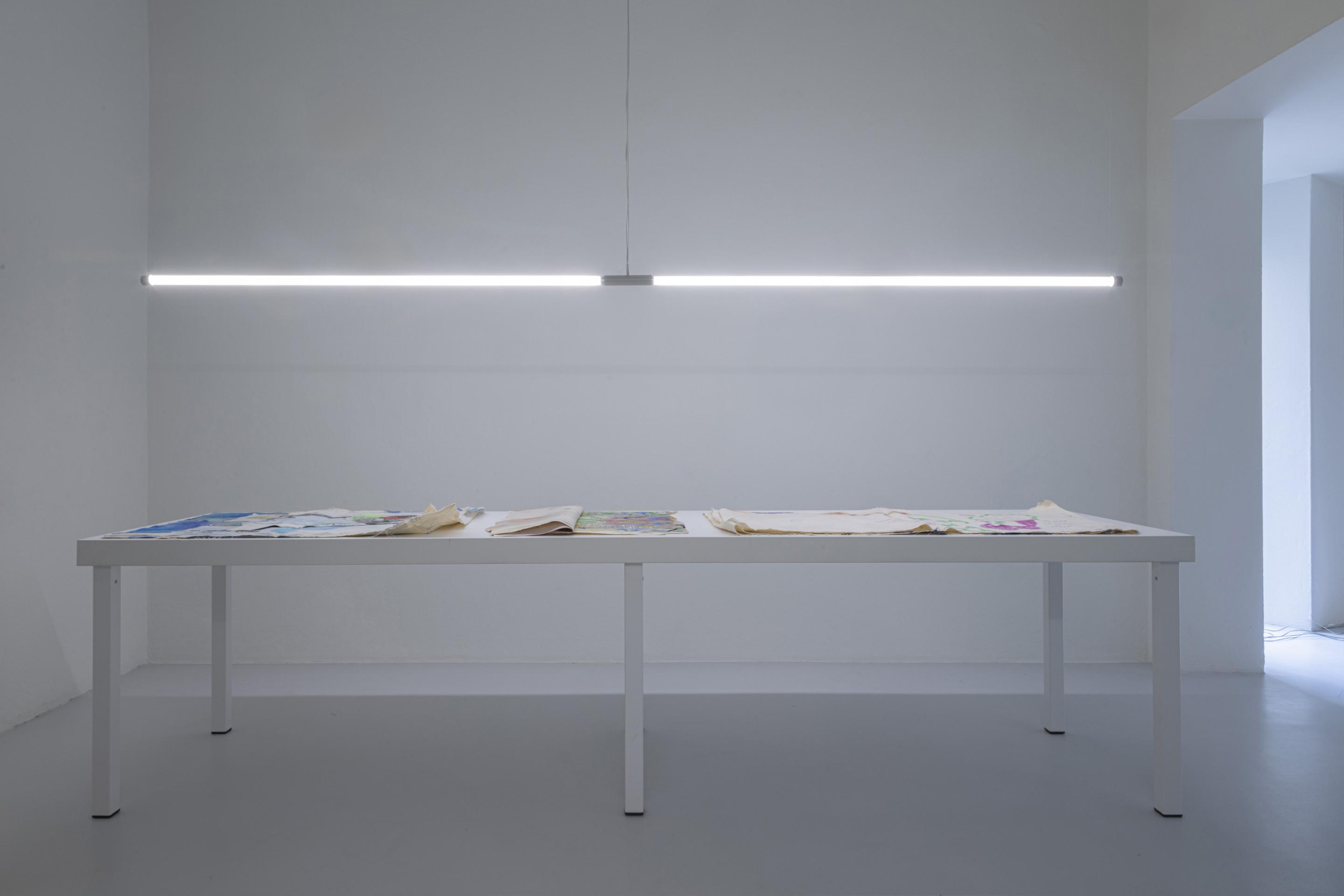 Retroilluminata, in modo che fronte e retro si fondano, la tela piatta si svolge in uno spazio fittizio che racchiude una stratificazione di frammenti onirici, a metà tra pittura, gioco d’ombre e disegno di scena. Su un tavolo, brandelli di tela sono disposti a mo’ di libri. Muovendosi tra le opere, queste si relazionano con il corpo, creano spazi meditativi fatti di grovigli di forme che alludono a paesaggi, volti, espressioni, animali mitologici, piante e molto altro. L’allestimento appare quasi arcaico, come se si trattasse di pitture rupestri custodi di memoria con una storia da raccontare, reminiscenti di un senso storico profondamente consapevole del proprio scarto dalla realtà.
