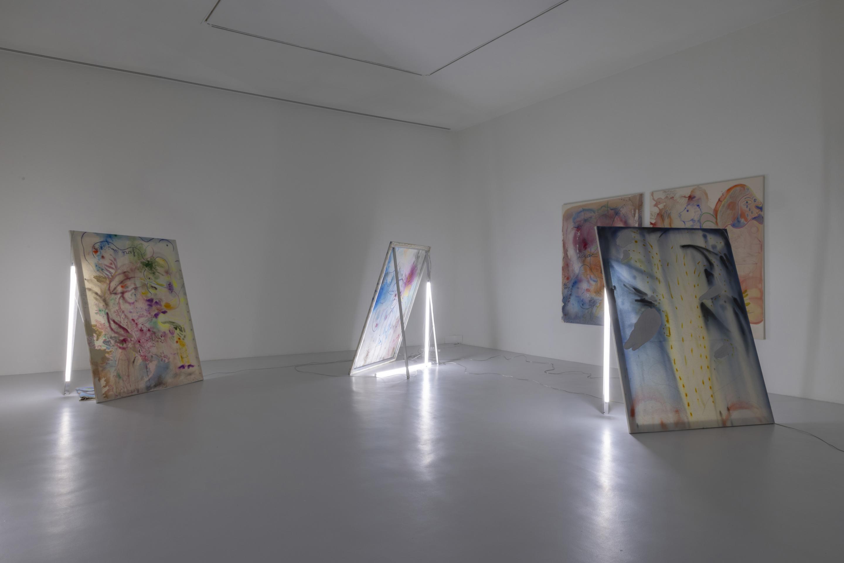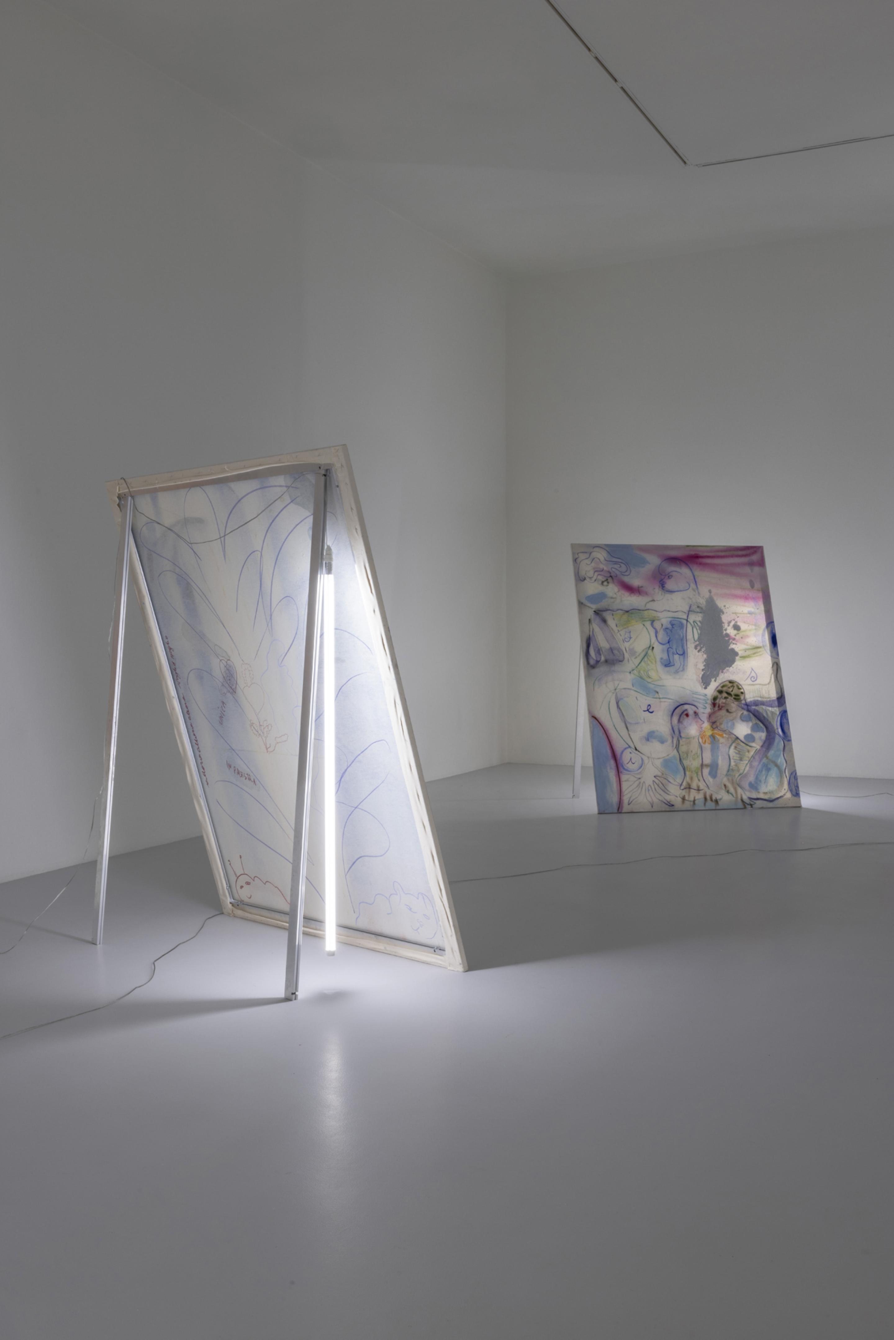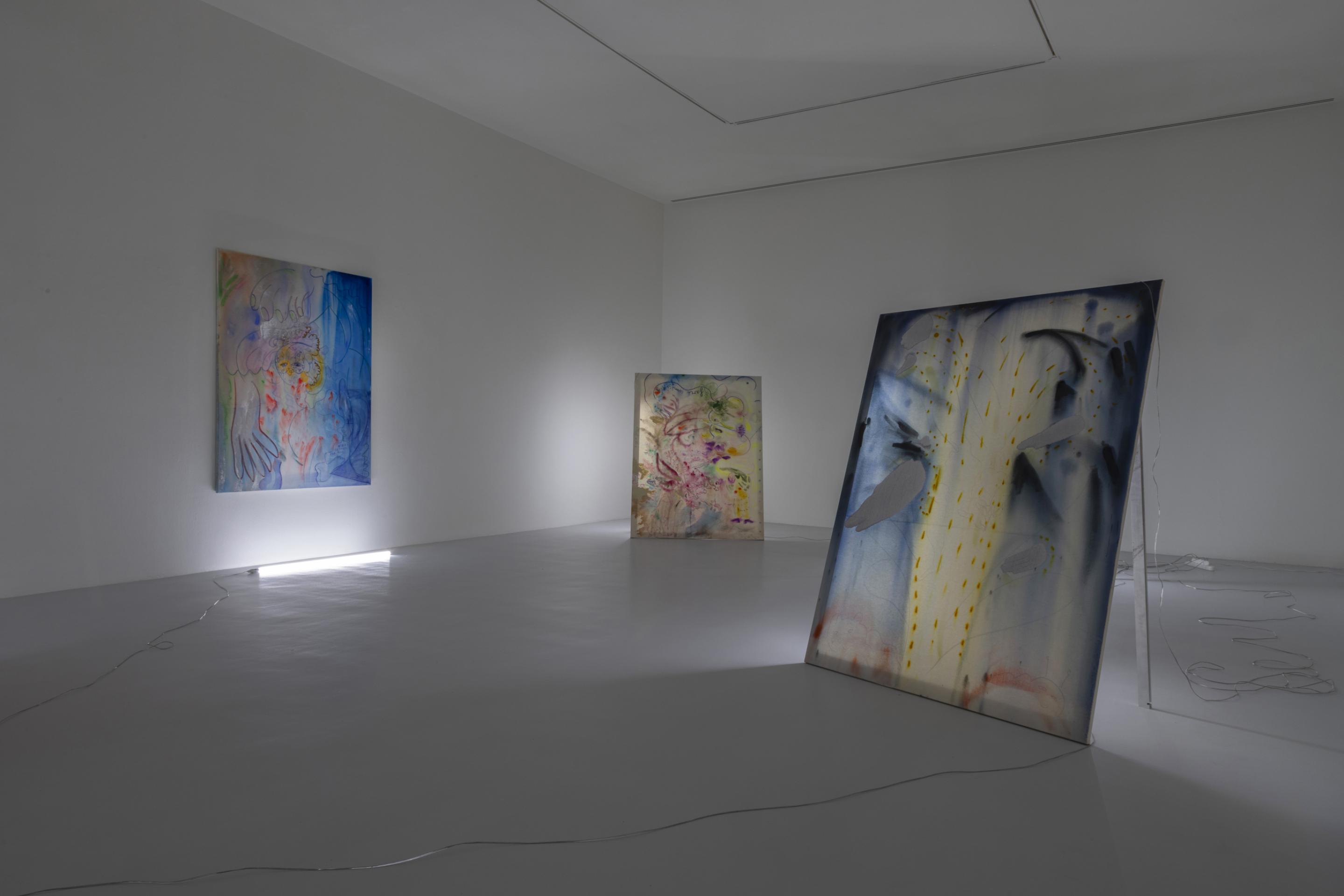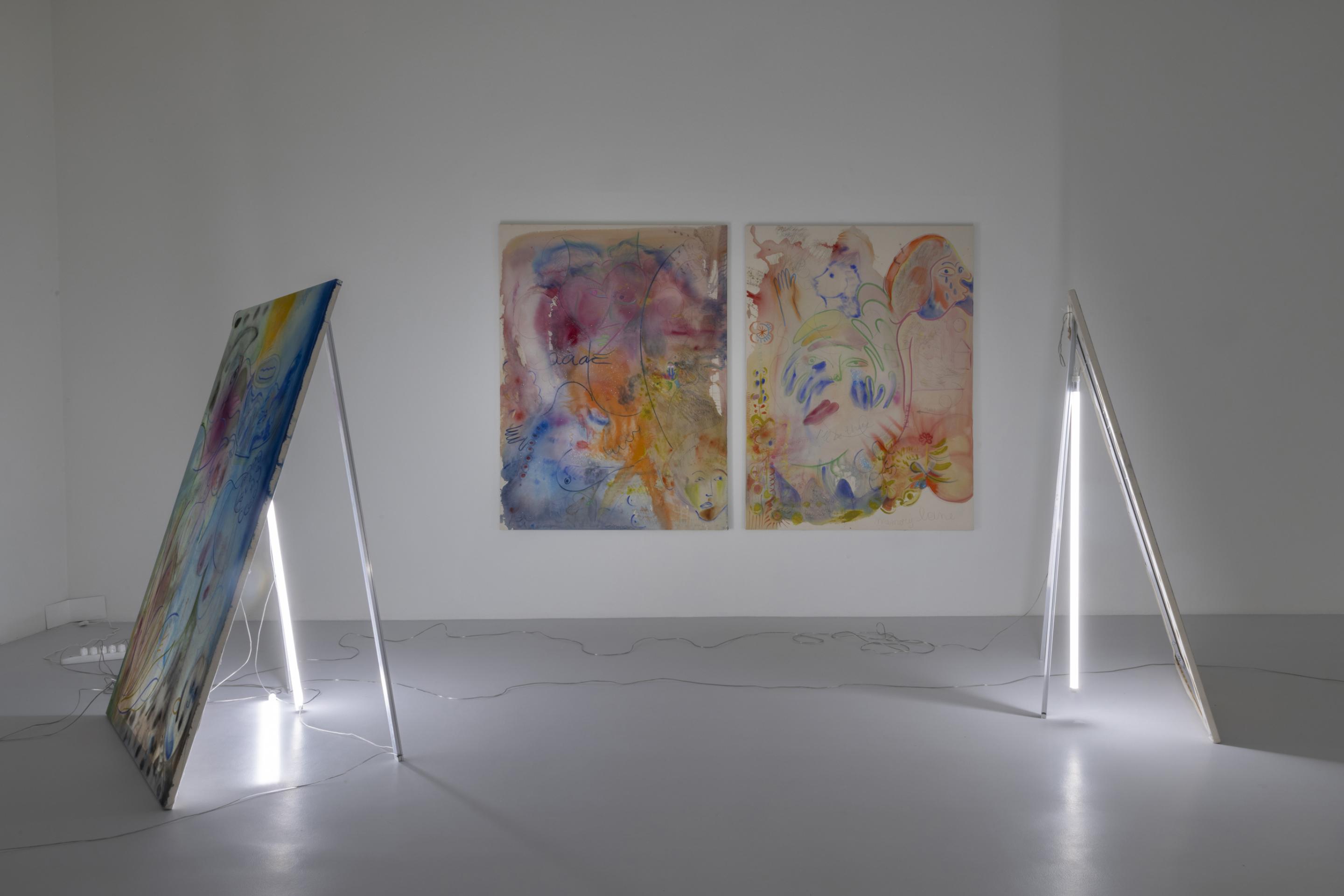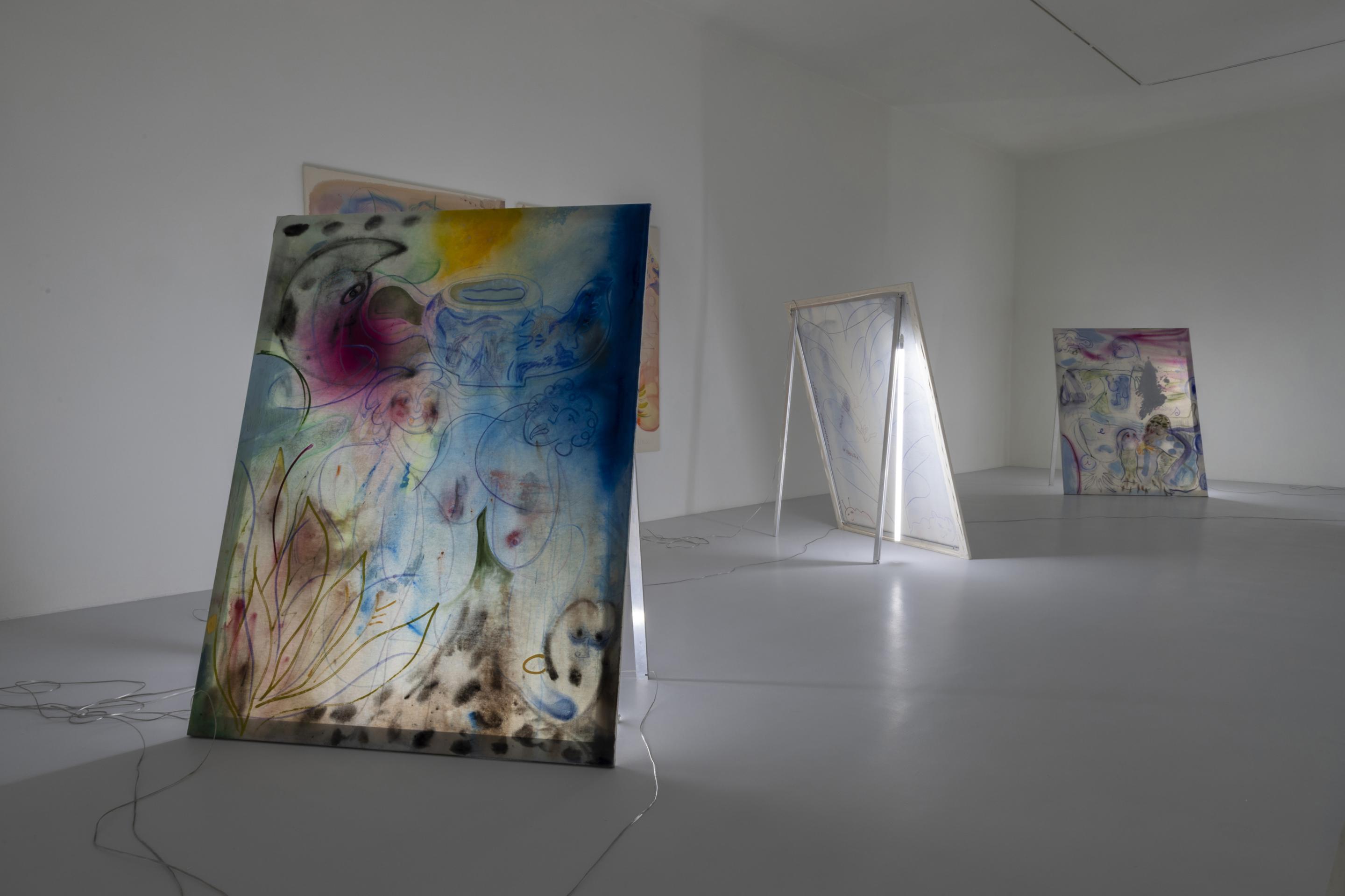 Lit from behind, fore- and background merge, the flat canvas unfolds a fictive space encompassing layers of dream-like fragments, appearing somewhere between painting, shadow play and set design. Laid out on a table, fragments of canvas are laid out like books. Moving between the works, they relate to the body, create meditative spaces of intermingling shapes that allude to landscapes, faces, expressions, mythological animals, plants and many other forms. Their installation seems almost archaic, like cave paintings holding memory and telling a story, evoking a sense of the historical that is deeply aware of its gap to reality. As much as they look back, though, they too look forward, playing freely with references in order to forge a new vocabulary that seeks to re-enchant the world.
