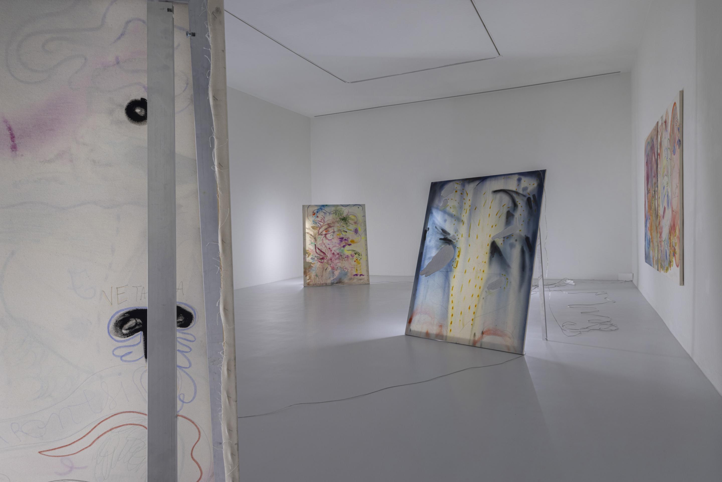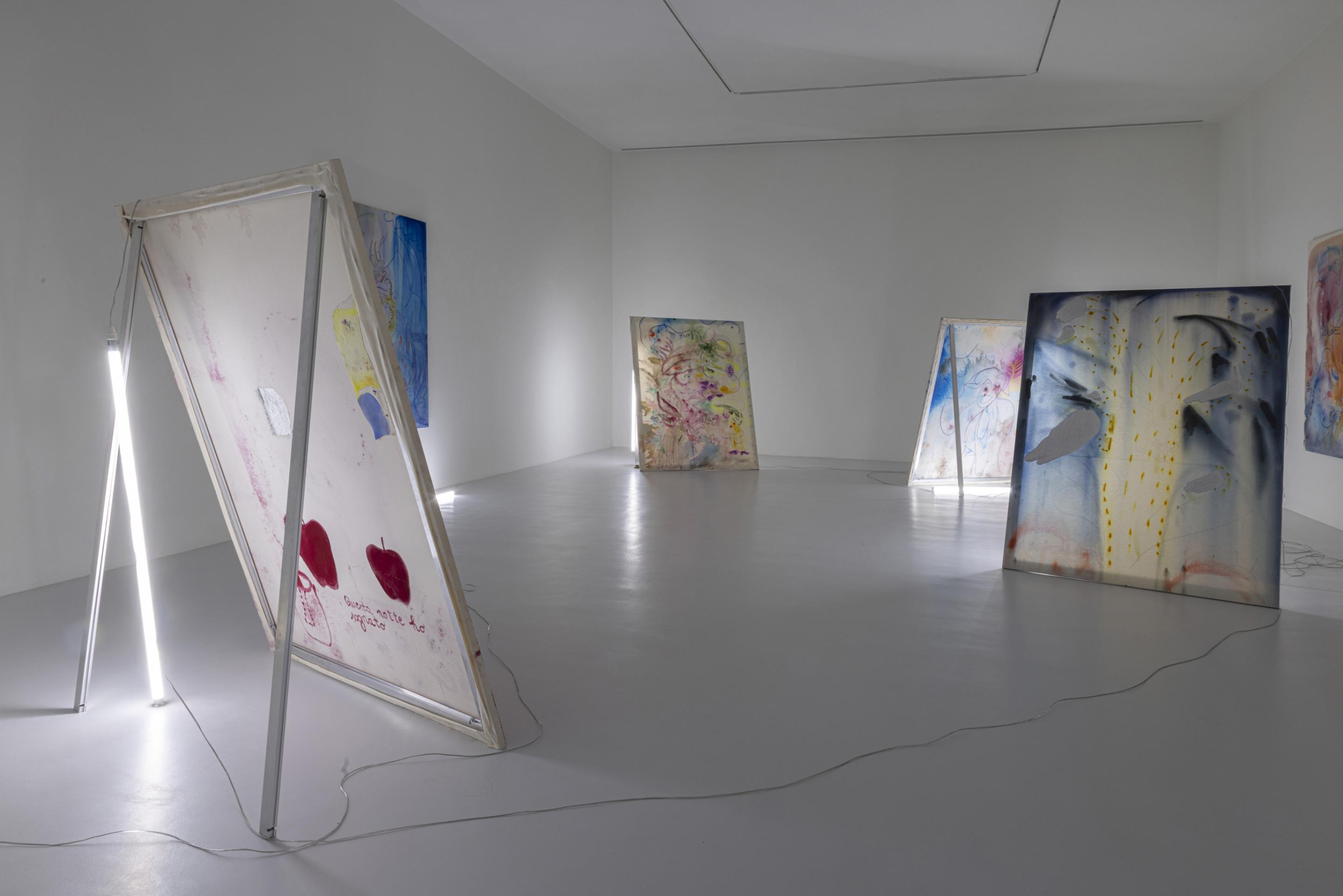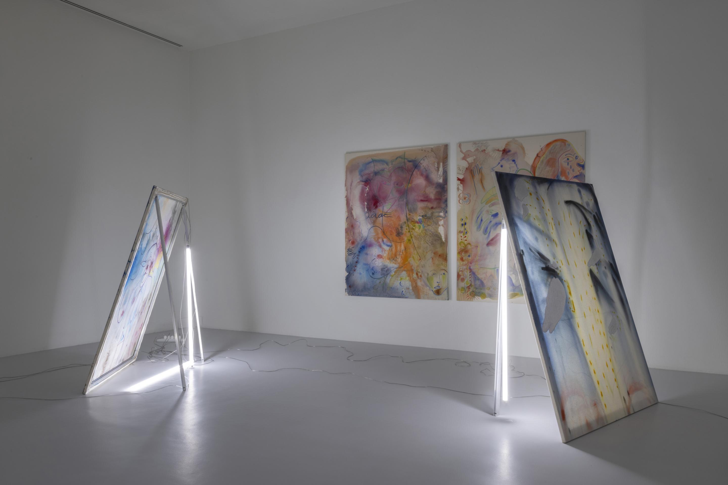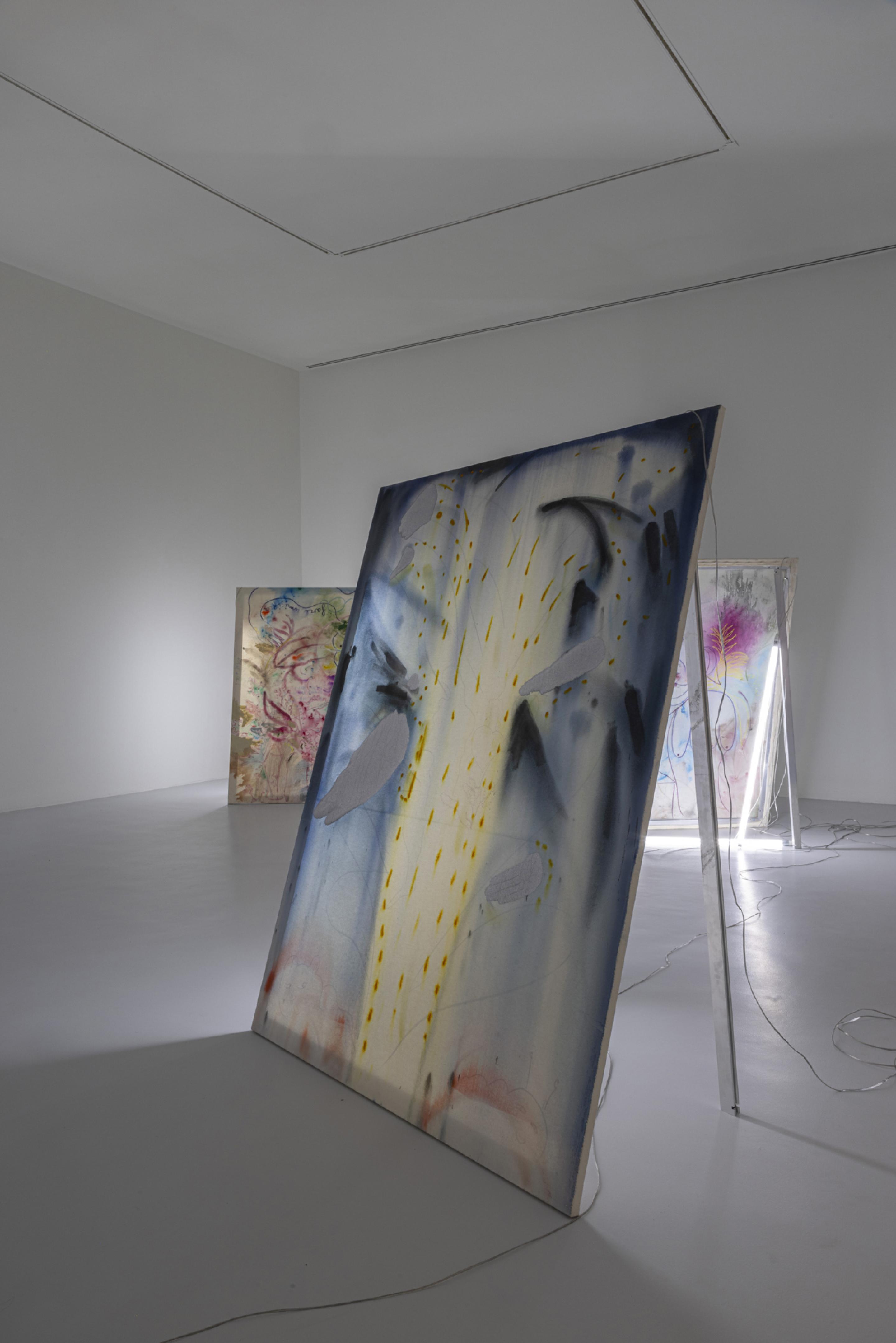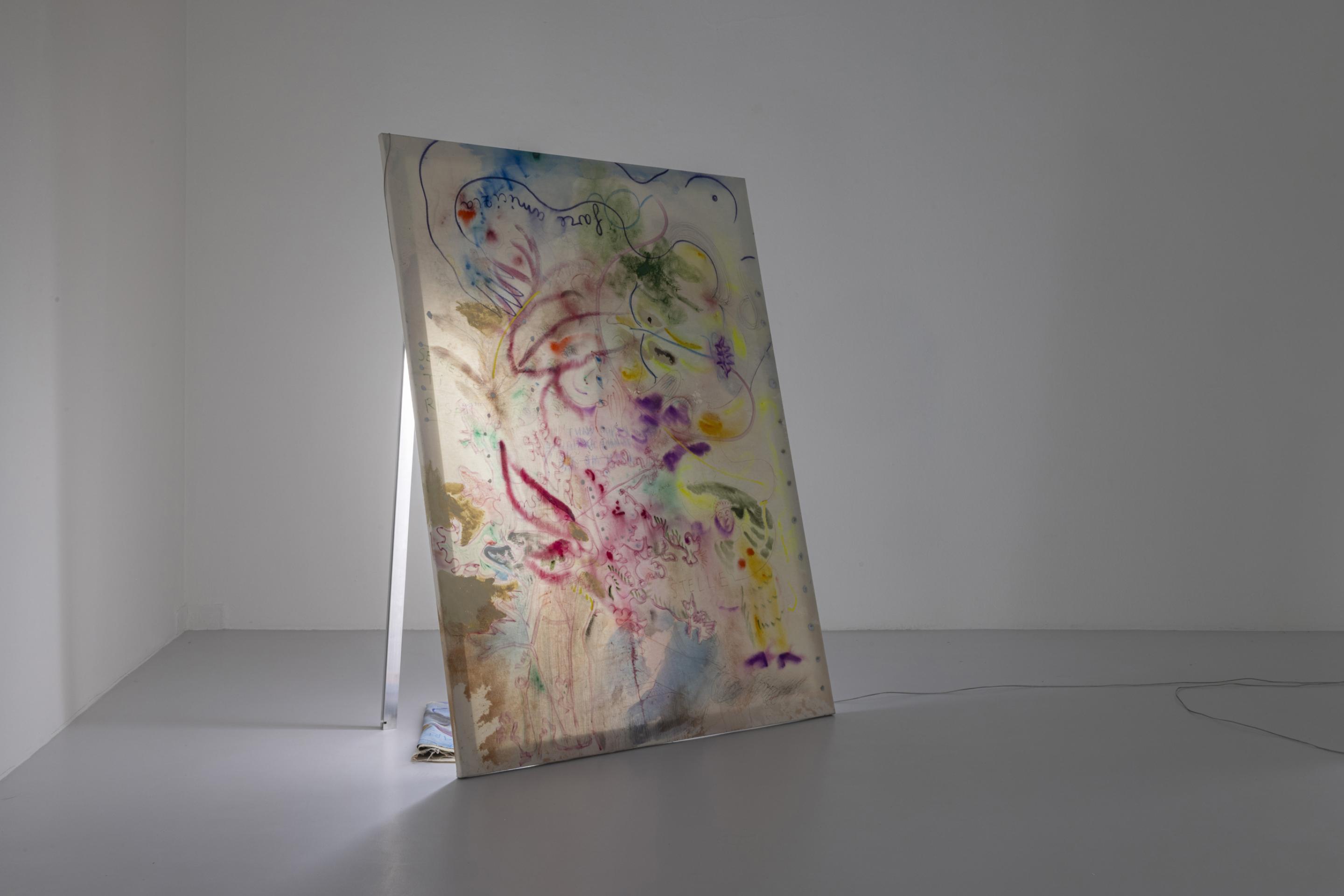 Lit from behind, fore- and background merge, the flat canvas unfolds a fictive space encompassing layers of dream-like fragments, appearing somewhere between painting, shadow play and set design. Laid out on a table, fragments of canvas are laid out like books. Moving between the works, they relate to the body, create meditative spaces of intermingling shapes that allude to landscapes, faces, expressions, mythological animals, plants and many other forms. Their installation seems almost archaic, like cave paintings holding memory and telling a story, evoking a sense of the historical that is deeply aware of its gap to reality. As much as they look back, though, they too look forward, playing freely with references in order to forge a new vocabulary that seeks to re-enchant the world.