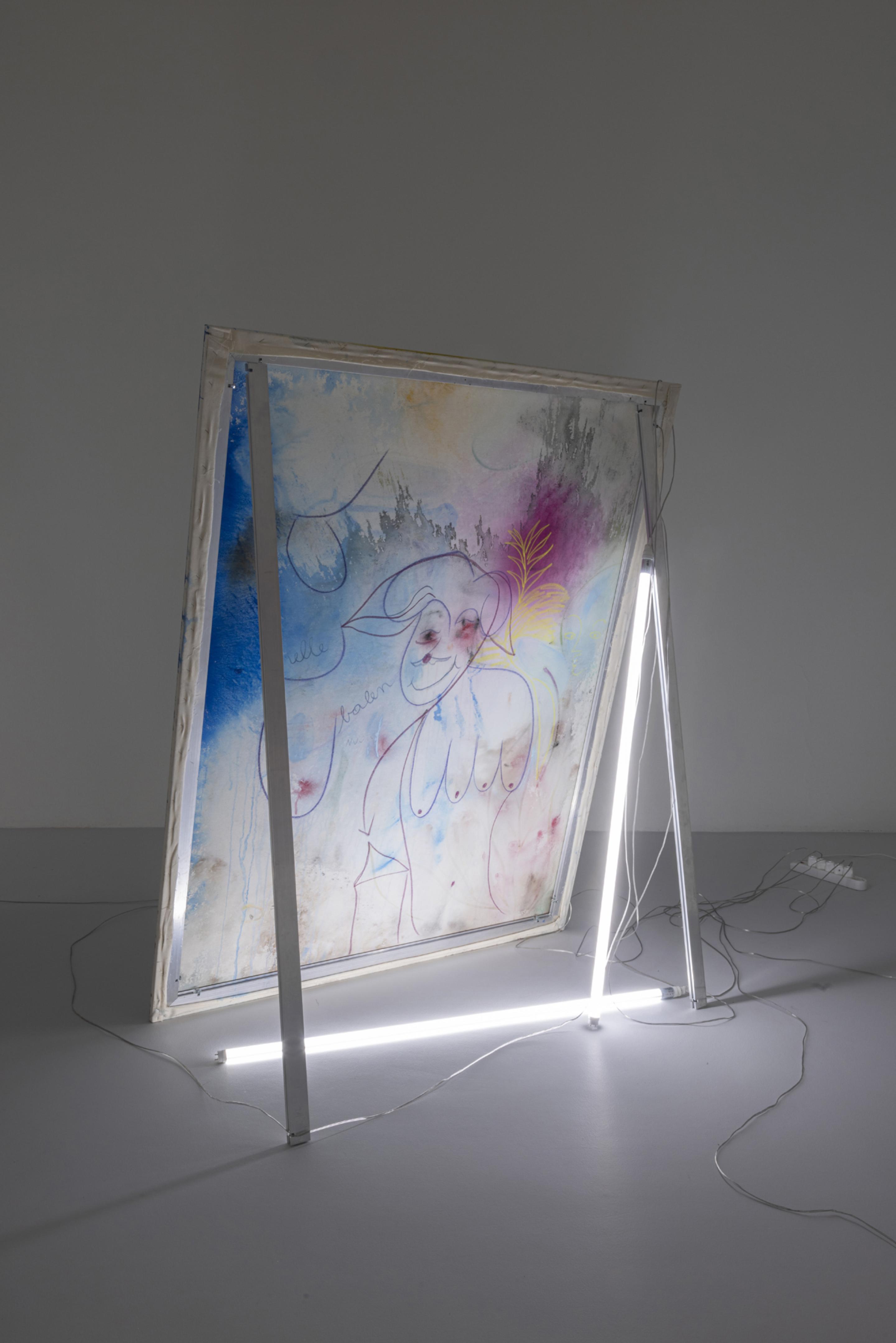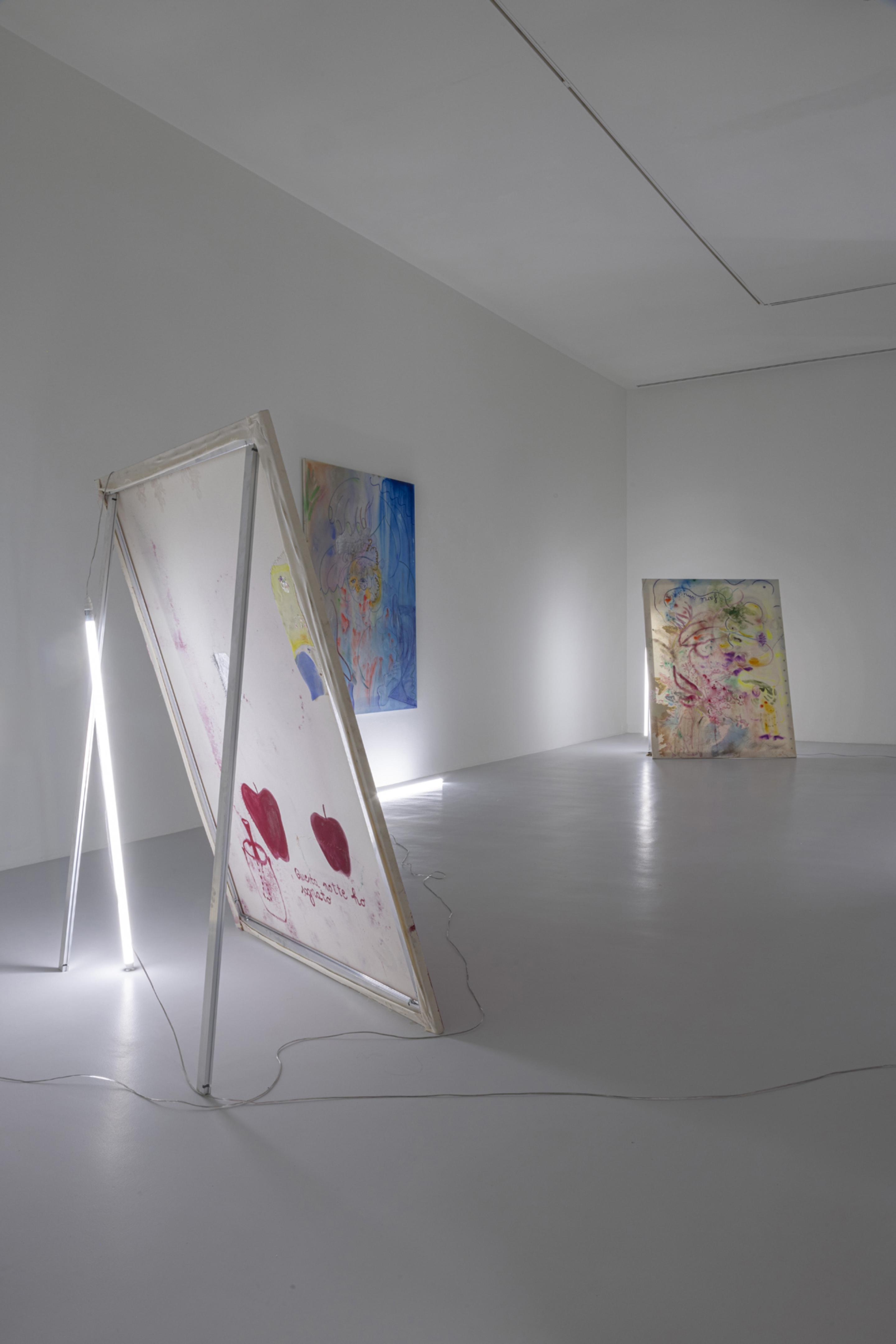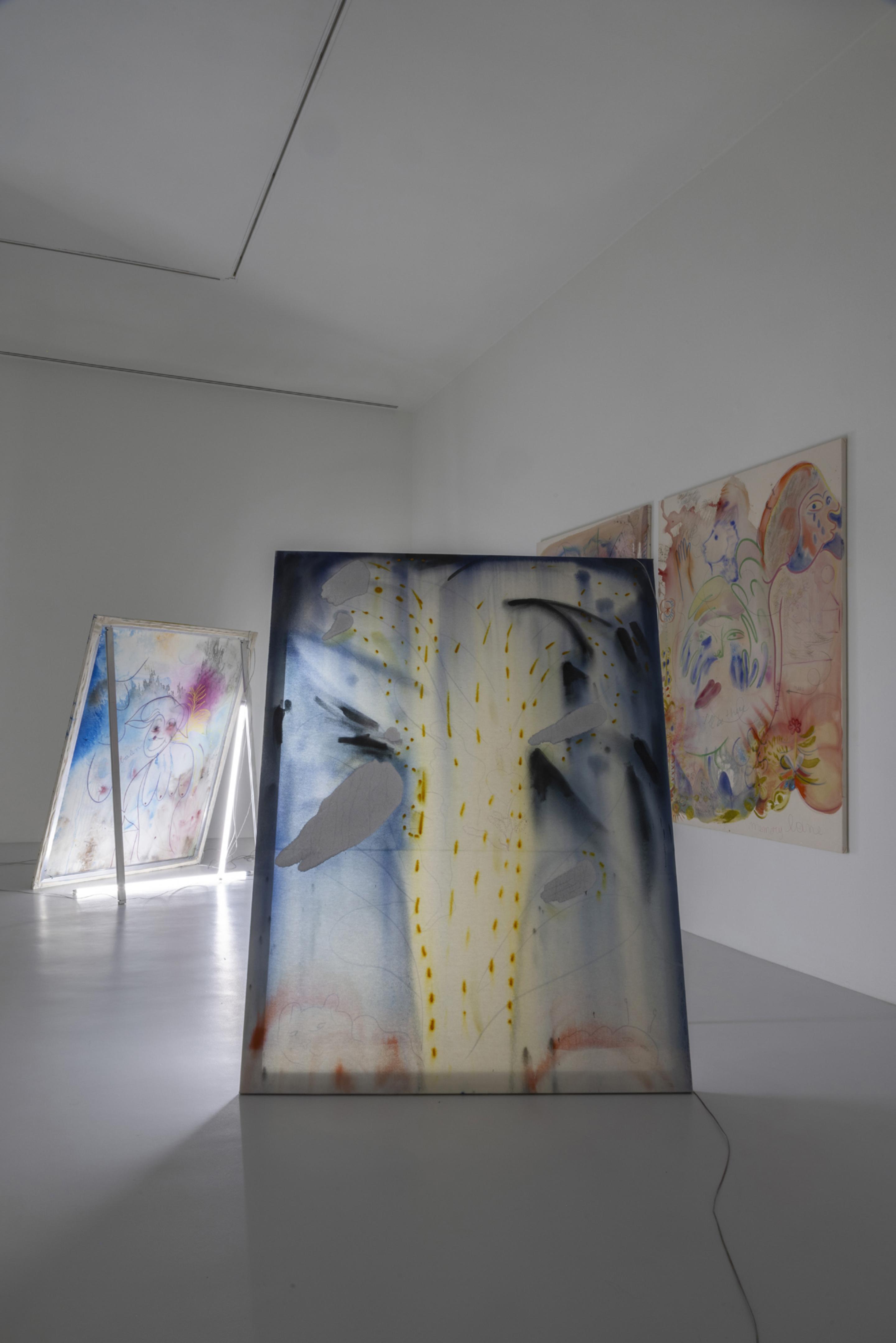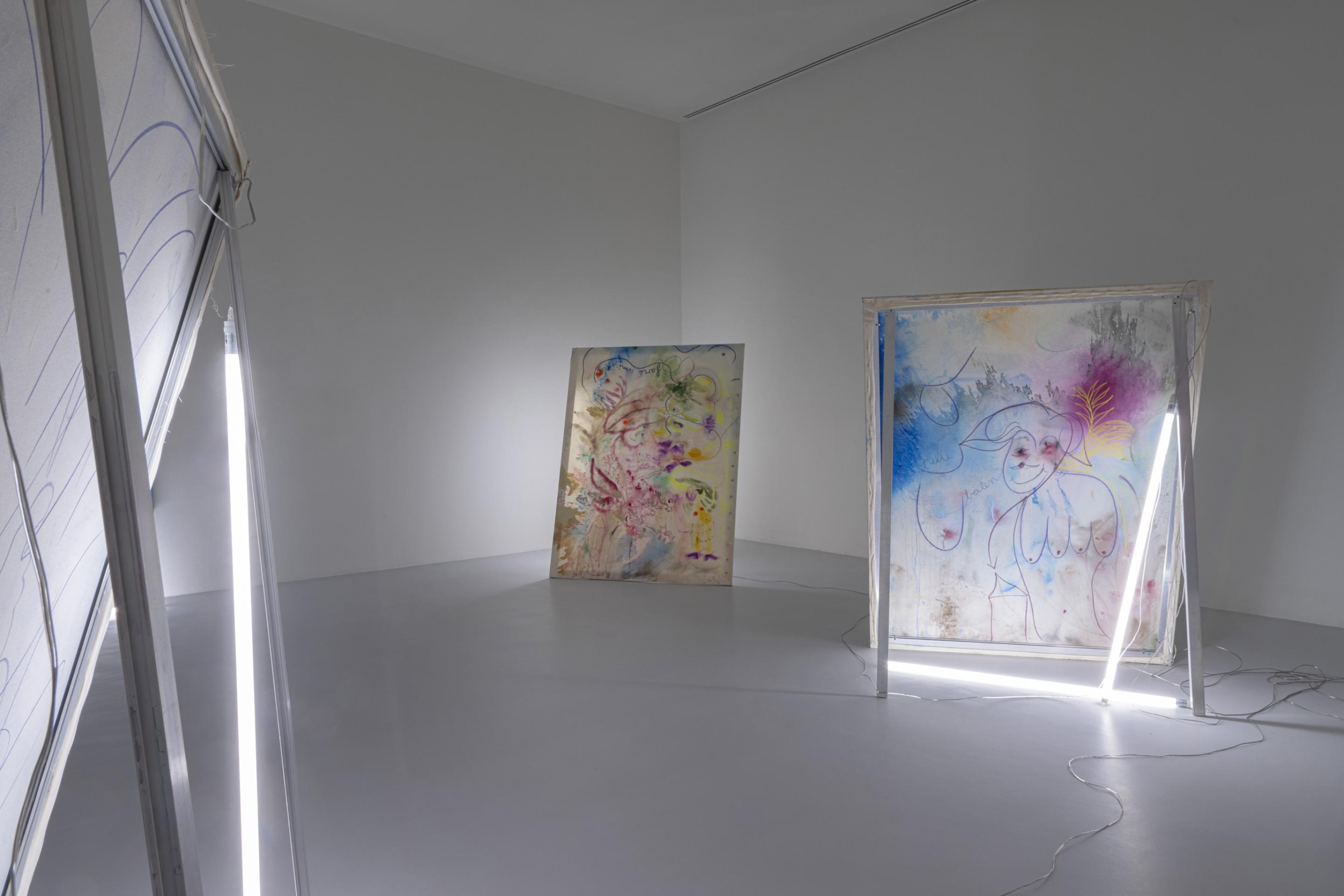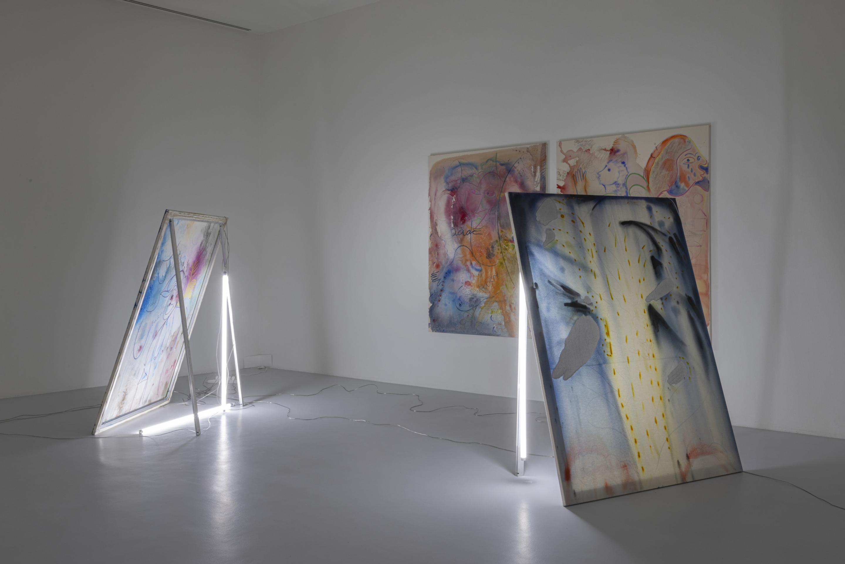 Lit from behind, fore- and background merge, the flat canvas unfolds a fictive space encompassing layers of dream-like fragments, appearing somewhere between painting, shadow play and set design. Laid out on a table, fragments of canvas are laid out like books. Moving between the works, they relate to the body, create meditative spaces of intermingling shapes that allude to landscapes, faces, expressions, mythological animals, plants and many other forms. Their installation seems almost archaic, like cave paintings holding memory and telling a story, evoking a sense of the historical that is deeply aware of its gap to reality. As much as they look back, though, they too look forward, playing freely with references in order to forge a new vocabulary that seeks to re-enchant the world.
