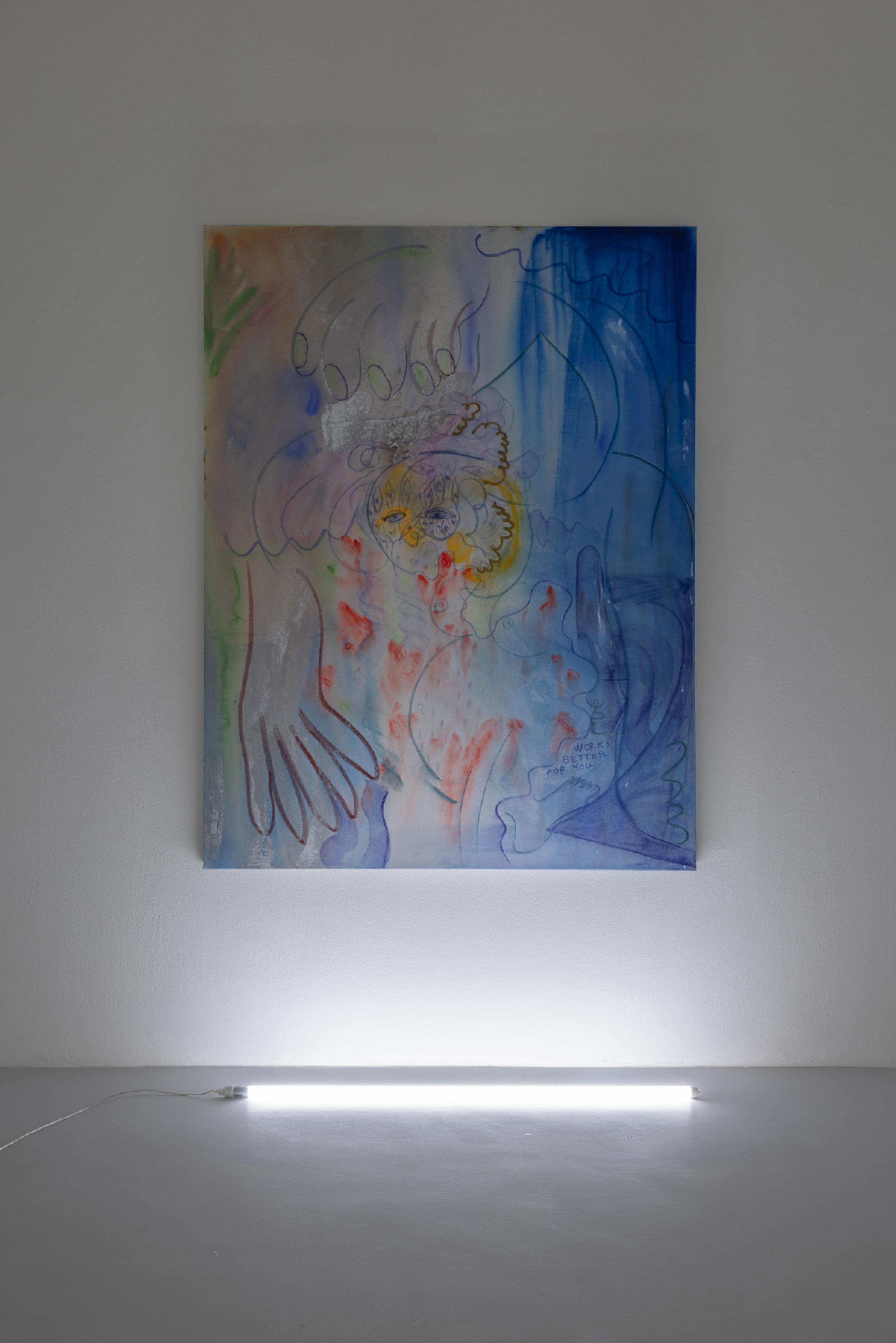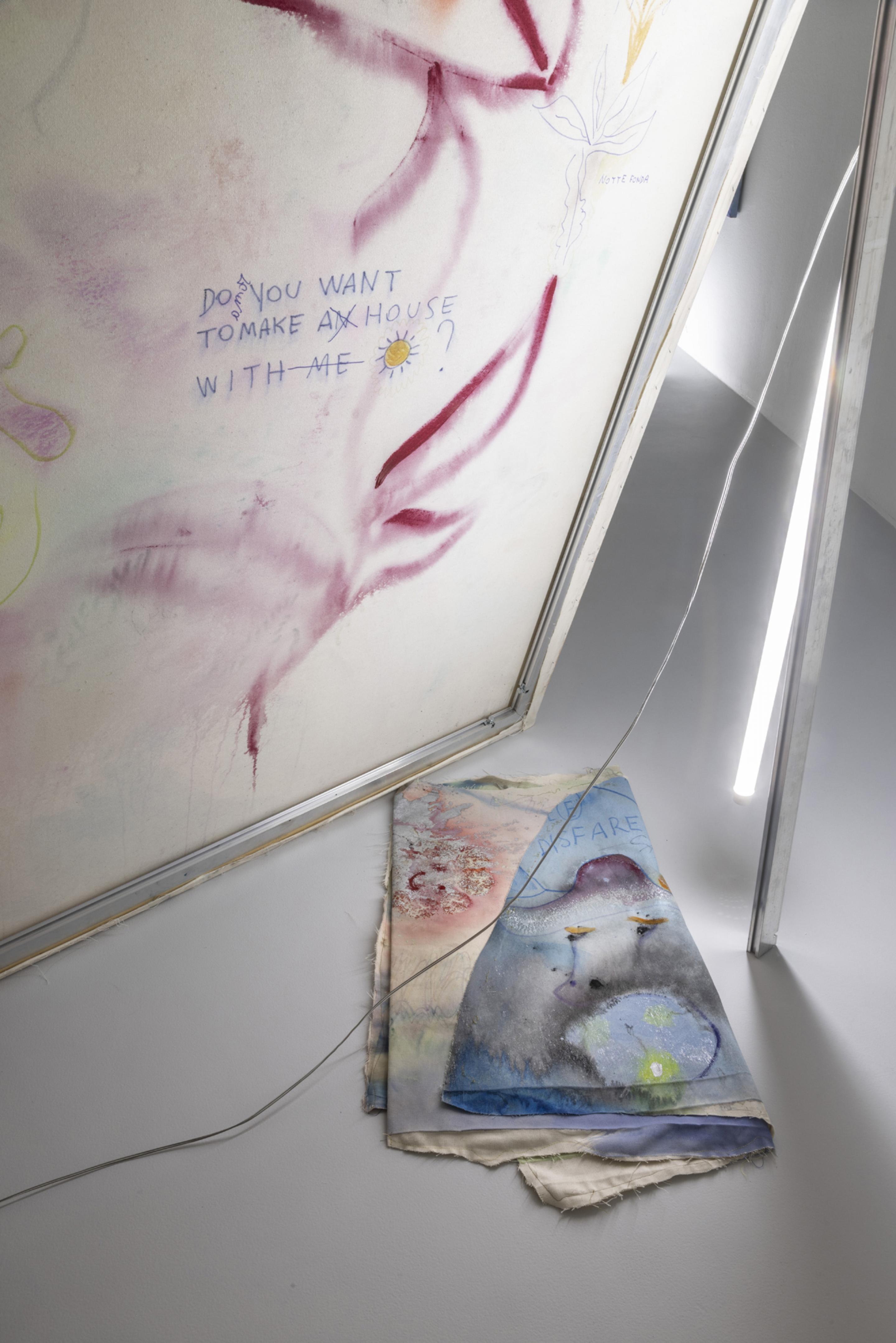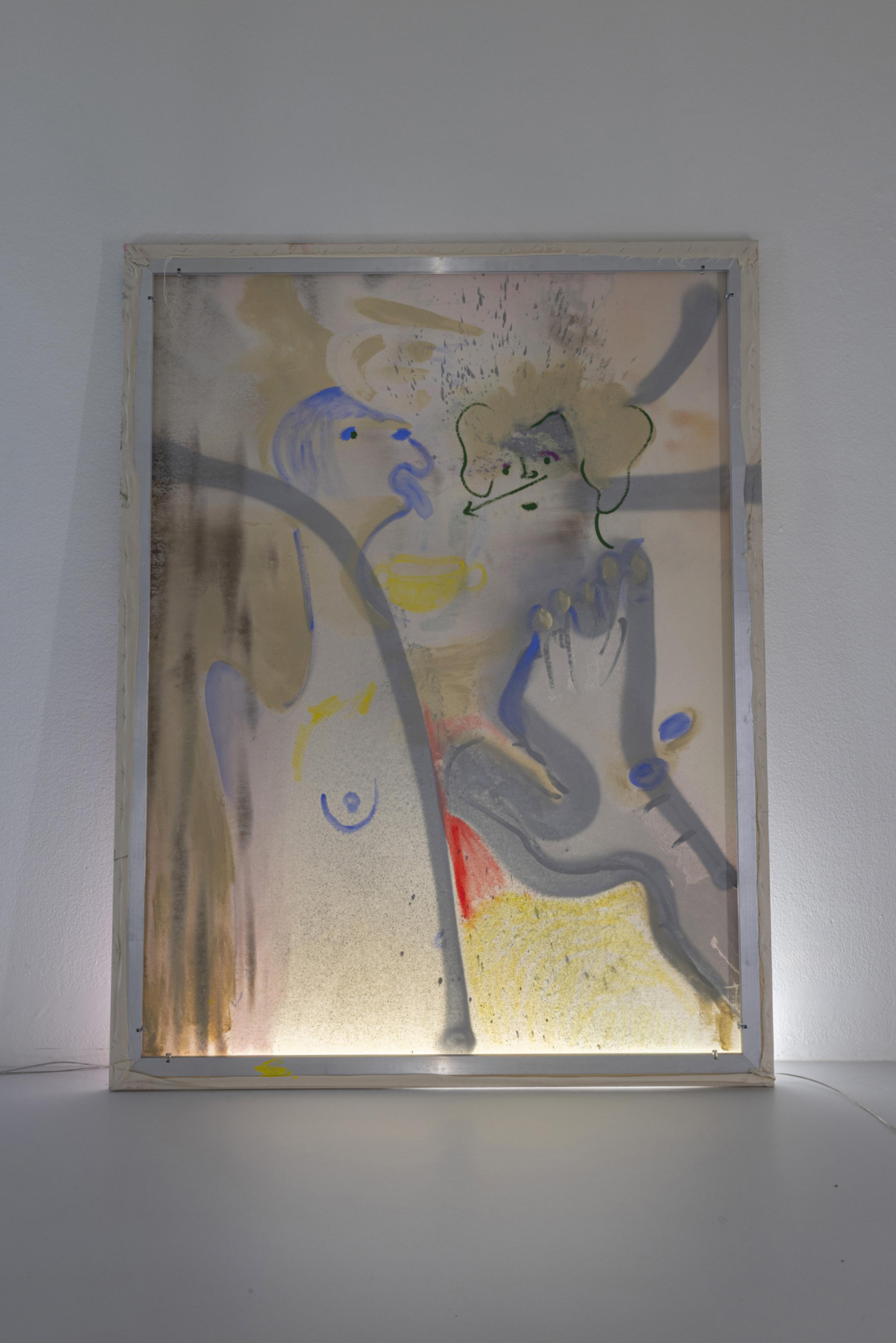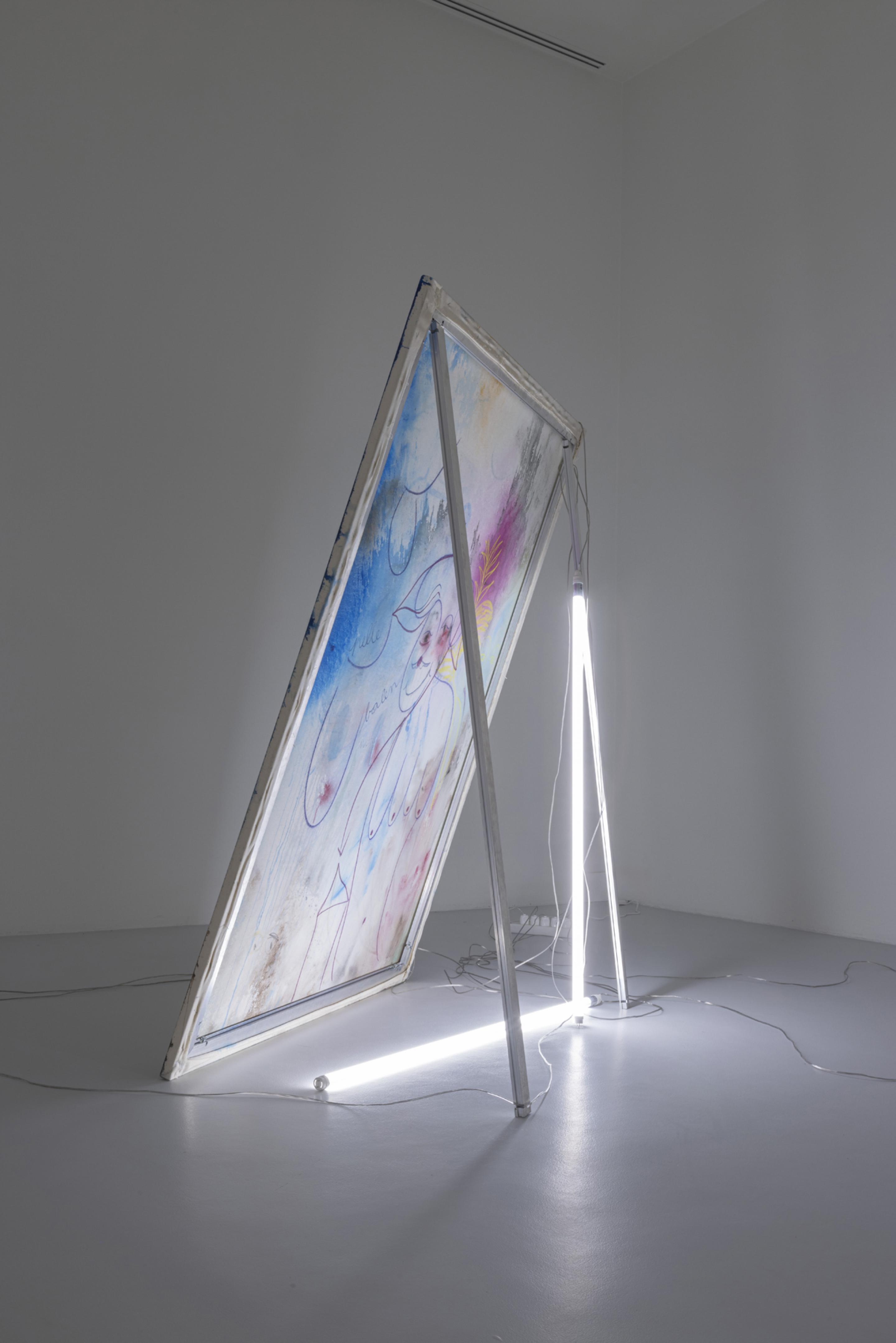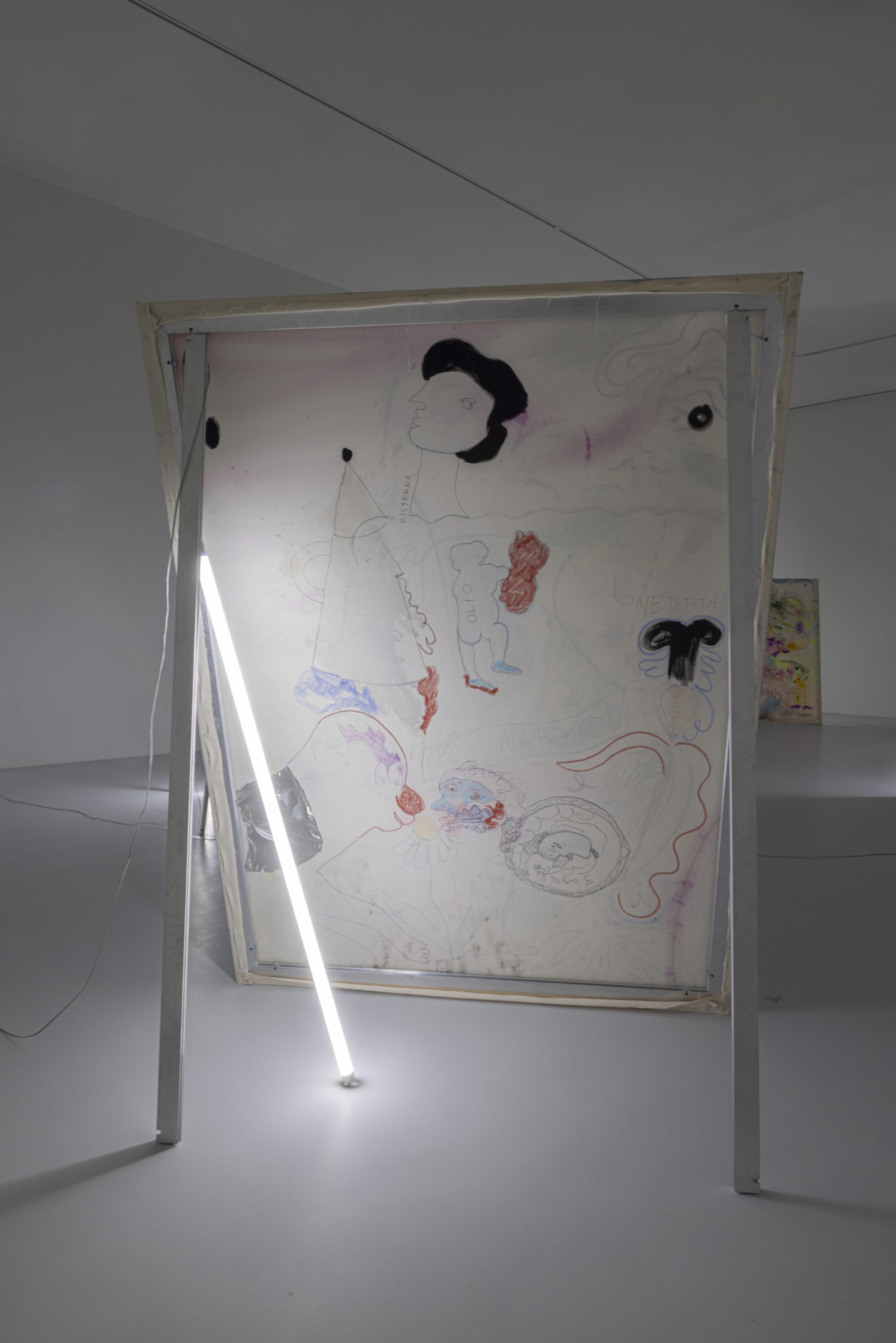 Lit from behind, fore- and background merge, the flat canvas unfolds a fictive space encompassing layers of dream-like fragments, appearing somewhere between painting, shadow play and set design. Laid out on a table, fragments of canvas are laid out like books. Moving between the works, they relate to the body, create meditative spaces of intermingling shapes that allude to landscapes, faces, expressions, mythological animals, plants and many other forms. Their installation seems almost archaic, like cave paintings holding memory and telling a story, evoking a sense of the historical that is deeply aware of its gap to reality. As much as they look back, though, they too look forward, playing freely with references in order to forge a new vocabulary that seeks to re-enchant the world.