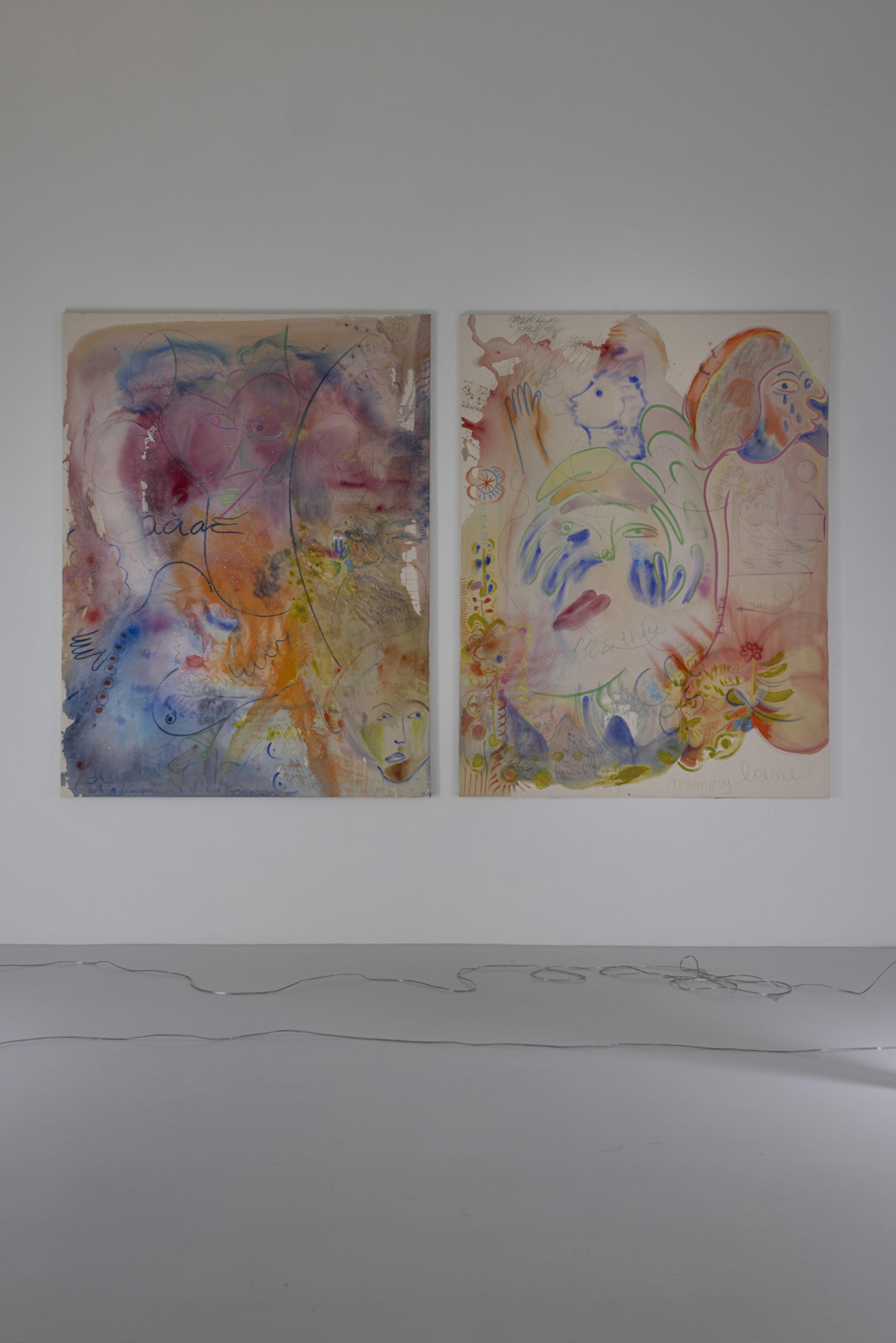 Visentin evoca questo mondo onirico da un’infinità di generi che partono dalla storia della lanterna magica ai cartoni animati per giungere fino al segno distratto degli scarabocchi. La politica visiva che sta dietro a questa estetica è ben lontana dall’idea del pittore dal tratto concettuale, chiaramente riferibile e collocabile entro un certo canone. Ricorda piuttosto l’interesse surrealista di sfidare ogni logica nella rappresentazione. Tuttavia, a differenza del surrealismo, Visentin non si chiede il “perché”, il come mappare la psiche, ma è più interessata all’esperienza del sensuale e forse, più che sbloccare l’inconscio dell’autrice, i dipinti rappresentano l’allegoria di un sé che si trasforma in un altro sé. Sono guidati da un senso di trasformazione più profondo e corporeo, in cui il sé si sposta, si evolve e si dissolve costantemente nel mondo che lo circonda: un io in divenire. Chi non conosce l’artista, potrebbe pensare che le opere siano frutto di un lavoro collettivo: realizzate non da due ma da più mani, non con un ritmo costante ma con diversi ritmi.