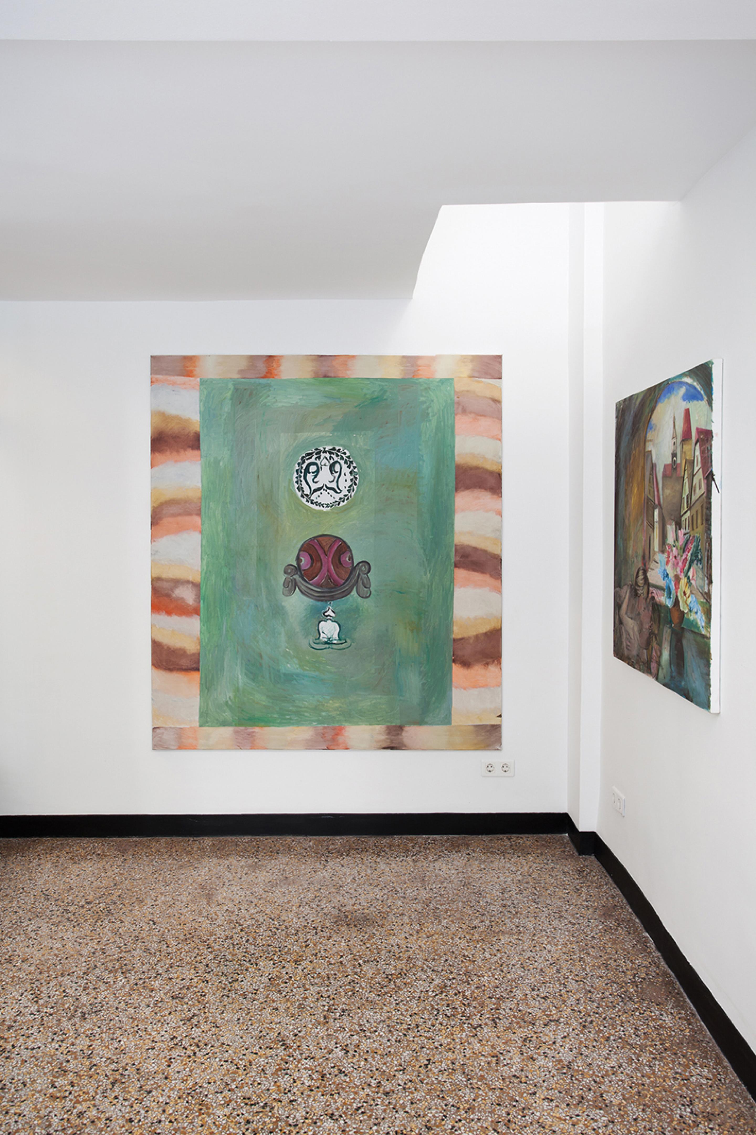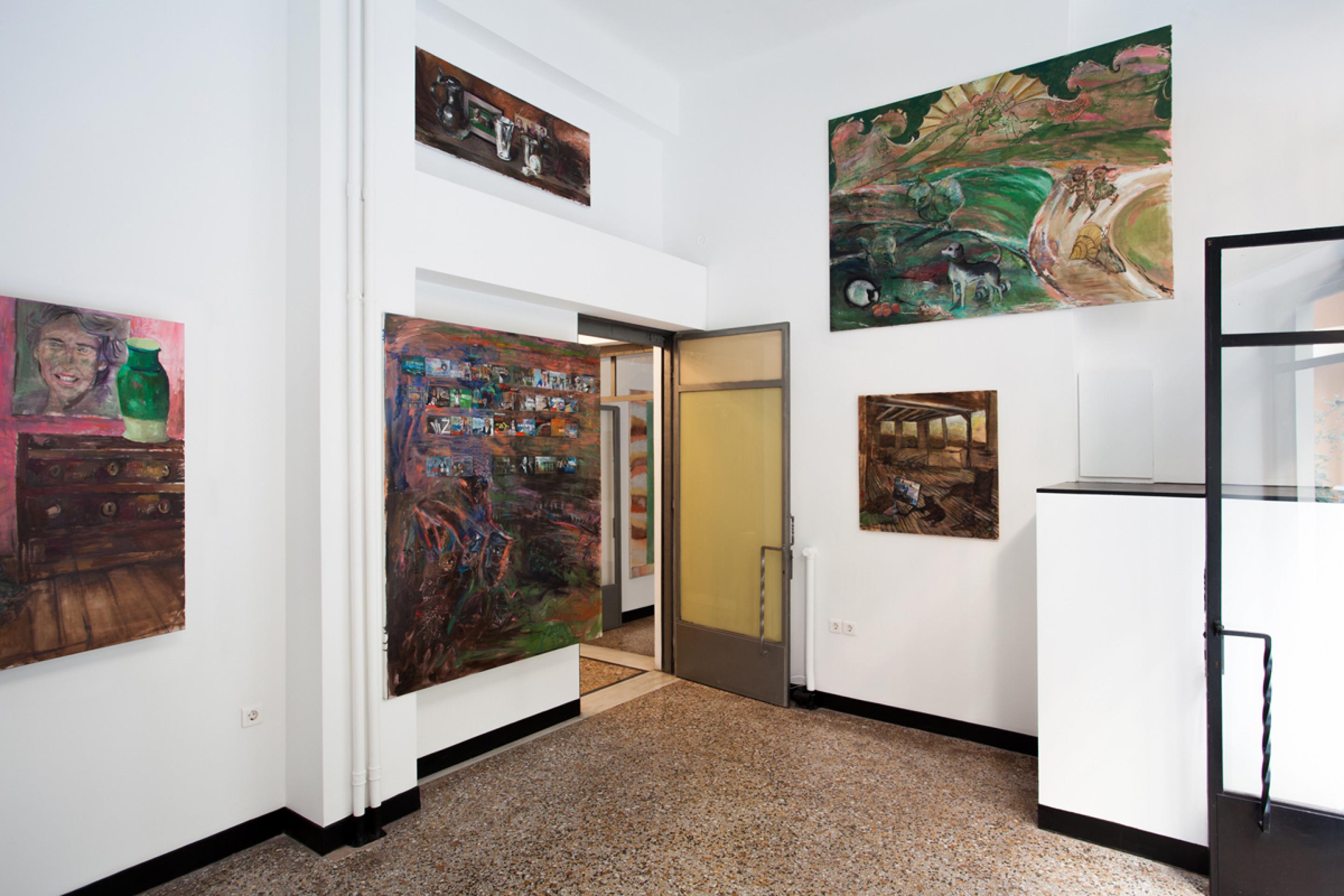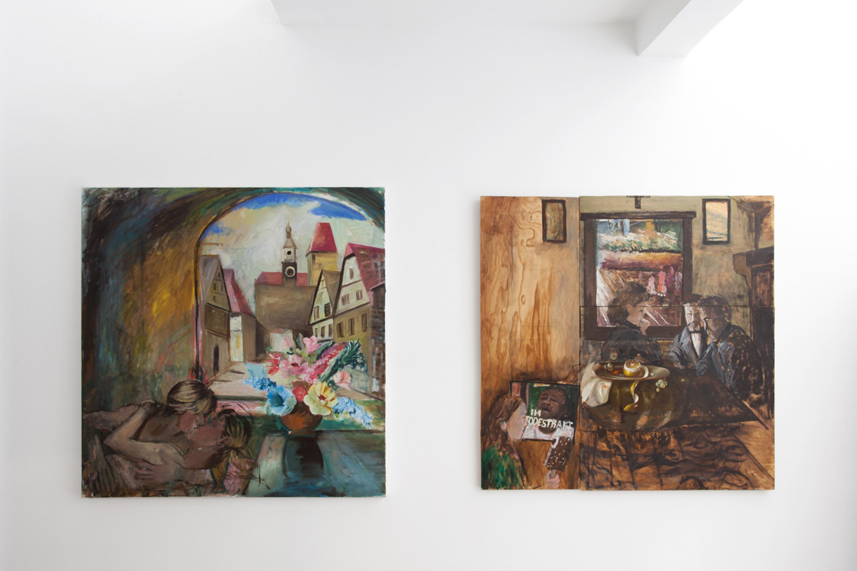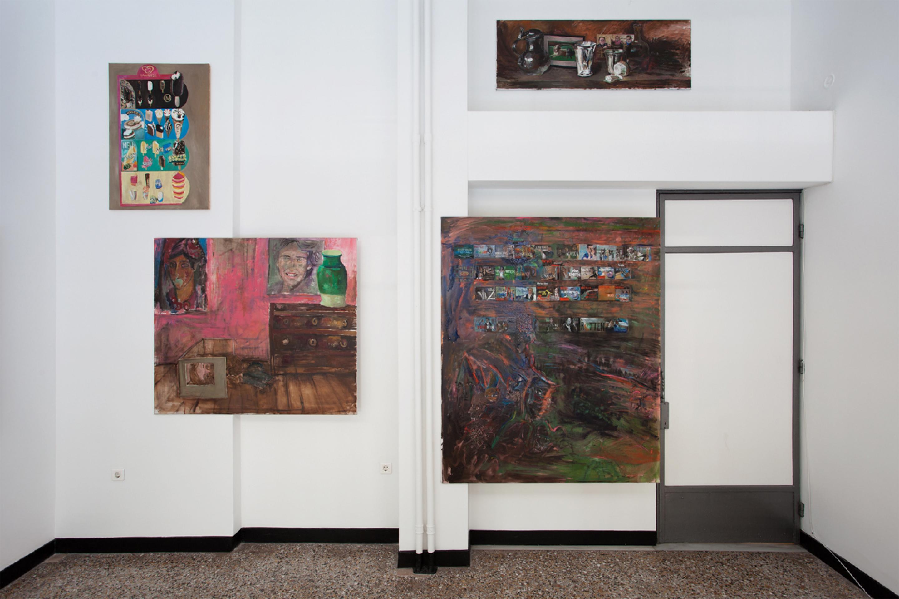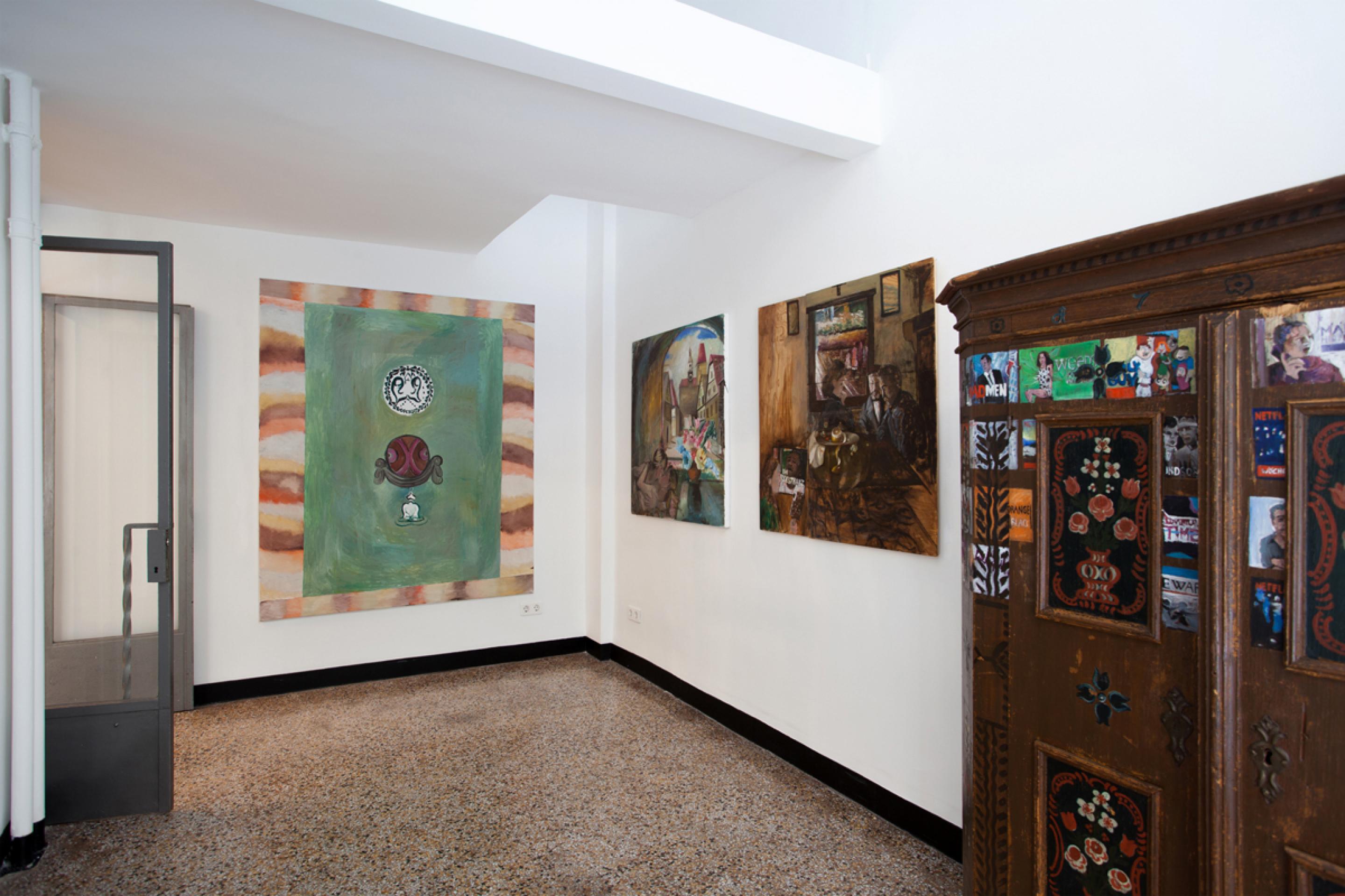 Amelie von Wulffen, Installation view, Hedwig’s Betrayal: Paintings, Comics and a Cupboard, Radio Athènes, Athens, 2019