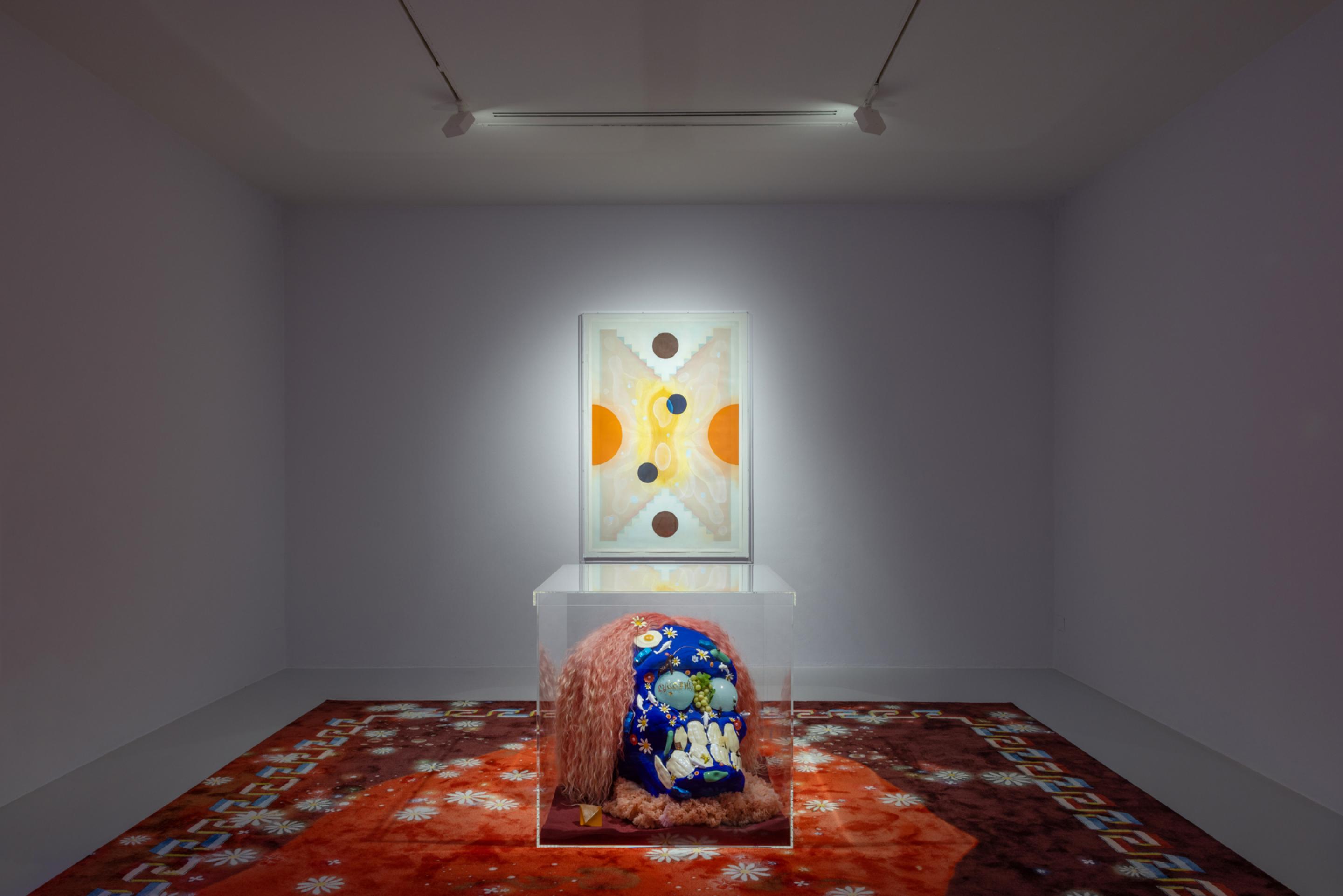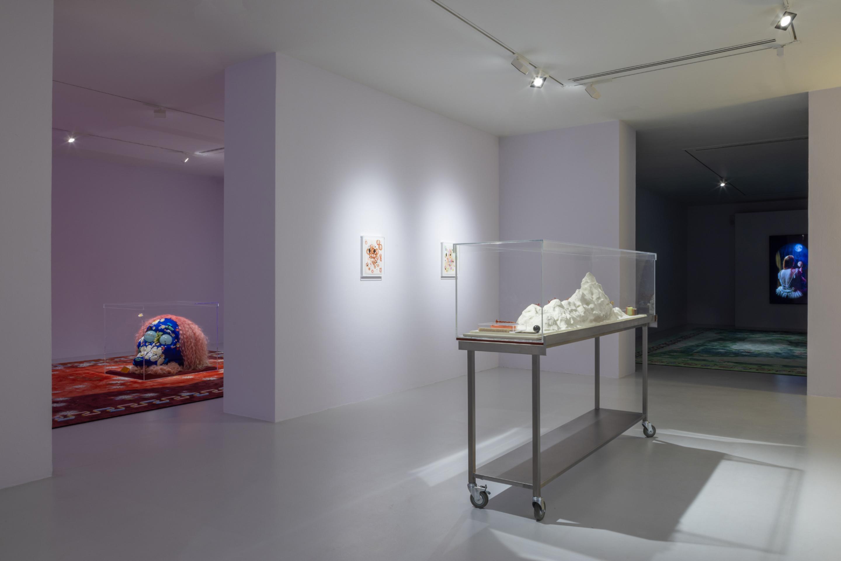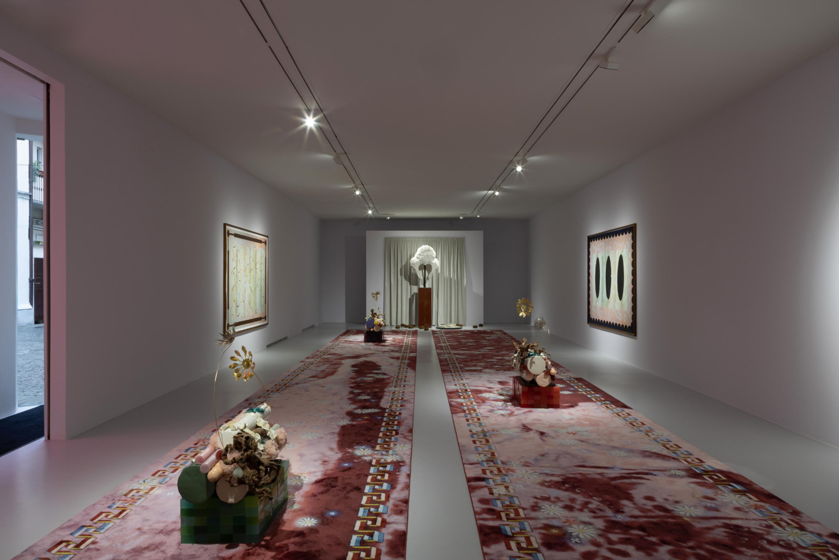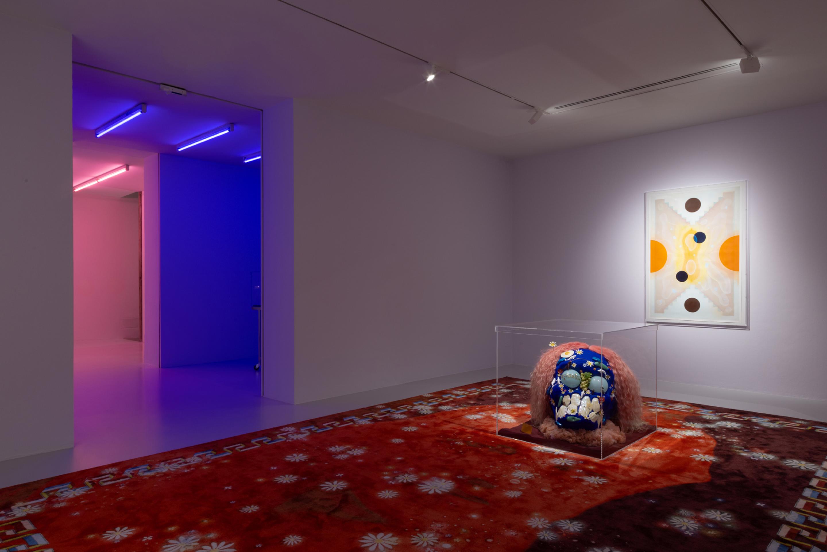 “Fastosi fantasmi”, appunto. Questa mostra si colloca giusto al confine tra eccesso e atrofia, straripamento ed evanescenza. Sono questi lo stato d’animo, il tono, la trama affettiva dei lavori esposti. Tappeti decorati di fotografie spiritiche d’epoca vittoriana, teschi in lapidaria e bizzarra ripetizione che fanno capolino, assemblandosi tra loro, a partire da brandelli di simmetrie e forme psichedeliche, parte integrante dello slang visivo della mostra: alla stregua del già citato dispositivo luminoso, lo spettacolo procede con una serie di trasmogrificazioni e suggestivi effetti che sono al tempo stesso sconcertanti enigmi visivi. Prendiamo il gigantesco paio di guanti in pelle scamosciata: quali mani sono così grandi da poter indossare questo lussuoso accessorio?