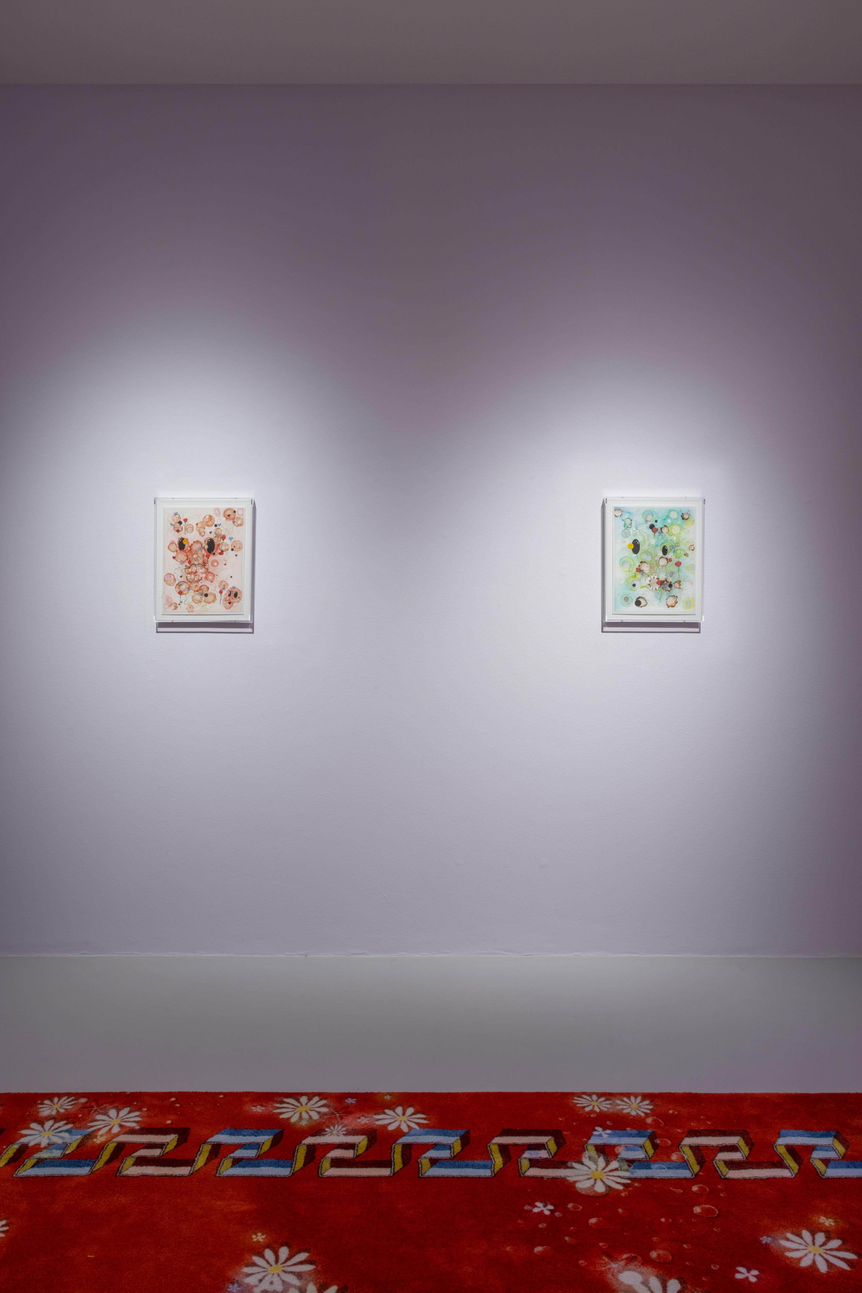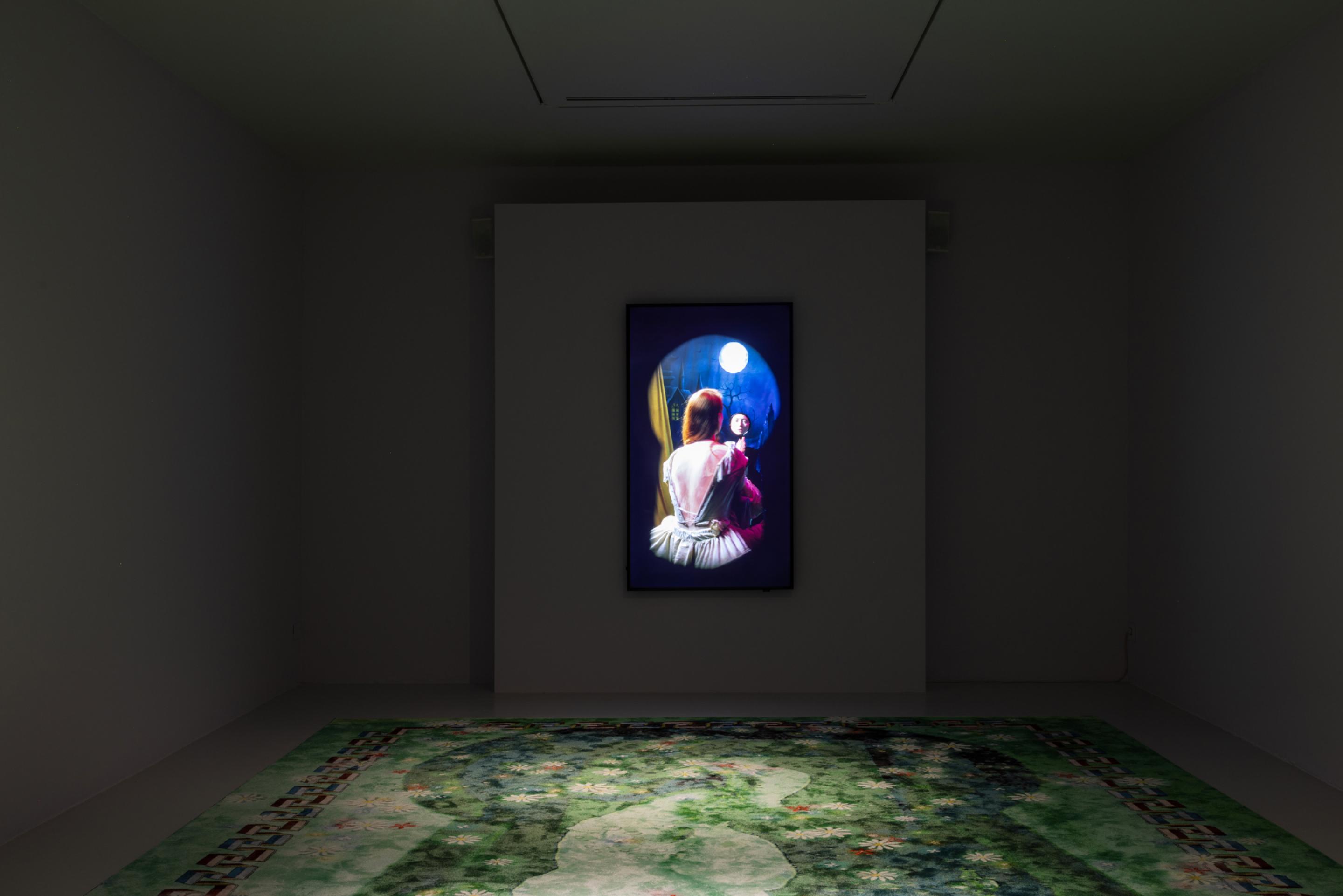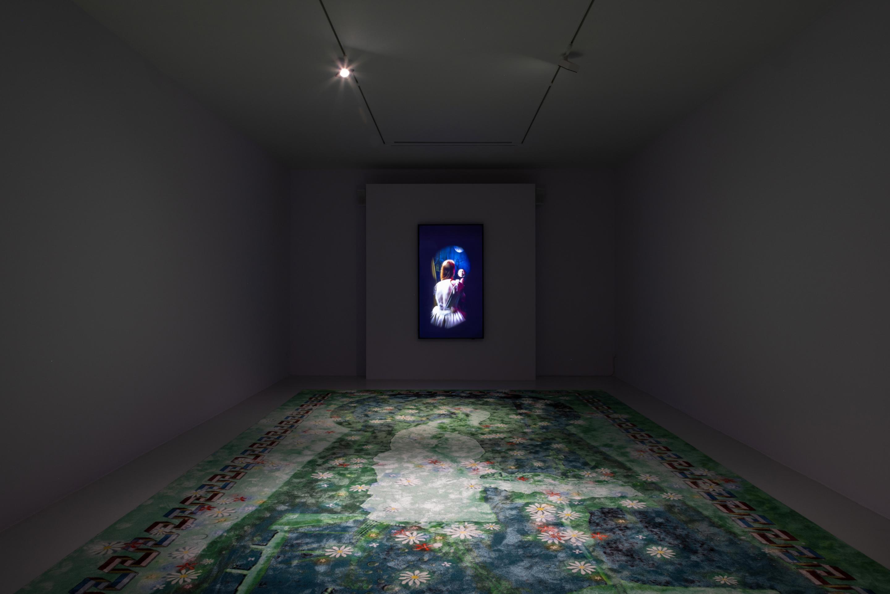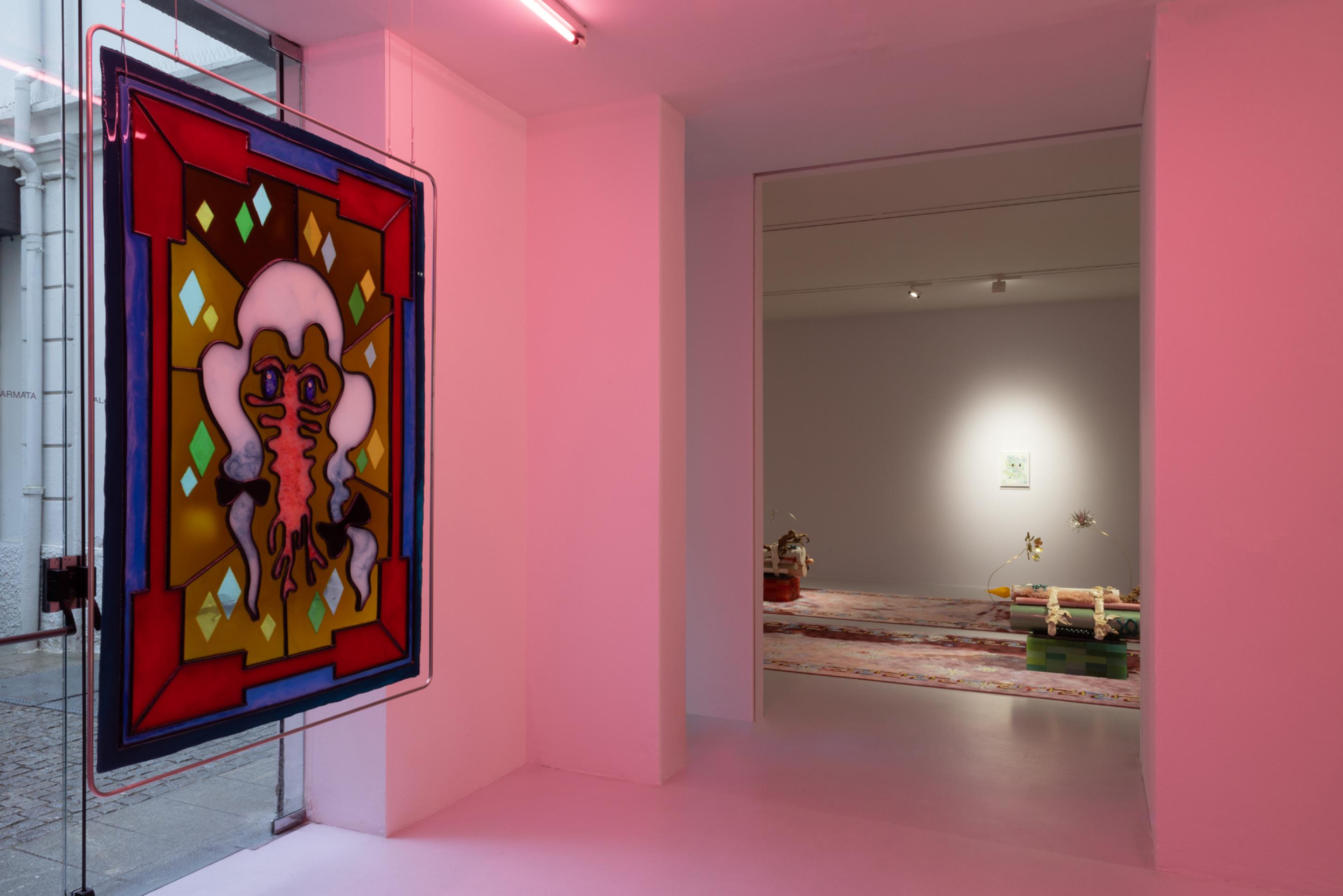“Fastosi fantasmi”, appunto. Questa mostra si colloca giusto al confine tra eccesso e atrofia, straripamento ed evanescenza. Sono questi lo stato d’animo, il tono, la trama affettiva dei lavori esposti. Tappeti decorati di fotografie spiritiche d’epoca vittoriana, teschi in lapidaria e bizzarra ripetizione che fanno capolino, assemblandosi tra loro, a partire da brandelli di simmetrie e forme psichedeliche, parte integrante dello slang visivo della mostra: alla stregua del già citato dispositivo luminoso, lo spettacolo procede con una serie di trasmogrificazioni e suggestivi effetti che sono al tempo stesso sconcertanti enigmi visivi. Prendiamo il gigantesco paio di guanti in pelle scamosciata: quali mani sono così grandi da poter indossare questo lussuoso accessorio?