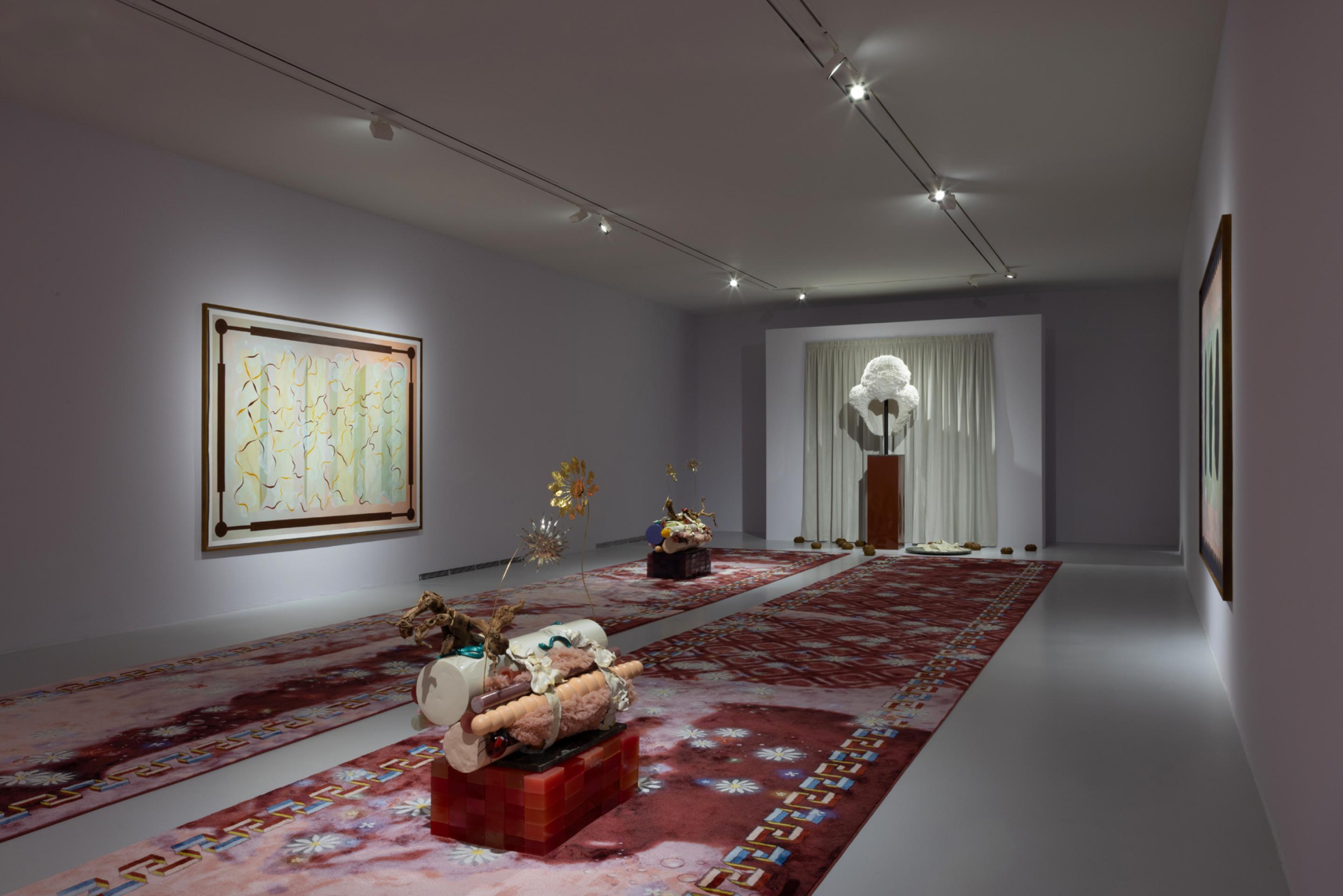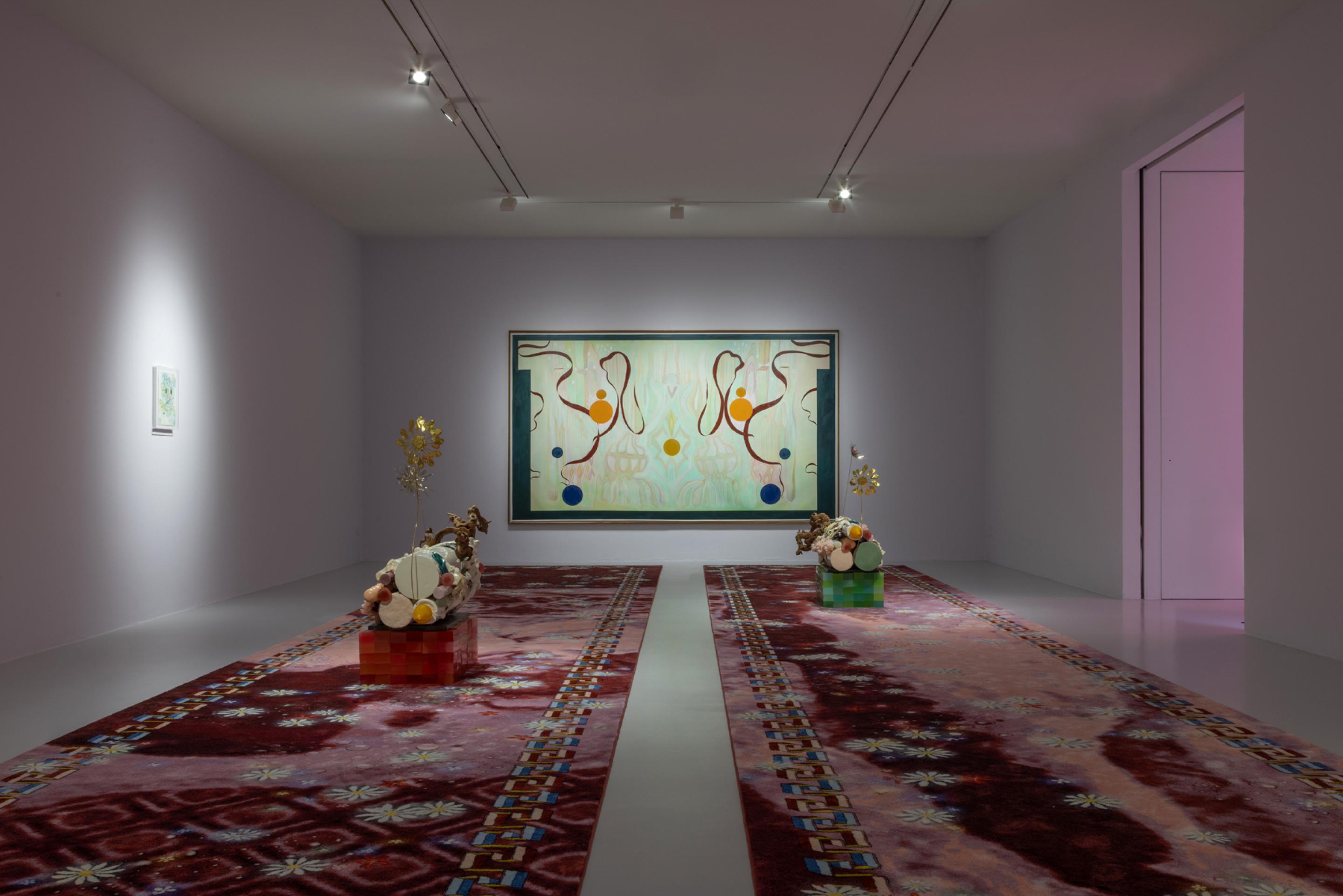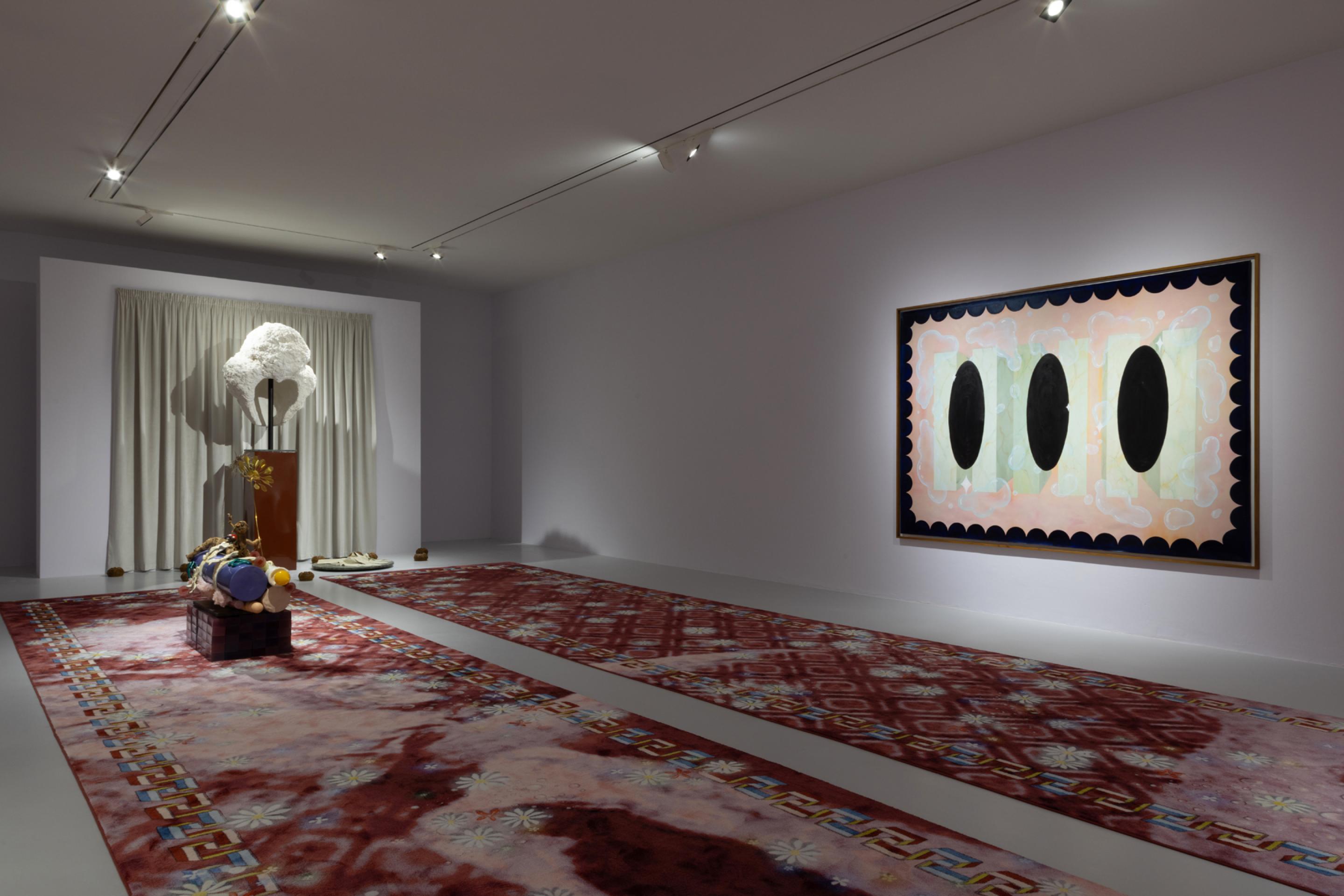 “Lavish phantoms” indeed. This exhibition lies flush with the boundary between overflow and atrophy, brimming and evanescence. That’s the mood, the tone, the affective texture of the gathered pieces. The carpets festooned with Victorian spirit photography imagery, the oddly lapidary repetition of skulls, peeking out and assembling themselves from the shredded psychedelic symmetries and shapes that constitute this exhibition’s visual dialect: like the aforementioned light fixture, the show proceeds by a series of transmogrifications and atmospheric effects that are at the same time taut visual riddles. Take the giant pair of suede gloves: what massive hands could make use of this luxe accessory?