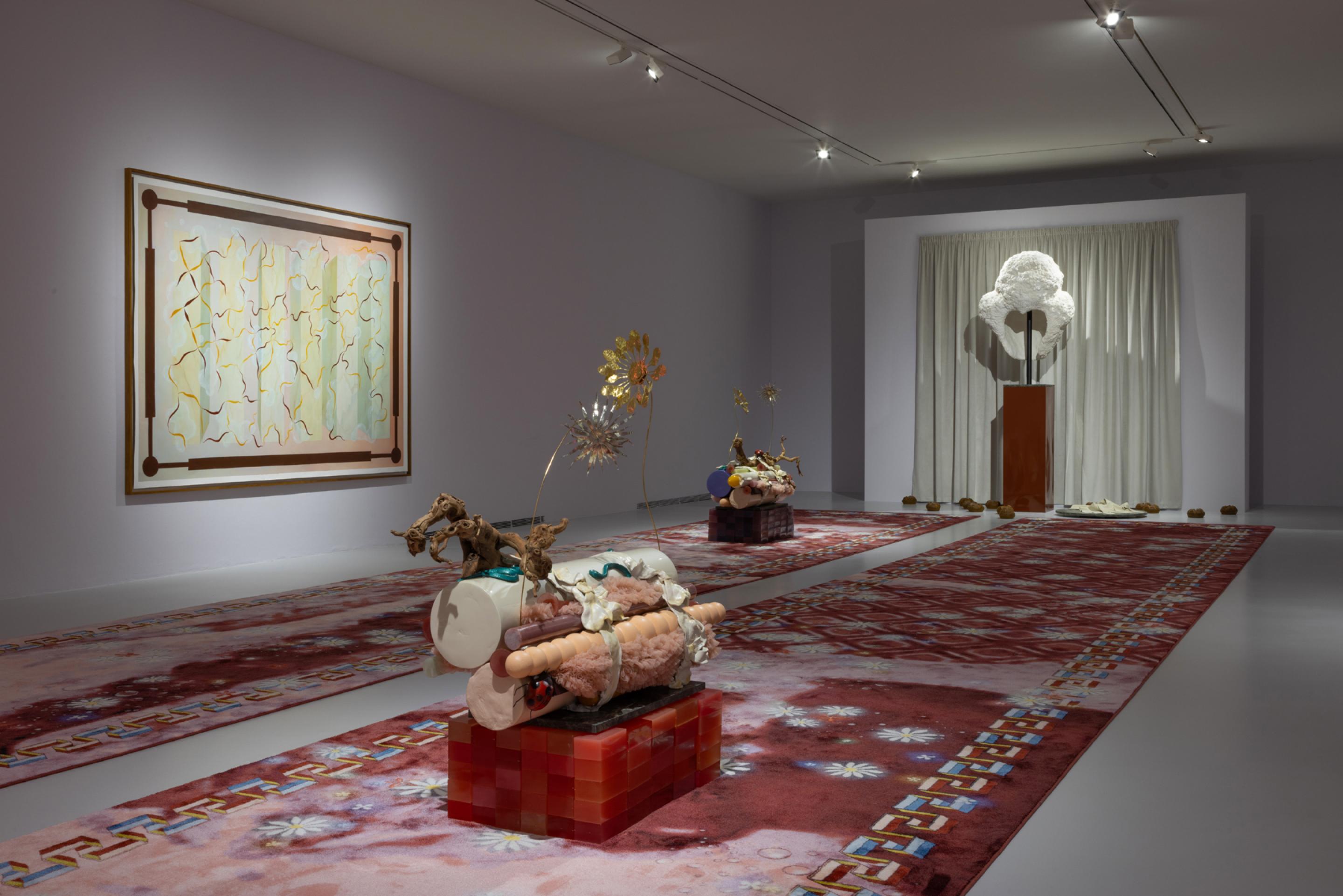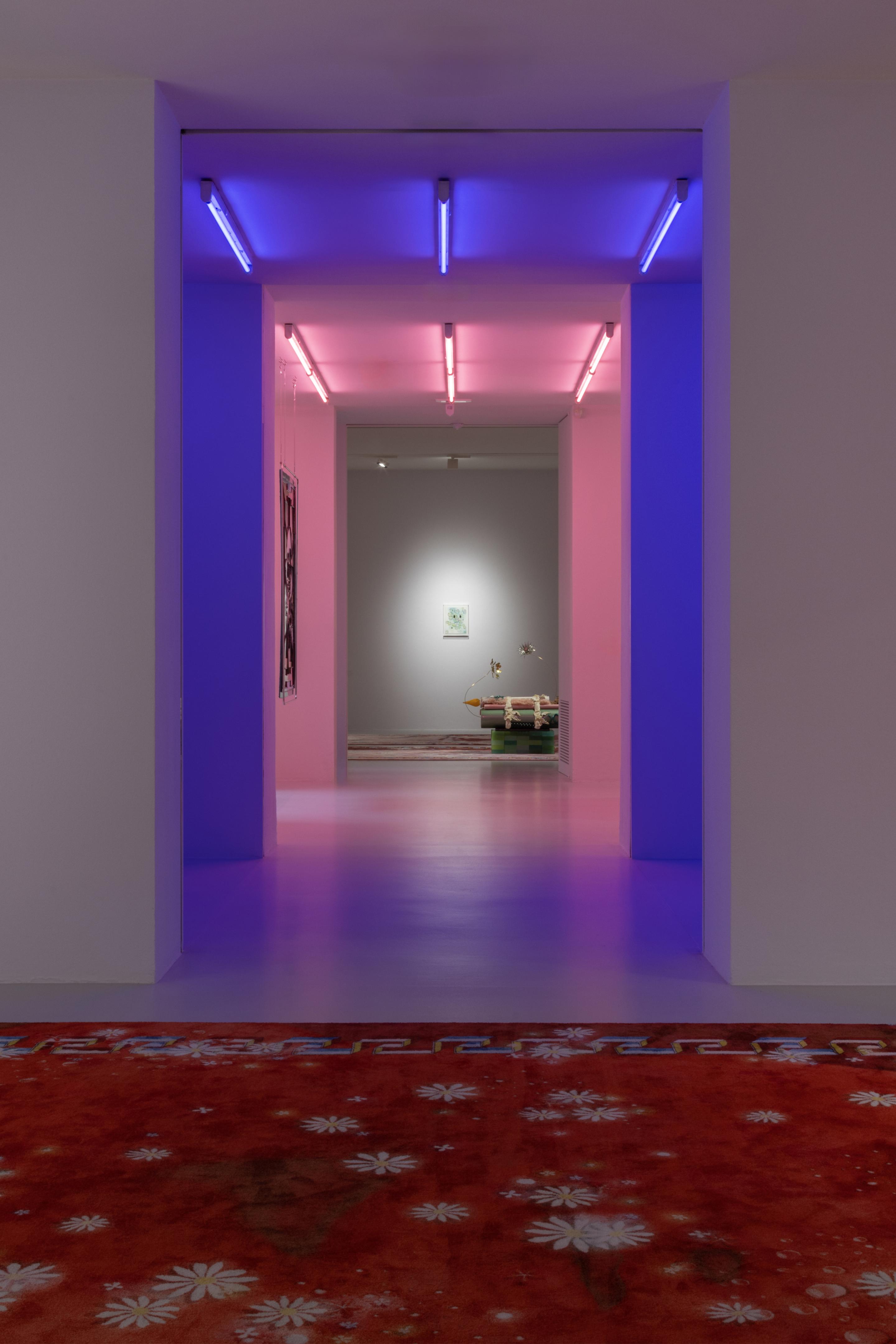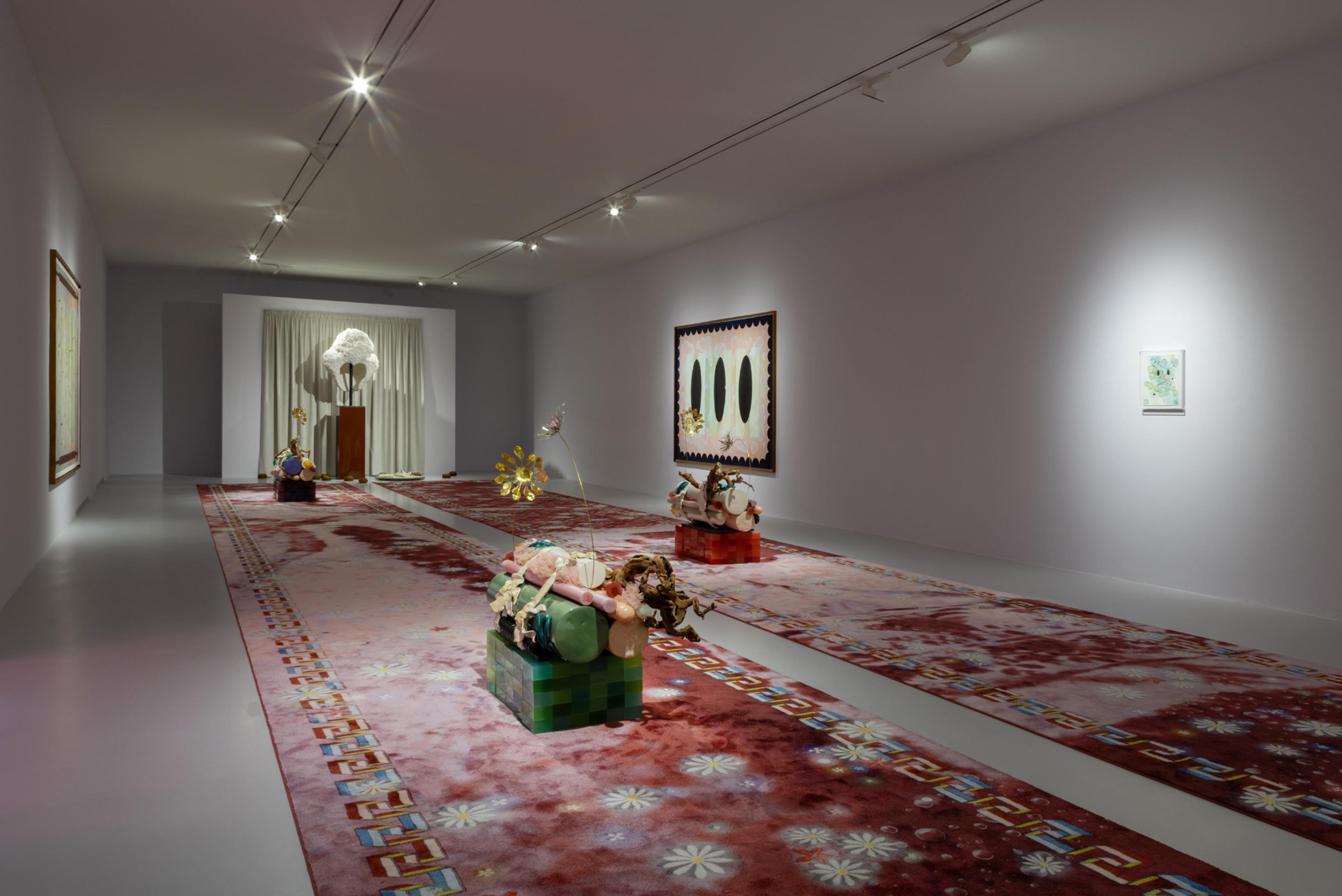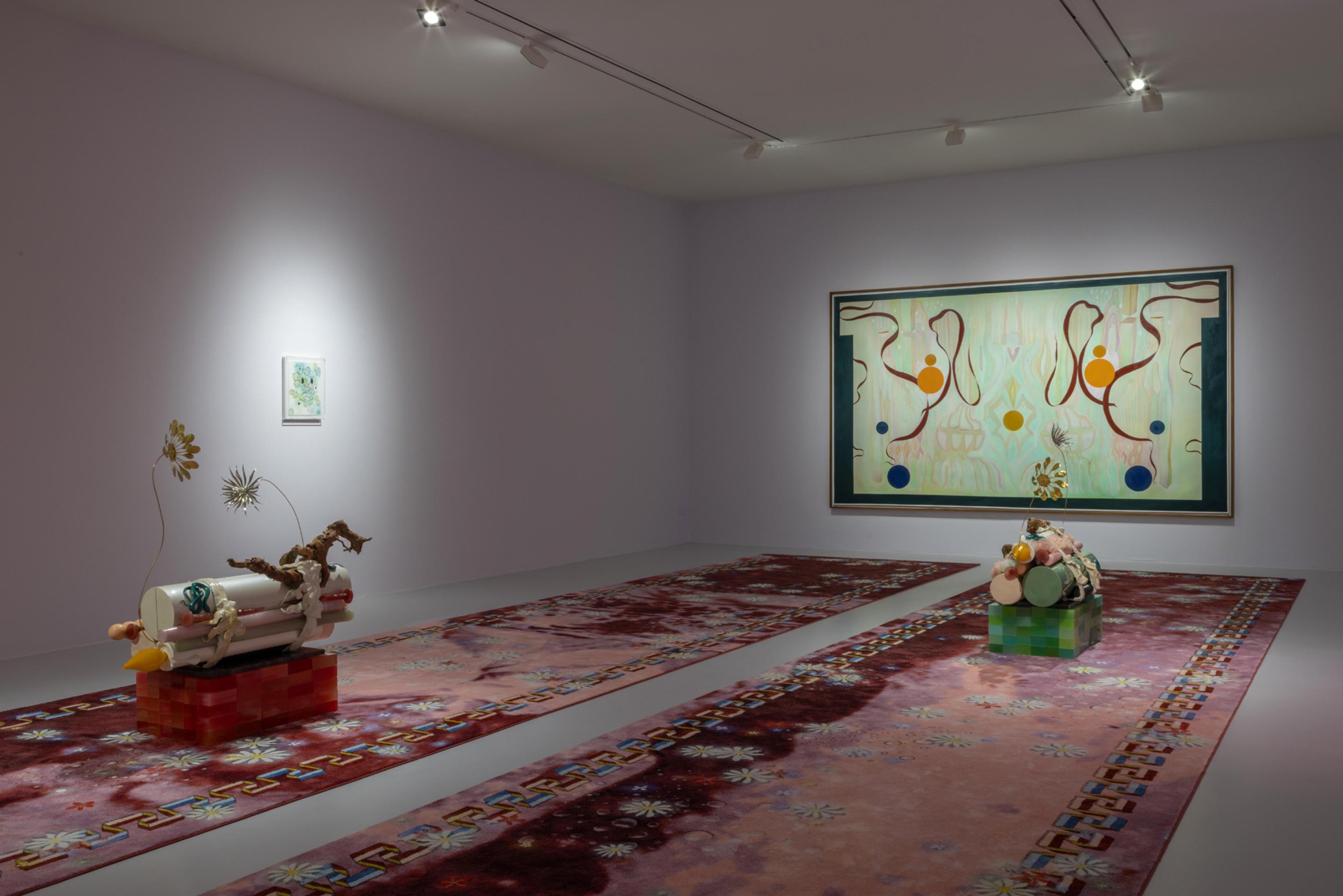 “Lavish phantoms” indeed. This exhibition lies flush with the boundary between overflow and atrophy, brimming and evanescence. That’s the mood, the tone, the affective texture of the gathered pieces. The carpets festooned with Victorian spirit photography imagery, the oddly lapidary repetition of skulls, peeking out and assembling themselves from the shredded psychedelic symmetries and shapes that constitute this exhibition’s visual dialect: like the aforementioned light fixture, the show proceeds by a series of transmogrifications and atmospheric effects that are at the same time taut visual riddles. Take the giant pair of suede gloves: what massive hands could make use of this luxe accessory?