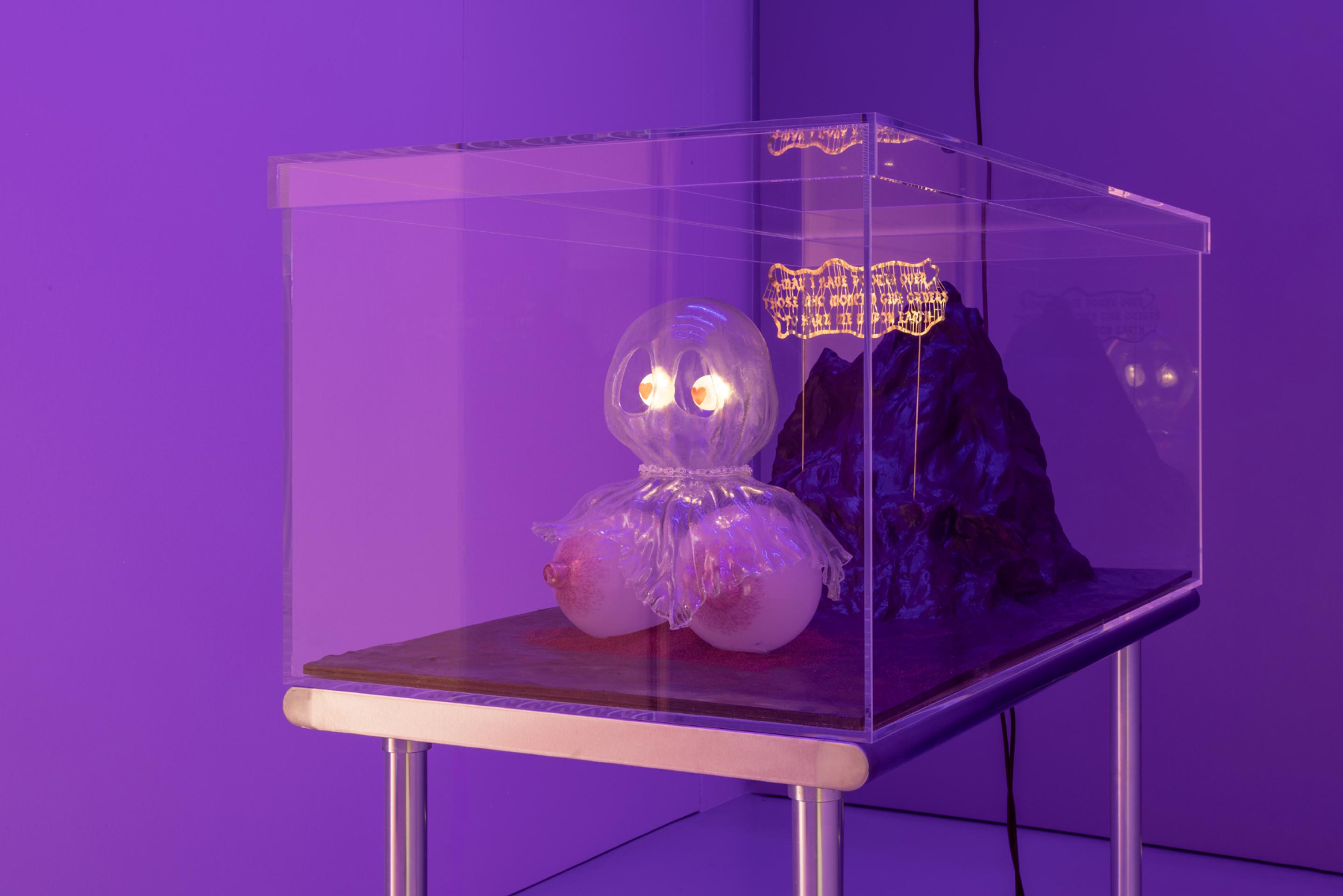 A brilliant string of blown-glass breasts, each milky green and lit from within by a glowing bulb, is more than a mere chandelier. It also serves as a sample of the surfaces, symbols, and psychosocial resonances that make up “Lavish Phantoms from the House of Dust.” The breast—by nature soft, sensuous, and (in both senses) giving—floats free from any body. It’s also been multiplied (a bit startlingly) and had its flesh replaced and mimicked by the most brittle, fragile material, propelling the assembled contraption to a point of fantastical delicacy.