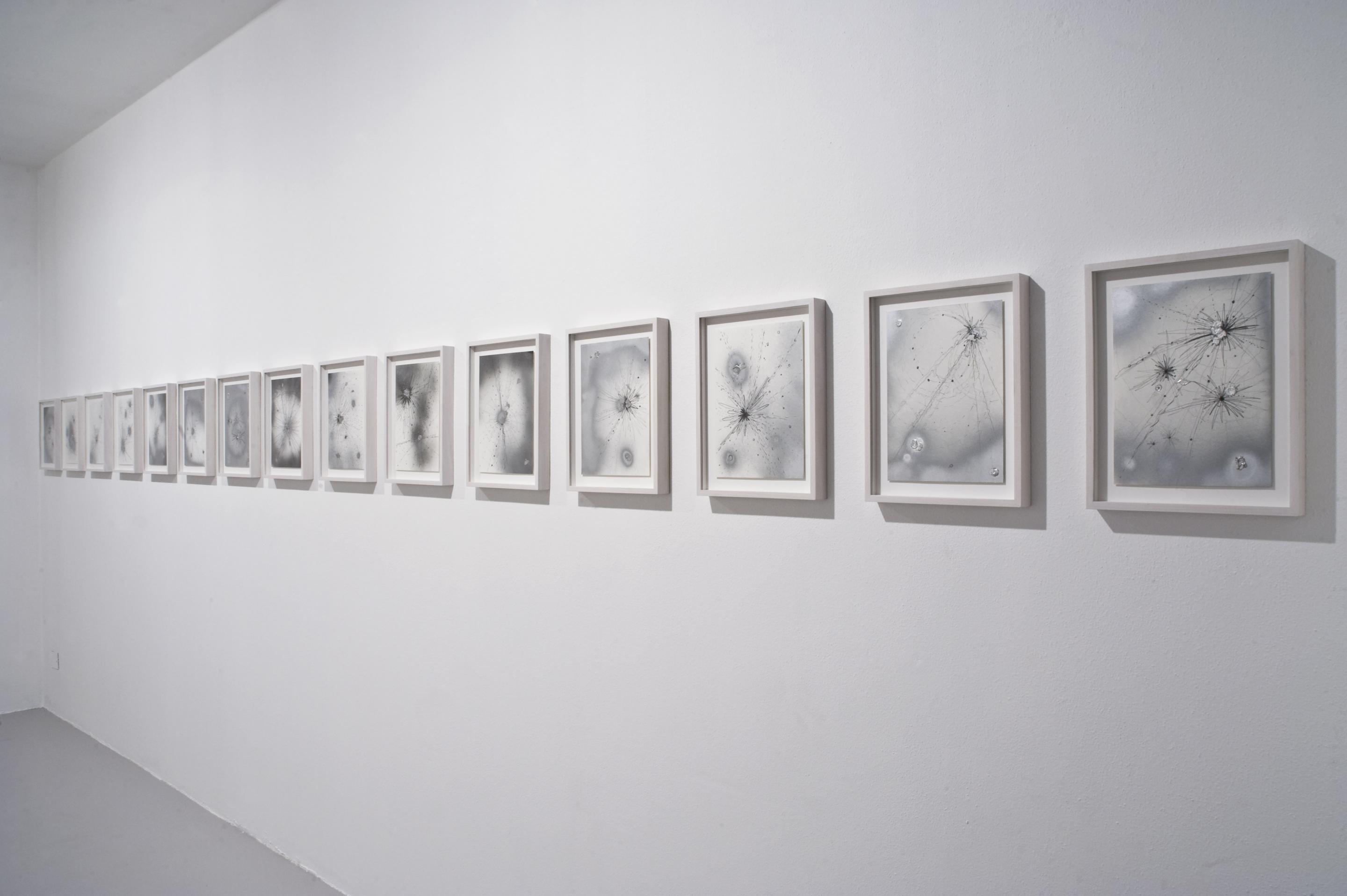 Per la sua quarta personale da Giò Marconi, che occupa tutto il piano terra della galleria, Grazia Toderi espone tre nuove serie di disegni, realizzati con grafite, argento e stagno fuso, nuove opere fotografiche e due proiezioni video prodotte per la mostra. Il disegno è per l’artista il primo livello, fondamentale e necessario, in cui immergersi, un esercizio di concentrazione, leggerezza e libertà, solo in seguito al quale poter arrivare, dopo una ulteriore lavorazione che passa attraverso le immagini fotografiche, alla realizzazione di una nuova opera video. Tutte le opere della mostra sono intitolate "Orbite Rosse", e già nel 1998 l’artista aveva esposto alla Galleria Giò Marconi una doppia proiezione video dal titolo "Orbite". Nell’opera dell’artista i riferimenti alle orbite sono fin dall’inizio del suo lavoro un elemento costante, siano quelle della Luna intorno alla Terra, dei pianeti intorno al Sole, dei satelliti o delle astronavi intorno ai pianeti, o anche quelle disegnate da una palla all’interno di uno stadio, o tracciate da una trottola su un pavimento.