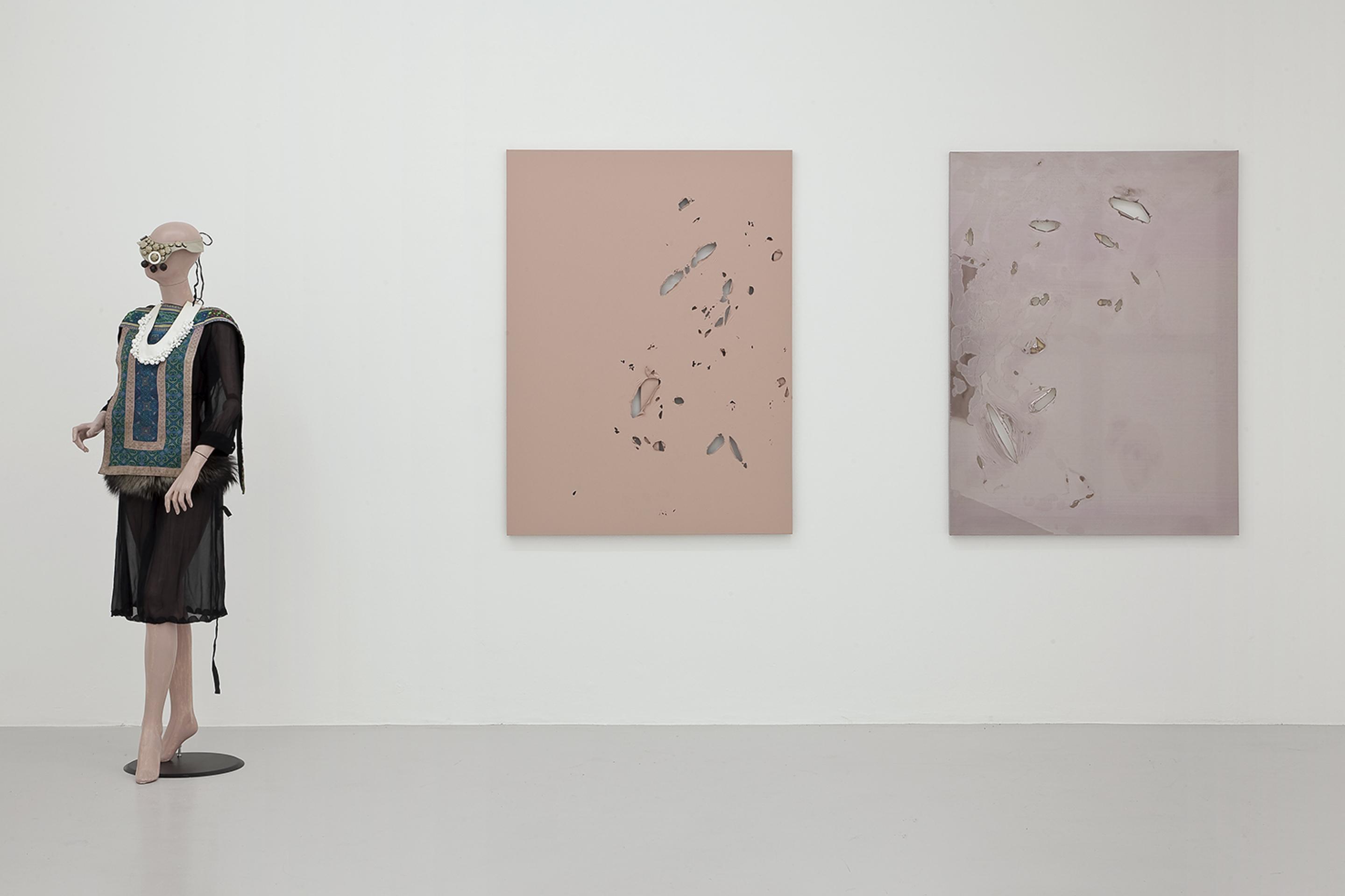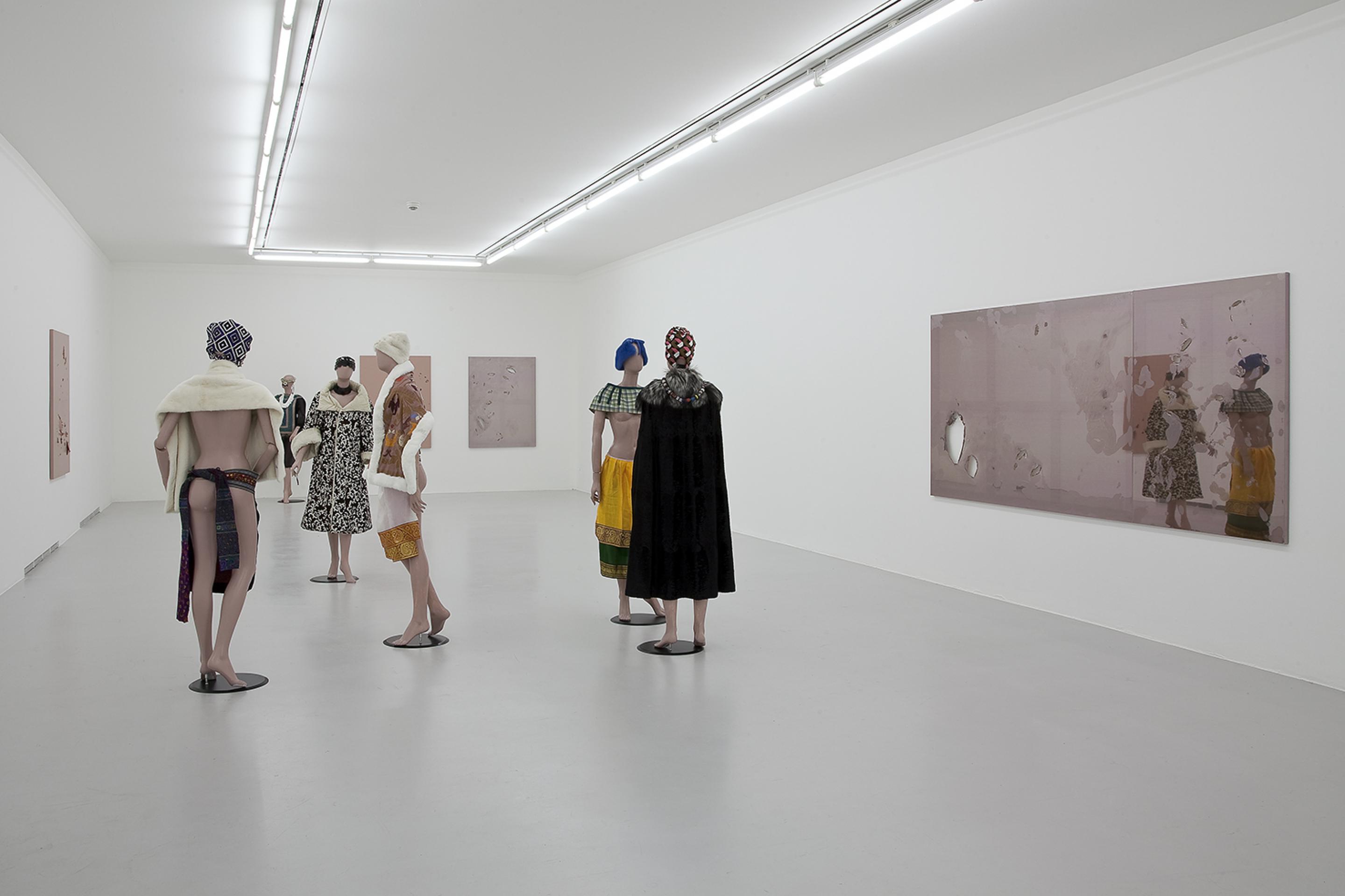 The mannequins on display in the gallery are collaborative works between the artist and Nina Yashar. Gambaroff’s fascination with Yashar led to their working together of creating sculptural stand-ins of an imaginary viewership, multiple Ninas (i.e. spectators) in the space. The mannequins are as much sculptures as they are a problem. Separate of the paintings, but as well a part of them, the collaboration between Yashar and Gambaroff is an exchange as a push and pull between the different interests and fears of being on stage, not of selling, but of being sold, being traded and trading positions.