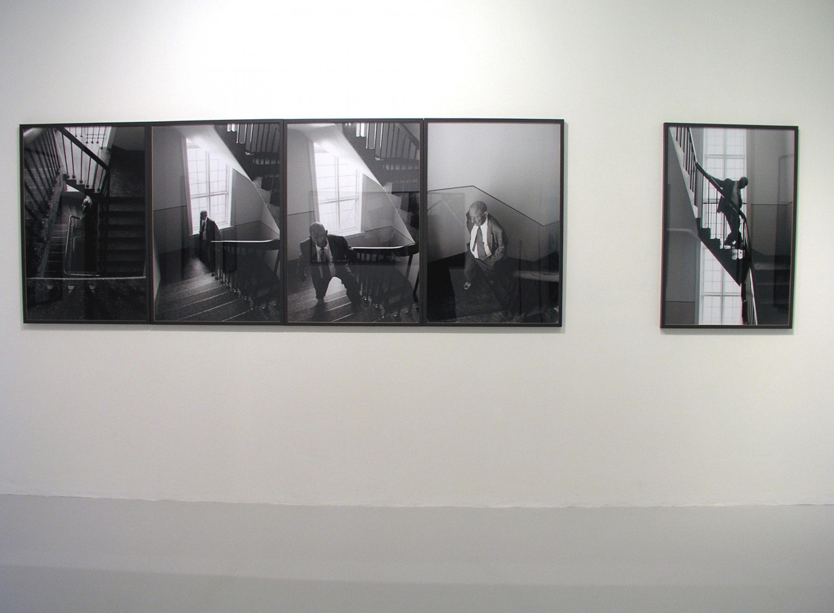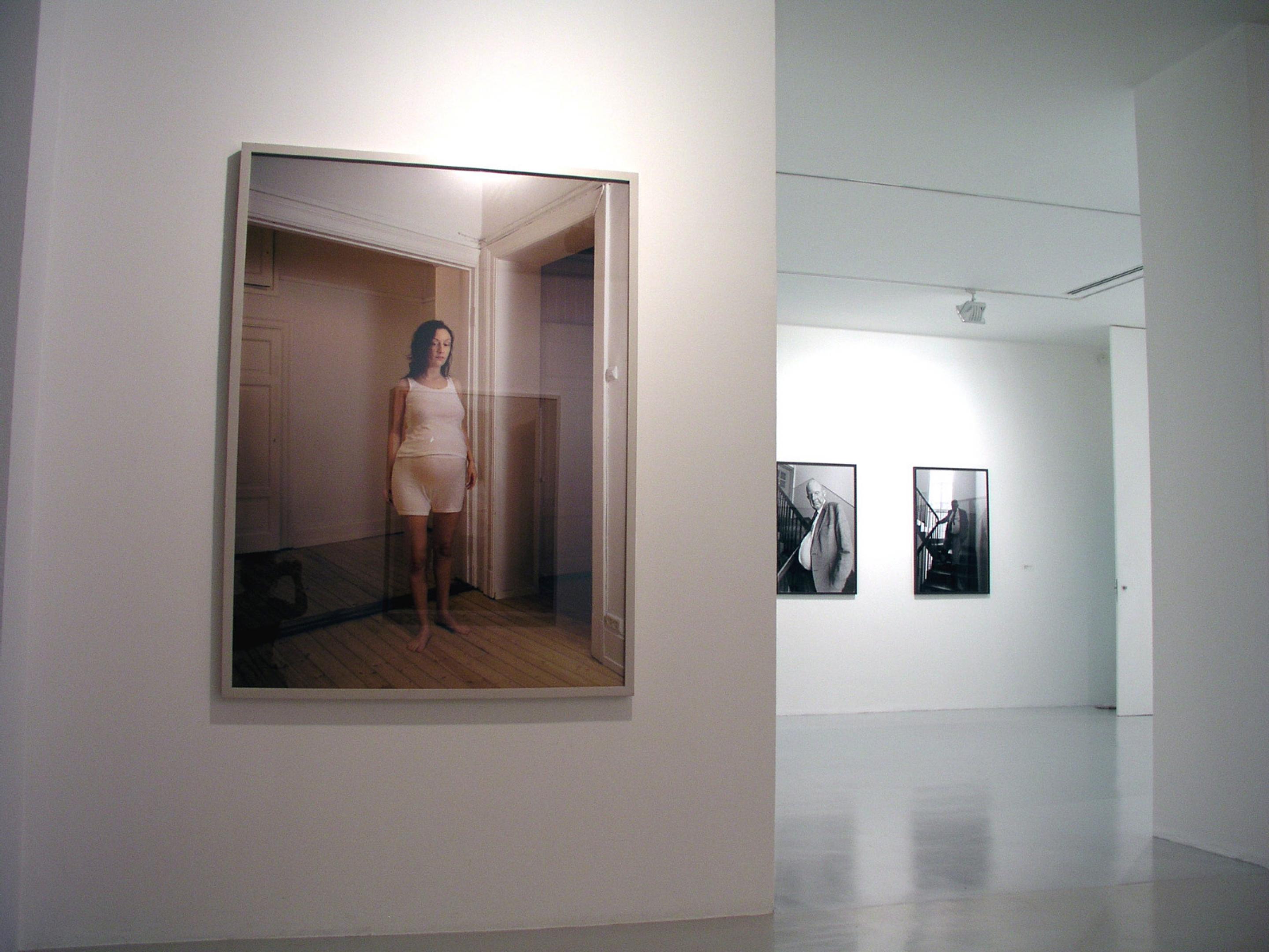 Le fotografie della serie Undo ritraggono il corpo dell’artista incinta, in piedi all’interno di un appartamento, vestita con dei semplici boxer e canottiera bianchi e ciascuna foto, in totale sette, documenta le variazioni della sua silhouette dovute alla gravidanza. Dalla rotondità del ventre alla curvatura della schiena passando per la piccolezza delle sue membra, sono tutti i contorni del corpo della Tandberg che sembrano impercettibilmente ondulati tanto che il suo viso si irrigidisce in una sorta di assimetria inquietante. La sobrietà della decorazione, le tonalità beige, così come le modificazioni delle linee di fuga del parquet e delle porte concorrono inoltre a creare un’atmosfera irreale in cui questo corpo portatore di una nuova vita appare in tutto il suo paradossale enigma. Con le opere fotografiche Old Man Going Up and Down a Staircase la Tandberg amplifica il sentimento di estraneità. L’artista in effetti è scivolata nella pelle di un vecchio mentre era alla fine della gravidanza; con il corpo vestito con un abito scuro ed il cranio reso calvo sale e scende le scale di un edificio, con tutte le difficoltà dovute al suo stato fisico. La serie di foto To Leave by Boat conferma il bisogno ricorrente dell’artista di mascherarsi, di estraniarsi: mettendo in scena un personaggio incappucciato la Tandberg perviene in effetti a provocare una possibile rilettura del corpo e delle sue posture, attraverso l’annullamento del volto e di tutte le nozioni di identificazione. In un modo più impegnato il video God Bless America, montato su DVD della durata di due minuti, mostrando l’immagine fissa di George W. Bush, la cui bocca si sovrappone a quella dell’artista fischiettando l’inno americano in modo molto ironico, conferma il gusto della Tandberg per l’ibridazione e la permutazione dei sessi. L’espressione semplice del volto del presidente viene enfatizzata dal fischiettio stonato. Redo è un film 8 mm trasferito su DVD molto breve. Mostra l’artista intenta a mettere delle foglie su di un albero spoglio. Il film è stato fatto con le azioni a ritroso in modo che quando si avvia il filmato all’indietro si ha l’impressione che l’artista metta delle foglie sull’albero. Si tratta di un’azione molto semplice e naturale, quasi un autunno simulato.