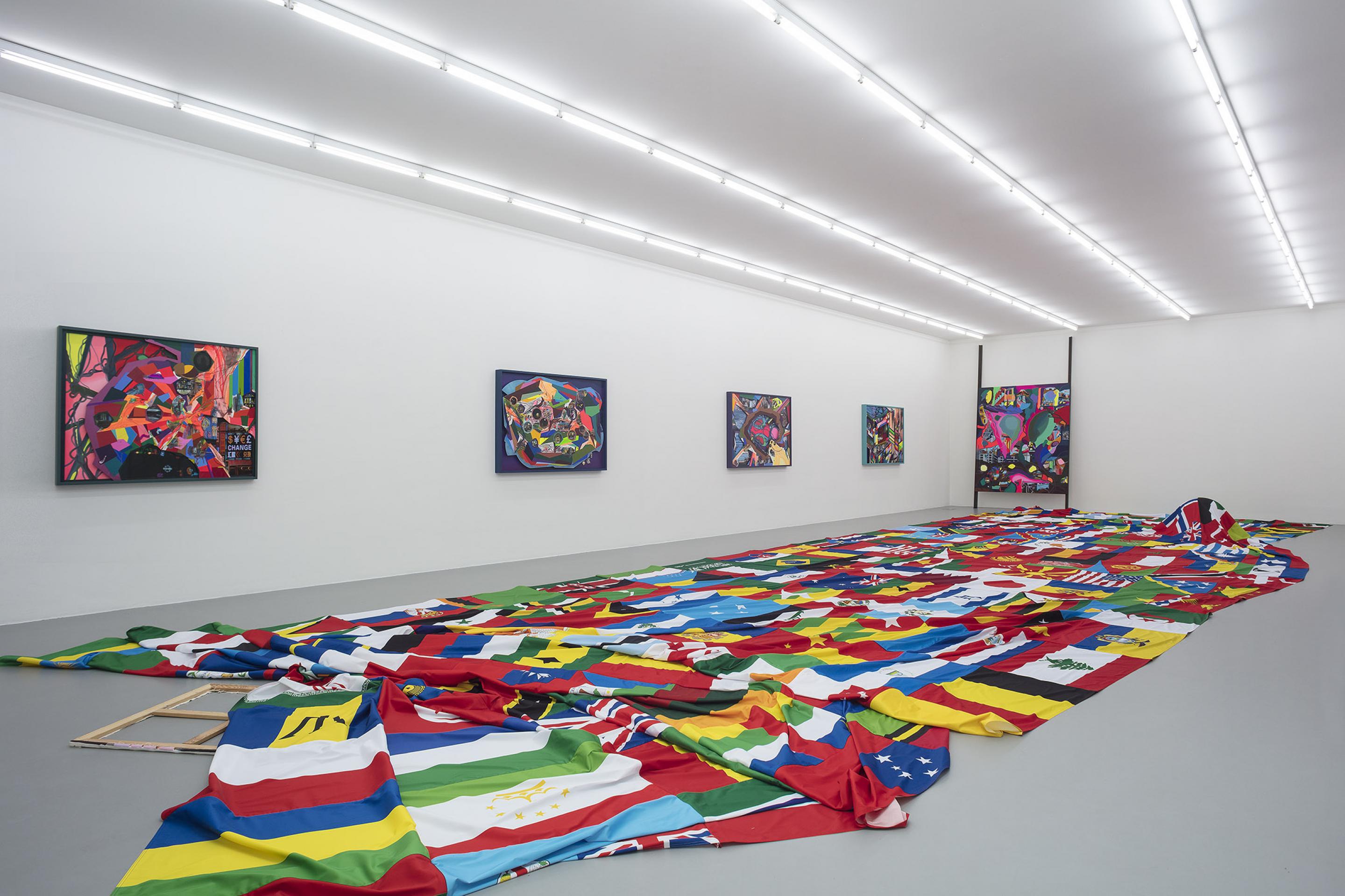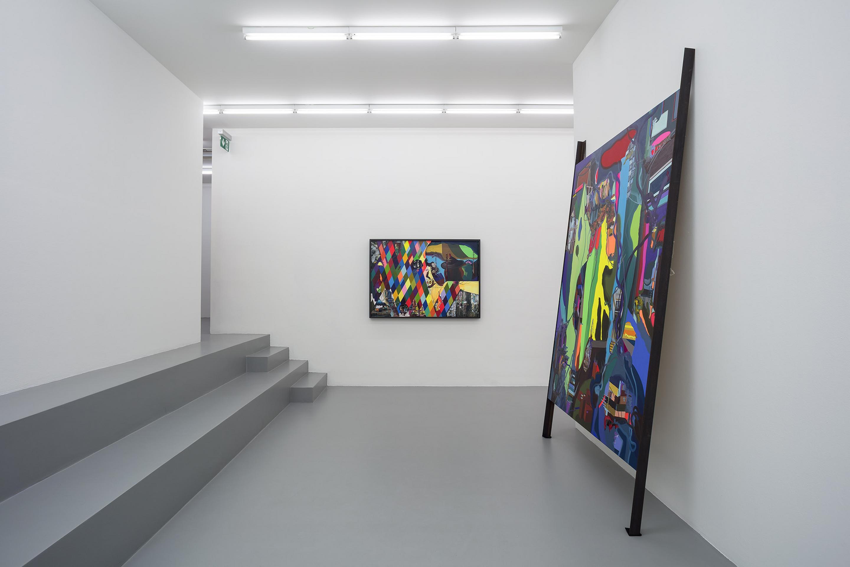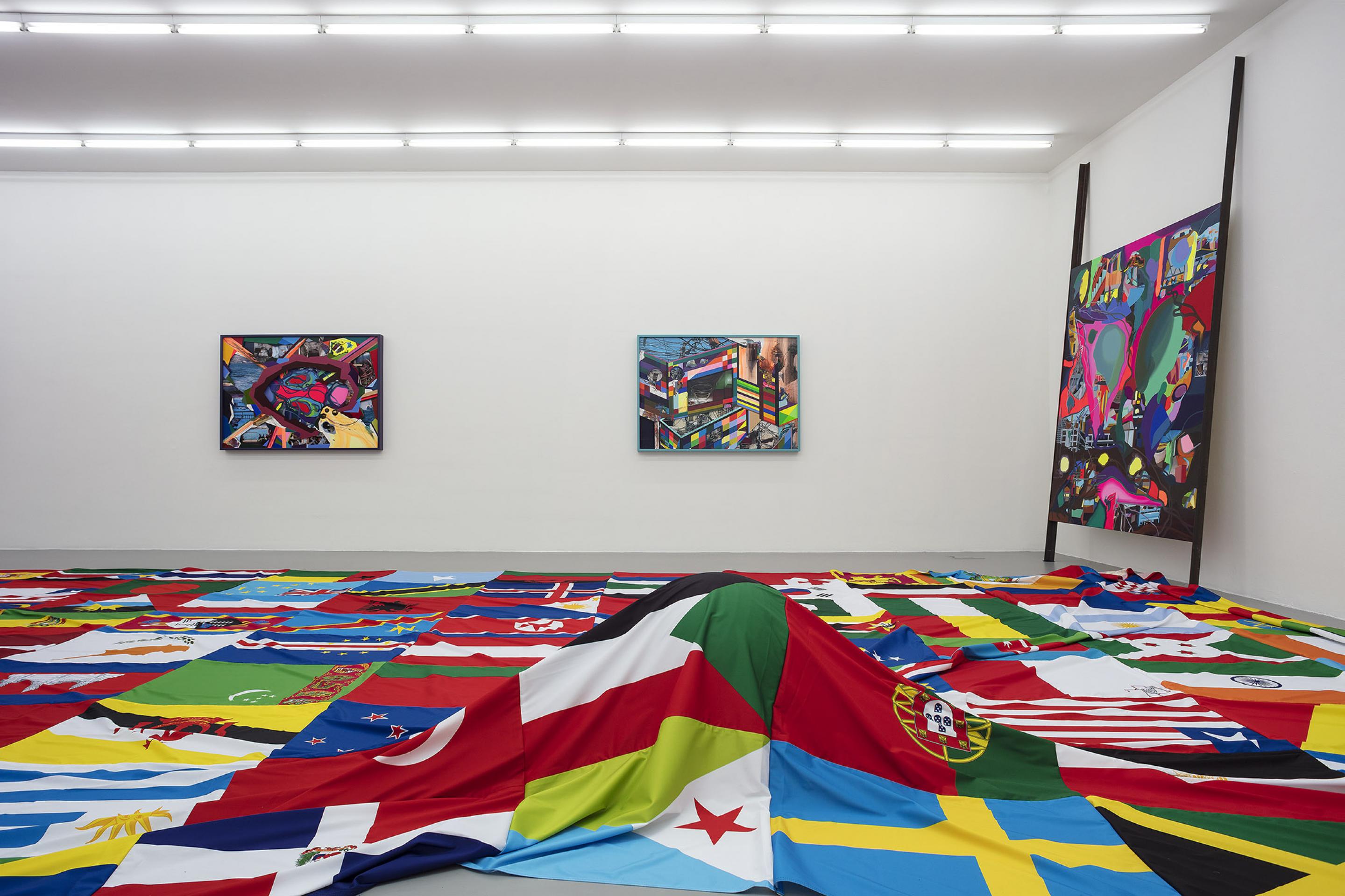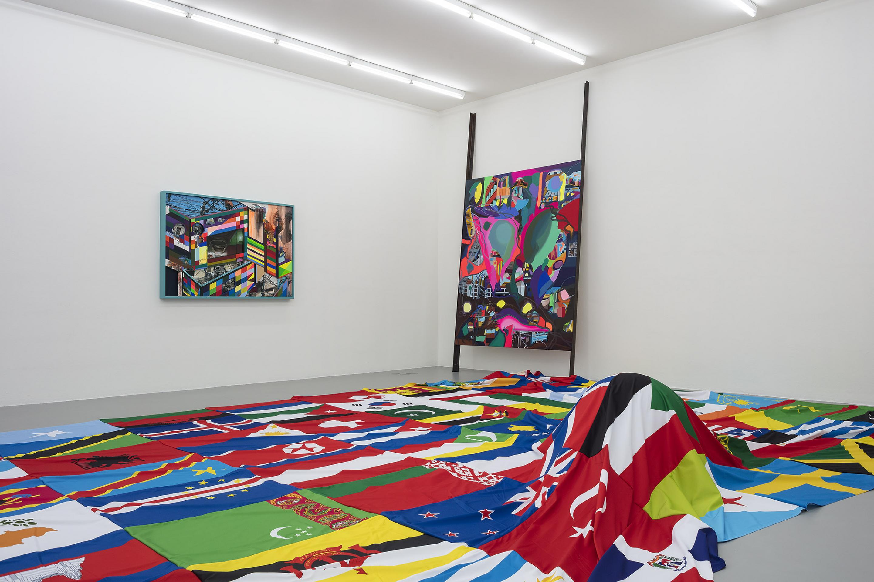 Oltre al flag carpet, diversi dipinti a olio così come una nuova serie di assemblage multi strato sono in mostra in galleria. Questi ultimi consistono di un fondo dipinto a olio, un lavoro fotografico nel mezzo, e, nella parte superiore, una stampa colorata con elementi architettonici dipinti e parti tagliate che consentono allo spettatore di immergersi nella profondità del lavoro. In questo nuovo corpo di opere, Ackermann combina i diversi media in maniera omogenea. Il passaggio intermedio della Mappa Mentale non è più necessario in quanto è stato sostituito da numerose fotografie ed elementi architettonici dipinti che vengono applicati direttamente sul lavoro reale.