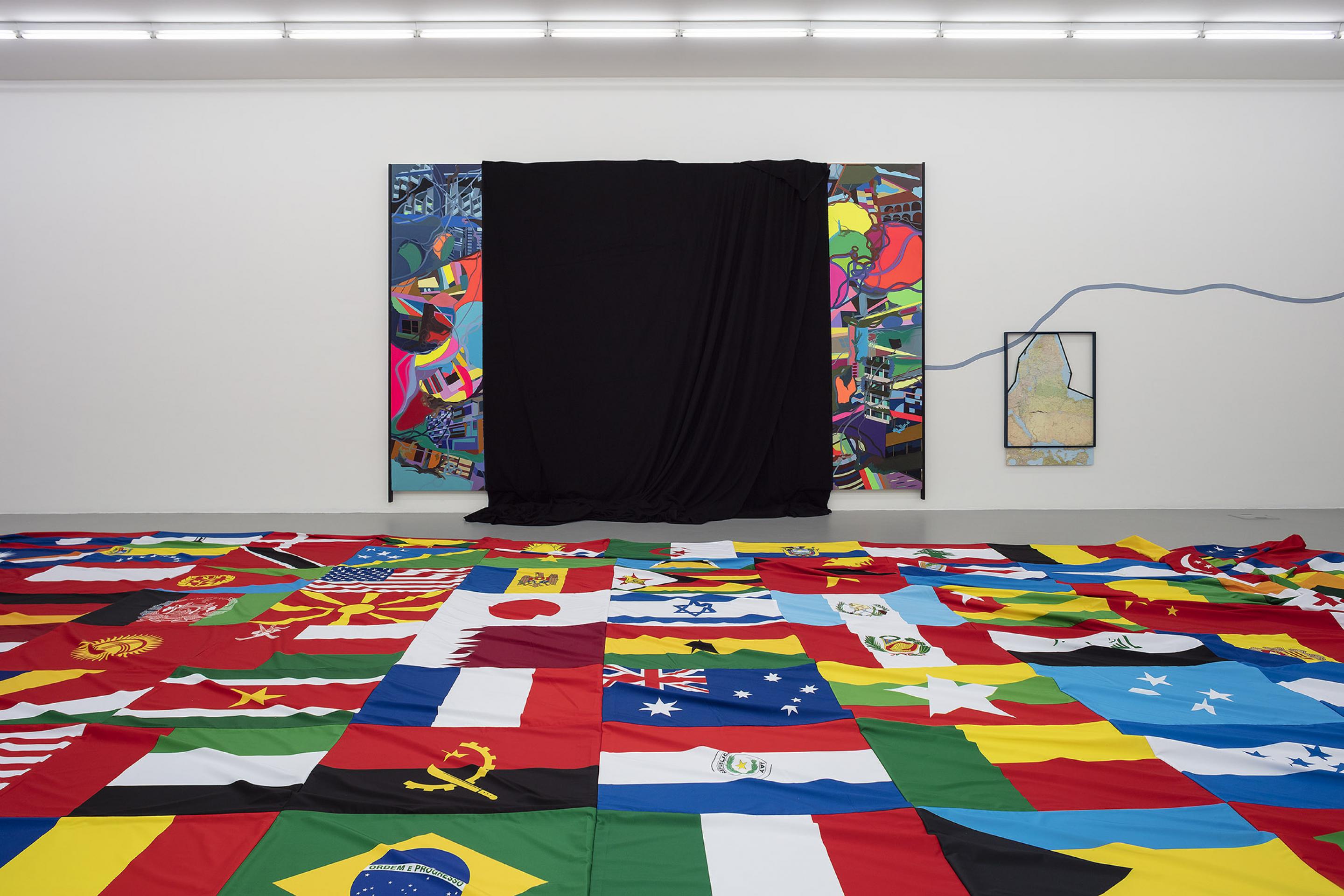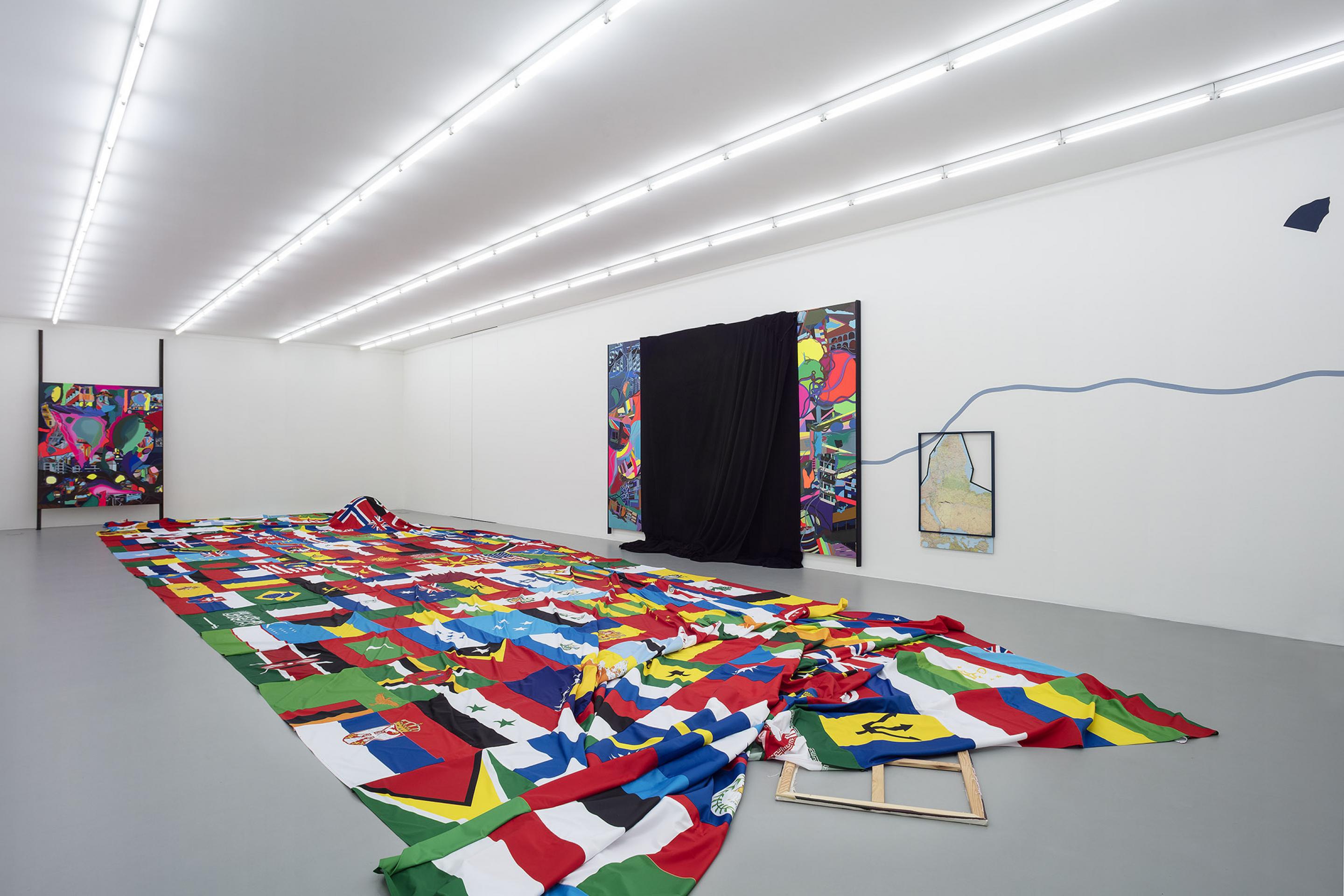 For the exhibition at the gallery, Ackermann was inspired by Alighiero Boetti’s map series. They are tapestry maps of the world on which each country is represented by the colours of its flag. Together they form an ideological portrait of the passing of time and of the geopolitical shifts while simultaneously postulating the idea of a united world.