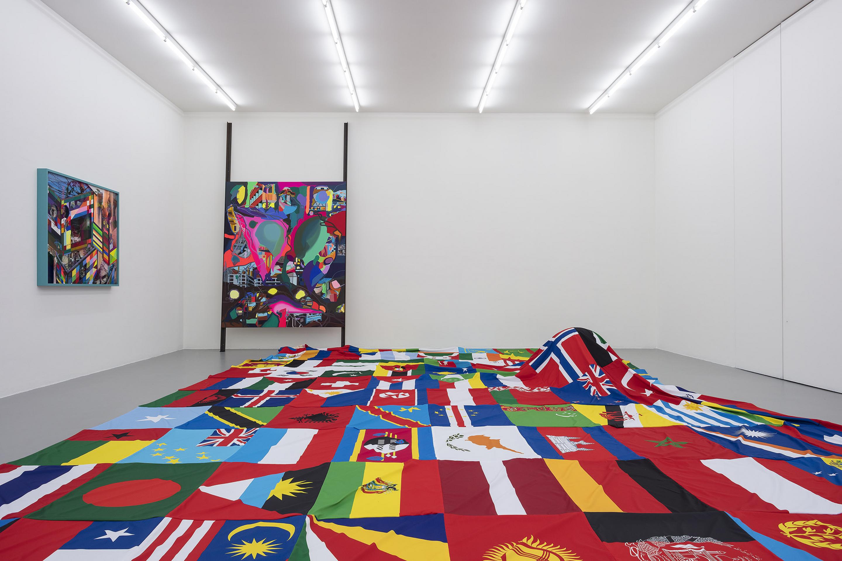 Besides the flag carpet, several oil paintings as well as a new series of multi-layered assemblages are on display at the gallery. The latter consist of an oil painting bottom, a photographic middle part and a colourful Alu-Dibond front with painted architectural elements and cut-out parts which allow the viewer to immerse into the depth of the work.In this new body of work, Ackermann not only combines all different kinds of media, he also achieves their homogeneity. The intermediate step of the Mental Map is no longer necessary as it has been replaced by the numerous photographs and painted architectural features which are applied directly onto the actual work.