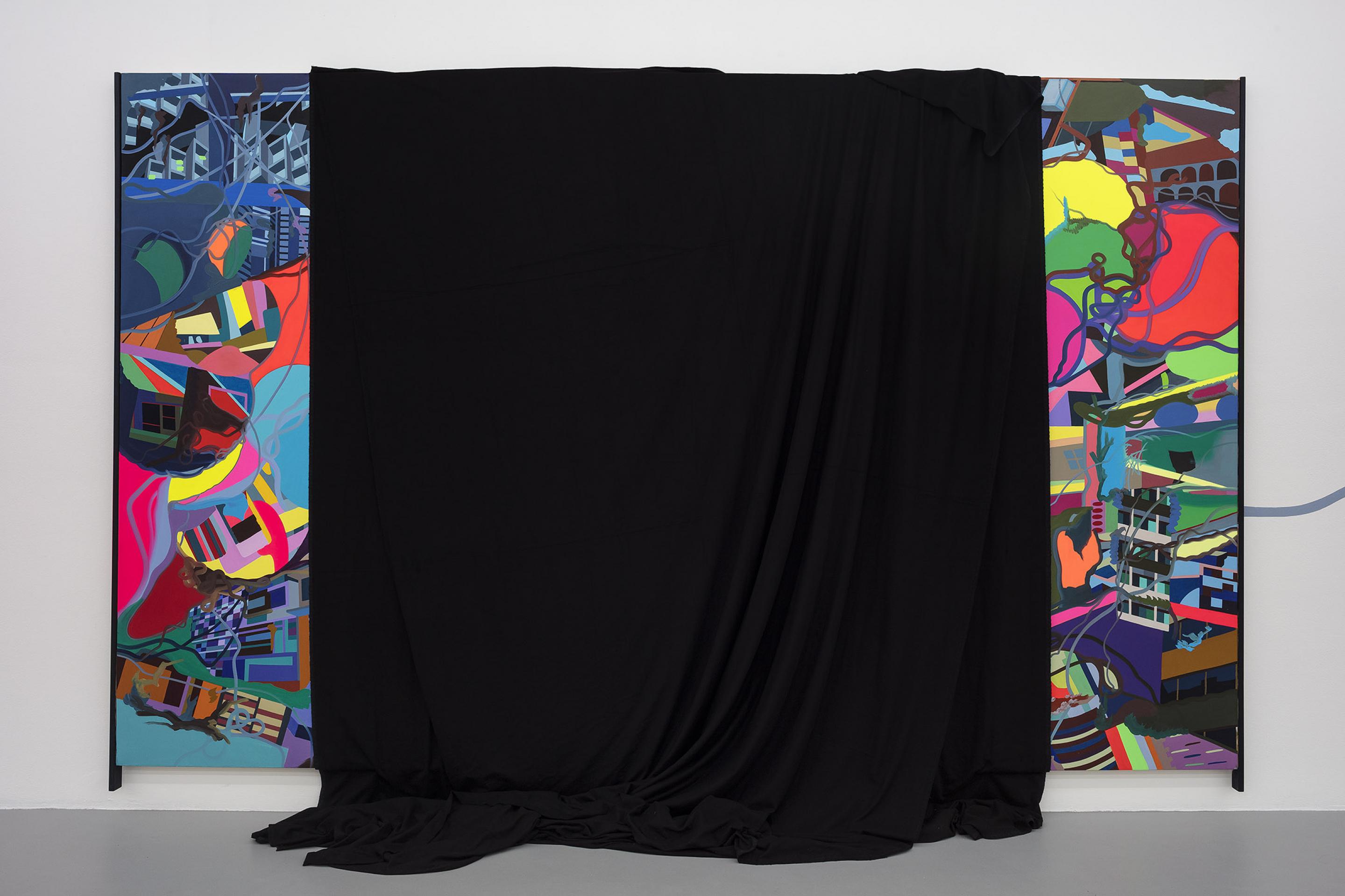 Franz Ackermann’s New Neighbours is a colourful, brave, new, reshuffled world, in which exigent current problems such as the ever widening gap between the analogue and the digital sphere, global human migration and complex national and supranational affiliations in an increasingly populist world, are persistently subsurface.