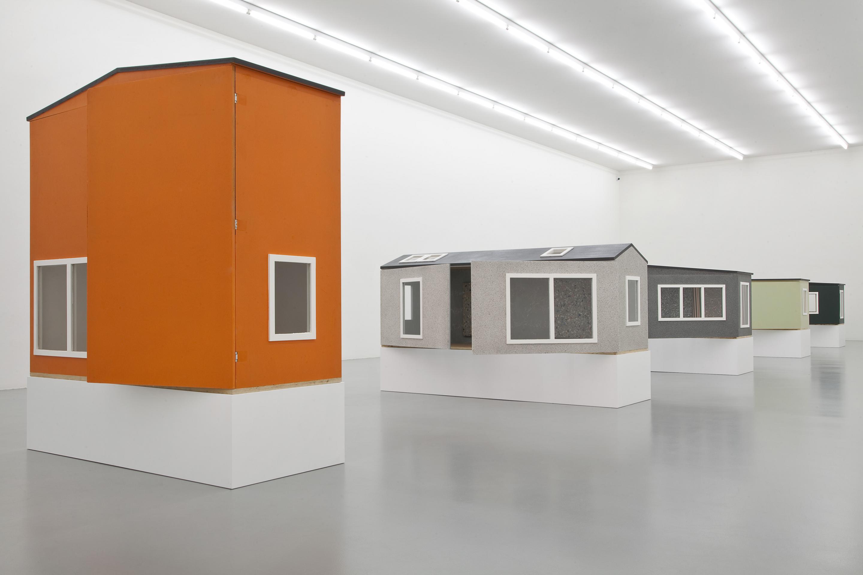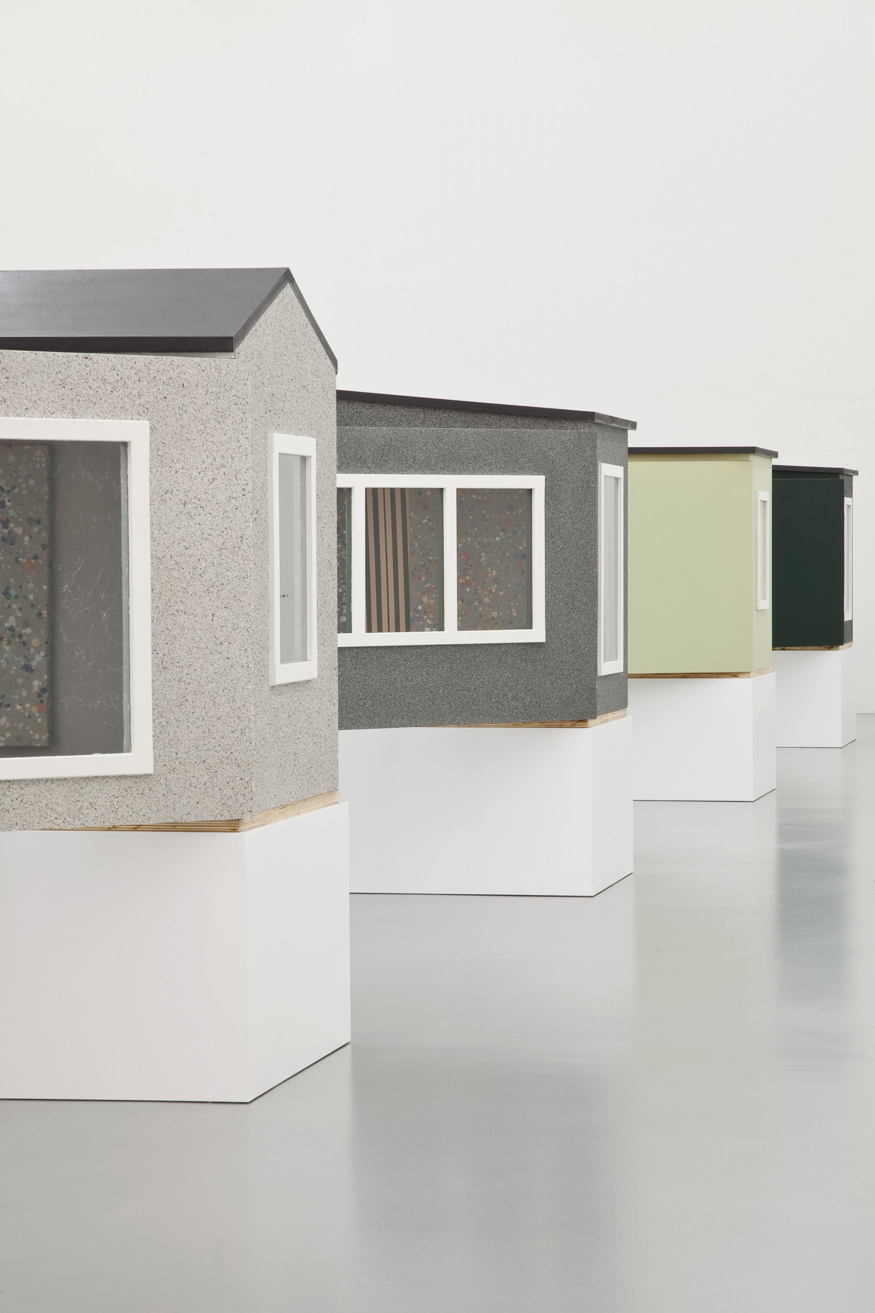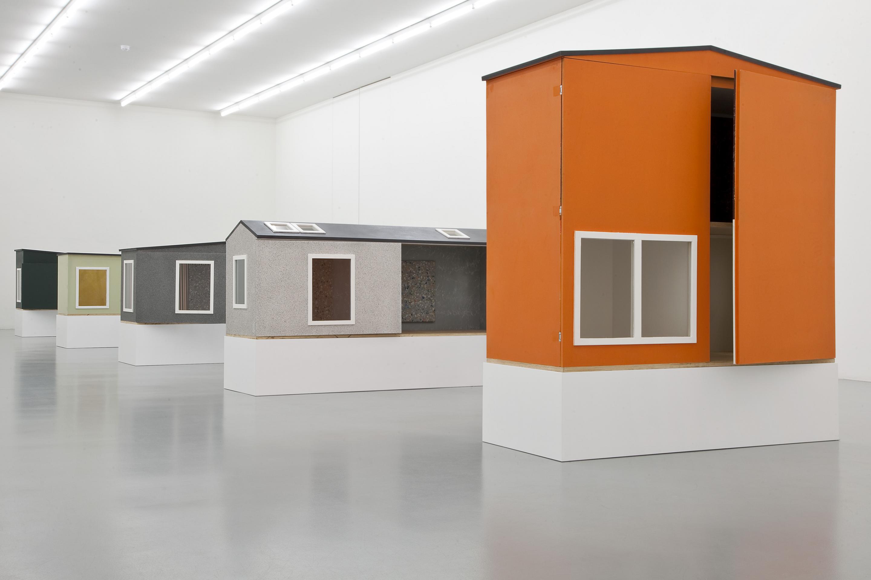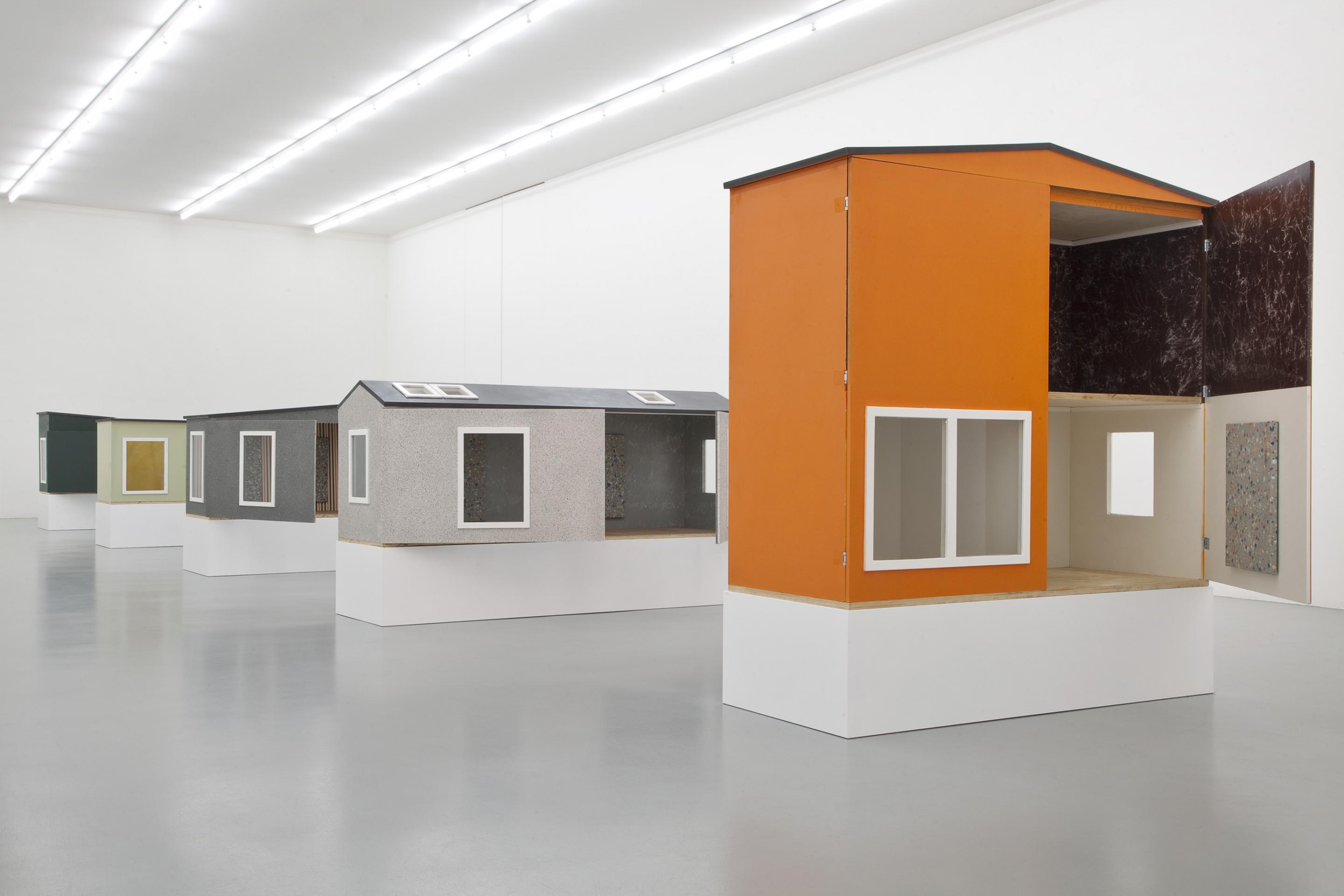 A body of small-scale works are exhibited inside a series of wooden houses Fredrik Værslev specifically produced and painted for the show.