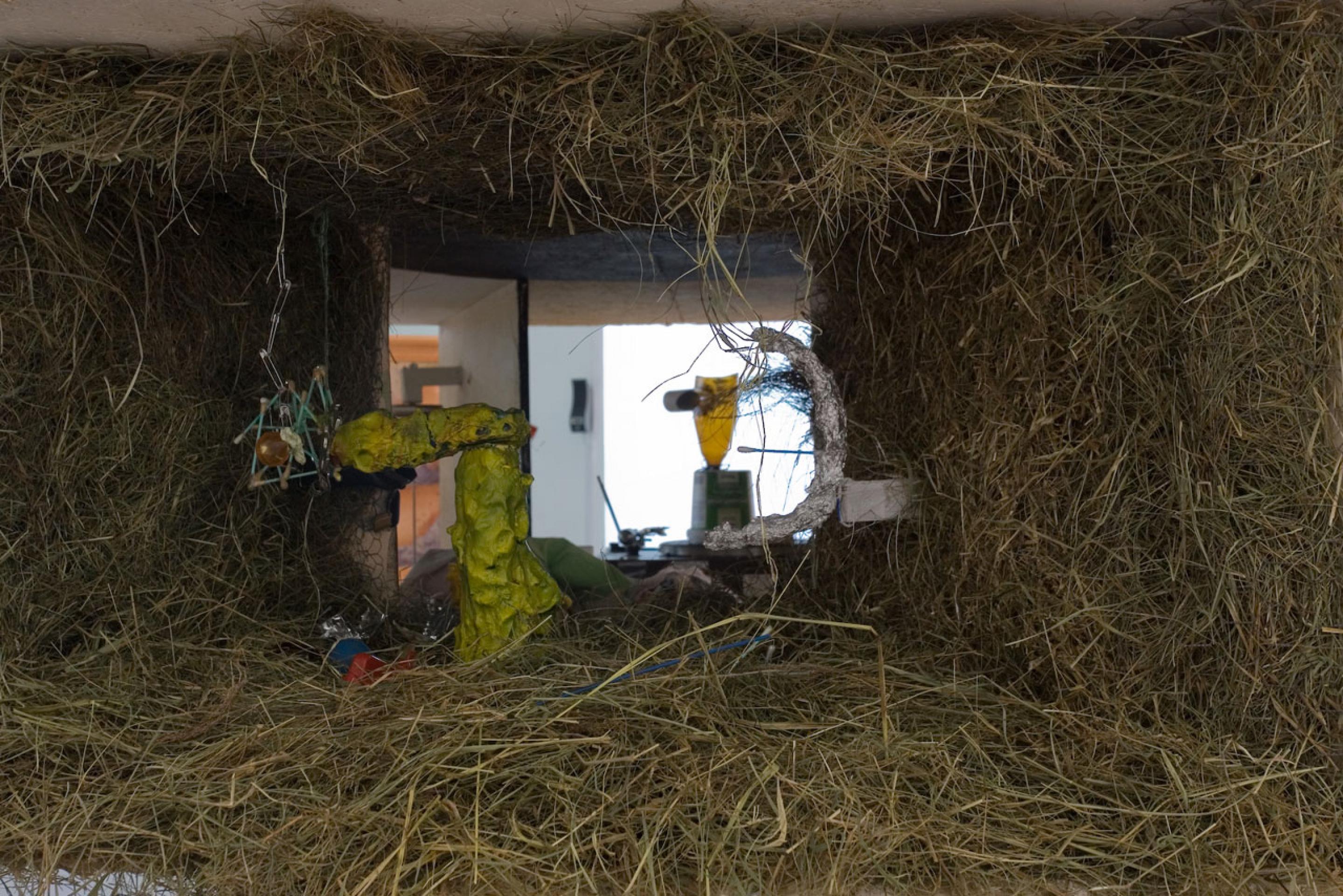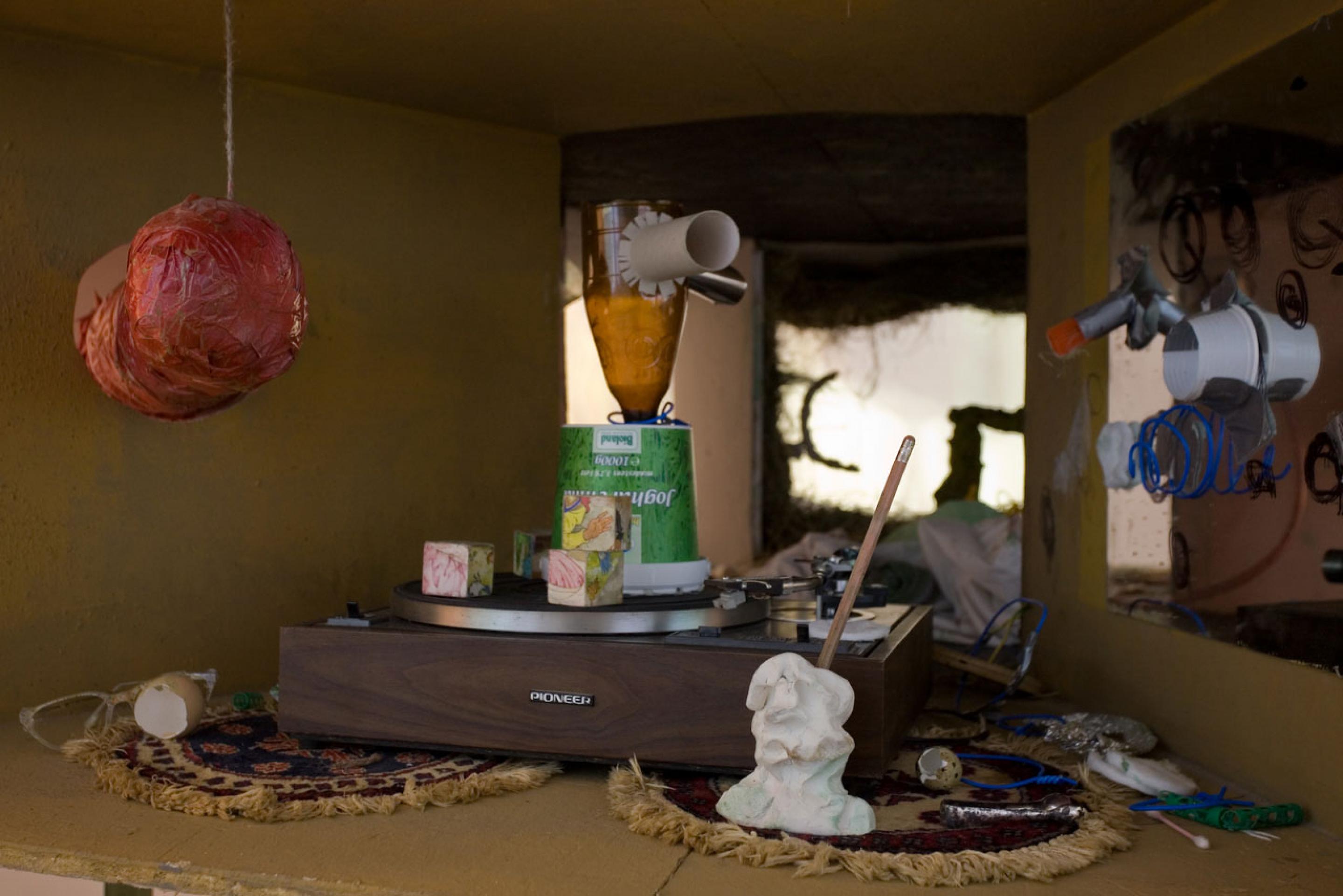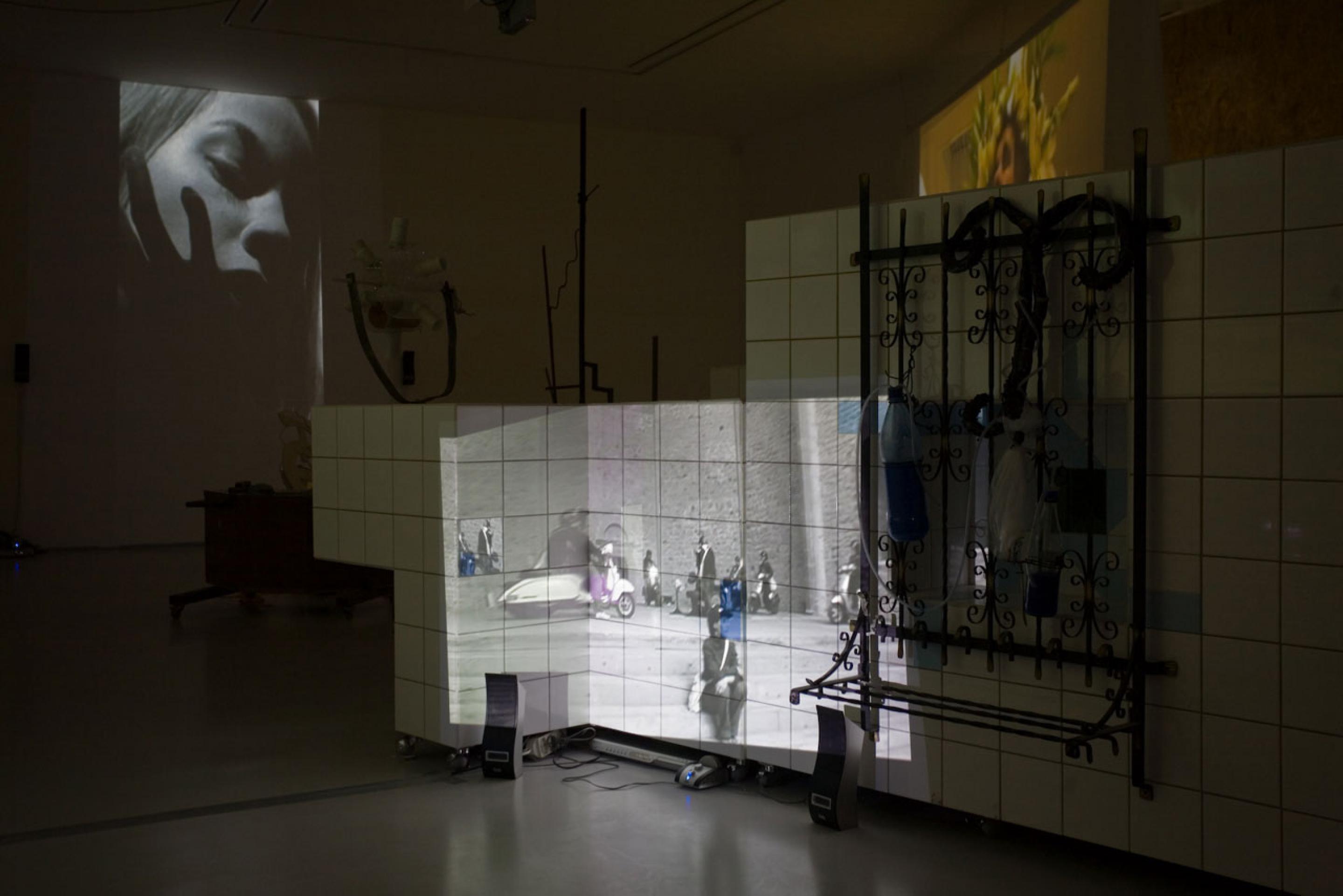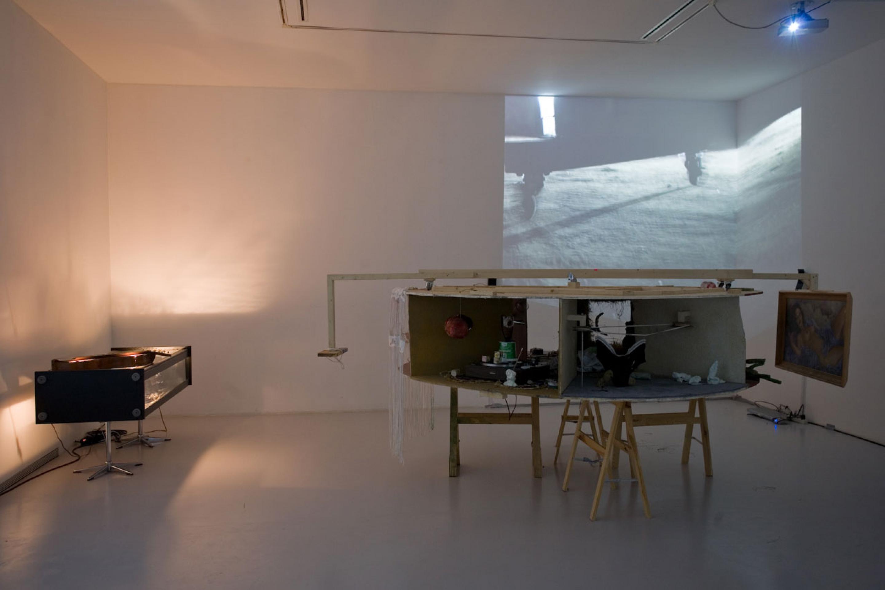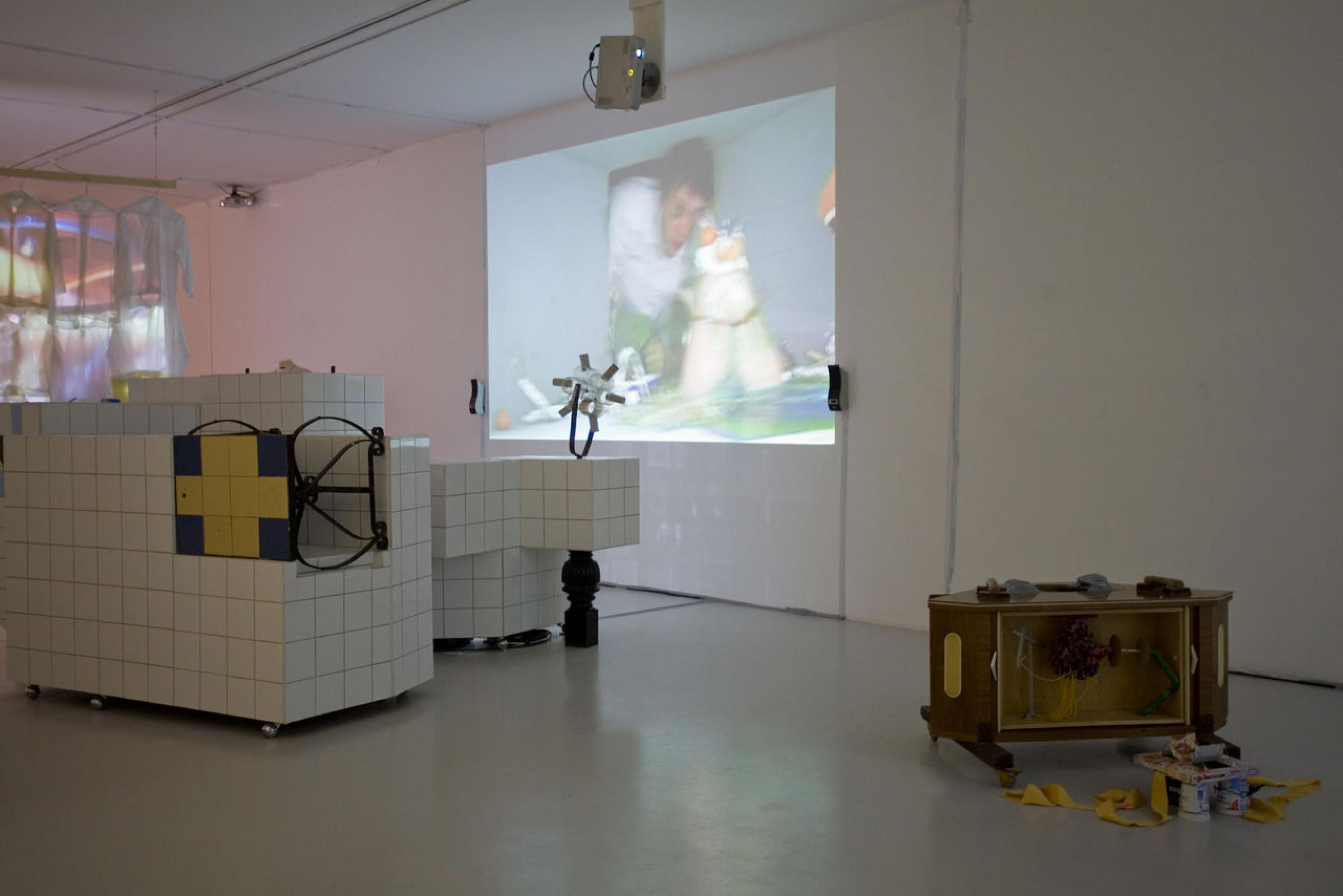 In another room of the gallery will be set up an experimental film/performance, made by eight projections that make references to a previous performance by John Bock and two actresses set in his studio and in the open air.