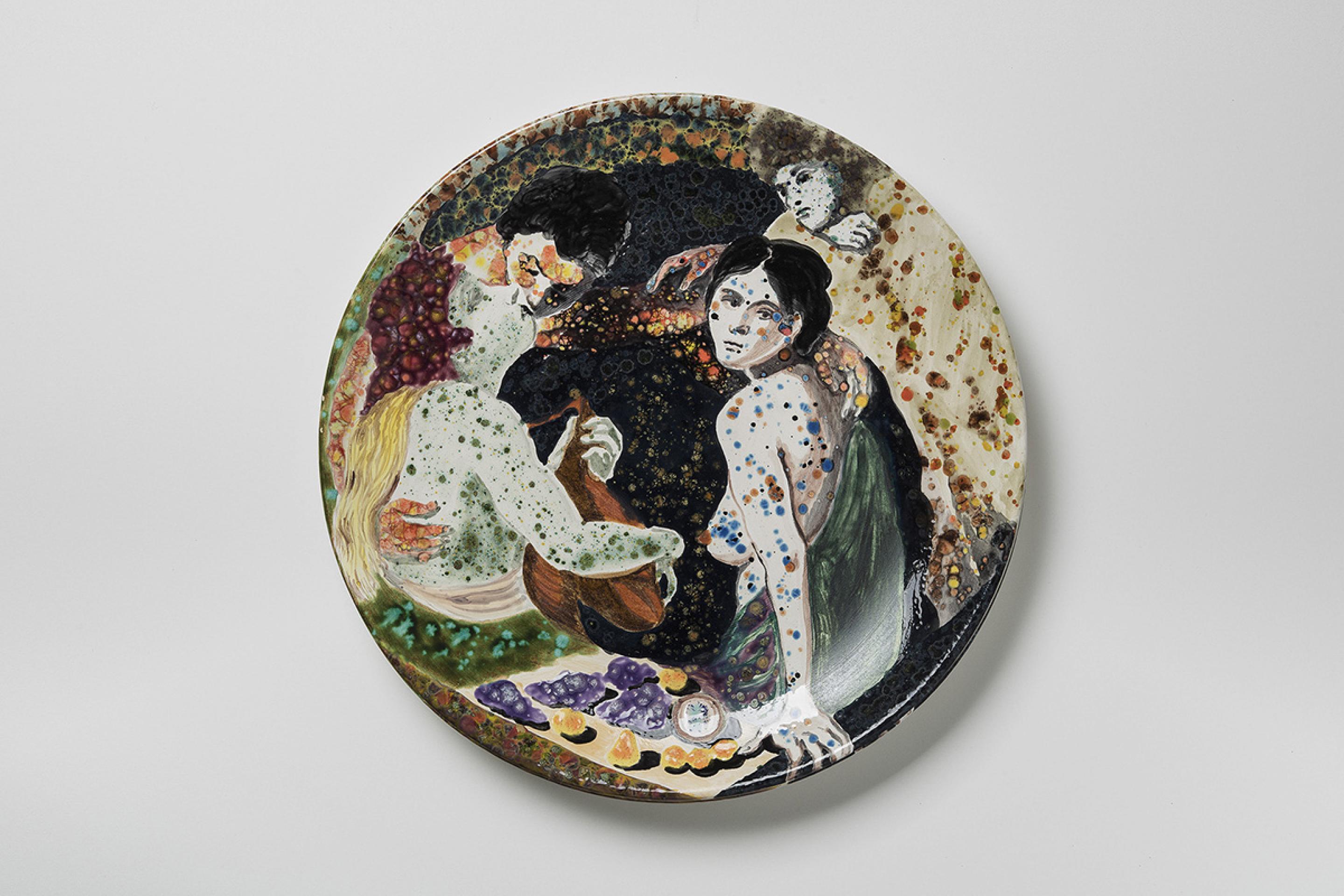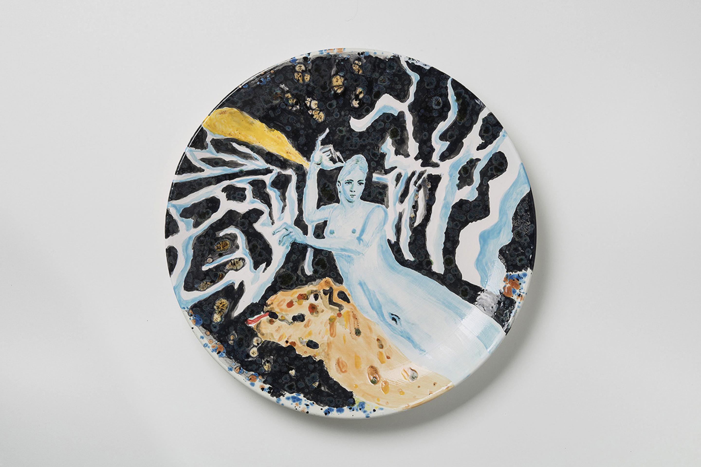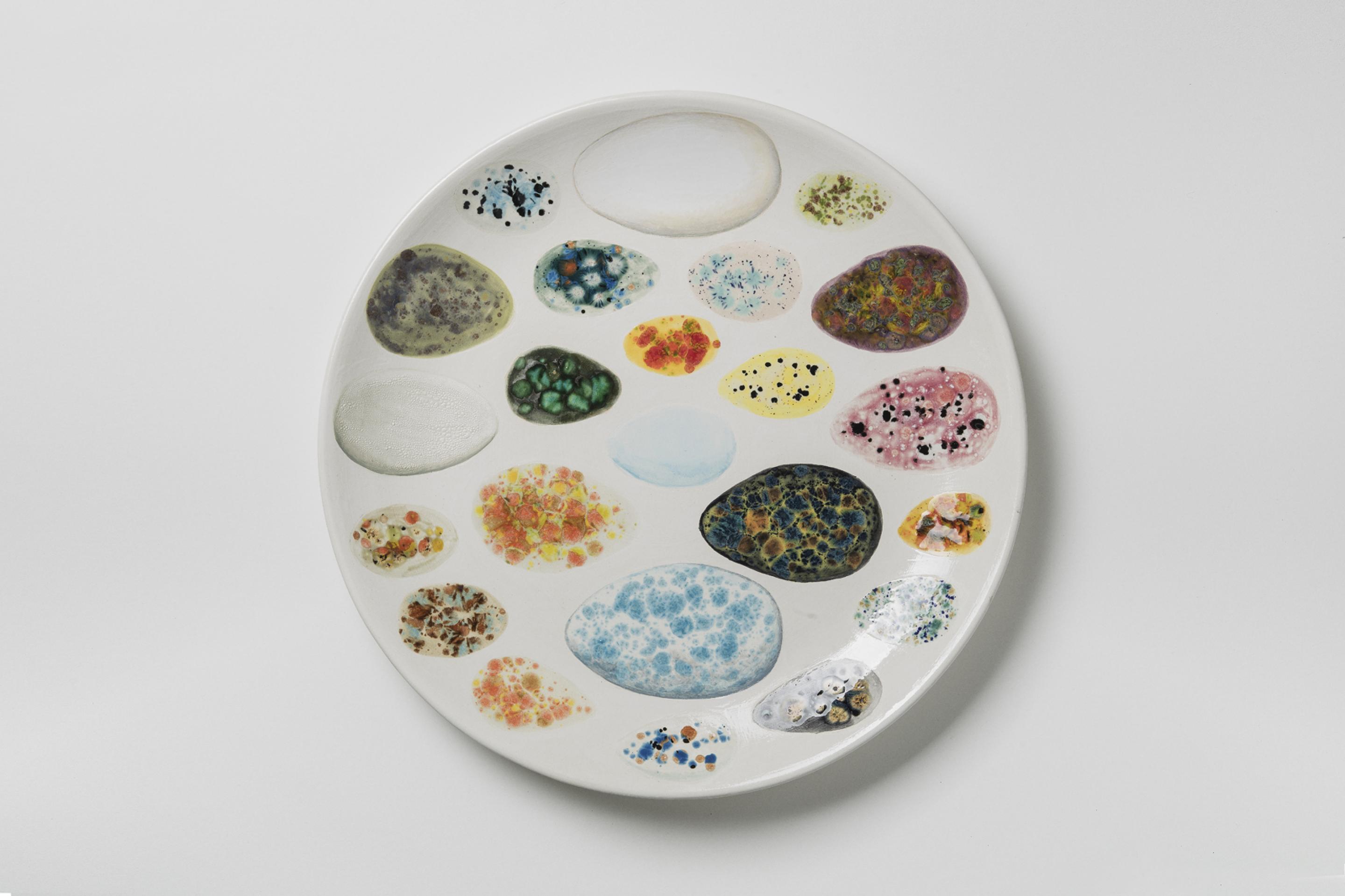The attraction to glazing plates is entirely based on not knowing the end result. There are few activities in which painting can be so chance-based; in which heat is half the battle. The glazes go on in colours and textures entirely different to how they will end up; the elemental force of volcanic temperatures wreak their aesthetic havoc. Small crystal rocks embedded in the gunk chemically transform and imitate the effects of thousands of years of deep time – geology, mineraloids, the lithosphere, evolution – as well as more contemporary synthetics – plastic, candy, tie-dye, cake batter and glitter. What emerges often challenges my expectations and taste.