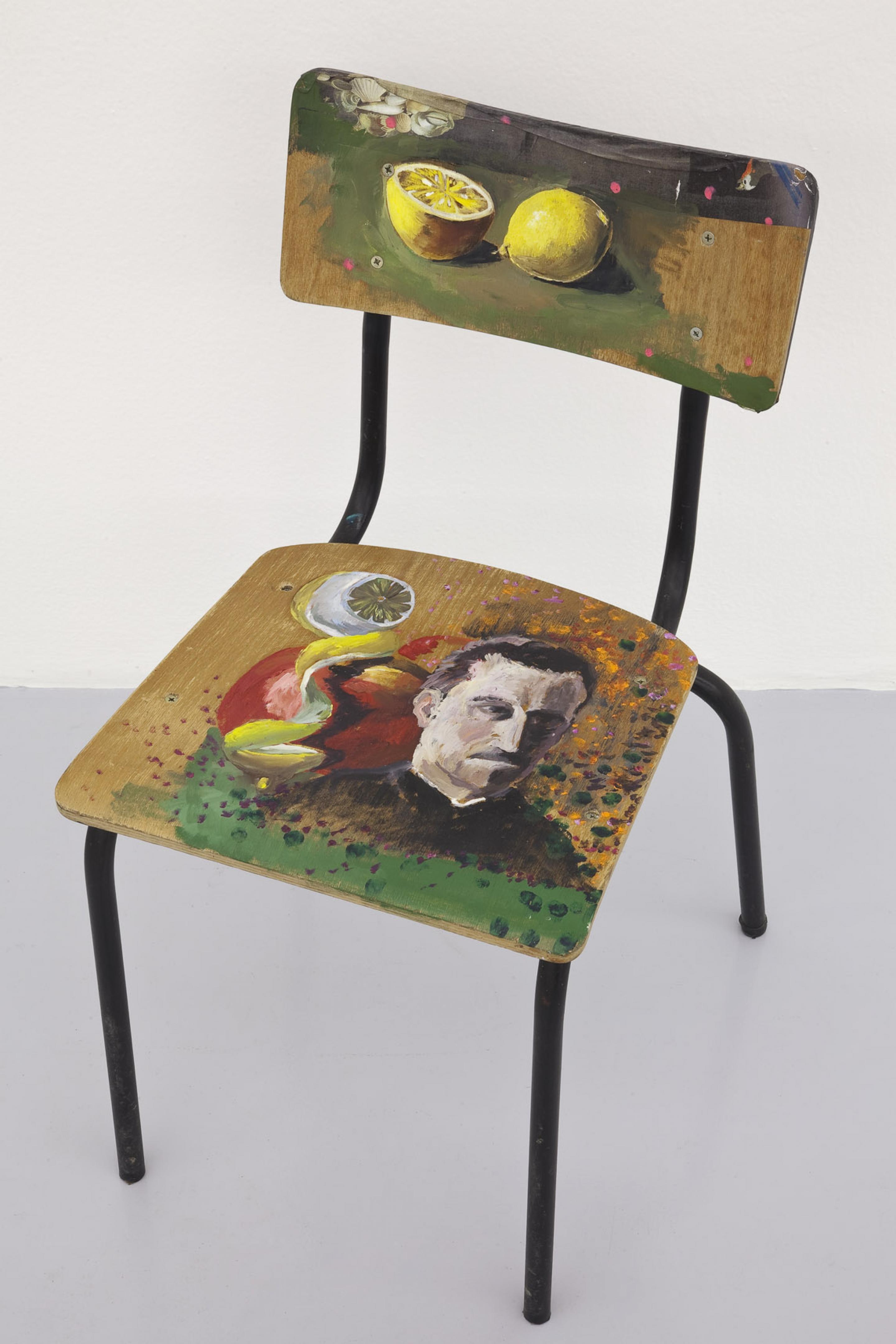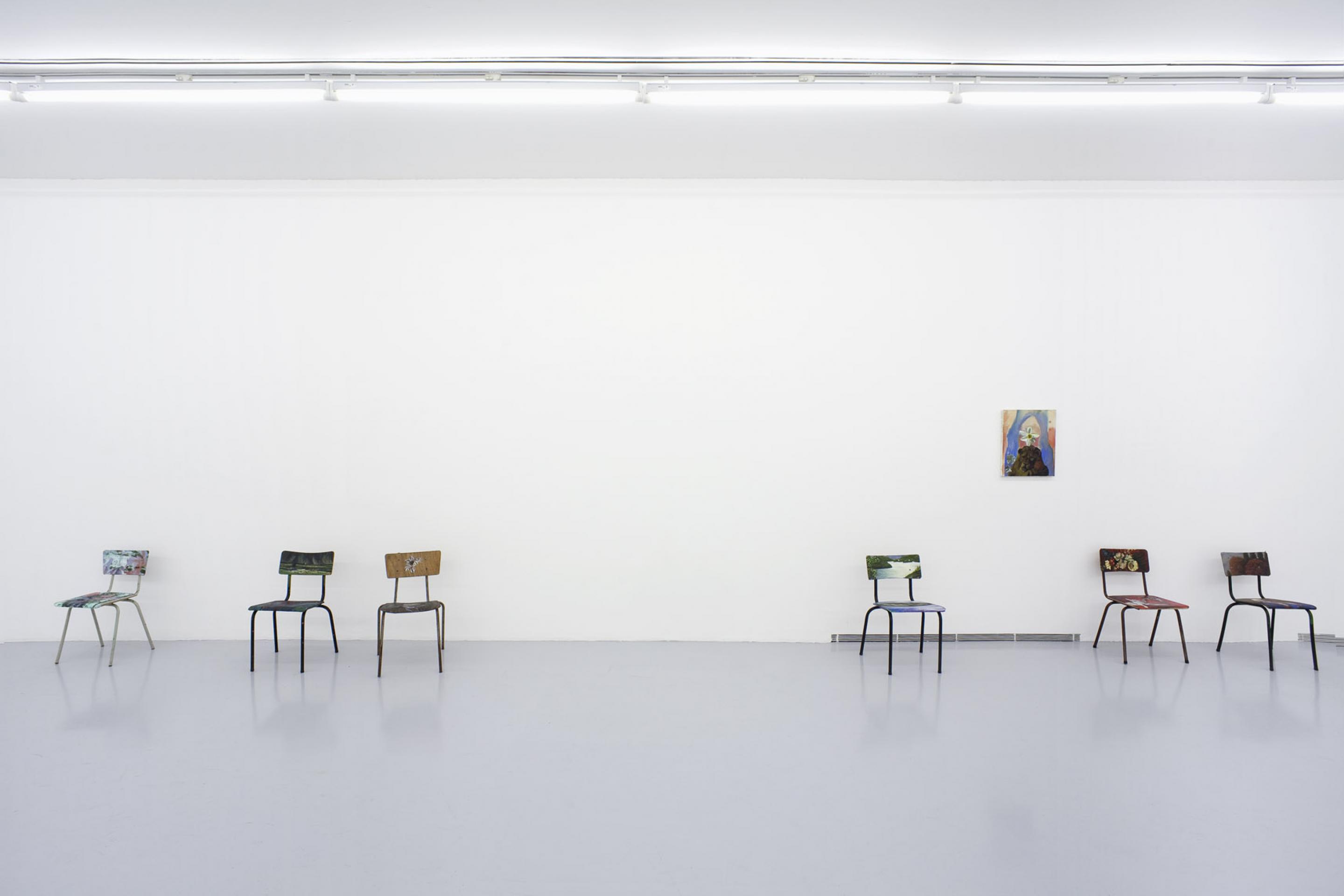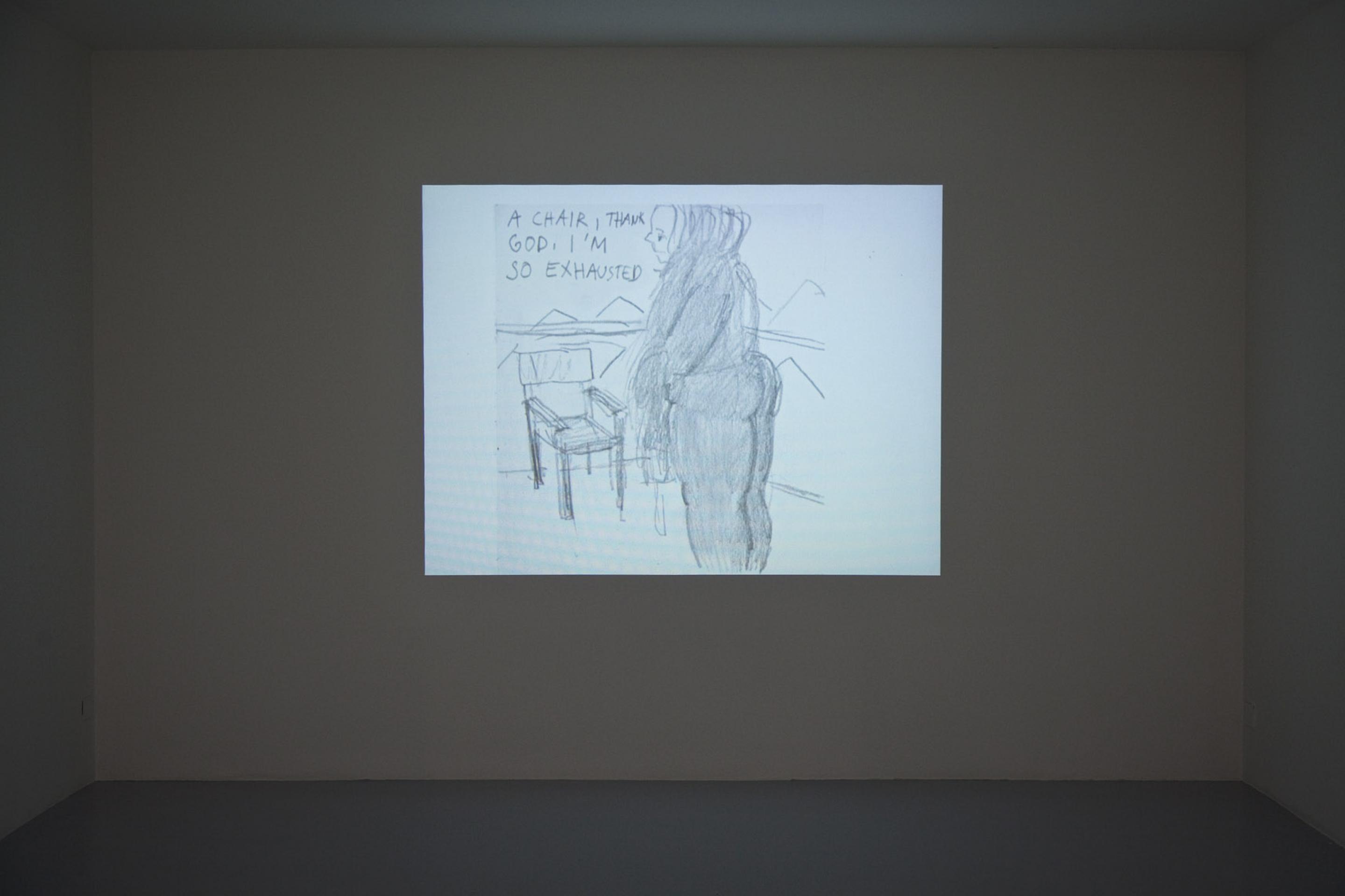 Per la personale da Giò Marconi l’artista presenta una nuova serie di lavori pittorici, un fumetto che viene proiettato e alcune sedie dipinte a mano.