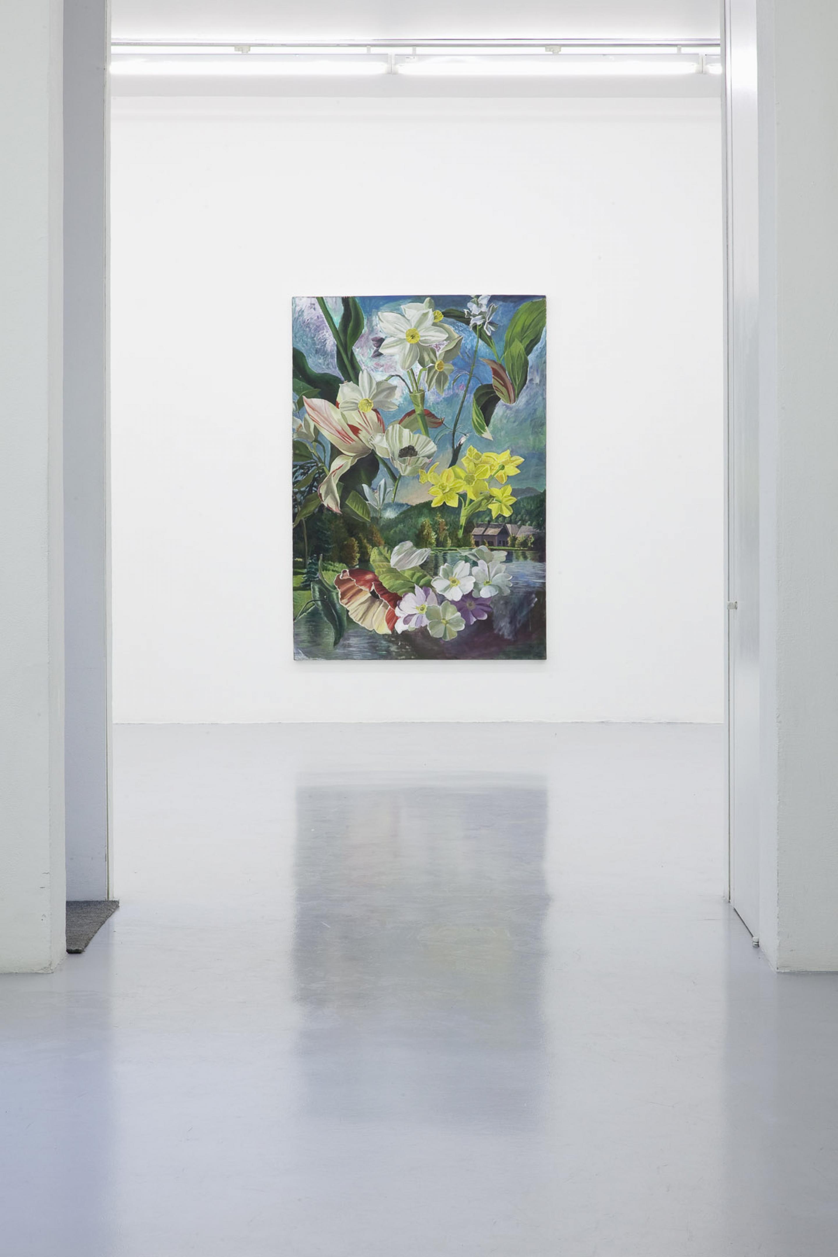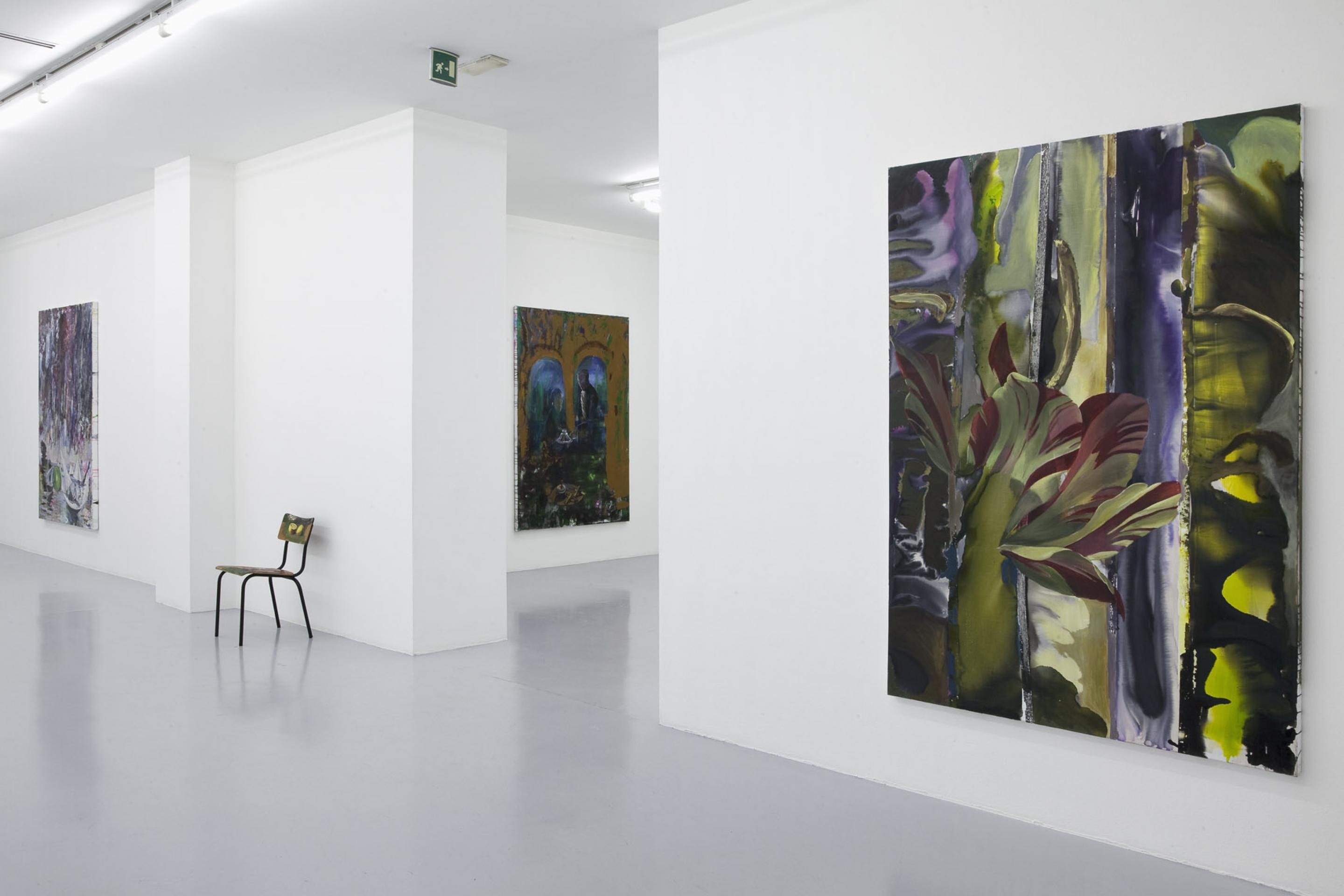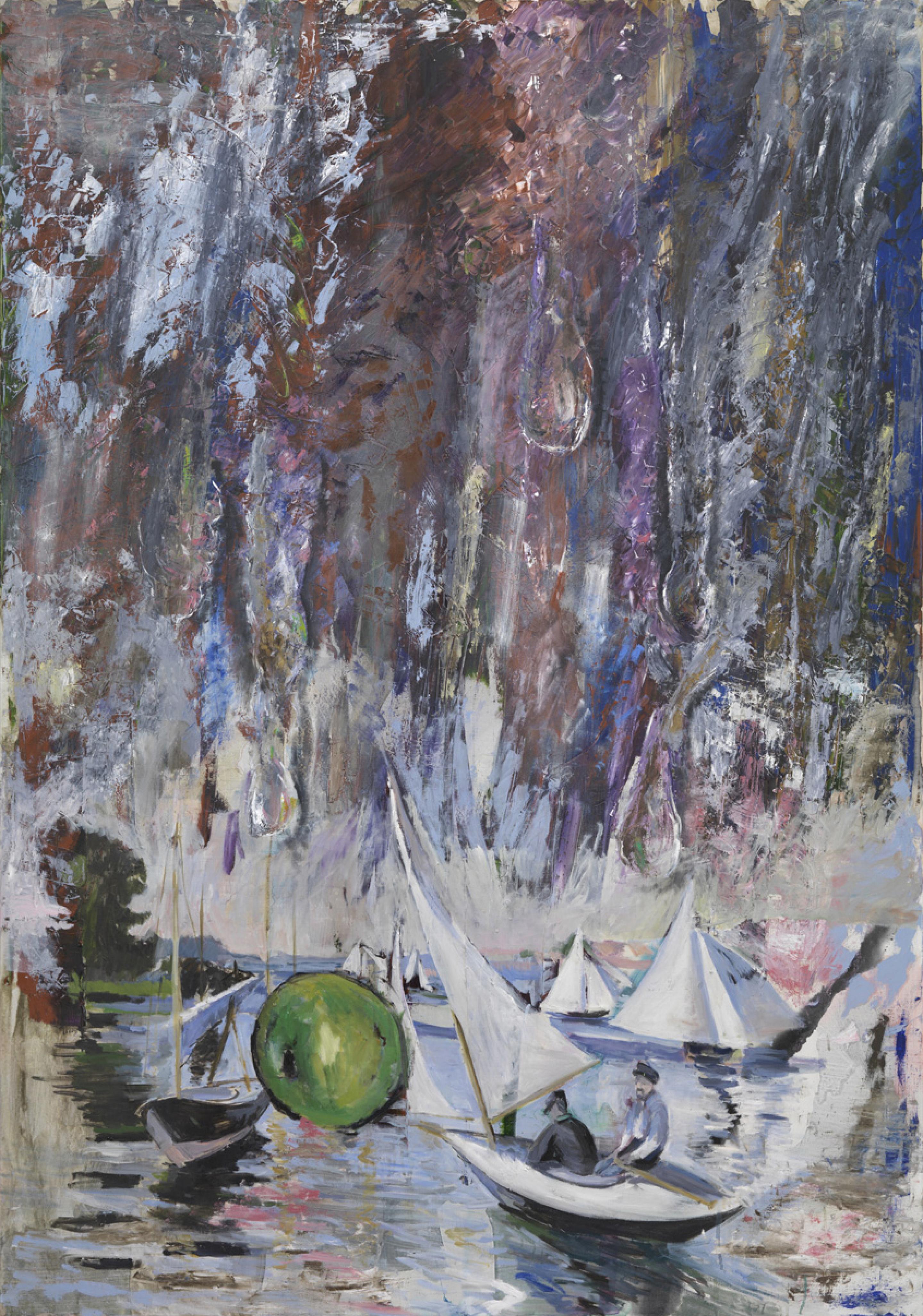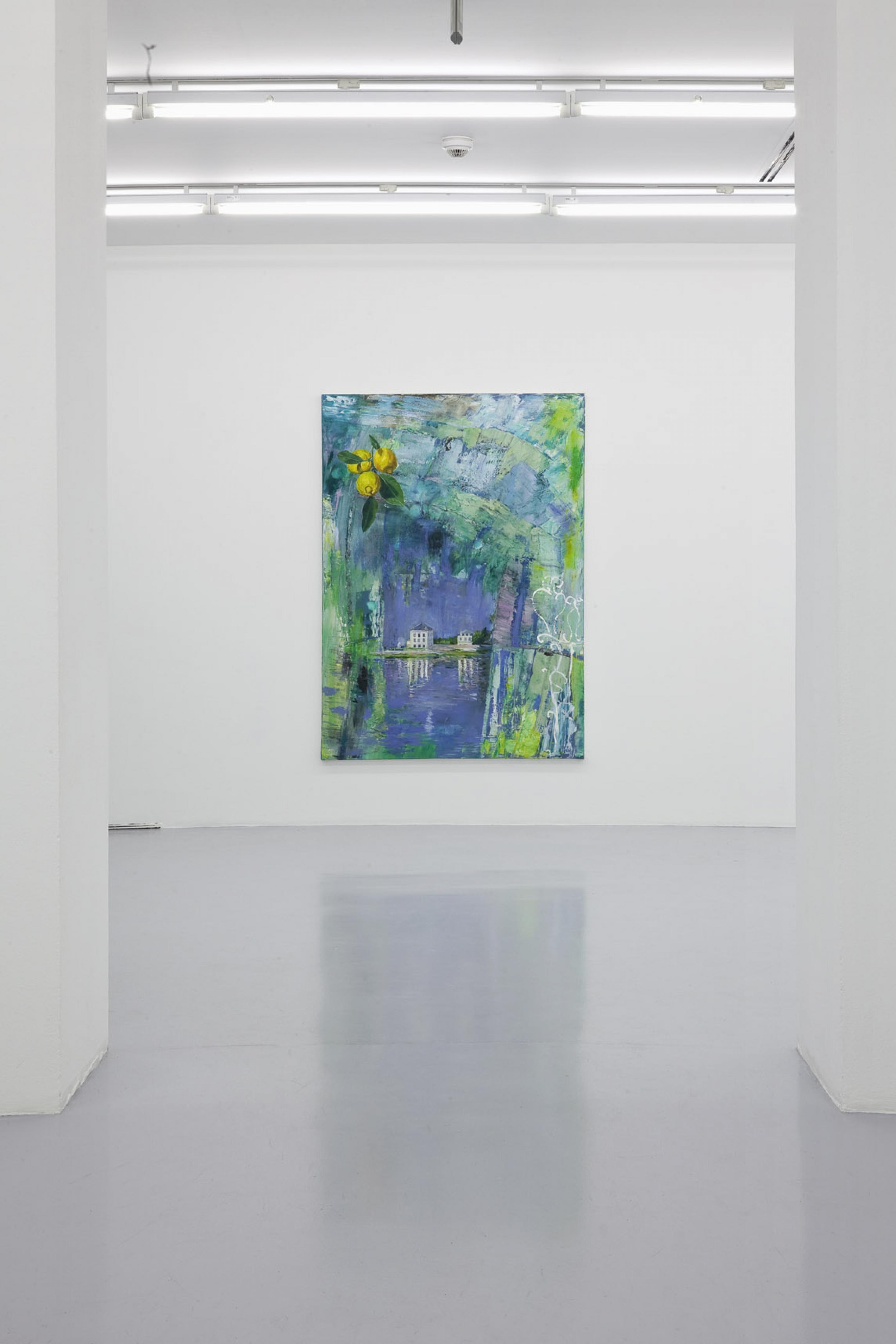 The paintings on display are large canvases depicting still life, floating boats, indoor and outdoor scenes, where abstraction and figuration are mixed in an original manner, associating biomorphic shapes to fluid and organic areas of colour and more recognisable objects. Quite a few details of these works as flowers, lemons, landscapes are taken from ancient paintings and put into a new space, in particular the paintings of Gustave Caillebotte appear quite a lot.