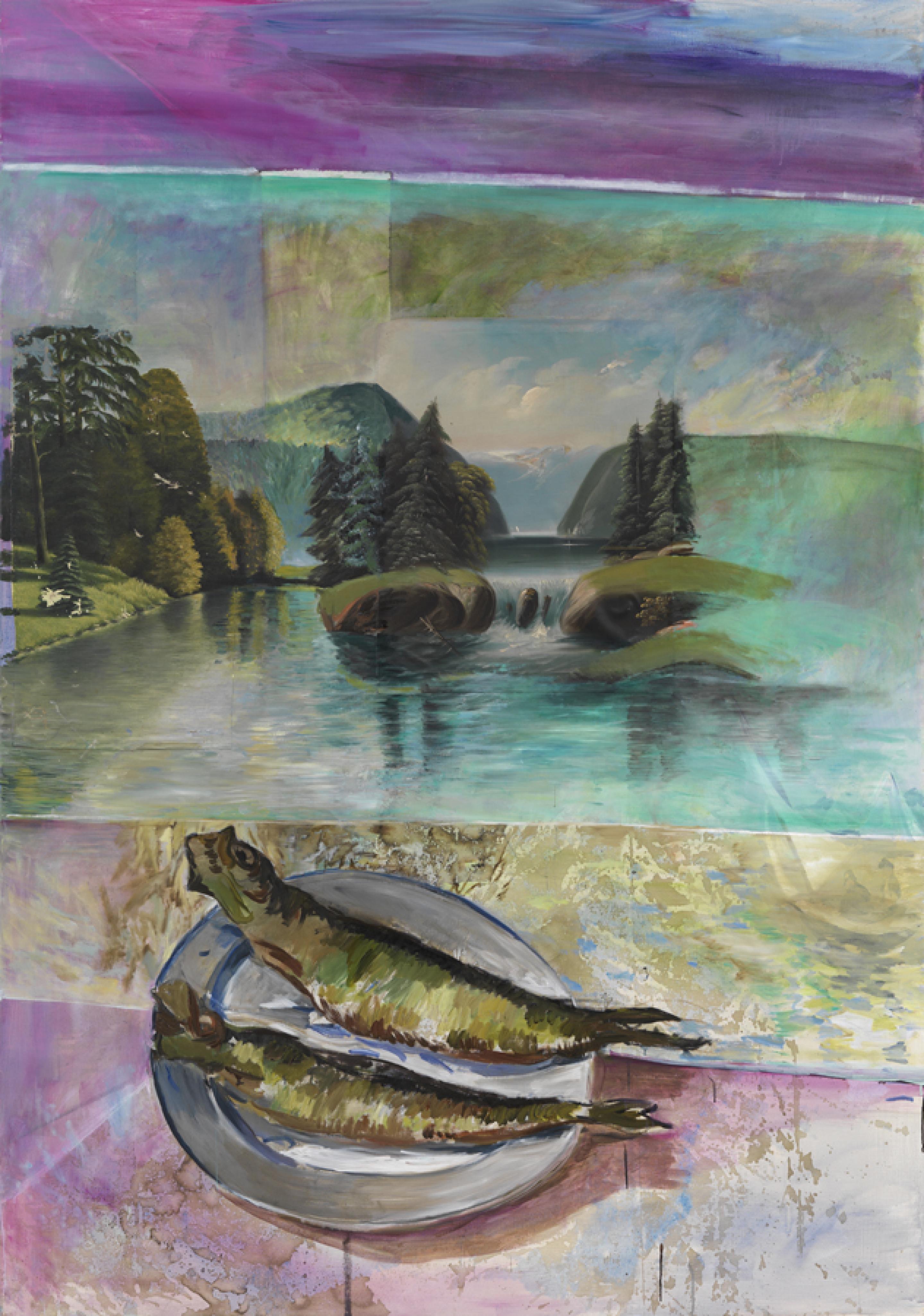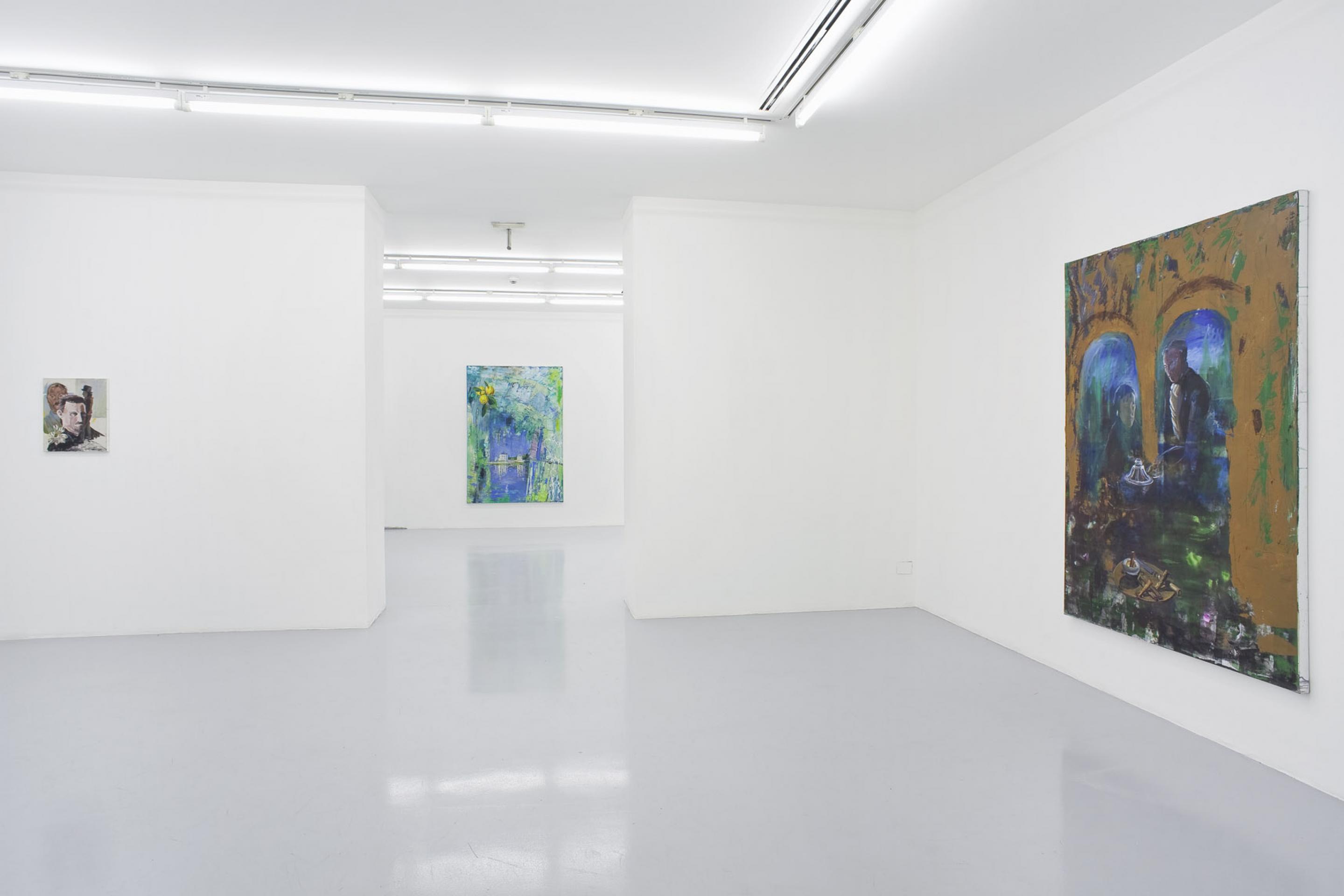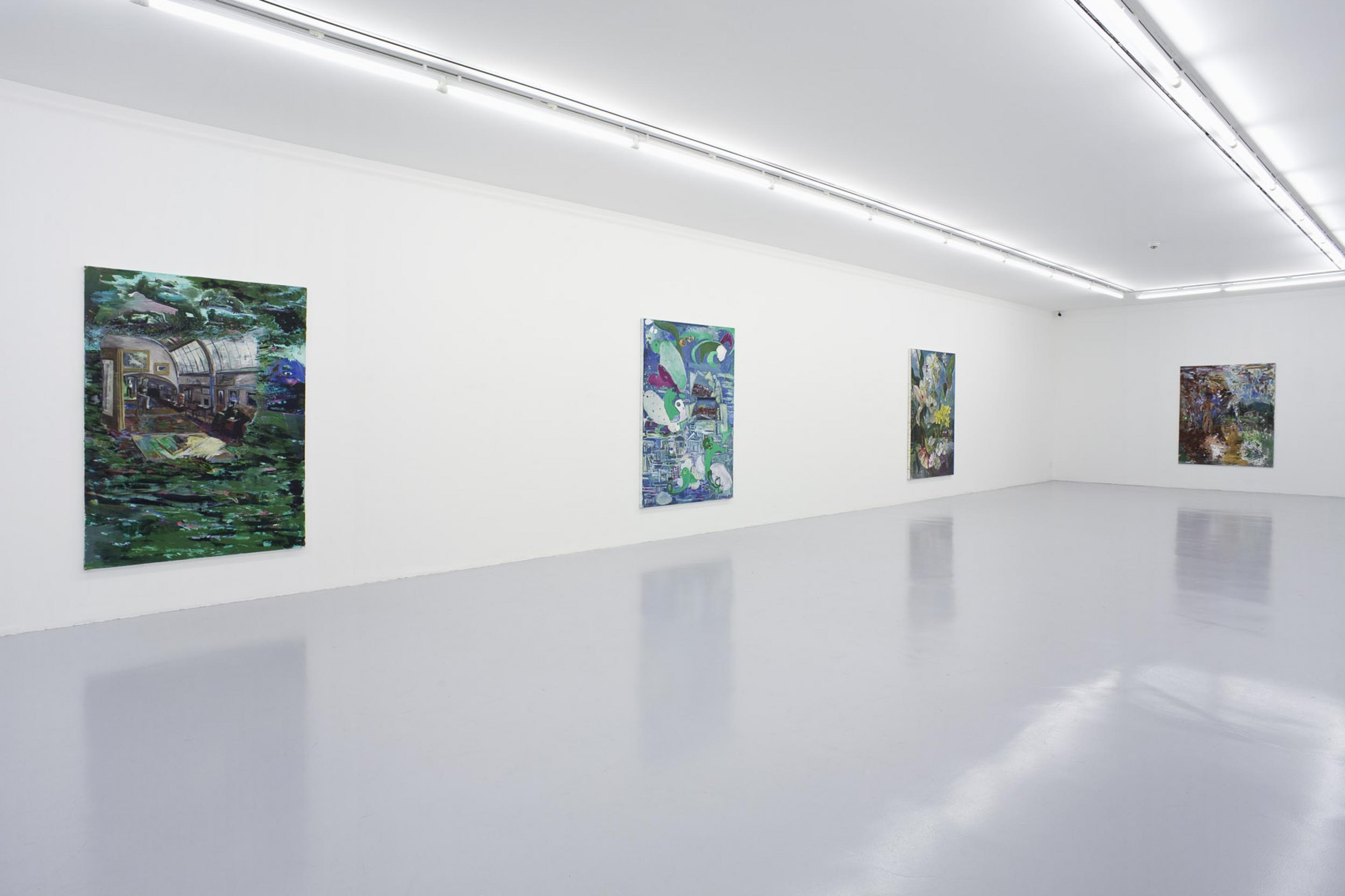 The paintings on display are large canvases depicting still life, floating boats, indoor and outdoor scenes, where abstraction and figuration are mixed in an original manner, associating biomorphic shapes to fluid and organic areas of colour and more recognisable objects. Quite a few details of these works as flowers, lemons, landscapes are taken from ancient paintings and put into a new space, in particular the paintings of Gustave Caillebotte appear quite a lot.