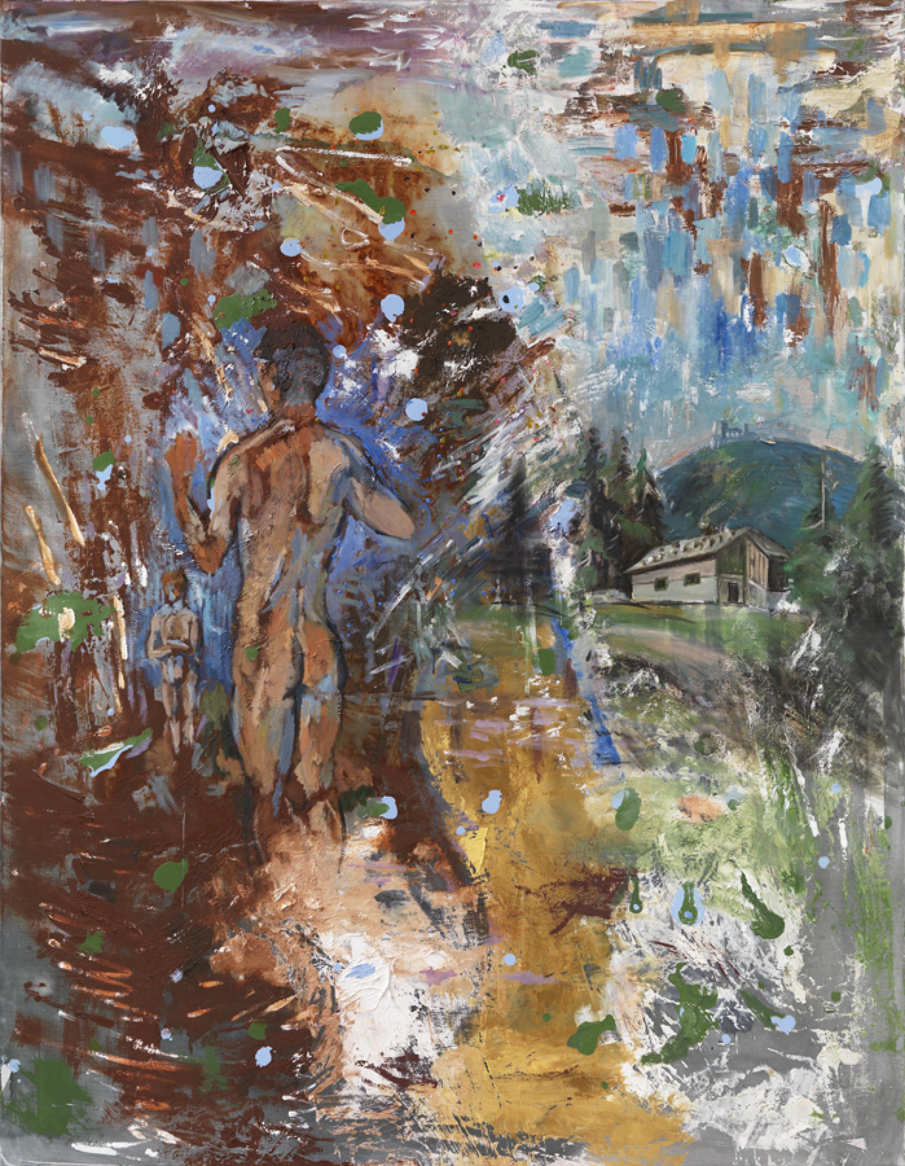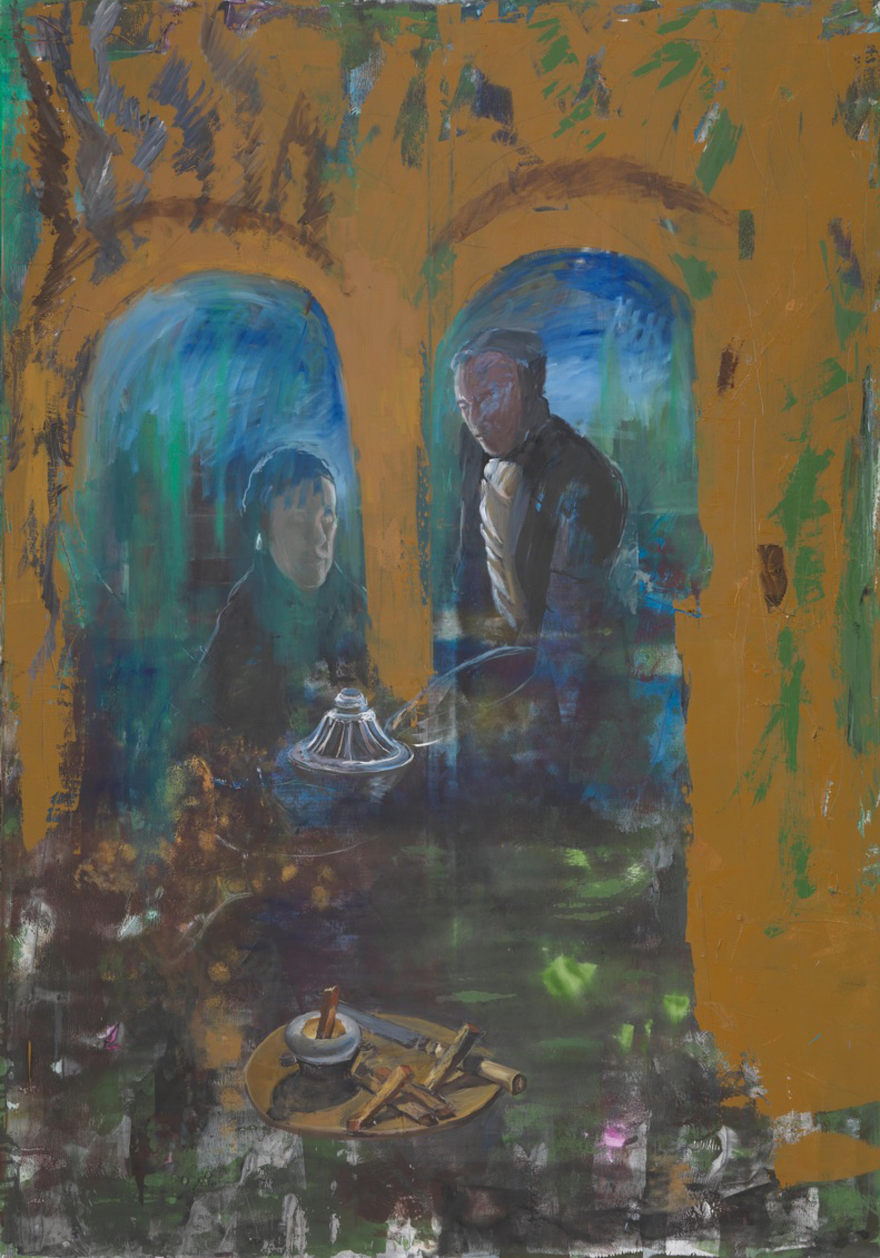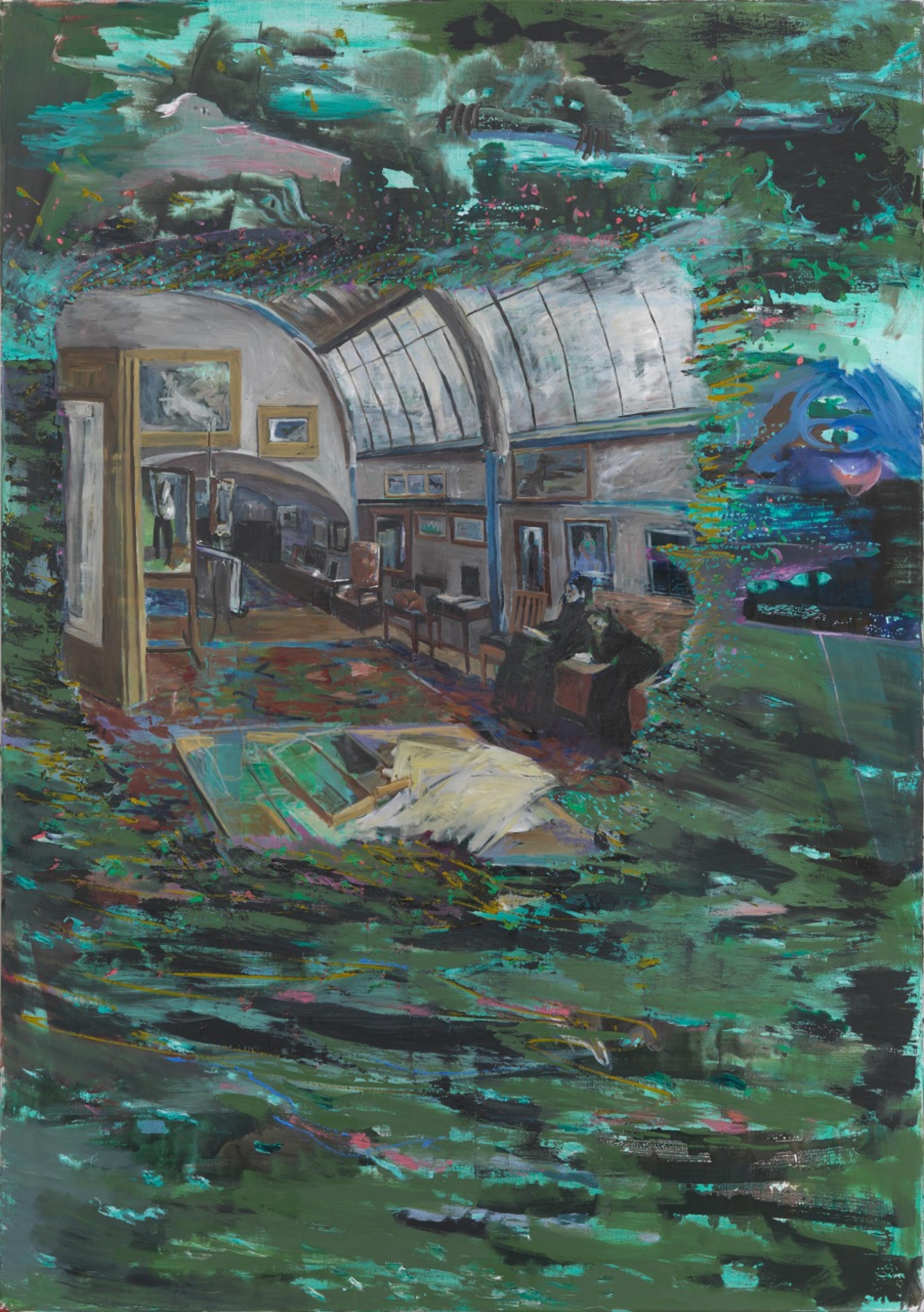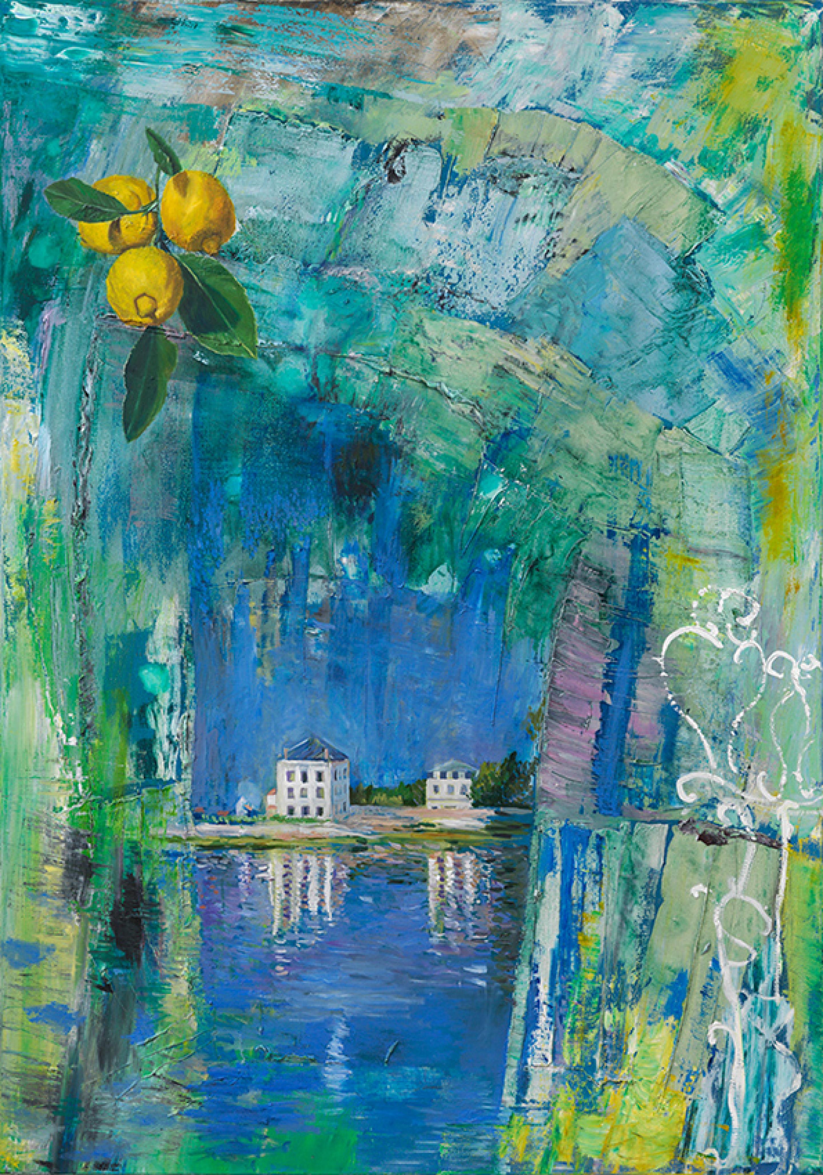 The paintings on display are large canvases depicting still life, floating boats, indoor and outdoor scenes, where abstraction and figuration are mixed in an original manner, associating biomorphic shapes to fluid and organic areas of colour and more recognisable objects. Quite a few details of these works as flowers, lemons, landscapes are taken from ancient paintings and put into a new space, in particular the paintings of Gustave Caillebotte appear quite a lot.