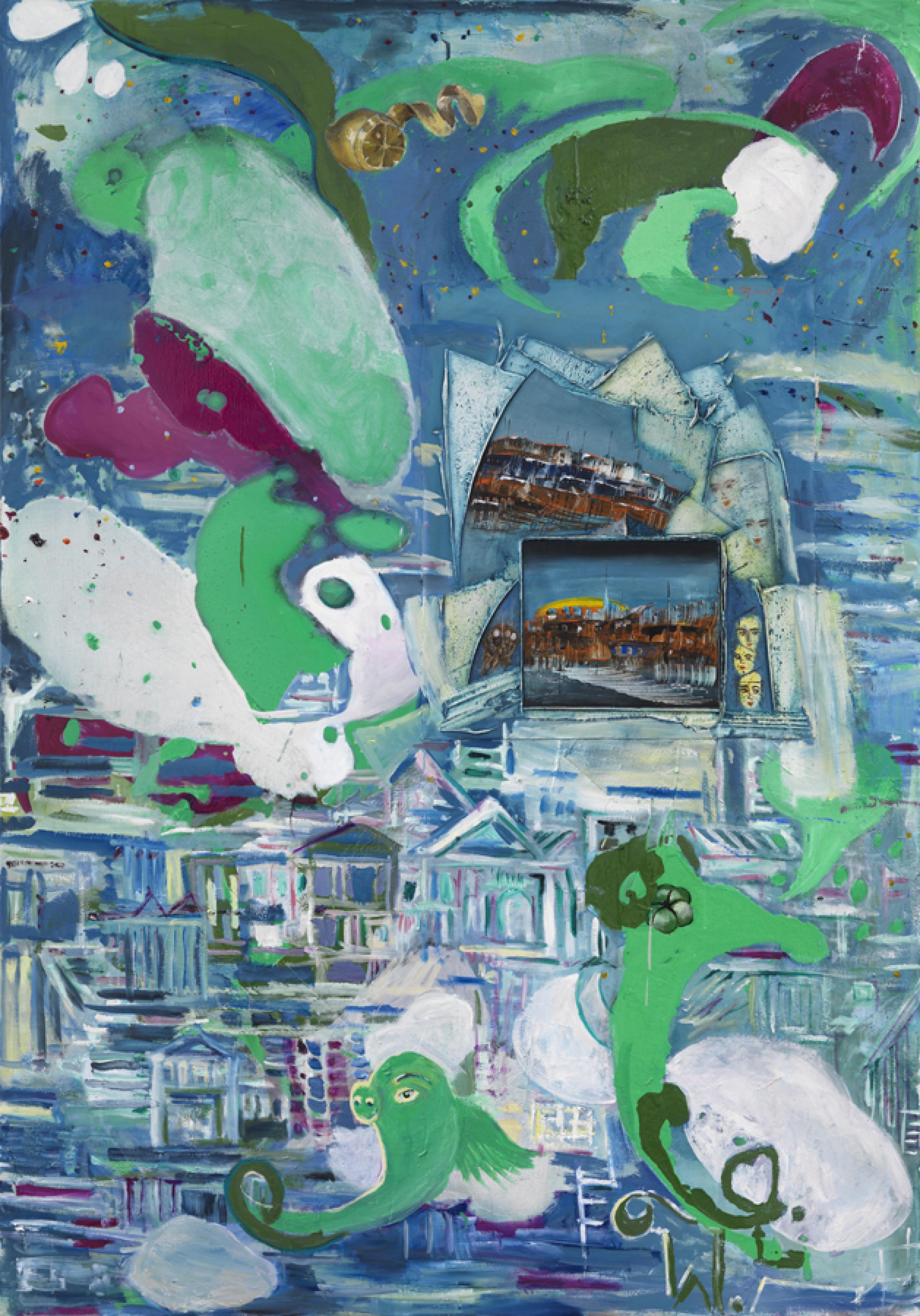 Le tele esposte, di grandi dimensioni, raffigurano nature morte, barche galleggianti, scene di interni ed esterni, dove astrazione e figurazione si alternano in maniera originale, accostando forme biomorfe, aree di colore fluide e oggetti più riconoscibili. Alcuni di questi dettagli, come i fiori, i limoni, i paesaggi sono ripresi da opere antiche, e inseriti quindi in un nuovo contesto, in particolare sono presenti molte scene dei dipinti di Gustave Caillebotte.