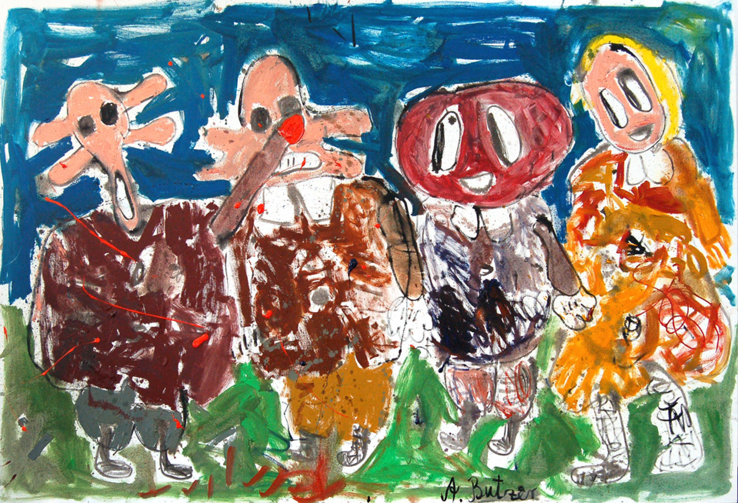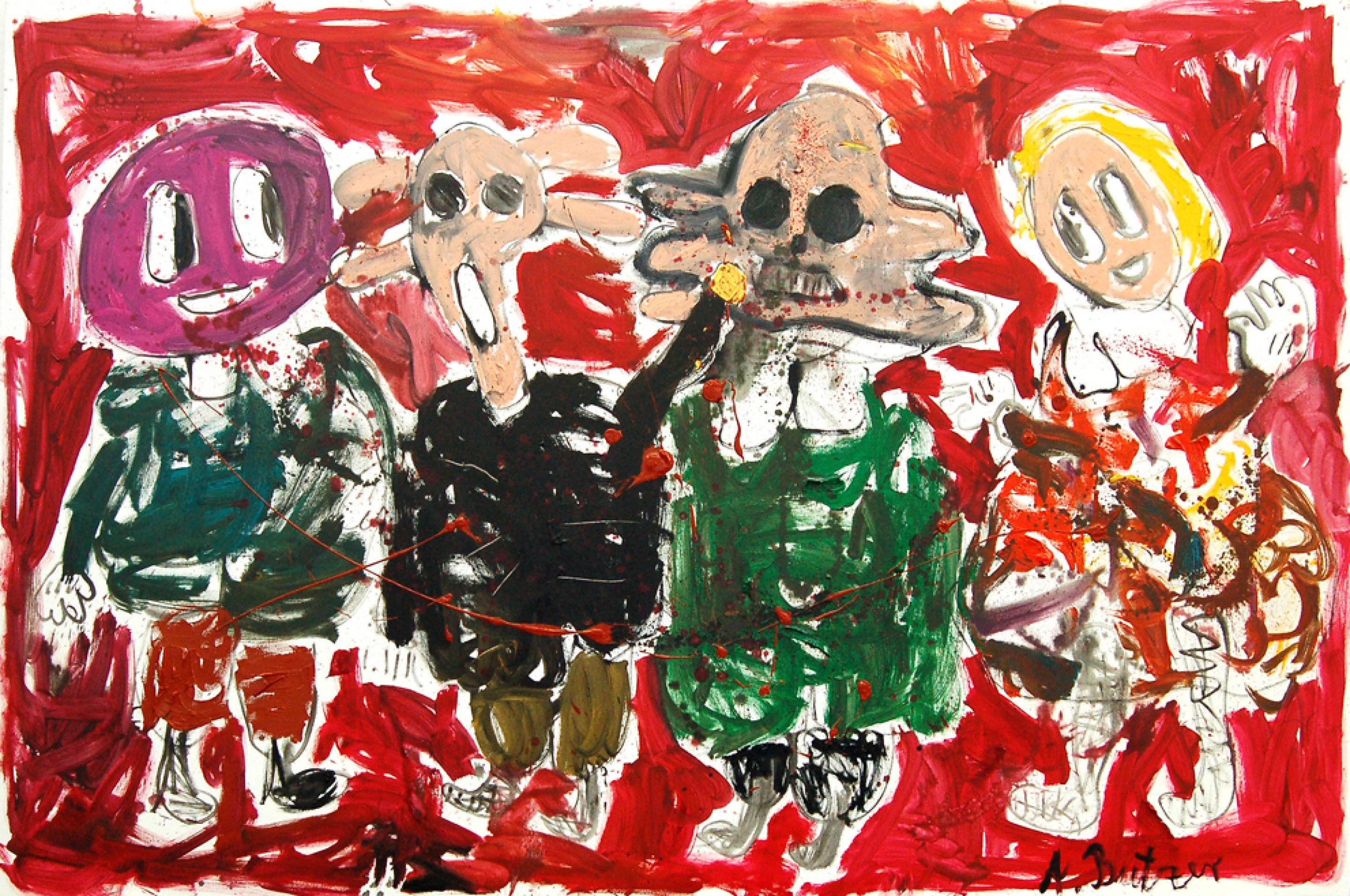 Violent expression, raw style, no artistical training: André Butzer seems to slightly recall the bigs of Outsider Art. Yet he rejects the concept as meaningless stigmatization, instead confronts the mass culture simulating the industrial production, plays the card of seriality against the apparent spontaneousness and originality of Expressionism. André Butzer talks only about ideas associated with Art Brut, defining 'Fine Art' his work characterized by colours laid in coarse manner and by an expressionist violence set free through colour.