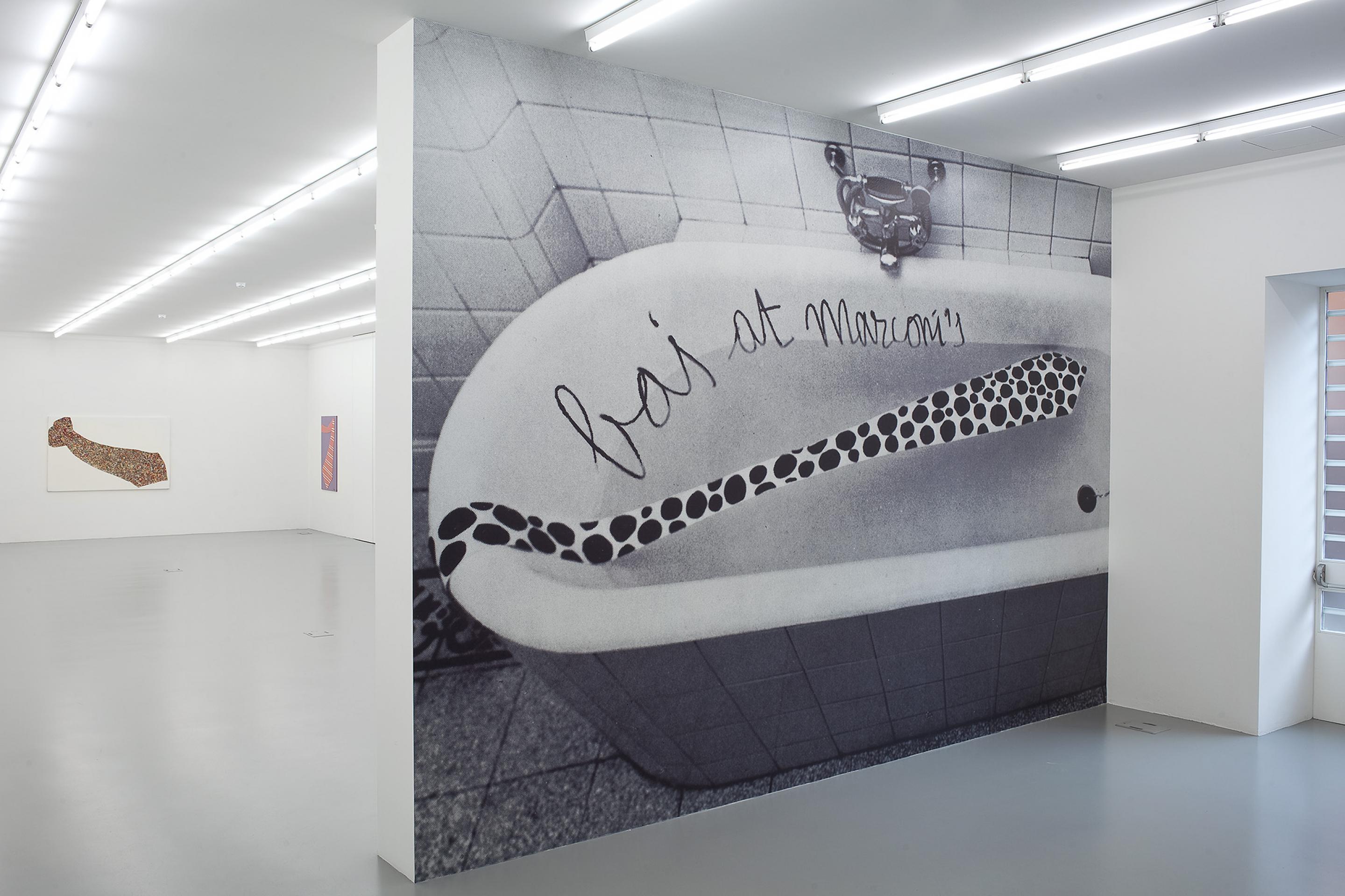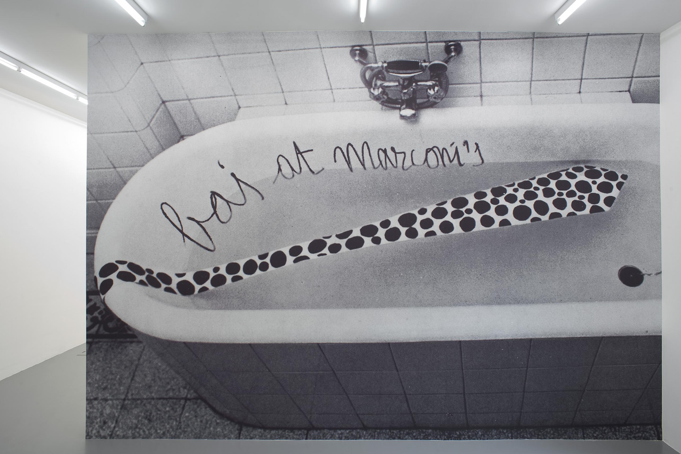 This already becomes apparent in the show’s anteroom which welcomes the visitor with an over life-size photograph of the advertisement of the 1969 exhibition at the Studio Marconi that shows a bathtub with a long floating dotted black and white necktie.