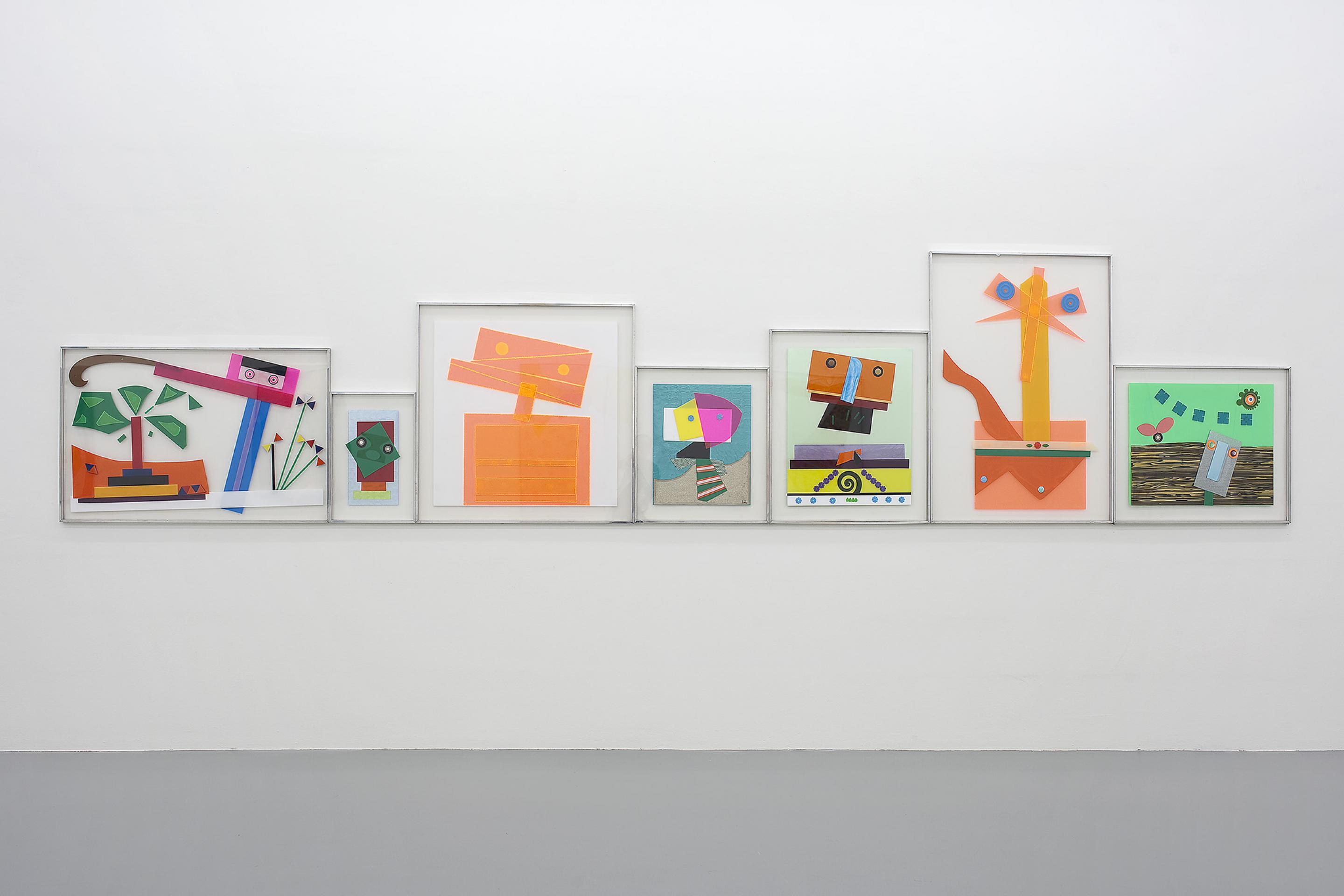 A group of bright and cheerful portraits adorned with flowery details and colourful buttons is being shown. Each of these works is composed of differently coloured sheets of plexiglass overlapping each other and thereby creating different shades and nuances of coulours.