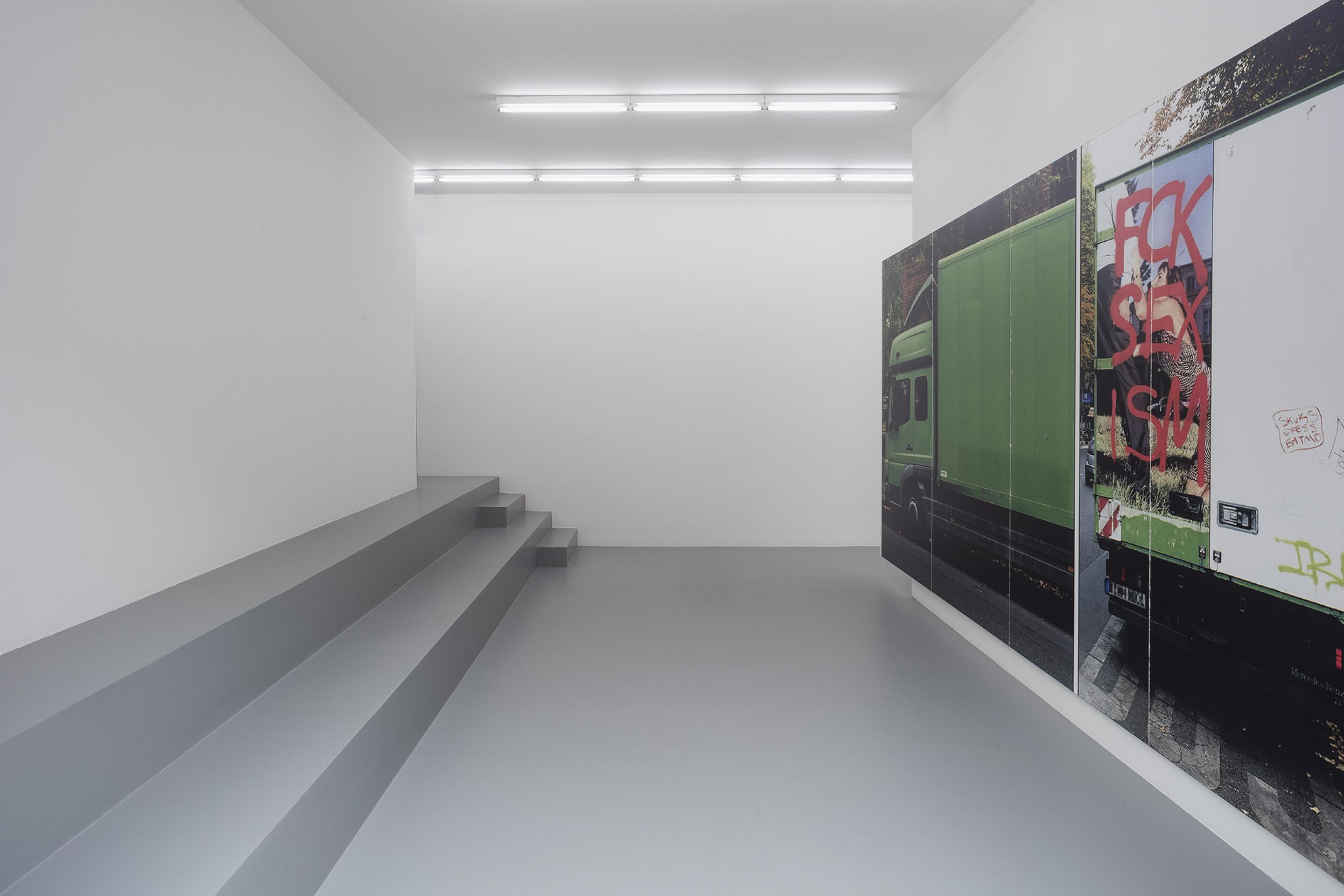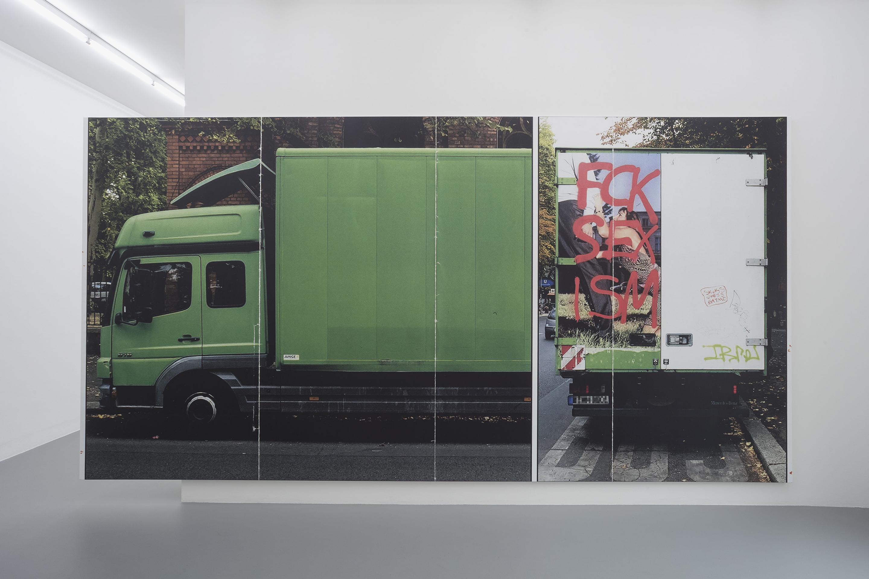 Una vocale è ingerita per comporre ‘FCK SEX ISM’. Scritta a spray sull'immagine di una donna colta nell'atto di elemosinare un paio di gambe indifferenti, è un atto del più onesto detournement che regge una forte somiglianza con i primi Adbusters almeno quanto i caratteri tipografici ricordano Christopher Wool. Ripresentato come una grande stampa a pigmenti su tela, presenta un altra stratificazione di codici che riconosciamo dal recente processo pittorico. Nonostante un minimo effetto di distanziamento, la sua secca e decisa affermazione è difficile da estirpare. Questa leggibilità fin troppo facile attira una cerchia sempre più stretta di relazioni, un insieme più insistente e immediato di significati che avvicina il dipinto a qualcosa come la lingua di tutti i giorni.