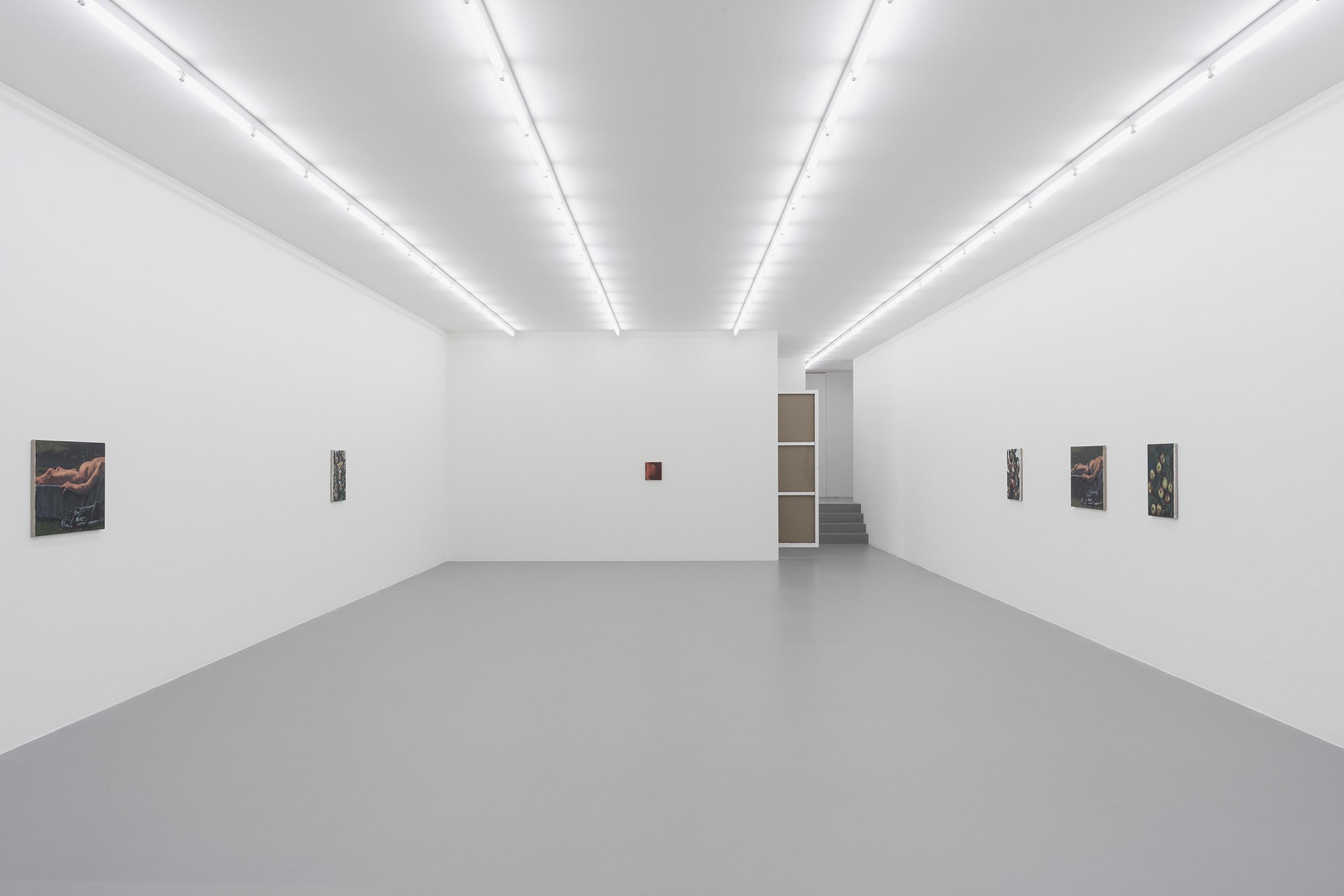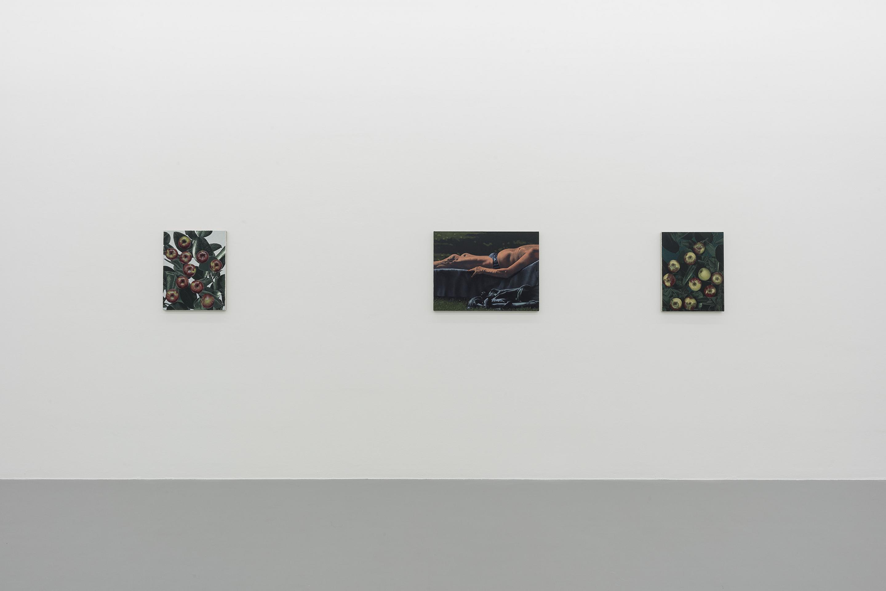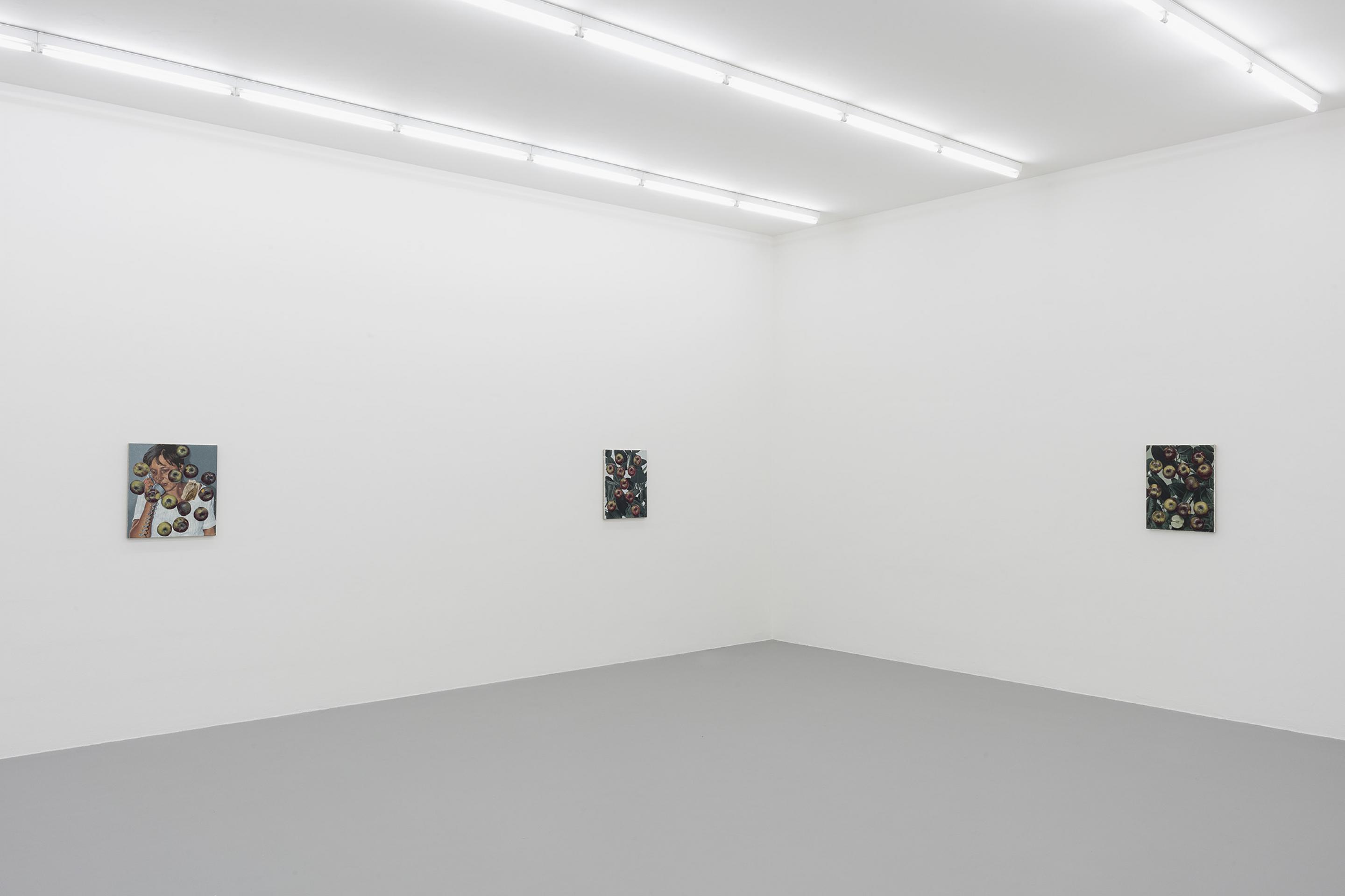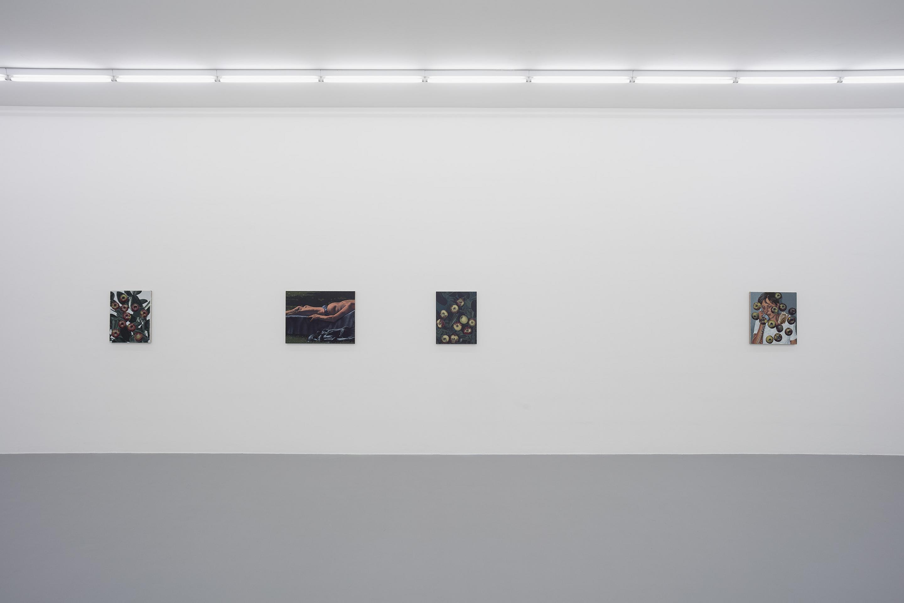 Like the dead metaphors that litter ordinary language (the body of an essay, the face of the clock), painting has metabolised many corpses over time. Plants, bread, nudes and apples in these paintings connote a generalised sense of art history and the language of painting as much as they refer to the objects themselves. A painting of an apple, laden with allegory, is so well-worn a trope that it seems an unrealizable ideal that it could transcend its status as an ur-signifier and be assigned this or that particular meaning. Instead, it is recognisable to us as a metaphor of metaphoric meaning, something that signifies its own power of signification. These tautologies suggest overlaps, imbricated layers of meaning obscuring the one beneath - or they could be circuits that keep returning us to point A.