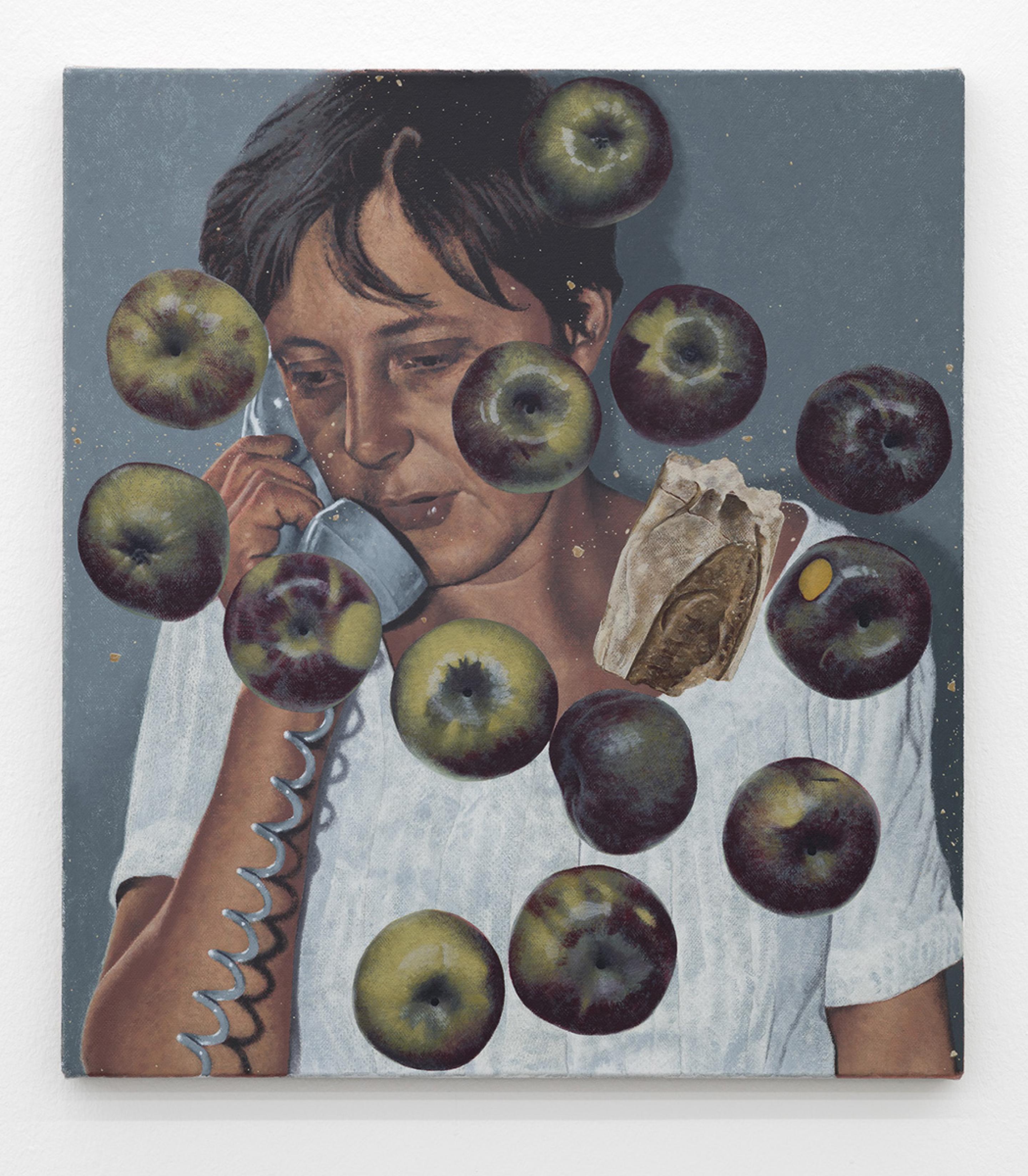 Una giovane Merkel dell'era della RDT complica le cose - ma questa è un'articolata tipologia di realismo - e mi viene ora in mente quanto il centrismo europeo sia anacronistico, proprio come la cornetta del telefono che tiene in mano, quanto tempo fa è stato il ventesimo secolo, e poi andando ancora indietro - come le immagini perdono la loro particolarità nel corso del tempo, e come la pittura placa questo processo, facendo emergere le generalità e le ambiguità dei suoi soggetti. Lo spargimento aleatorio di mele e pane suggerisce che la sua immagine (non il suo ritratto) è appiattita, un simbolo di brevità in questa vanitas.