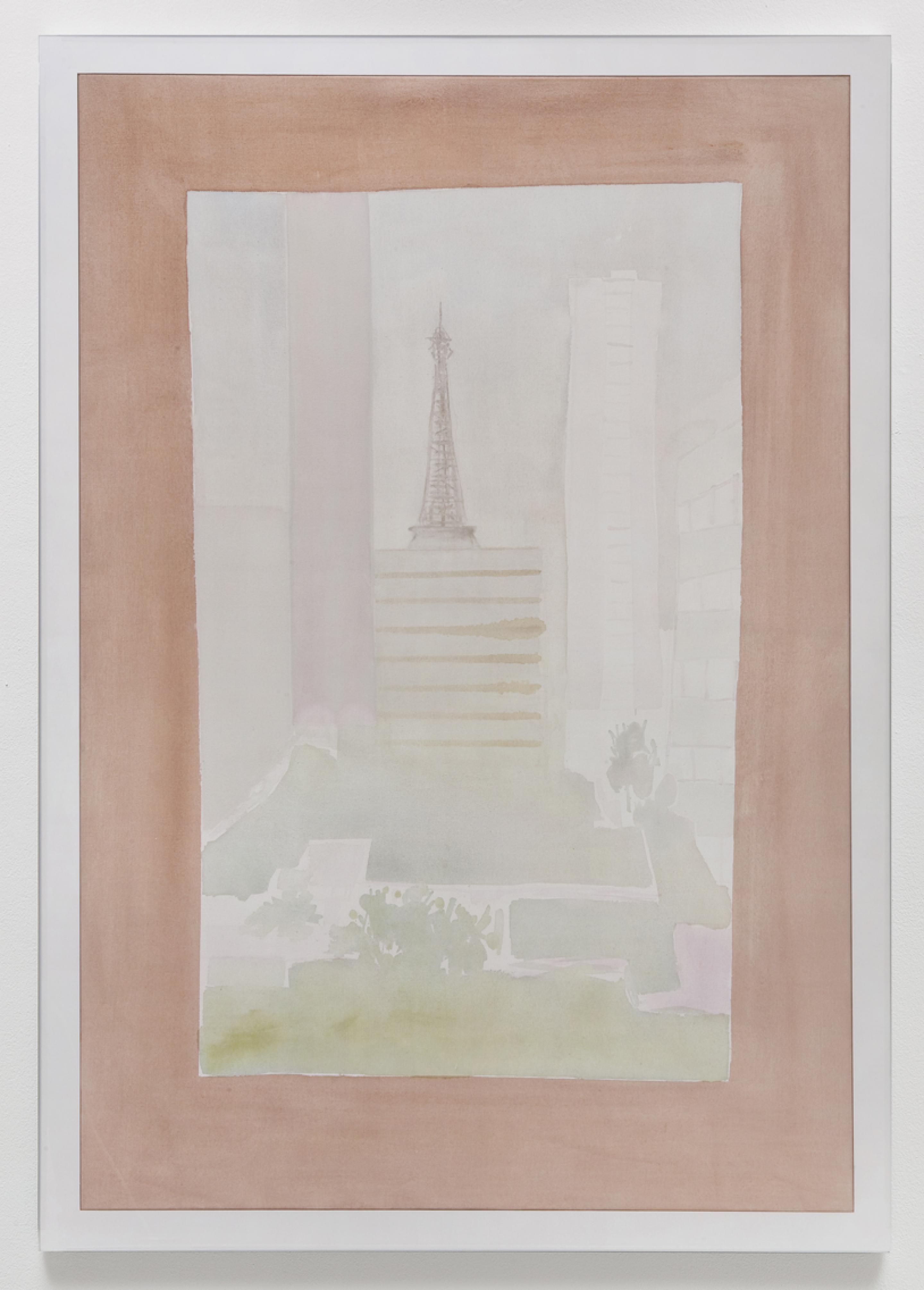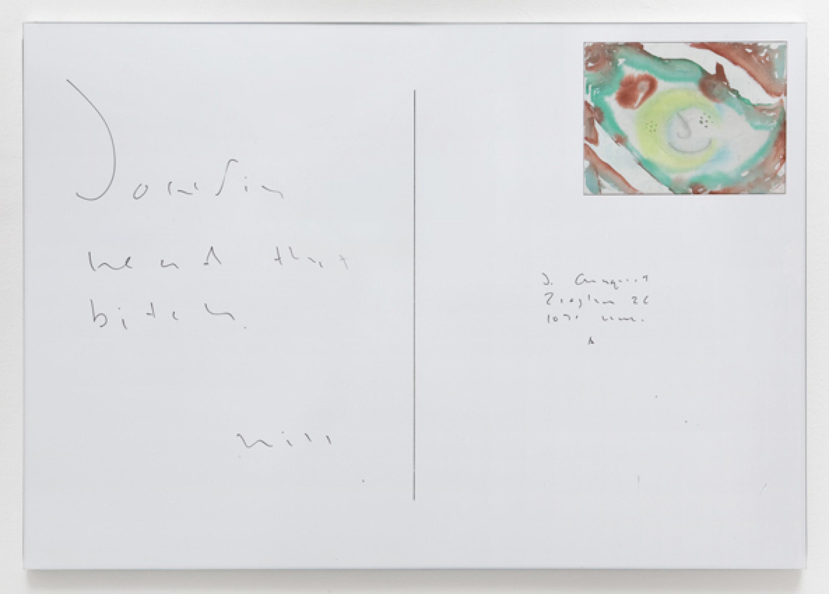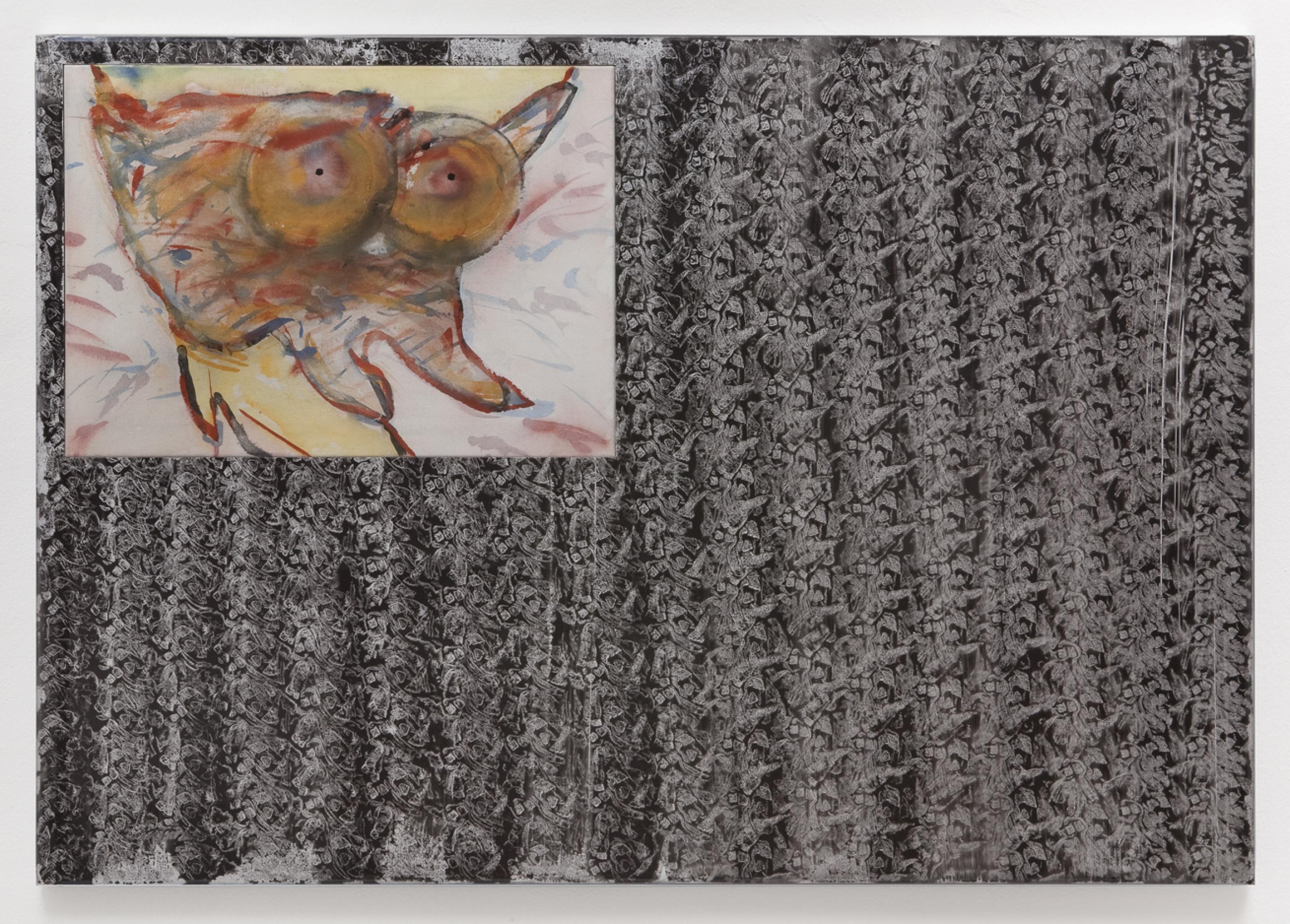 Il brusio delle cose, i luoghi, i cibi e le persone sono fossilizzati in lucidi passepartout di foamcore abbondantemente dipinti, congelando la tristezza del turista e del pubblico (la stessa cosa) in una lieve miscela ipomaniacale di euphoria e irritabilità. Congelati insieme a tutto e tutti, all’interno di questi passepartout ci sono dipinti su tela che raffigurano un nazionalismo di seni e peni che vende cibo al ristorante, biglietti aerei per località esotiche, muri o francobolli.