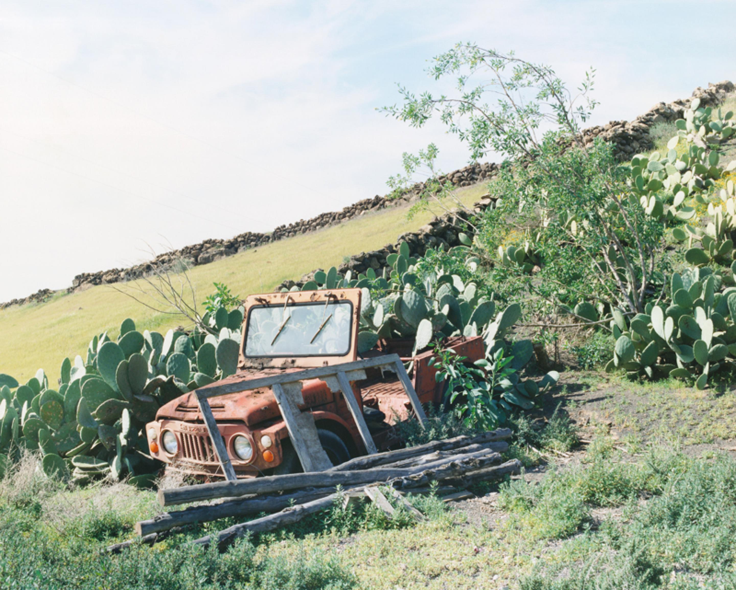 Kelm discovers a lot of her objects in passing by, be it a forgotten dice or a rusty jeep. But the photos do not come into being while walking by but in a long and time consuming process. They are taken with an analogous large-format camera and then each hand proof is individually worked on.