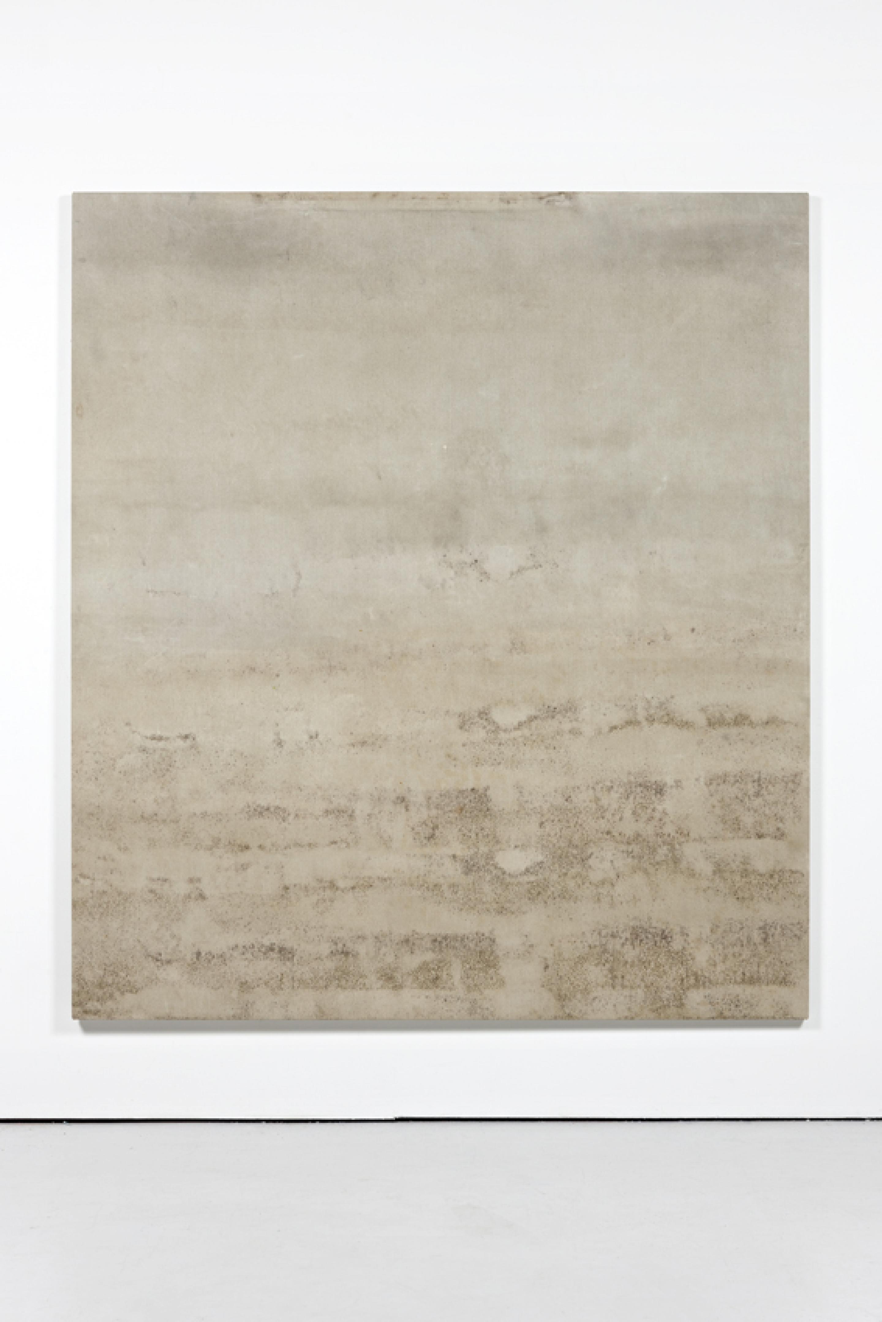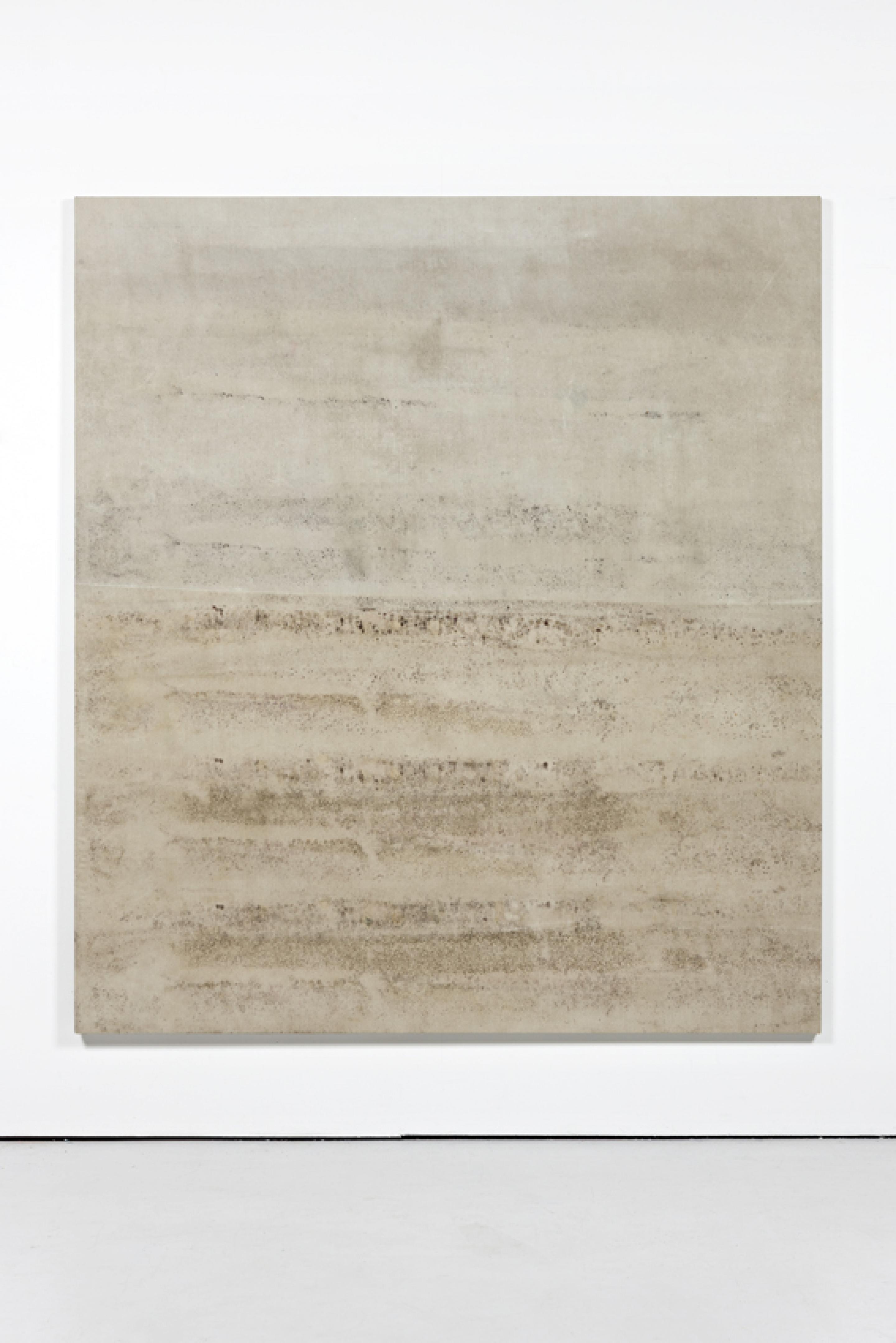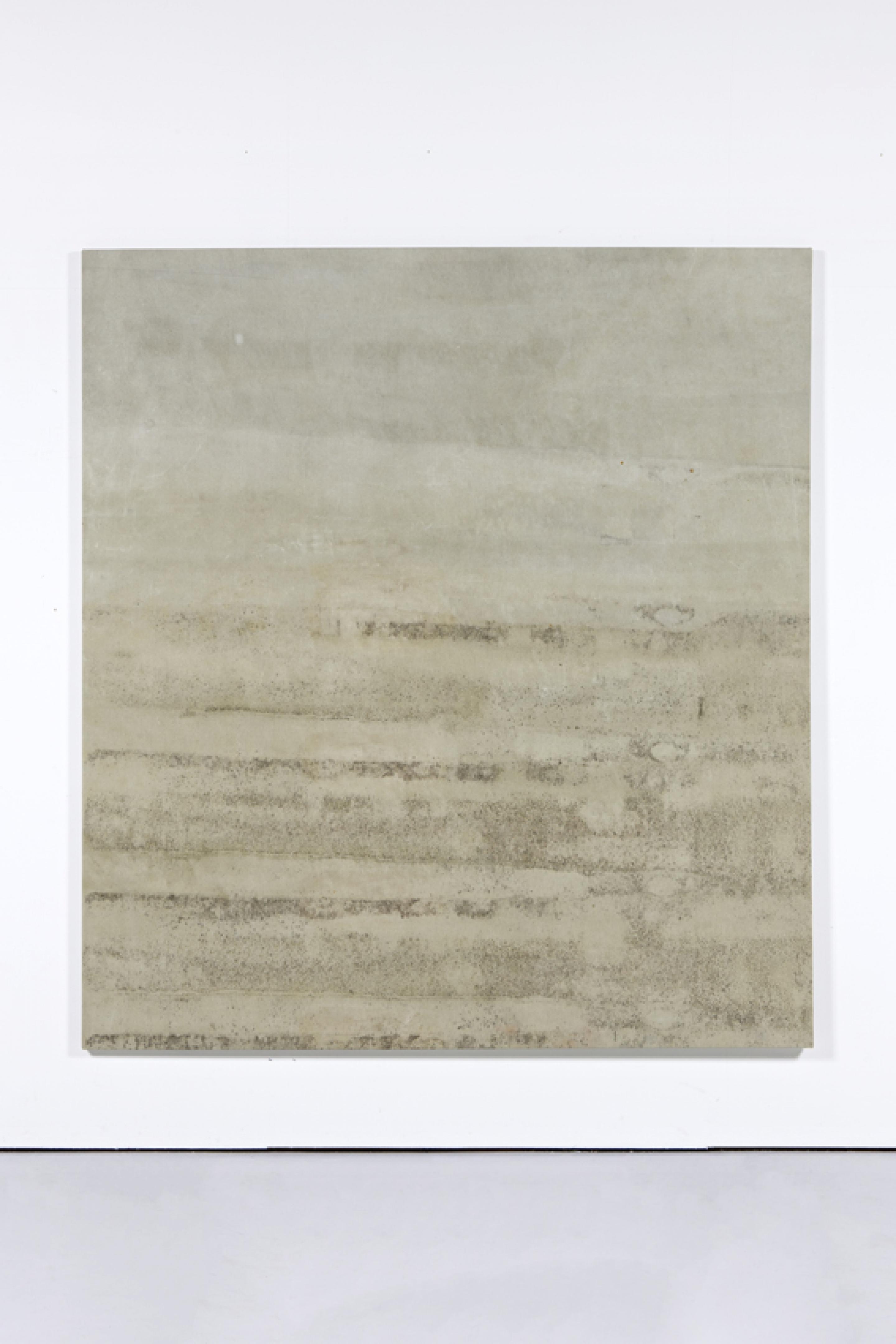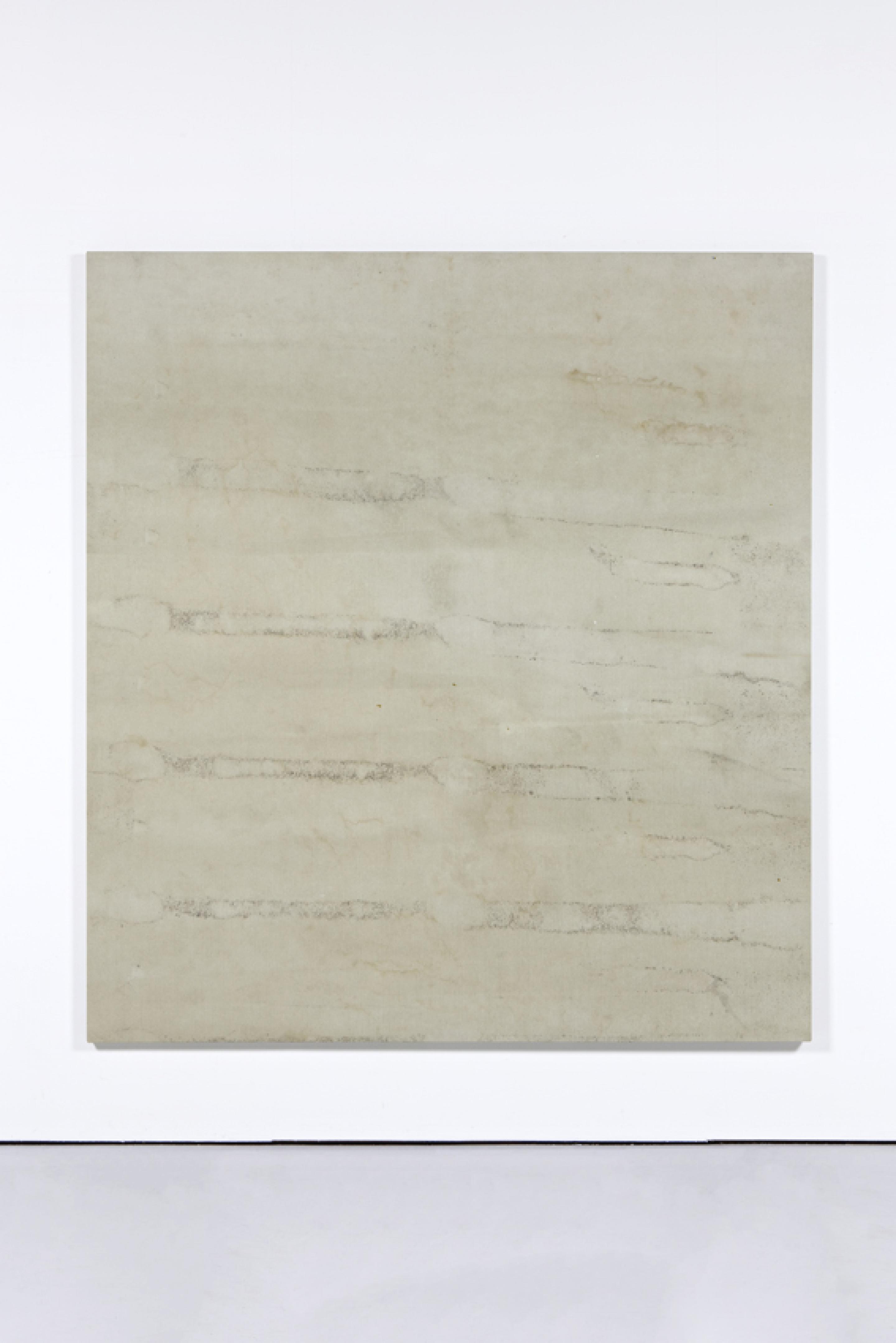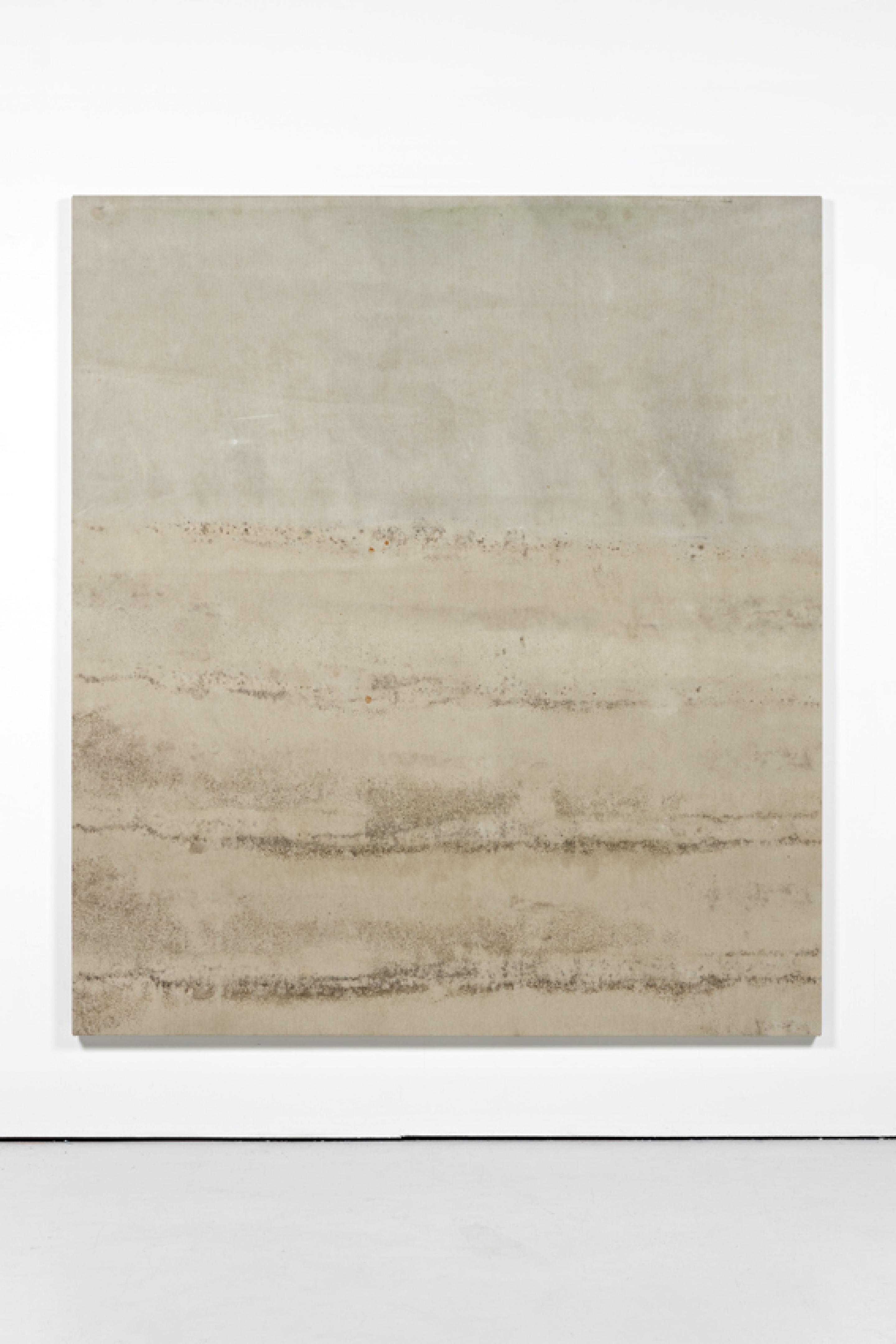 Untreated canvases have been prepared with primer mixed with pigment, left outside the artist’s studio to dry, then tightly rolled around plastic tubes to be left outdoors for almost twelve months. After a year of wear and tear, from all four seasons of the ever changing Norwegian weather, the canvases are un-rolled and more or less severe attacks of mildew are to be found on the top side of the canvas. Because of the folding technique, repetitive, yet unique, patterns of mildew and primer/pigment now become visible. The canvases are then subjected to a thorough wash with fungicides and then finally left to dry, both indoors and outdoors, throughout the winter. In addition to the potentially aversive associations due to the unpleasant rot of the mildew, the fact that the canvases have been processed with a patient methodology that in fact is reminiscent of the way one treats both meat and fish (Norwegian specialities like gravlax and rakfish (fermented fish) come to mind) the “mildew paintings” at display in Choppy Times carry with them a sense of base matter, decomposition, abject dirt, and even death. Perhaps even more so than in the earlier Værslev series like the paintings evoking the (now obsolete to “good taste”) Venetian terrazzo, the ones engaging and exhausting the tattered canopy, and his “garden paintings.” The latter would perhaps be the closest sibling to the newest addition to the family. That being said, these new paintings at display are also a deepened continuation of the monochrome “canopies” of the last few years. Albeit at a remove from the functionality and architectural sociality of the canopy.