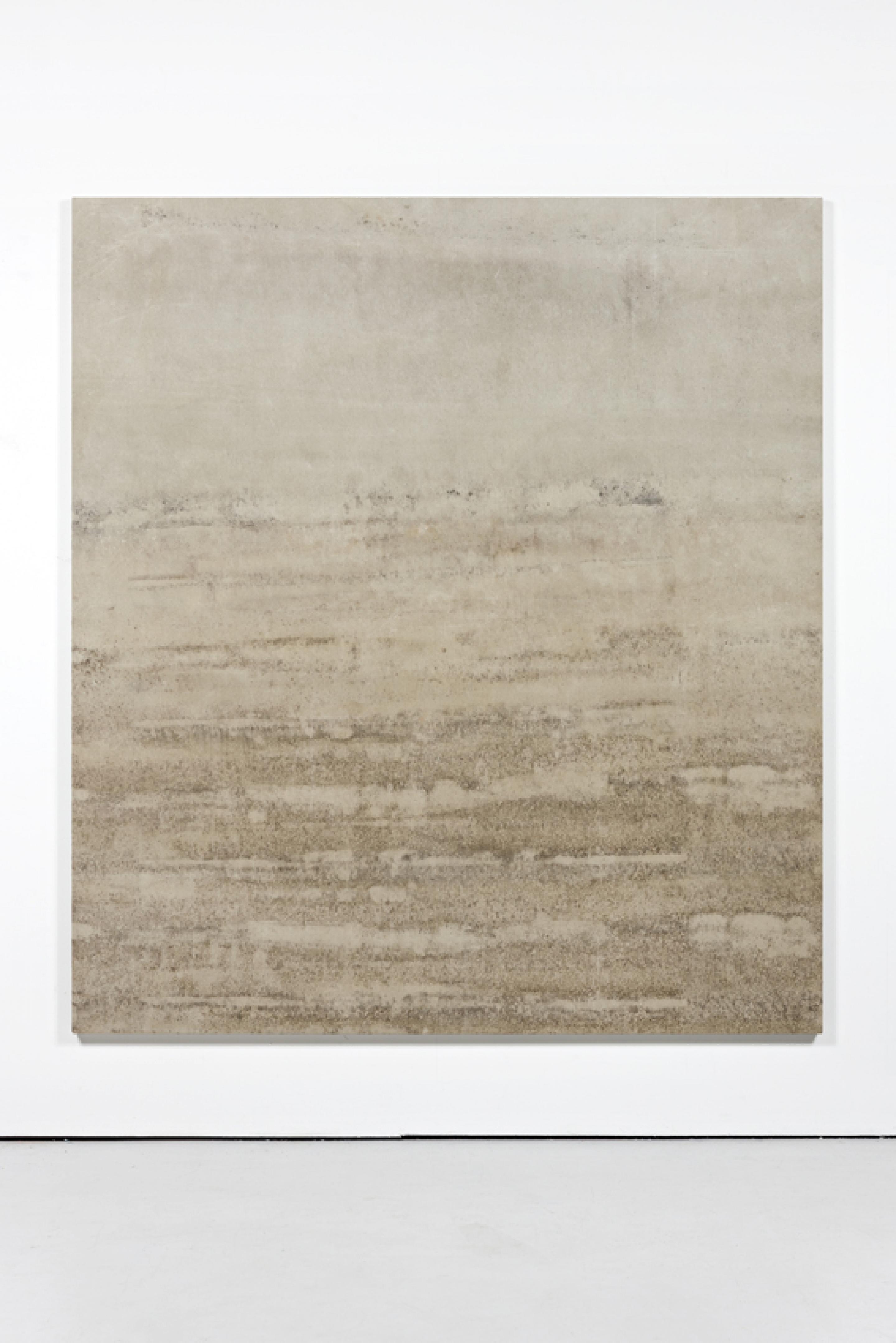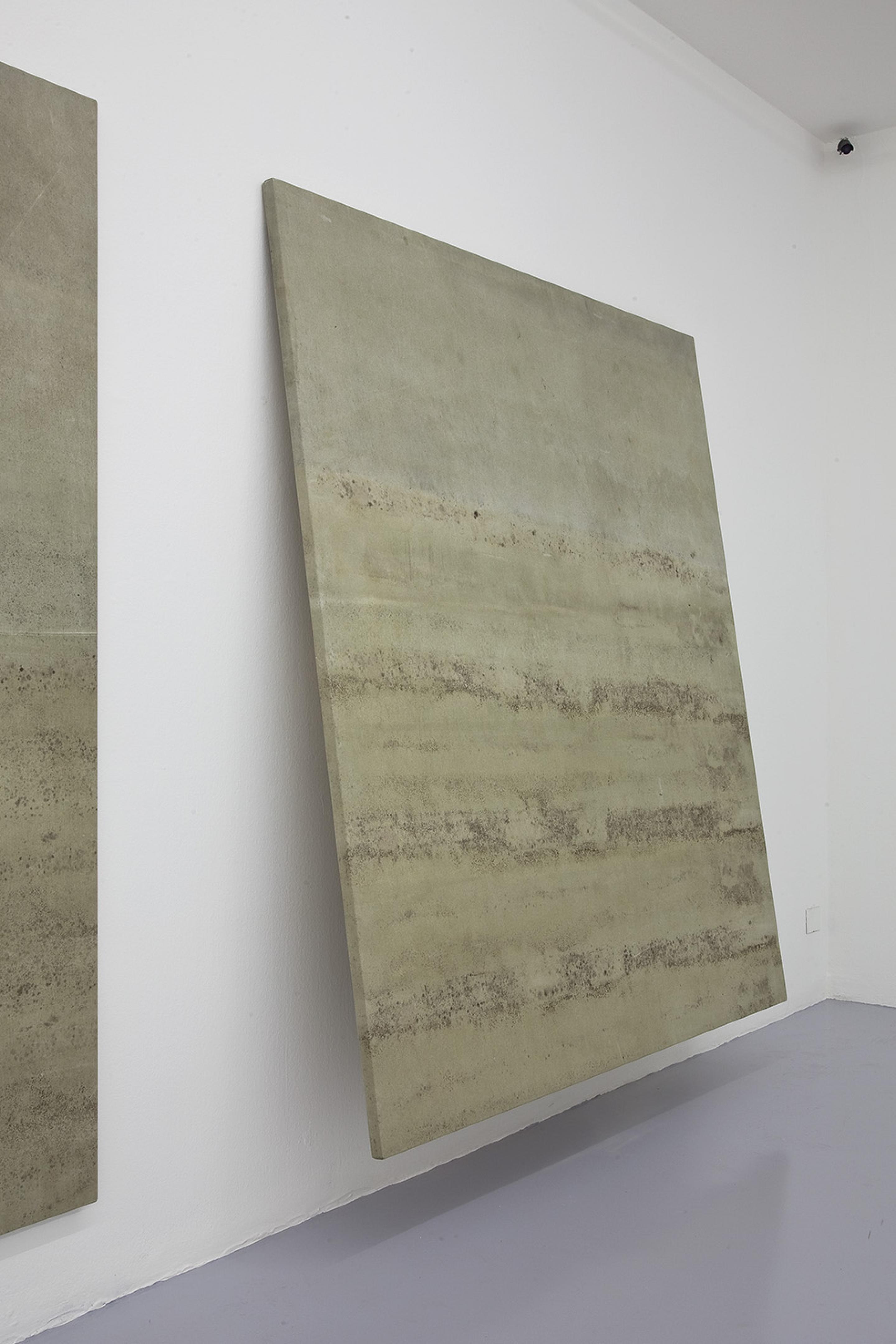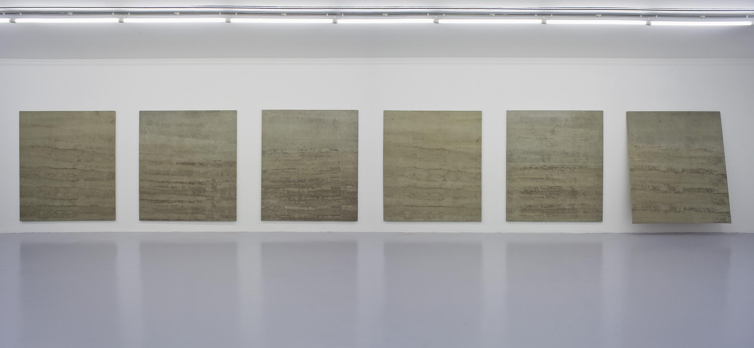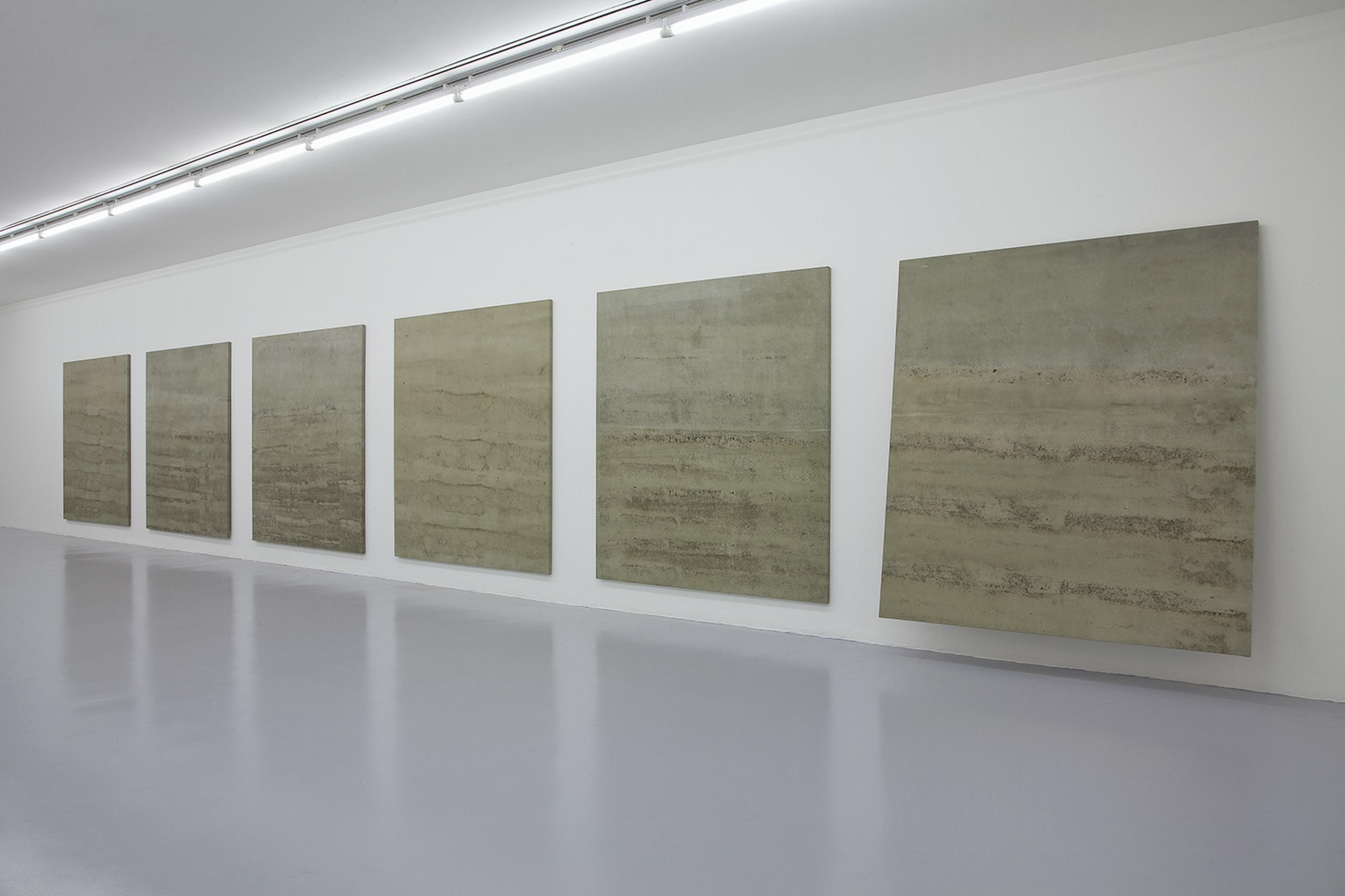 Untreated canvases have been prepared with primer mixed with pigment, left outside the artist’s studio to dry, then tightly rolled around plastic tubes to be left outdoors for almost twelve months. After a year of wear and tear, from all four seasons of the ever changing Norwegian weather, the canvases are un-rolled and more or less severe attacks of mildew are to be found on the top side of the canvas. Because of the folding technique, repetitive, yet unique, patterns of mildew and primer/pigment now become visible. The canvases are then subjected to a thorough wash with fungicides and then finally left to dry, both indoors and outdoors, throughout the winter. In addition to the potentially aversive associations due to the unpleasant rot of the mildew, the fact that the canvases have been processed with a patient methodology that in fact is reminiscent of the way one treats both meat and fish (Norwegian specialities like gravlax and rakfish (fermented fish) come to mind) the “mildew paintings” at display in Choppy Times carry with them a sense of base matter, decomposition, abject dirt, and even death. Perhaps even more so than in the earlier Værslev series like the paintings evoking the (now obsolete to “good taste”) Venetian terrazzo, the ones engaging and exhausting the tattered canopy, and his “garden paintings.” The latter would perhaps be the closest sibling to the newest addition to the family. That being said, these new paintings at display are also a deepened continuation of the monochrome “canopies” of the last few years. Albeit at a remove from the functionality and architectural sociality of the canopy.