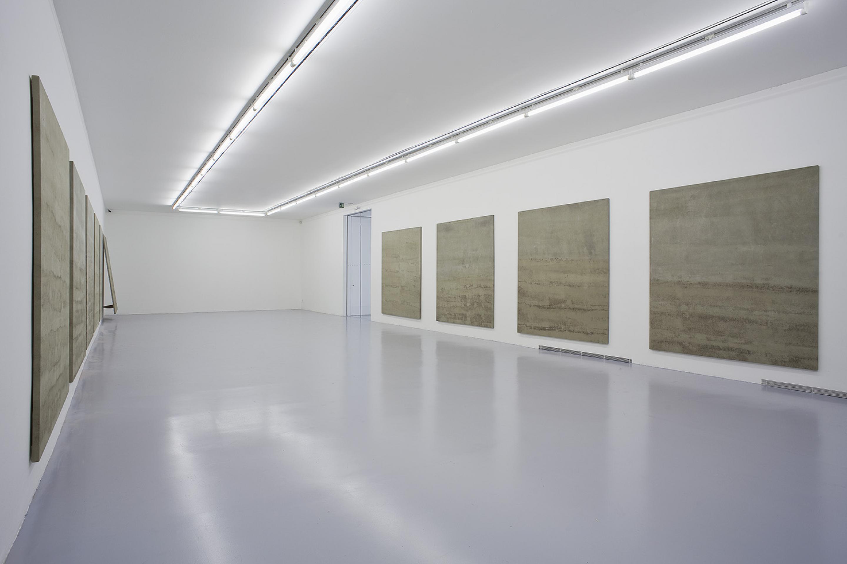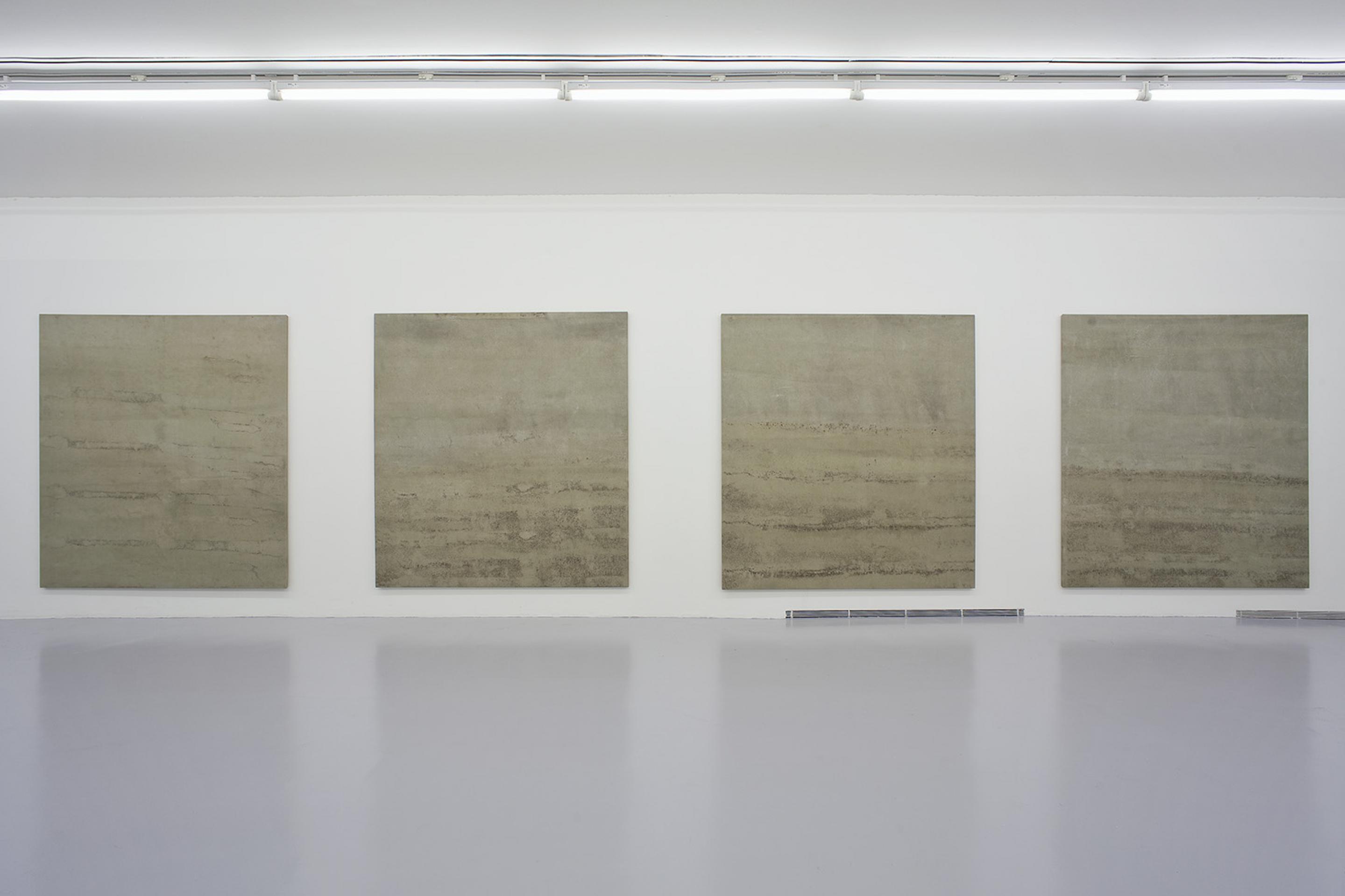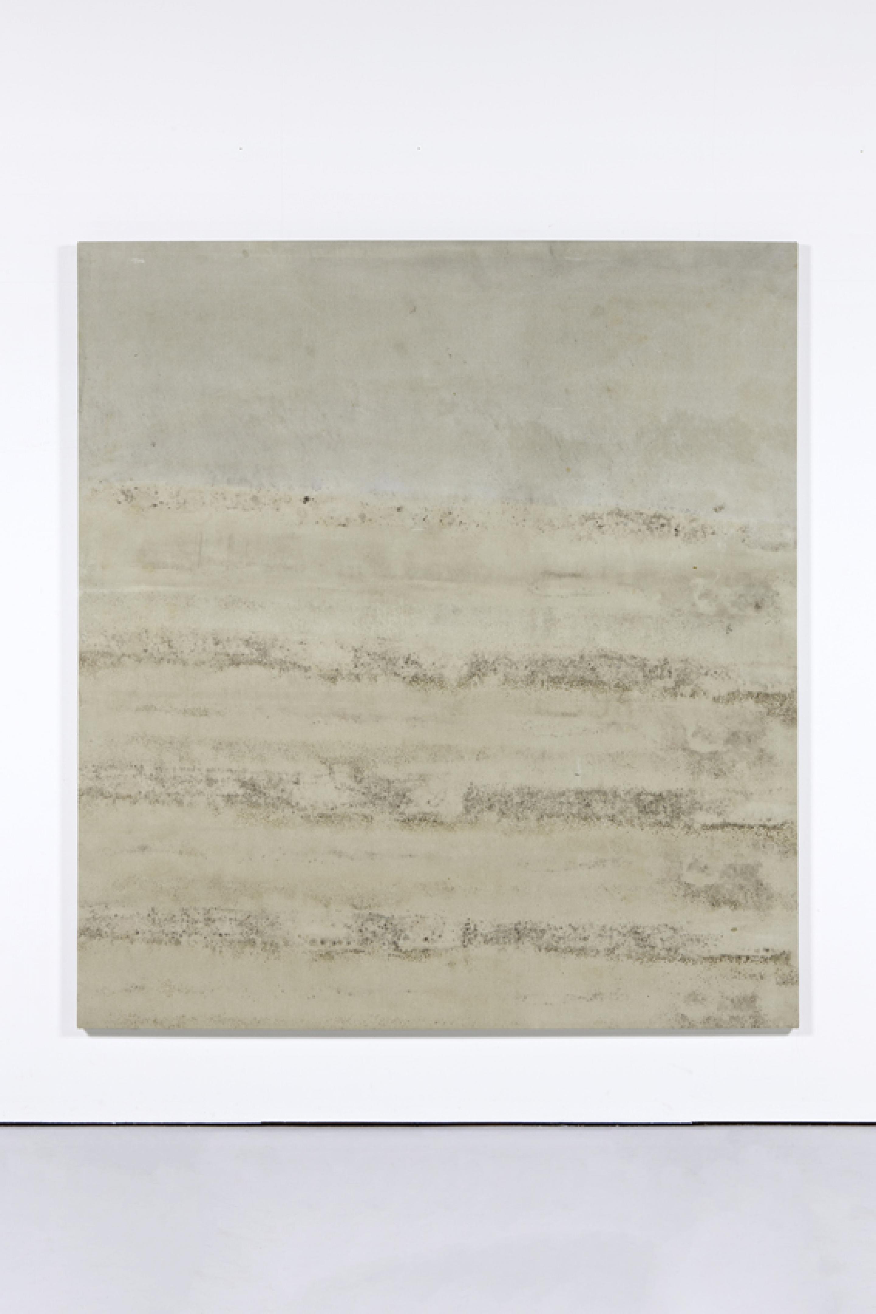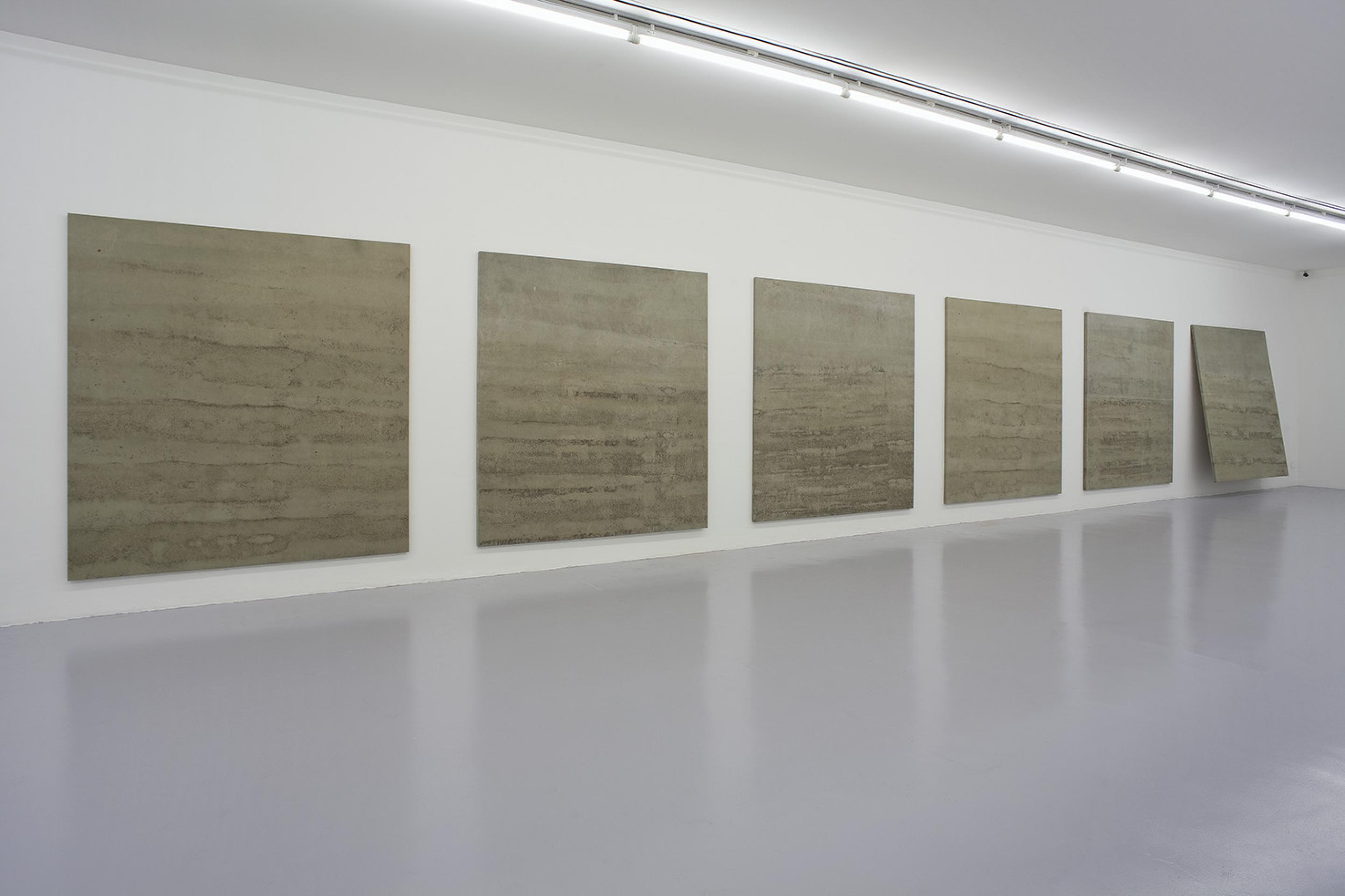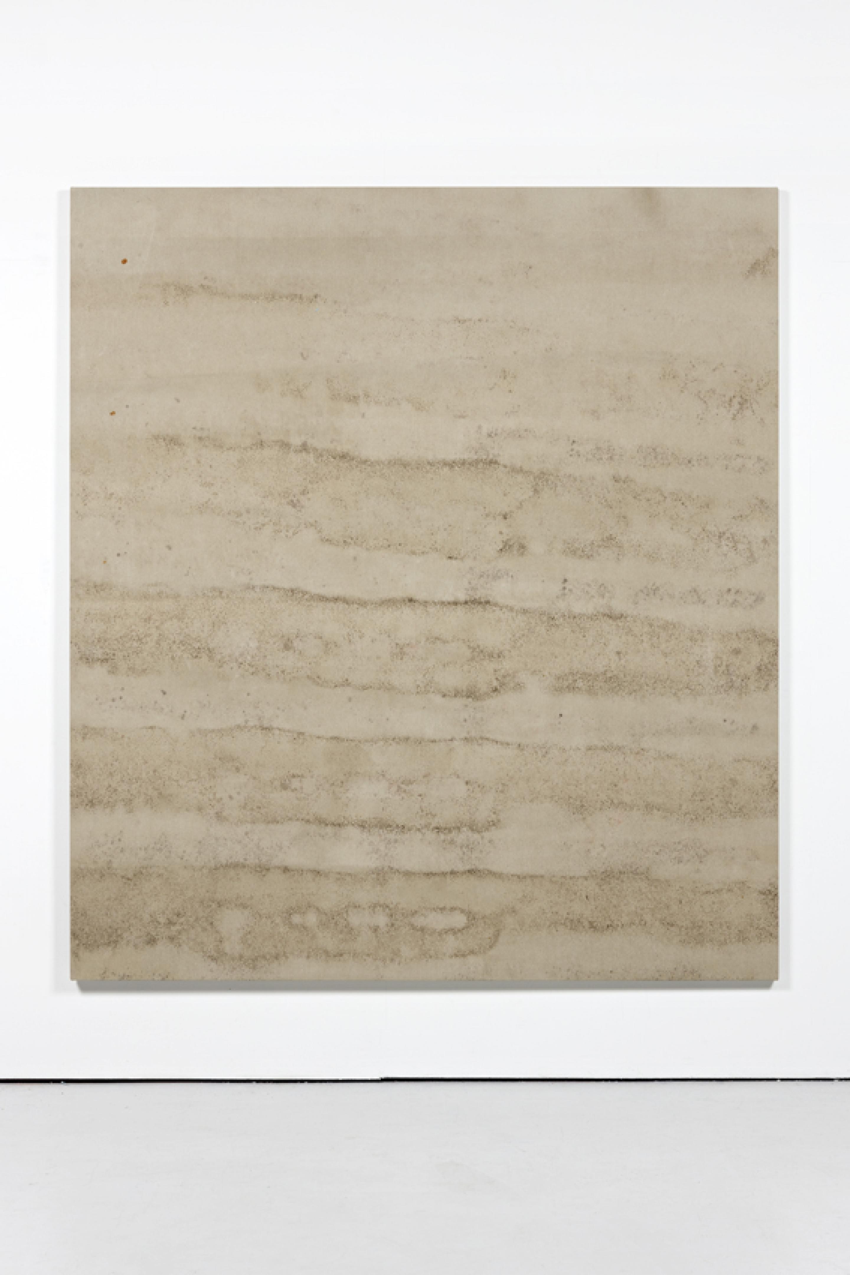 Untreated canvases have been prepared with primer mixed with pigment, left outside the artist’s studio to dry, then tightly rolled around plastic tubes to be left outdoors for almost twelve months. After a year of wear and tear, from all four seasons of the ever changing Norwegian weather, the canvases are un-rolled and more or less severe attacks of mildew are to be found on the top side of the canvas. Because of the folding technique, repetitive, yet unique, patterns of mildew and primer/pigment now become visible. The canvases are then subjected to a thorough wash with fungicides and then finally left to dry, both indoors and outdoors, throughout the winter. In addition to the potentially aversive associations due to the unpleasant rot of the mildew, the fact that the canvases have been processed with a patient methodology that in fact is reminiscent of the way one treats both meat and fish (Norwegian specialities like gravlax and rakfish (fermented fish) come to mind) the “mildew paintings” at display in Choppy Times carry with them a sense of base matter, decomposition, abject dirt, and even death. Perhaps even more so than in the earlier Værslev series like the paintings evoking the (now obsolete to “good taste”) Venetian terrazzo, the ones engaging and exhausting the tattered canopy, and his “garden paintings.” The latter would perhaps be the closest sibling to the newest addition to the family. That being said, these new paintings at display are also a deepened continuation of the monochrome “canopies” of the last few years. Albeit at a remove from the functionality and architectural sociality of the canopy.