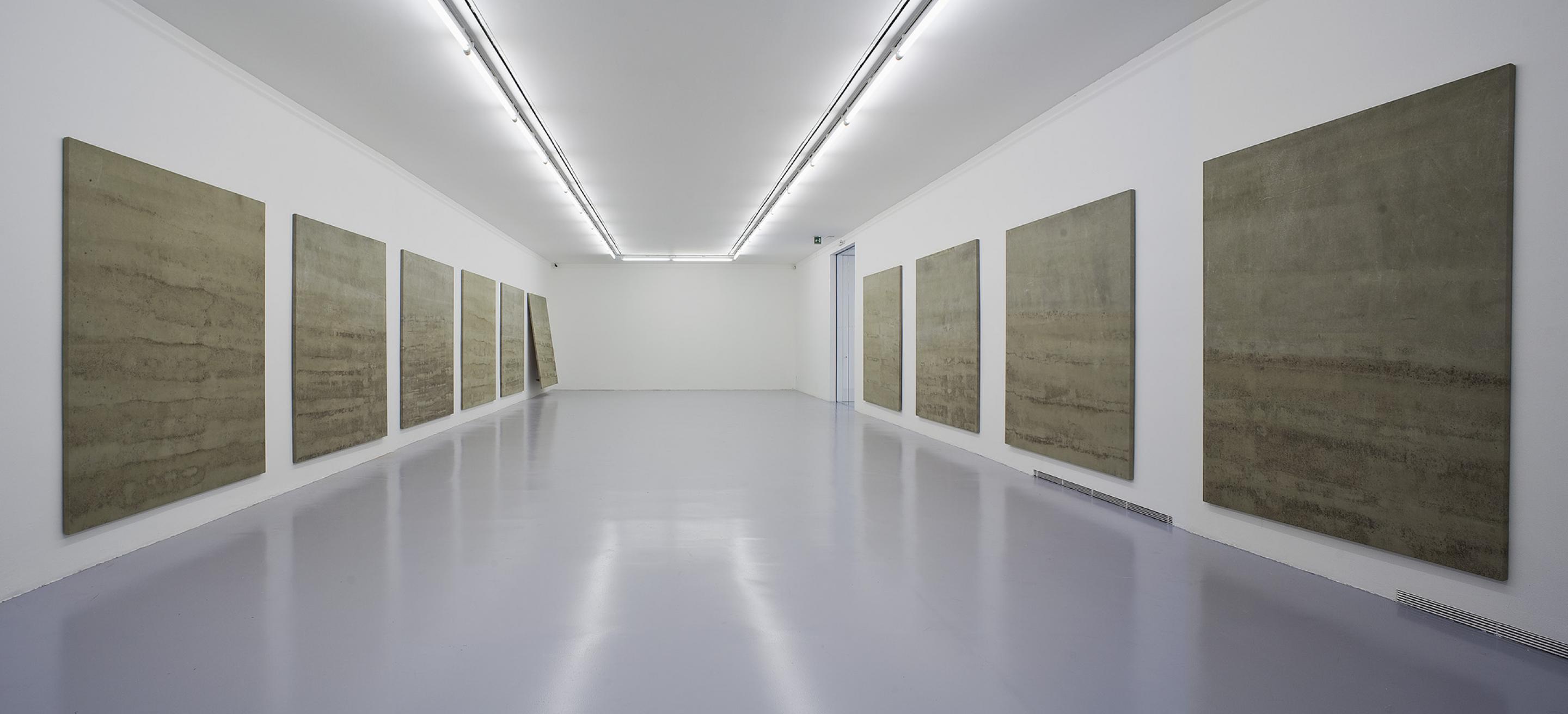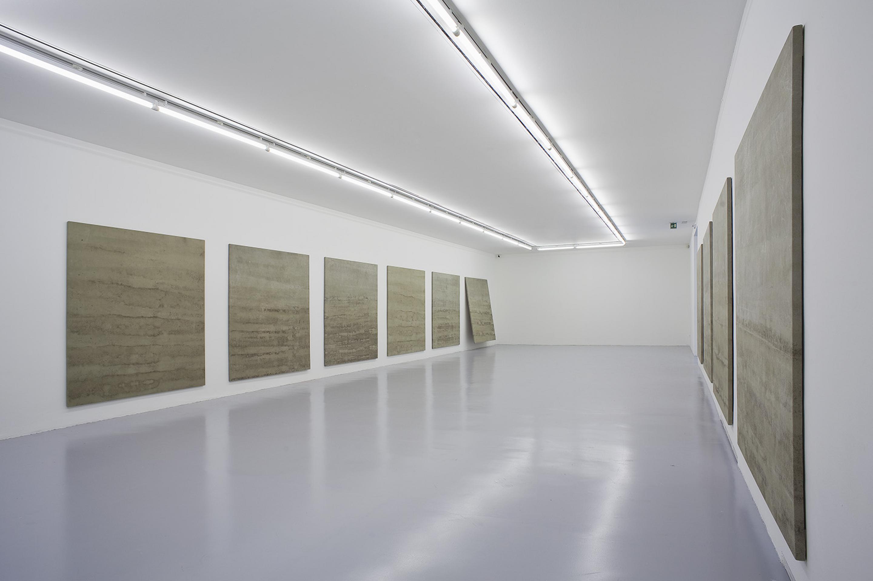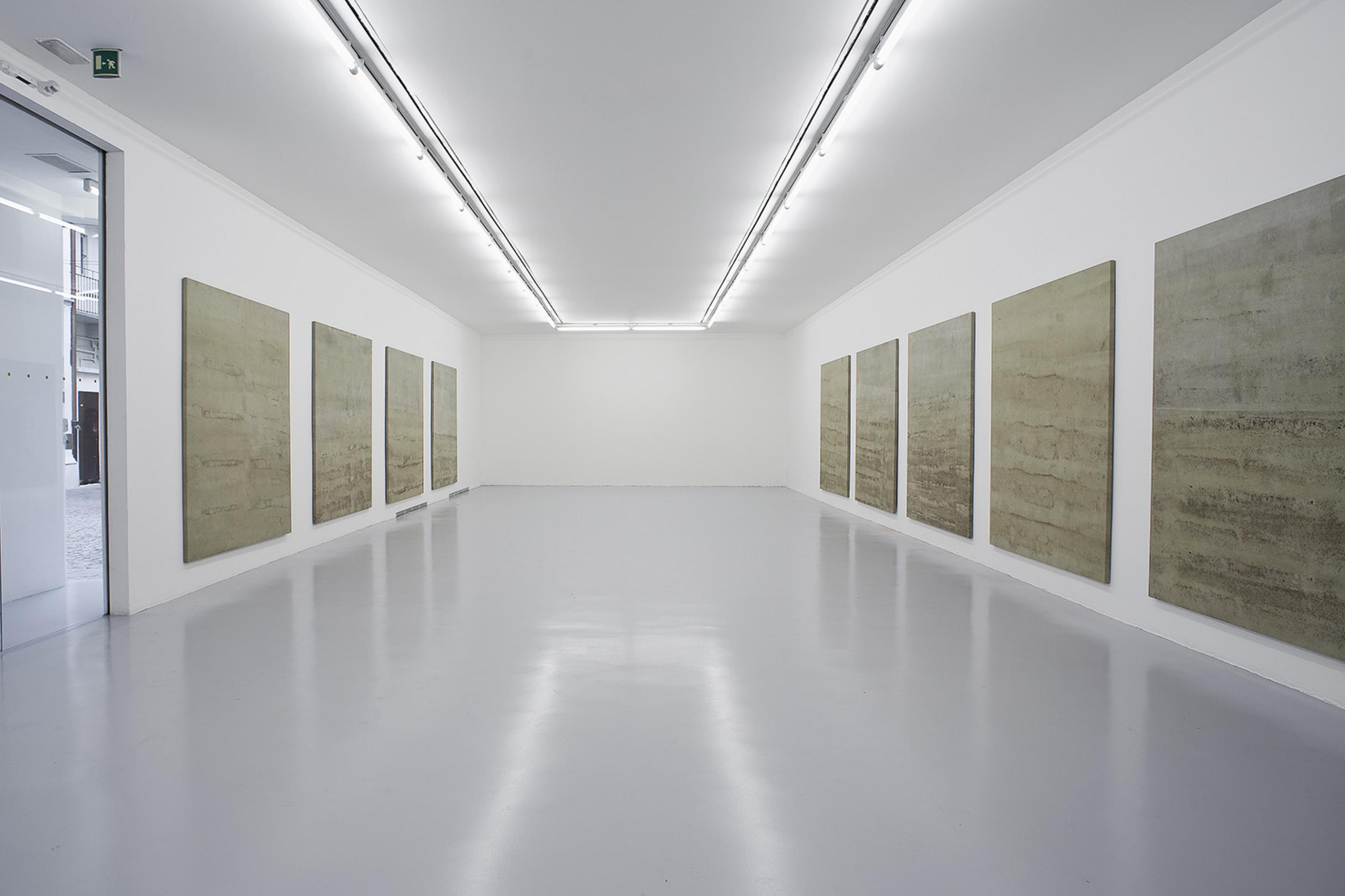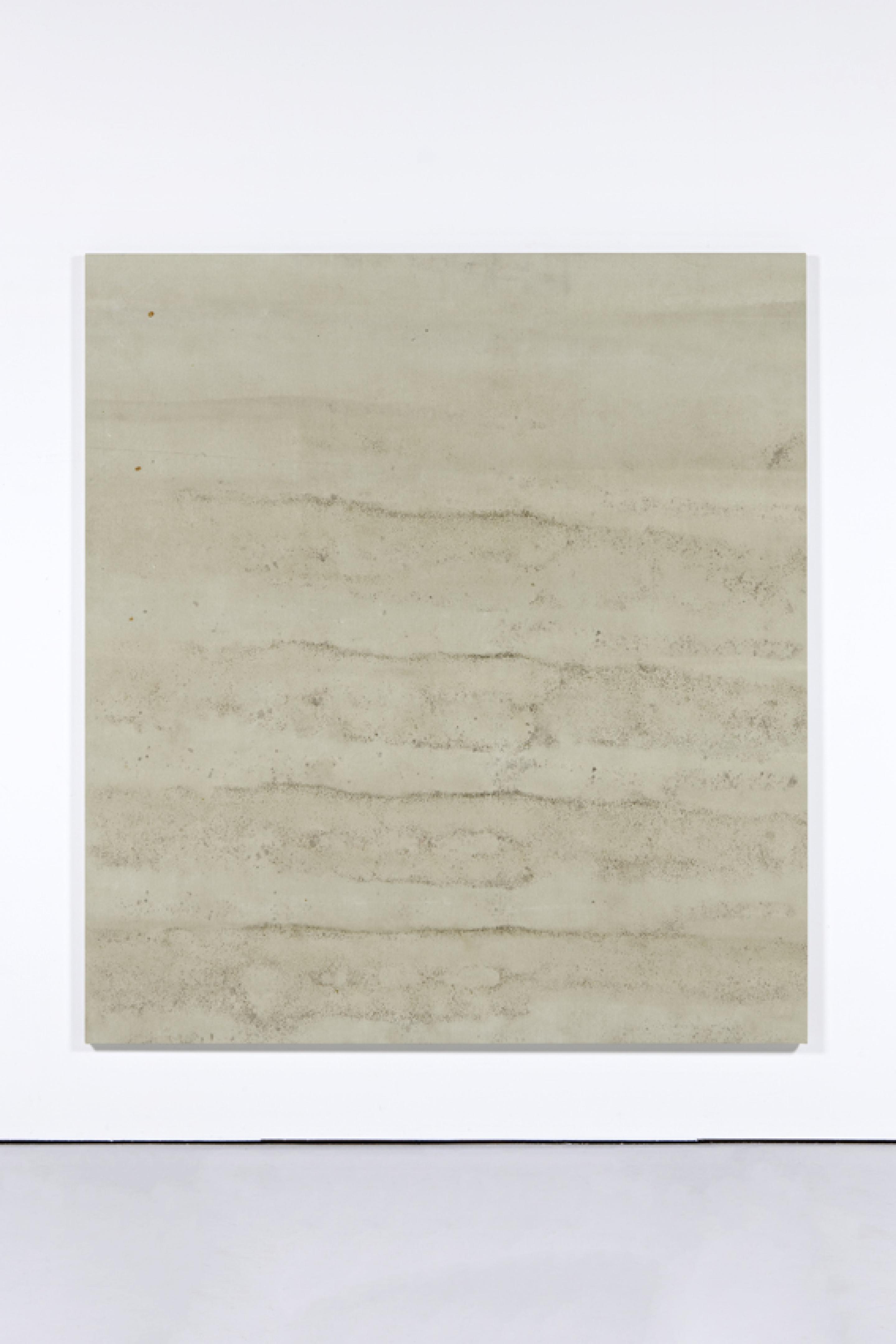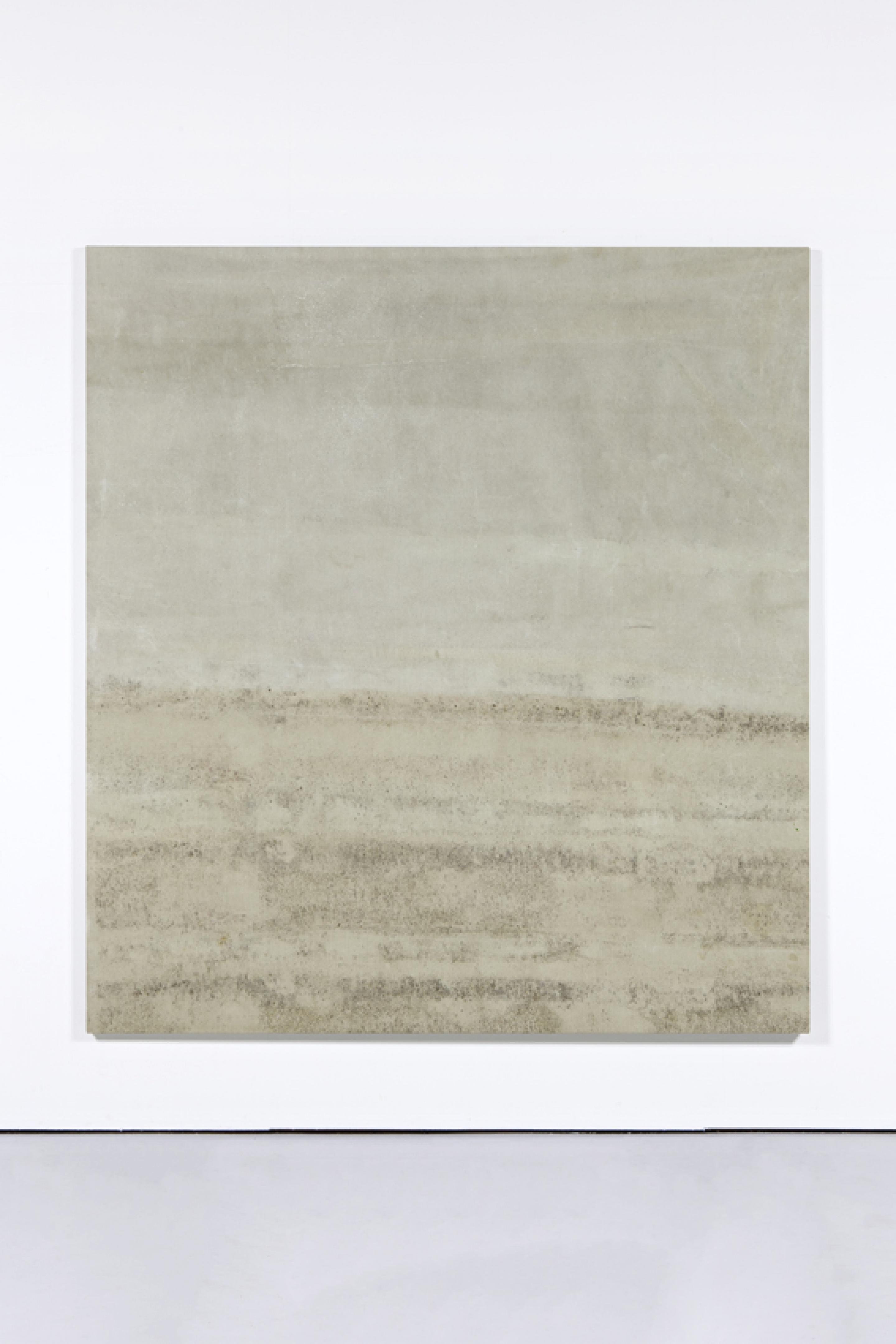 Untreated canvases have been prepared with primer mixed with pigment, left outside the artist’s studio to dry, then tightly rolled around plastic tubes to be left outdoors for almost twelve months. After a year of wear and tear, from all four seasons of the ever changing Norwegian weather, the canvases are un-rolled and more or less severe attacks of mildew are to be found on the top side of the canvas. Because of the folding technique, repetitive, yet unique, patterns of mildew and primer/pigment now become visible. The canvases are then subjected to a thorough wash with fungicides and then finally left to dry, both indoors and outdoors, throughout the winter. In addition to the potentially aversive associations due to the unpleasant rot of the mildew, the fact that the canvases have been processed with a patient methodology that in fact is reminiscent of the way one treats both meat and fish (Norwegian specialities like gravlax and rakfish (fermented fish) come to mind) the “mildew paintings” at display in Choppy Times carry with them a sense of base matter, decomposition, abject dirt, and even death. Perhaps even more so than in the earlier Værslev series like the paintings evoking the (now obsolete to “good taste”) Venetian terrazzo, the ones engaging and exhausting the tattered canopy, and his “garden paintings.” The latter would perhaps be the closest sibling to the newest addition to the family. That being said, these new paintings at display are also a deepened continuation of the monochrome “canopies” of the last few years. Albeit at a remove from the functionality and architectural sociality of the canopy.