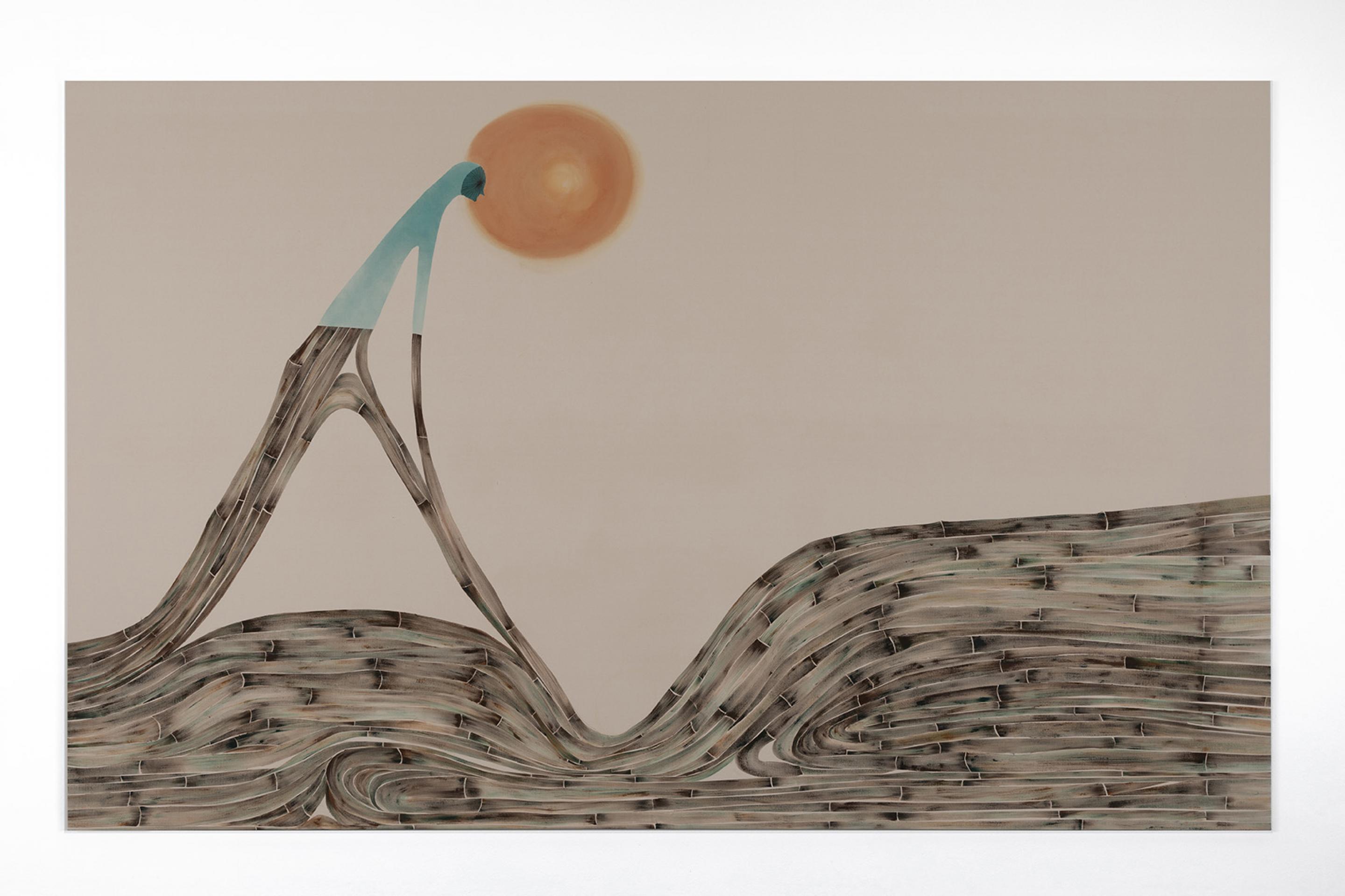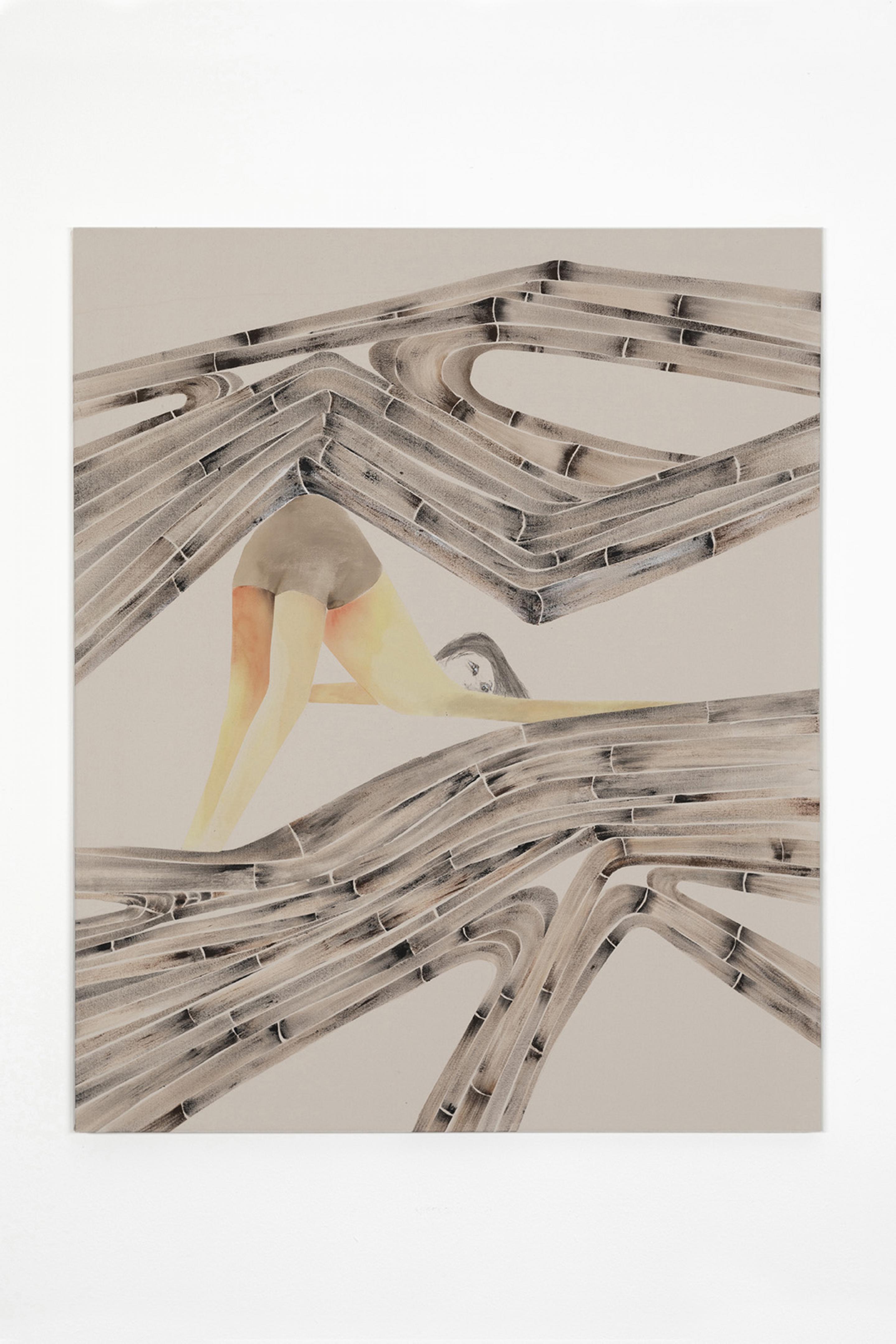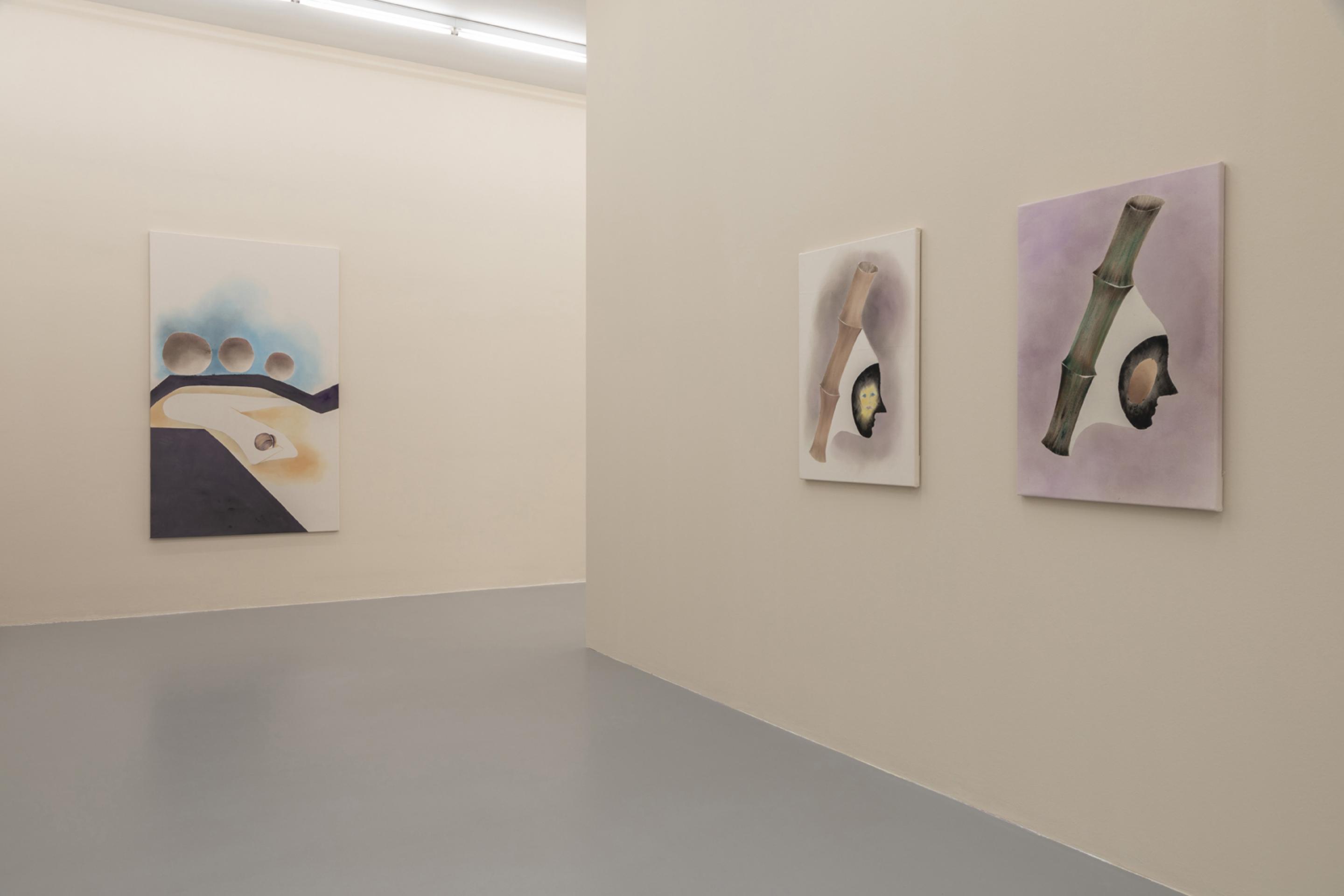Bassa marea al molo, Fossa madre, Cielo trema o niente, Punti di fiamma, Salvezza trovata in cielo, together with the exhibition’s title piece Cielo di giugno (all works 2020) reveal the unfolding of the images at a faster pace, with the excited gesture of something happening or about to happen: instants that spin around before falling back on themselves, sowing signs of sentiment. The work evokes a sculptural feel that refers to natural elements such as grass, bamboo canes, mud, materials frequently found in Enrico David’s work. The gallery walls are painted in the same natural tone as the canvases in order to enhance the materiality – or its absence – of the pictorial surface.