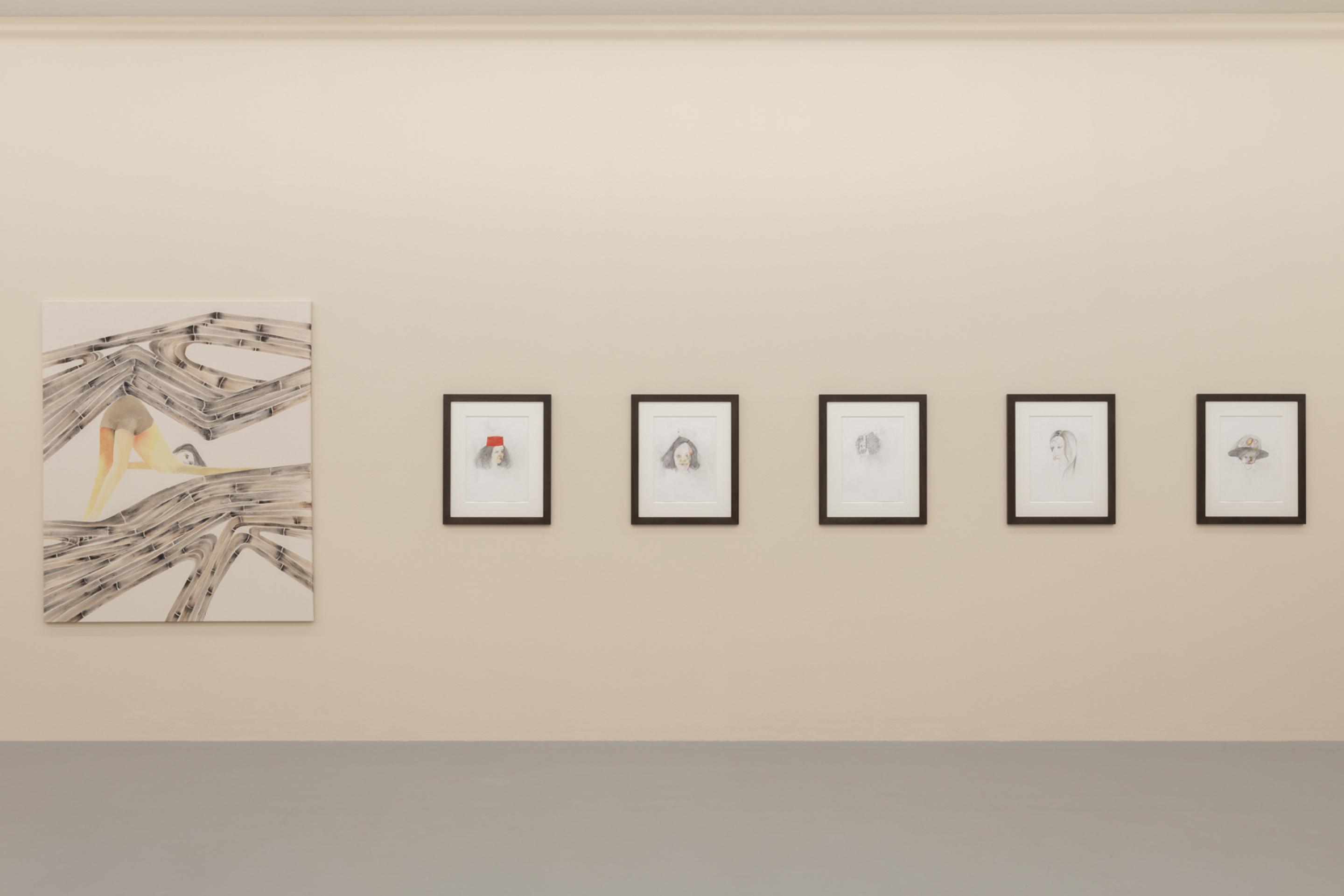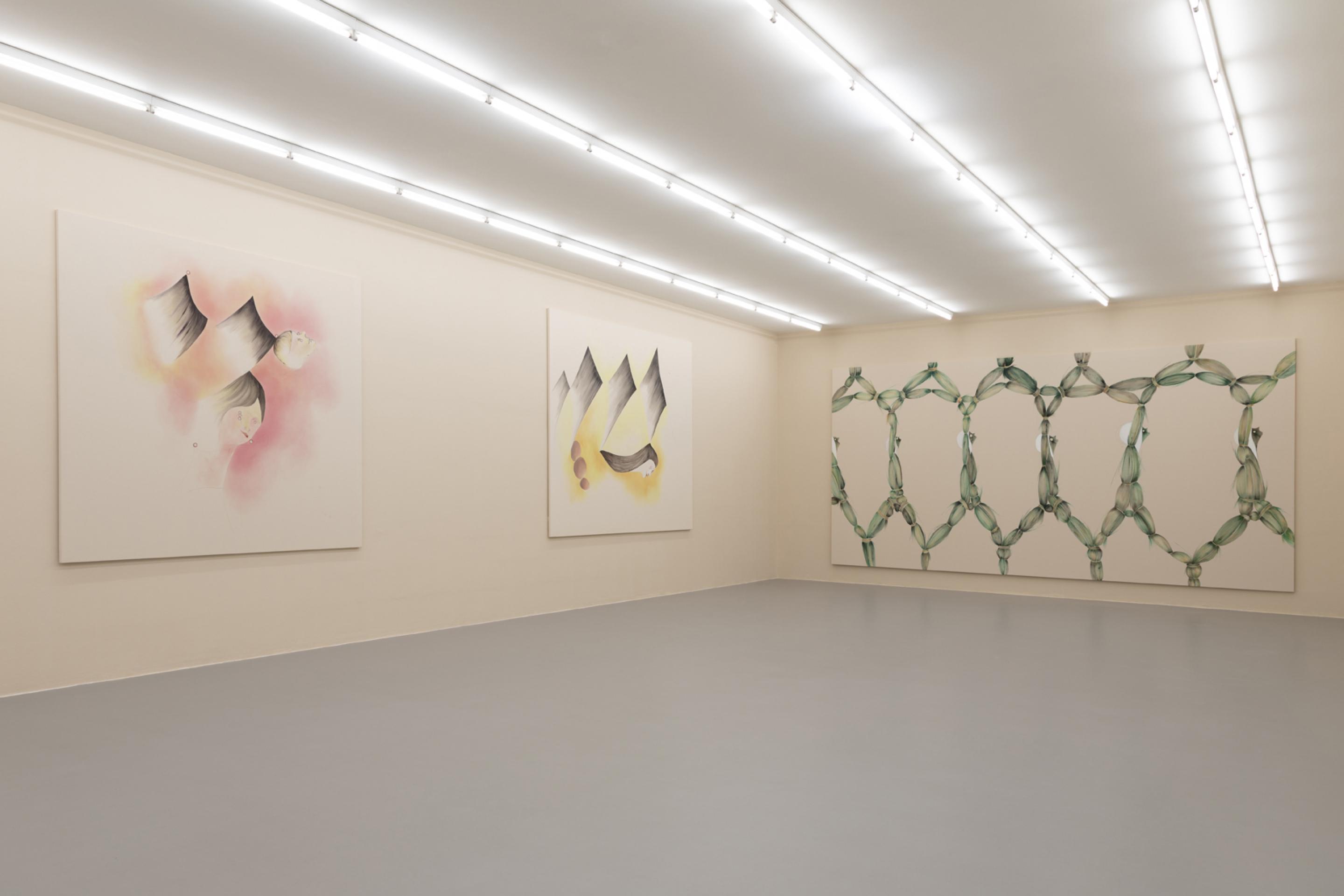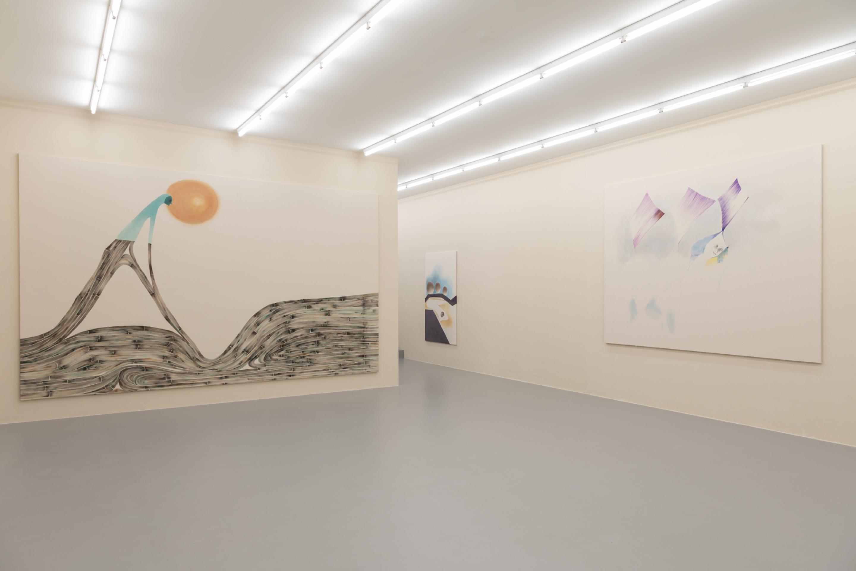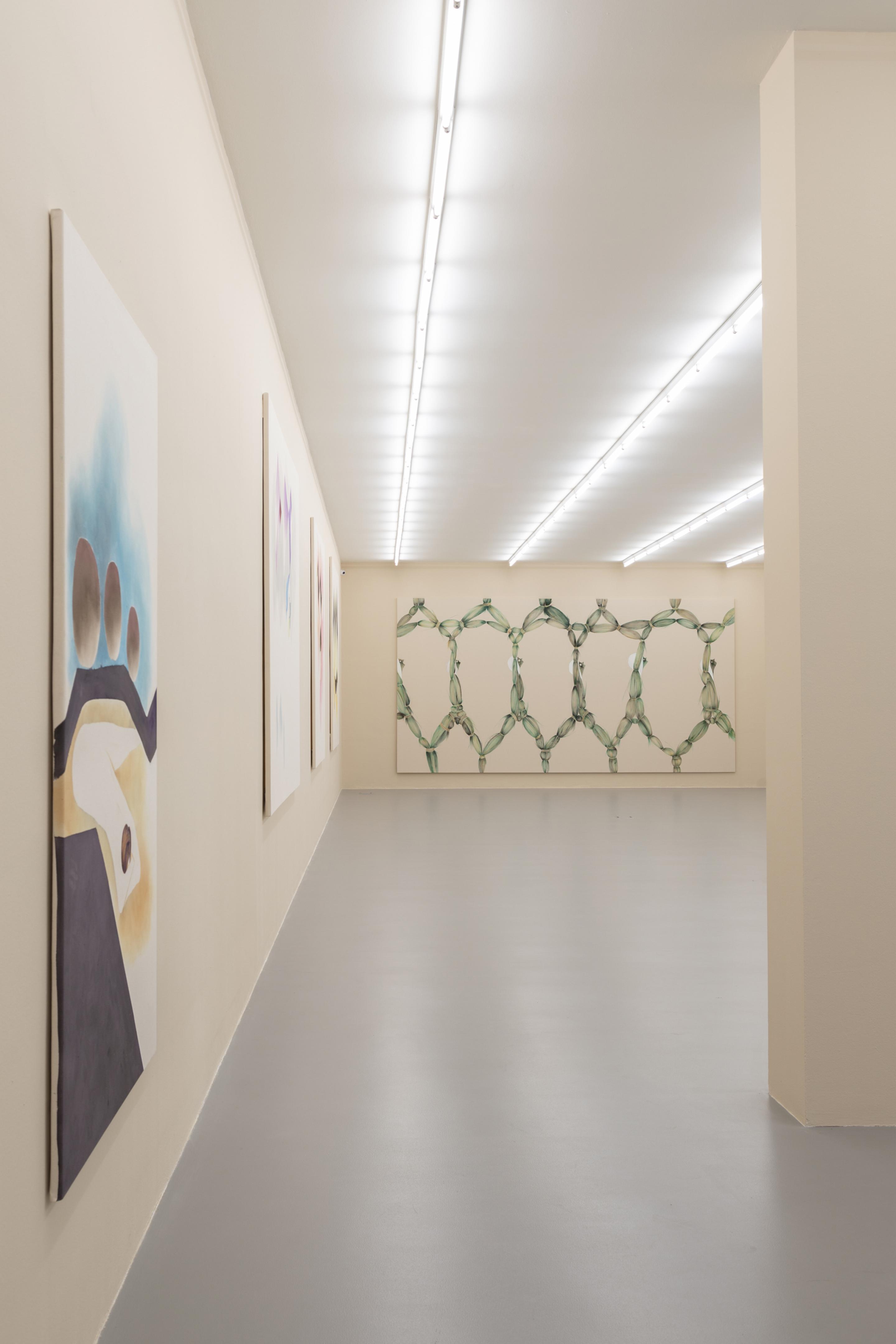 The exhibition comprises three groups of paintings. On the shorter walls of the space two works are being displayed which function as an imaginary parenthesis, facing each other and enclosing their content. Il fraterno silenzio del fango (2020) and Zattera viva (2020) are two large canvases which, like an architecture, form a supporting structure for the other works and represent the trellis onto which all the rest is fixed, entangled: kites, hovering in a light that no longer conveys matter, and with their eternal melancholic dream they yield to their fall. Or rafts, whose color blends and dissolves, and whose customary harmony – both reflective and meditative - holds earth and sky together, the material and the incorporeal, on the verge of dissolving. In contrast, the small canvases are virtually studies, compositions which, like riddles, explore the possibility of painting, or how to paint in the least pictorially possible way.