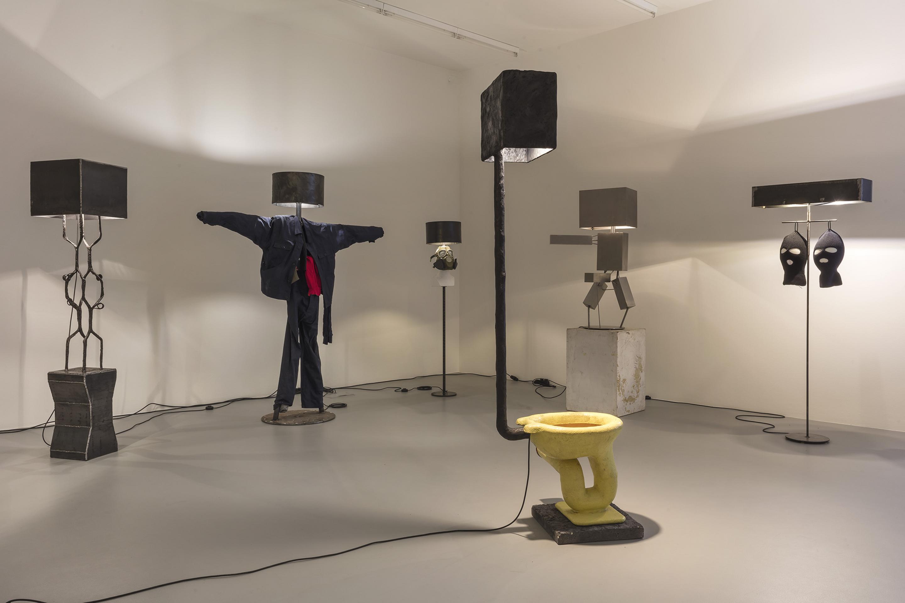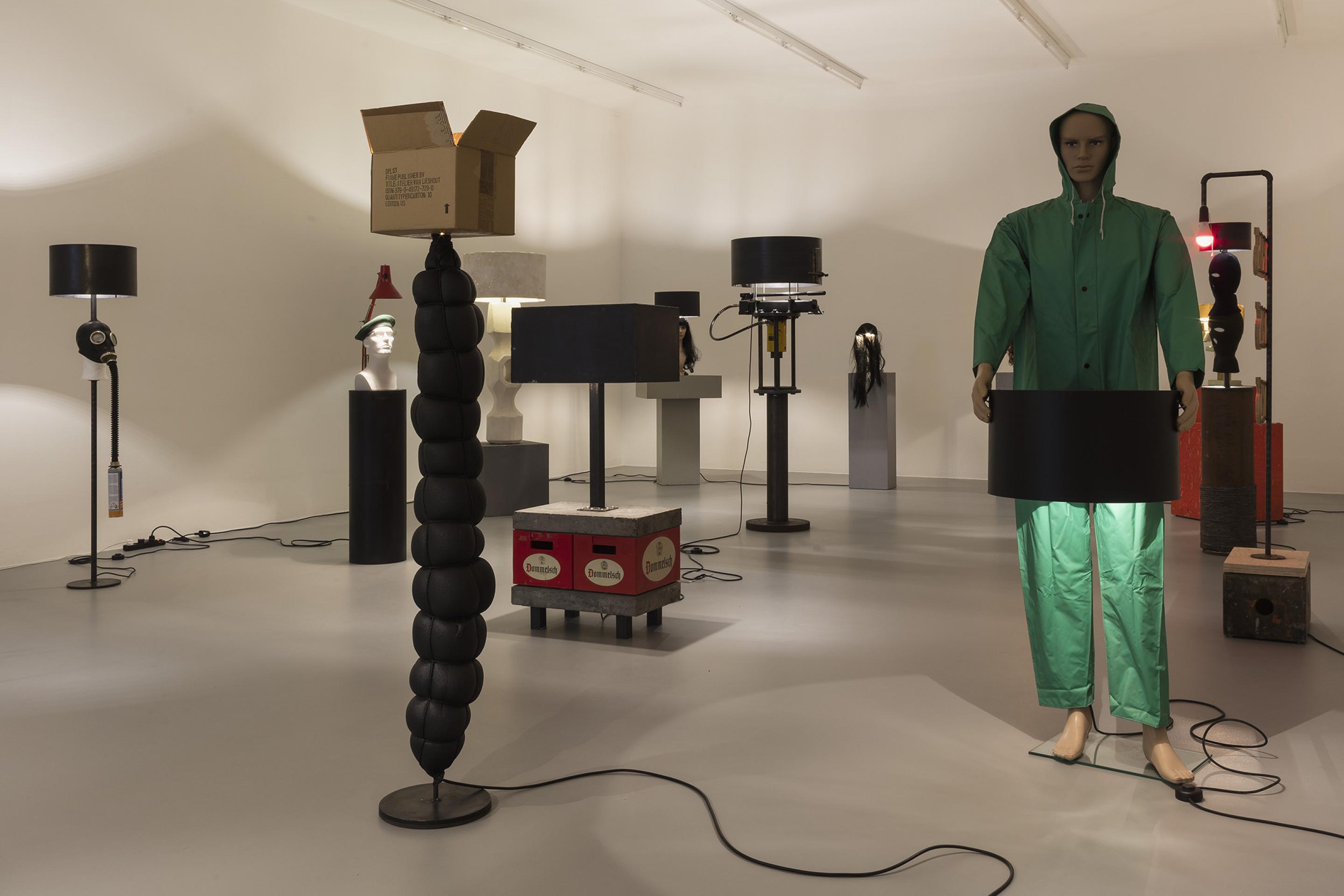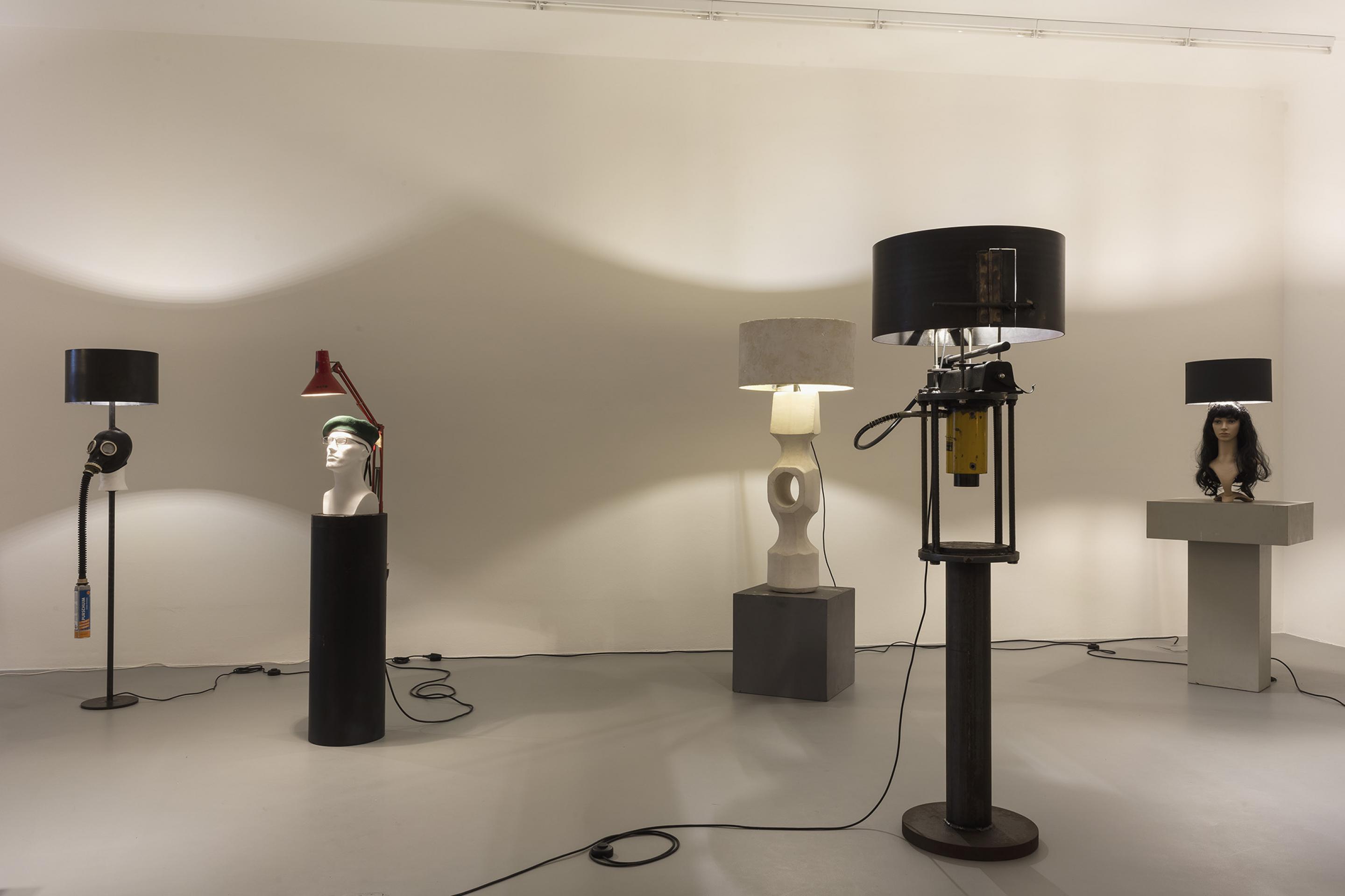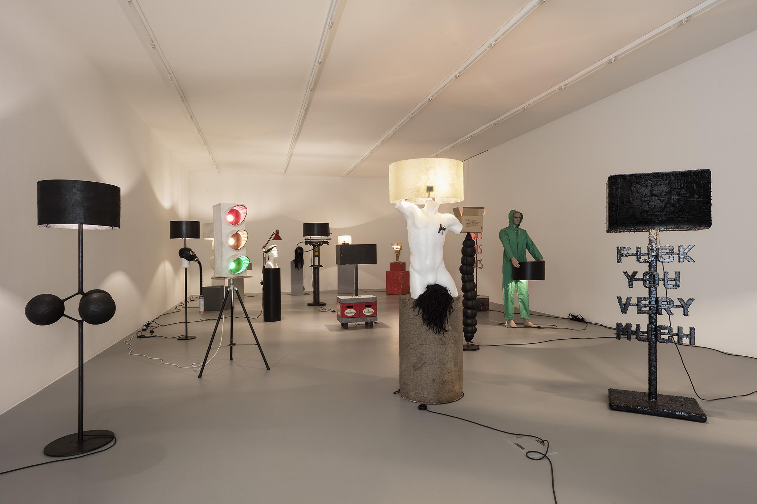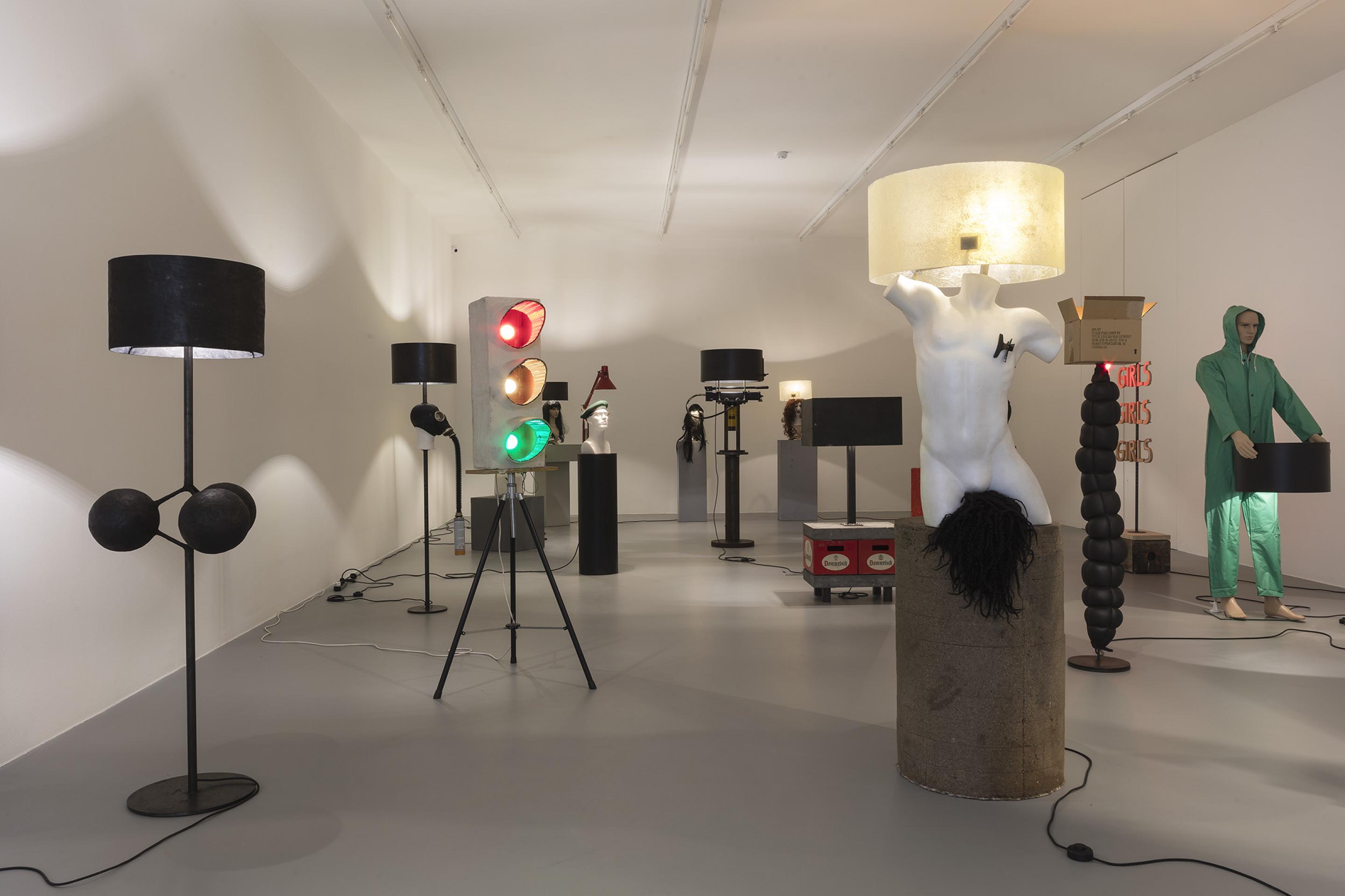 RENEGADE consists of an arrangement of differently sized lamps which are created, assembled, put together and produced from found objects and simple materials. Some of the lamps even refer back to Van Lieshout’s own historic work exhibited in museums: balaclava masks dangle from metal lampshades; a bust with a gas mask strapped to its head embellishes the lamp pole of a floor lamp; a single, red forlorn lightbulb dimly illuminates the roughly cut out wooden words “GIRLS-GIRLS-GIRLS”; tall, sausage-like organic-looking objects taper into a single burning lightbulb, whereas two beer crates -one of Van Lieshout’s defining iconic sculptures in combination with concrete slabs- build the solid base for a sturdy lamp with a steel shade.