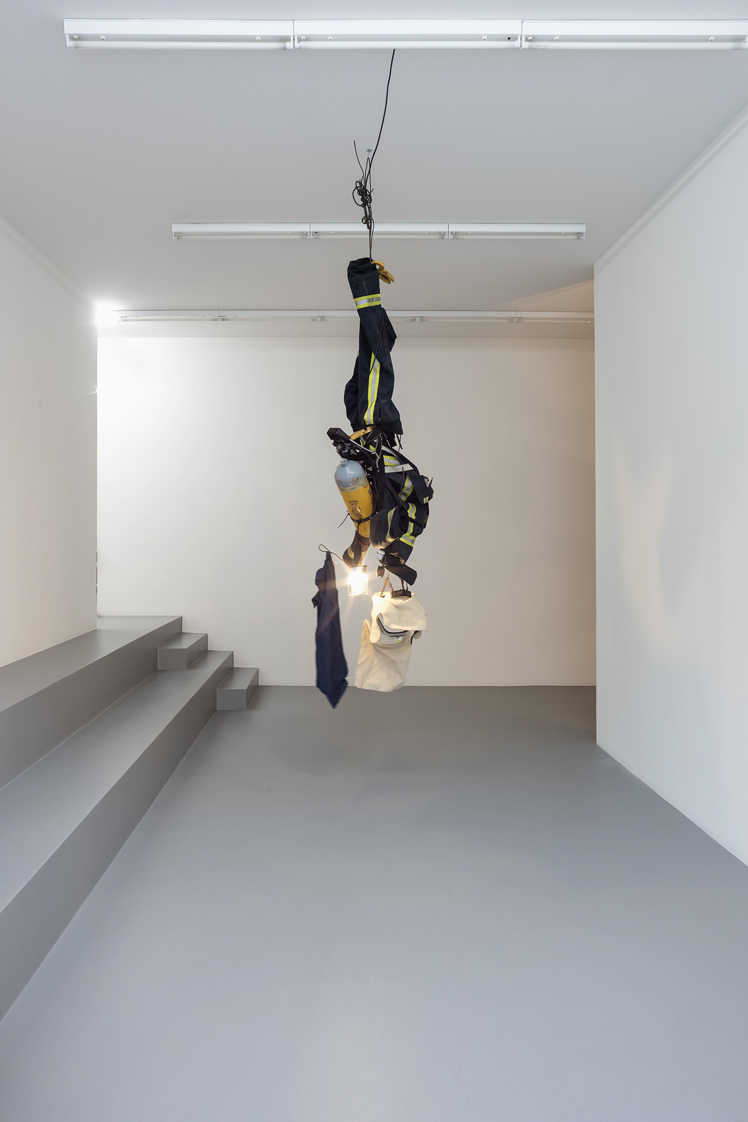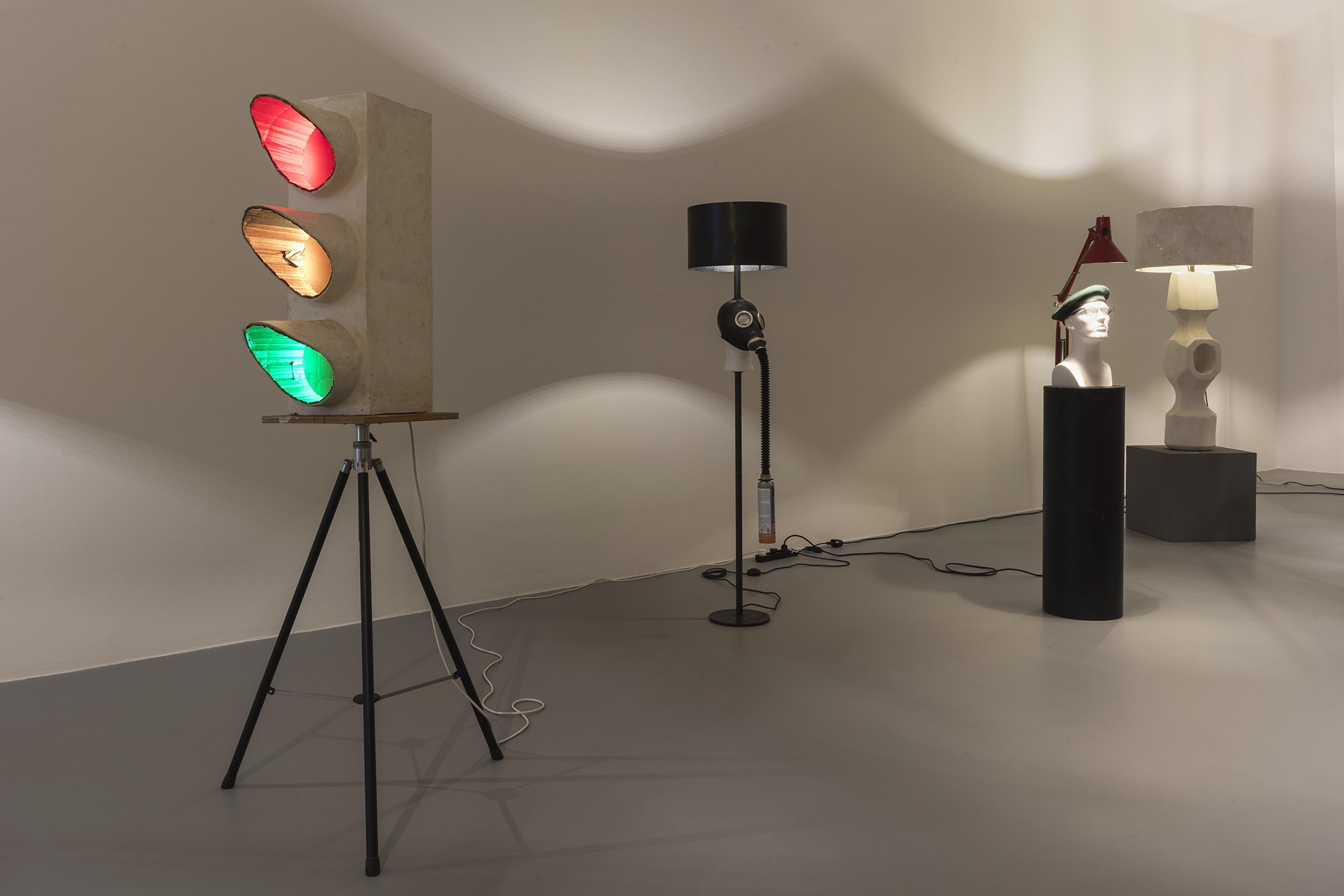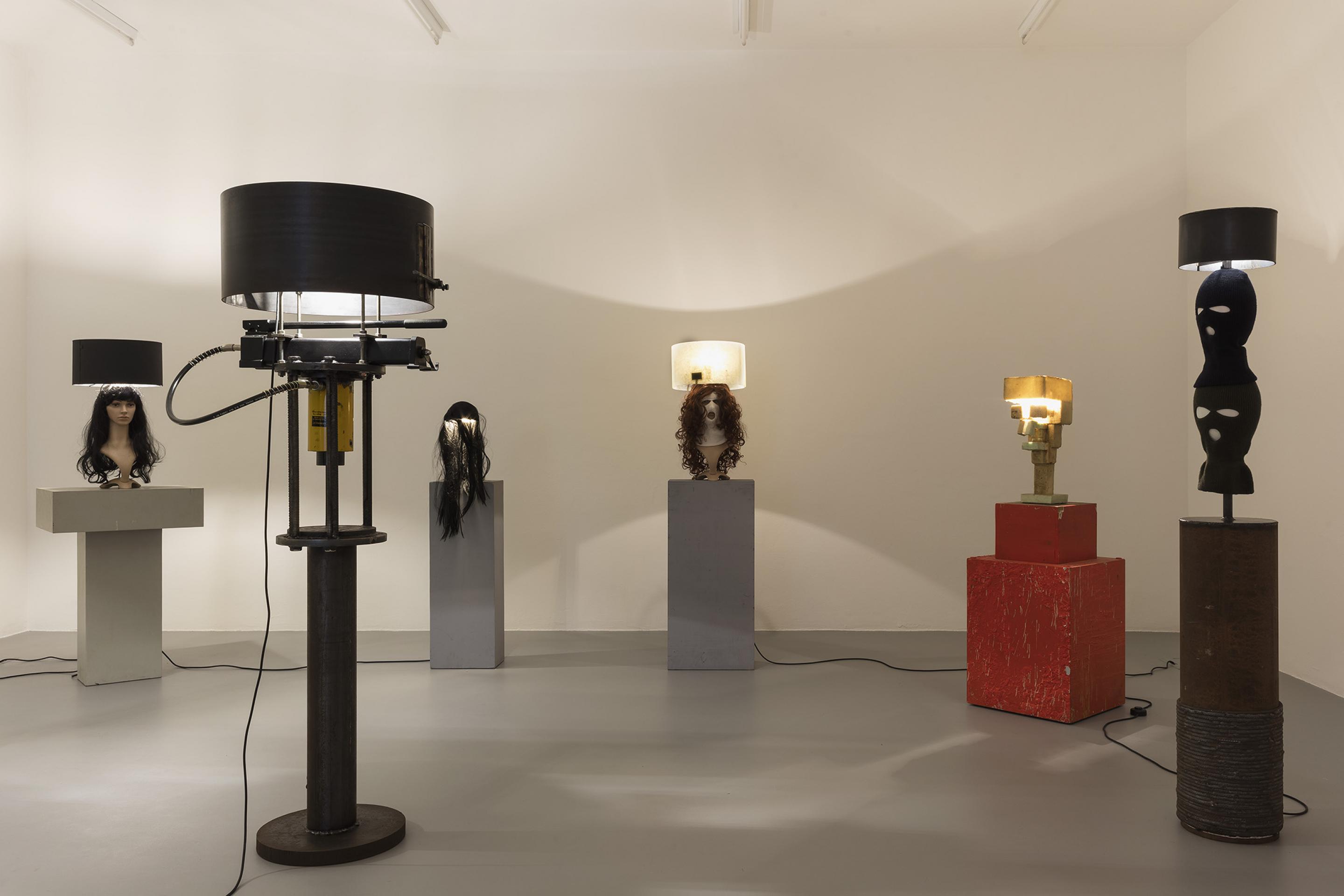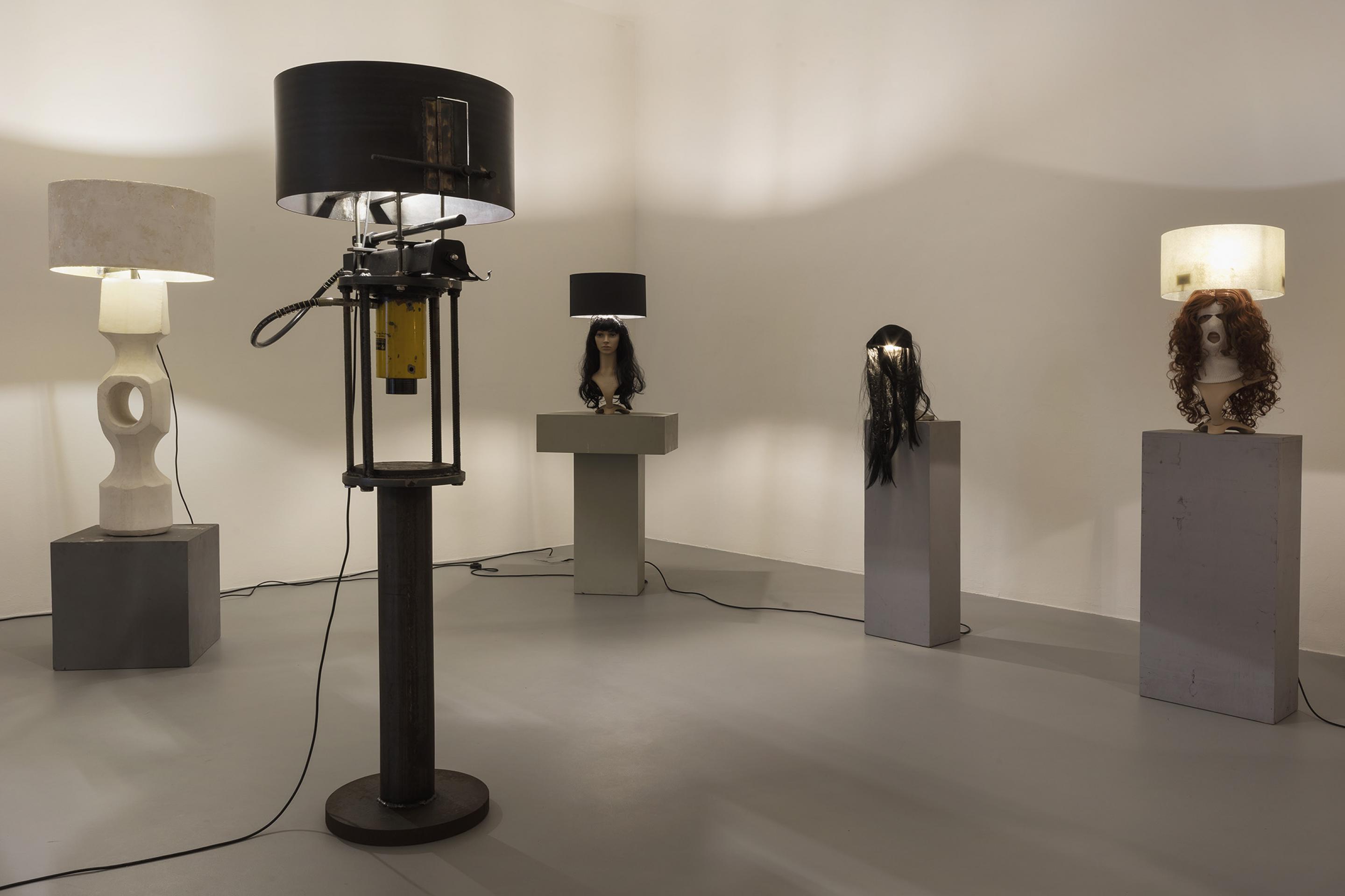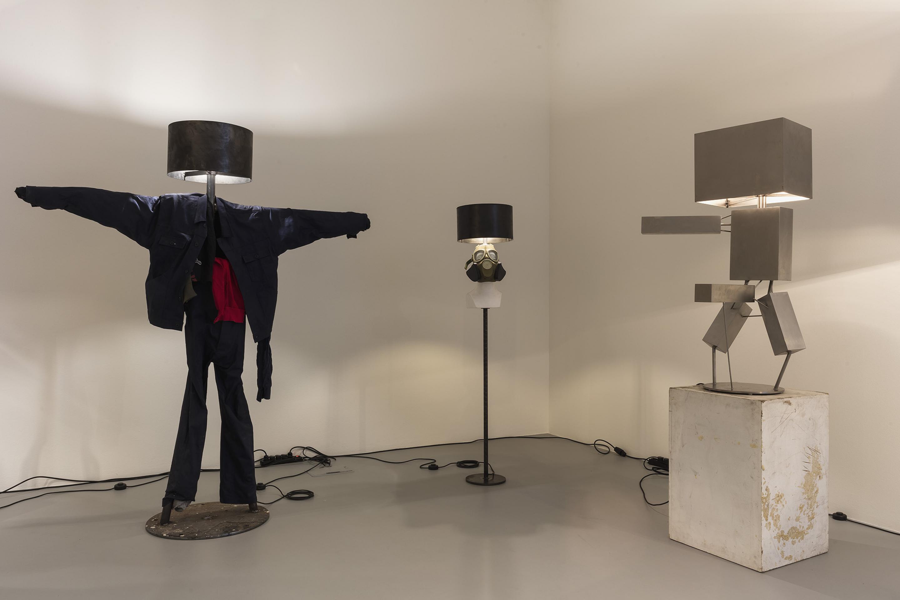 RENEGADE consists of an arrangement of differently sized lamps which are created, assembled, put together and produced from found objects and simple materials. Some of the lamps even refer back to Van Lieshout’s own historic work exhibited in museums: balaclava masks dangle from metal lampshades; a bust with a gas mask strapped to its head embellishes the lamp pole of a floor lamp; a single, red forlorn lightbulb dimly illuminates the roughly cut out wooden words “GIRLS-GIRLS-GIRLS”; tall, sausage-like organic-looking objects taper into a single burning lightbulb, whereas two beer crates -one of Van Lieshout’s defining iconic sculptures in combination with concrete slabs- build the solid base for a sturdy lamp with a steel shade.